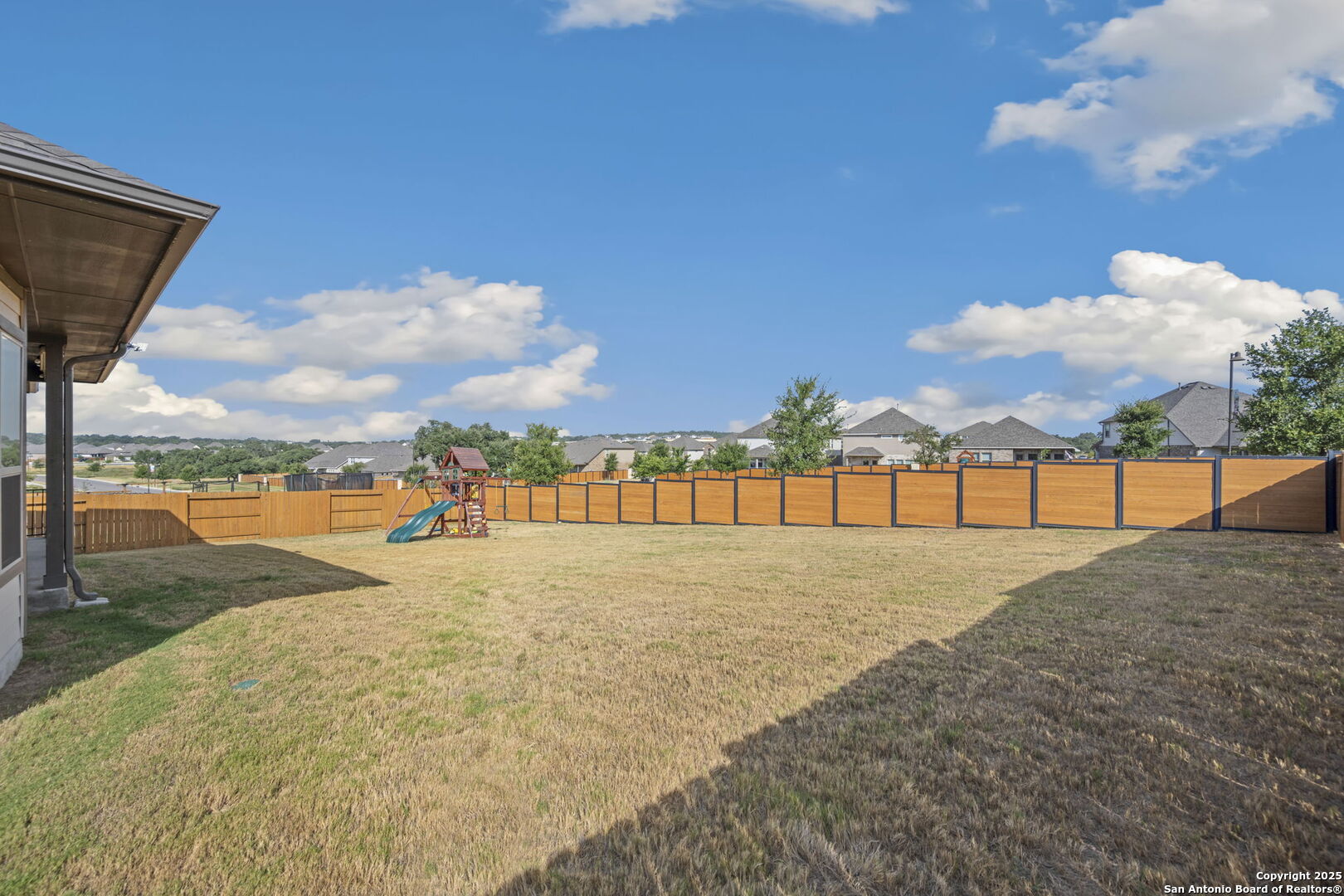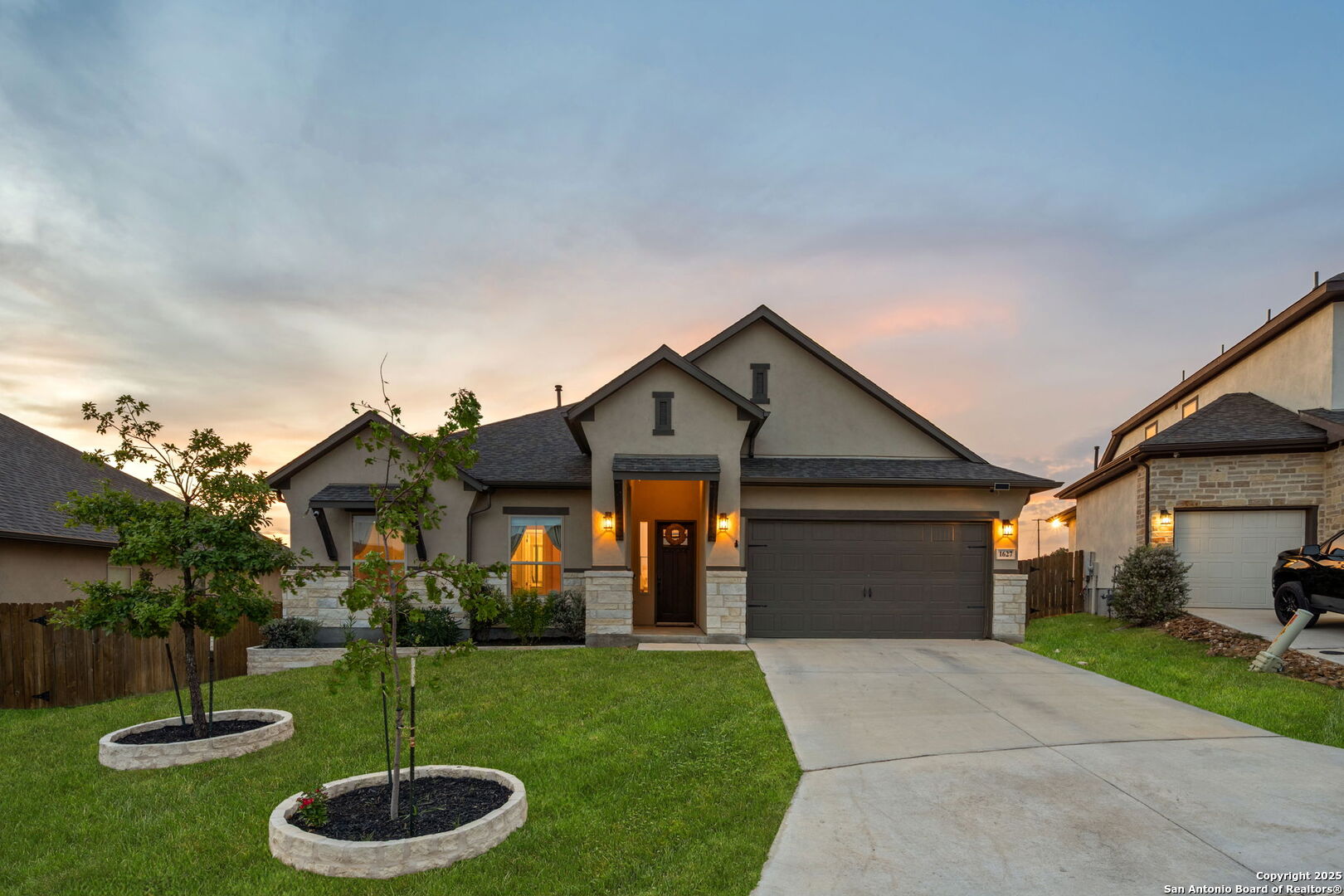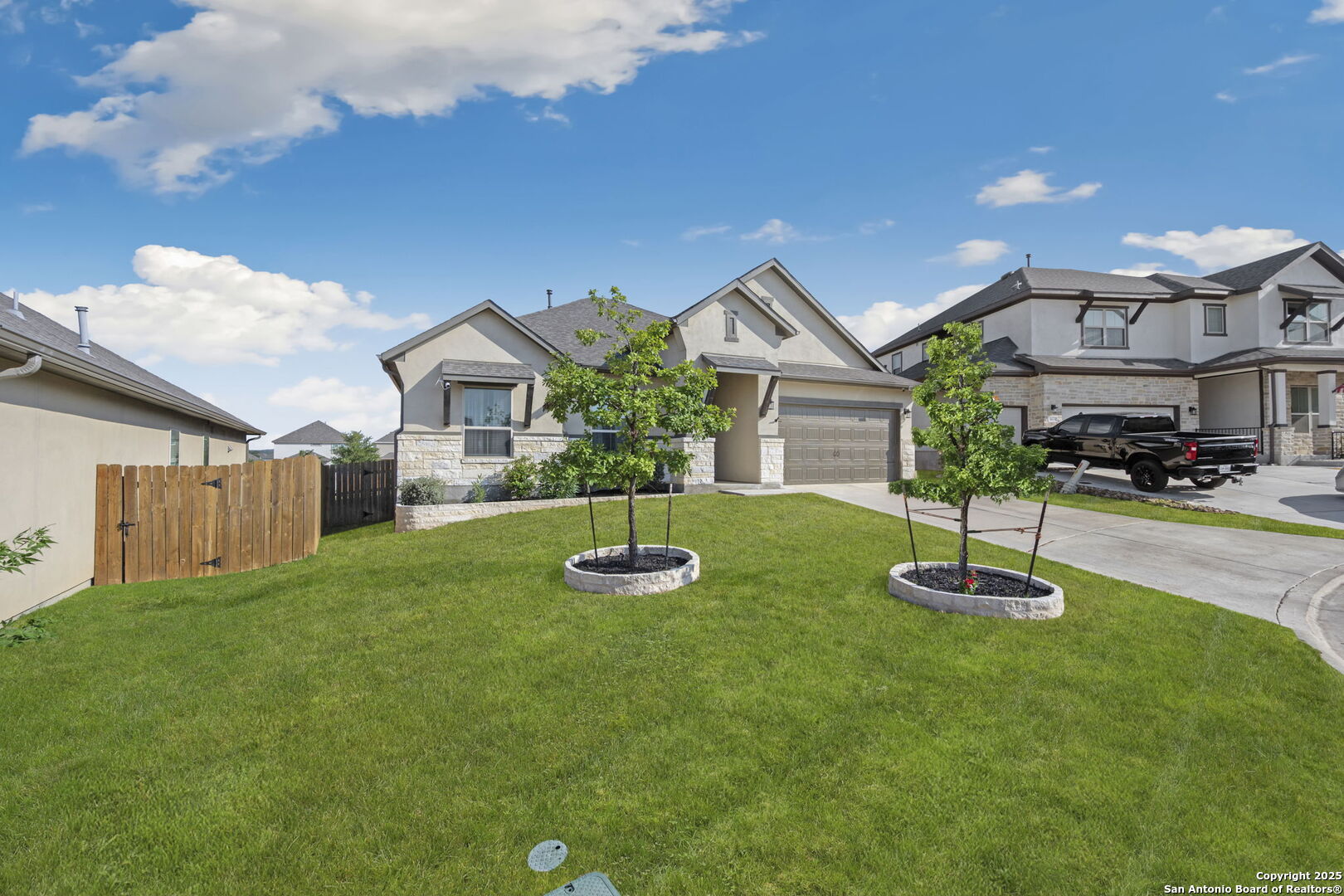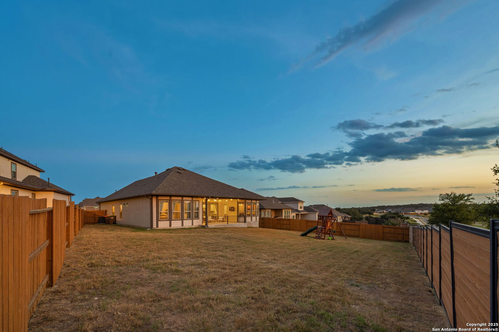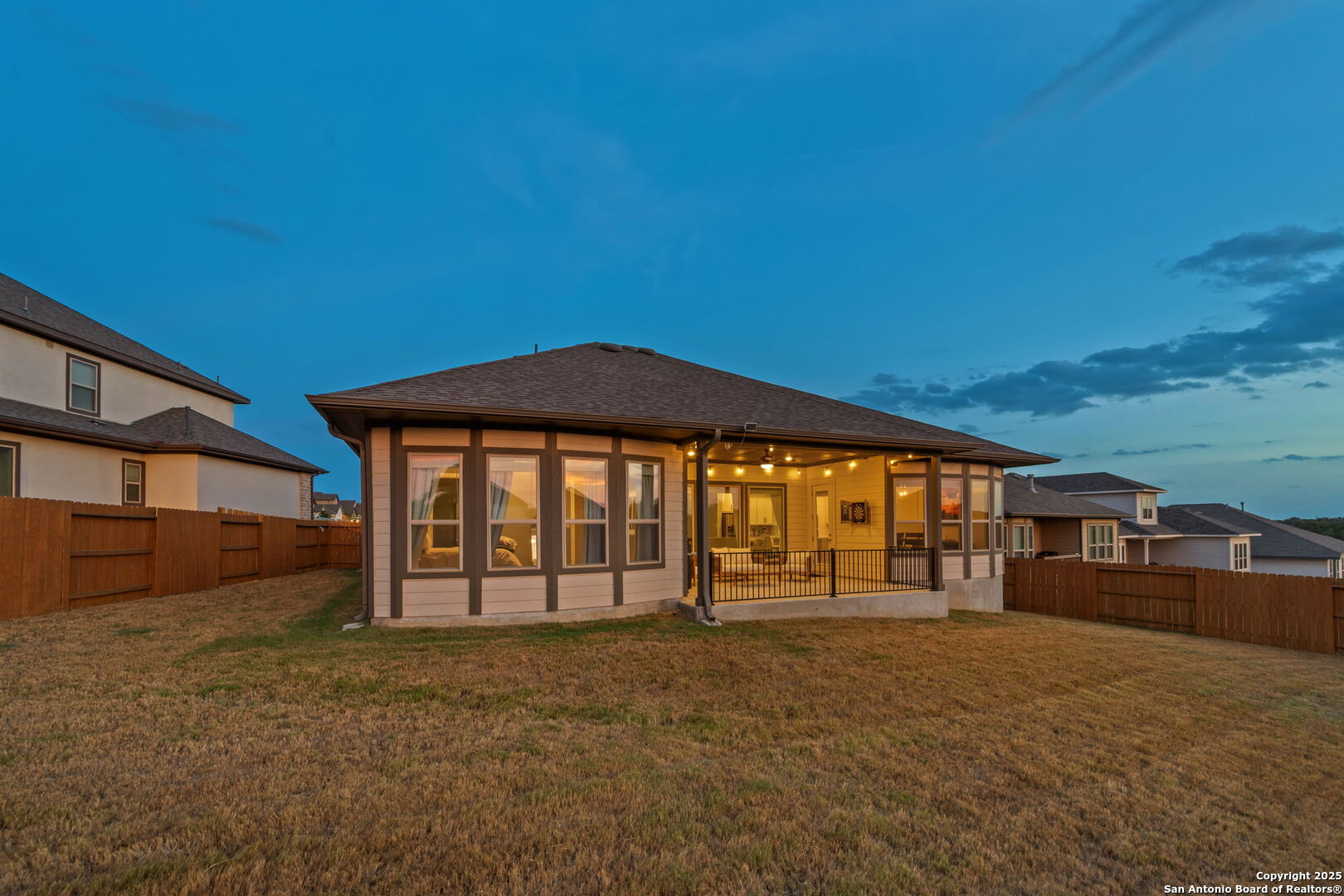 Enjoy the ease of one-story living in this 2,313 sq. ft. Princeton Classic home on a .26-acre lot. With 4 bedrooms and 3 full baths, including a private en suite for guests, there's room for everyone. The owner's retreat is a true escape with tray ceiling, bay windows, and a spa-inspired bath featuring dual vanities, walk-in shower, garden tub, and a generous closet. The heart of the home is the chef's kitchen with quartz counters, gas cooking, and walk-in pantry, opening to an oversized dining area framed by bay windows. Gather in the warm living room with beamed ceilings and fireplace or make use of the versatile flex room with glass doors-perfect for an office, media, or game space. Evenings are made for the oversized covered patio with manual solar shades, overlooking a spacious yard and picture-perfect Texas sunsets. With premier Meyer Ranch amenities, this home blends comfort, style, and community in a way that's hard to beat.