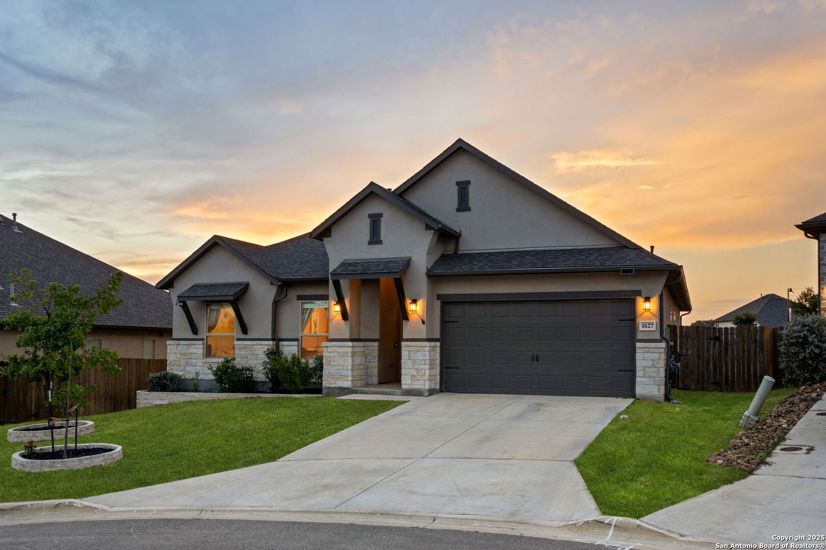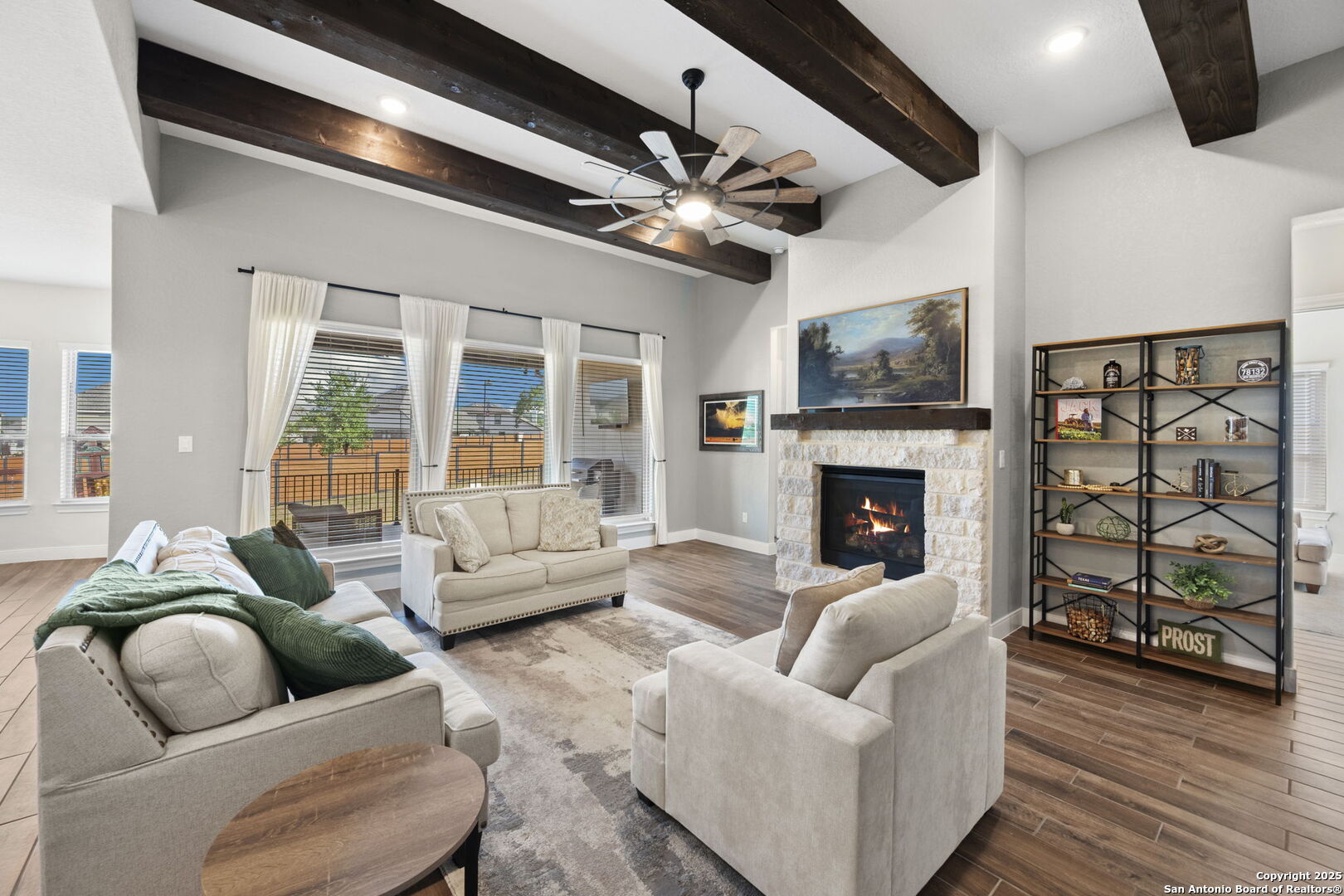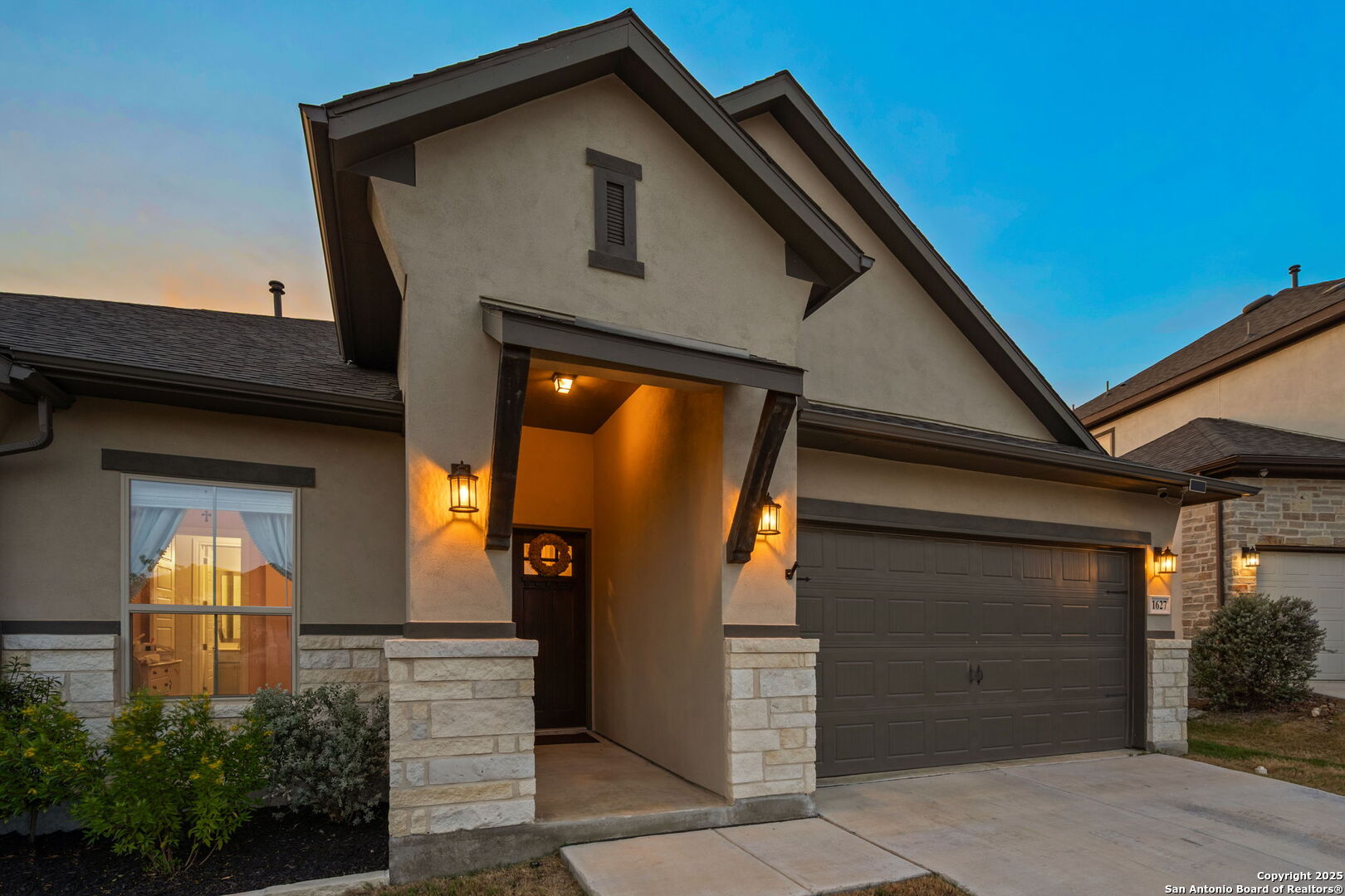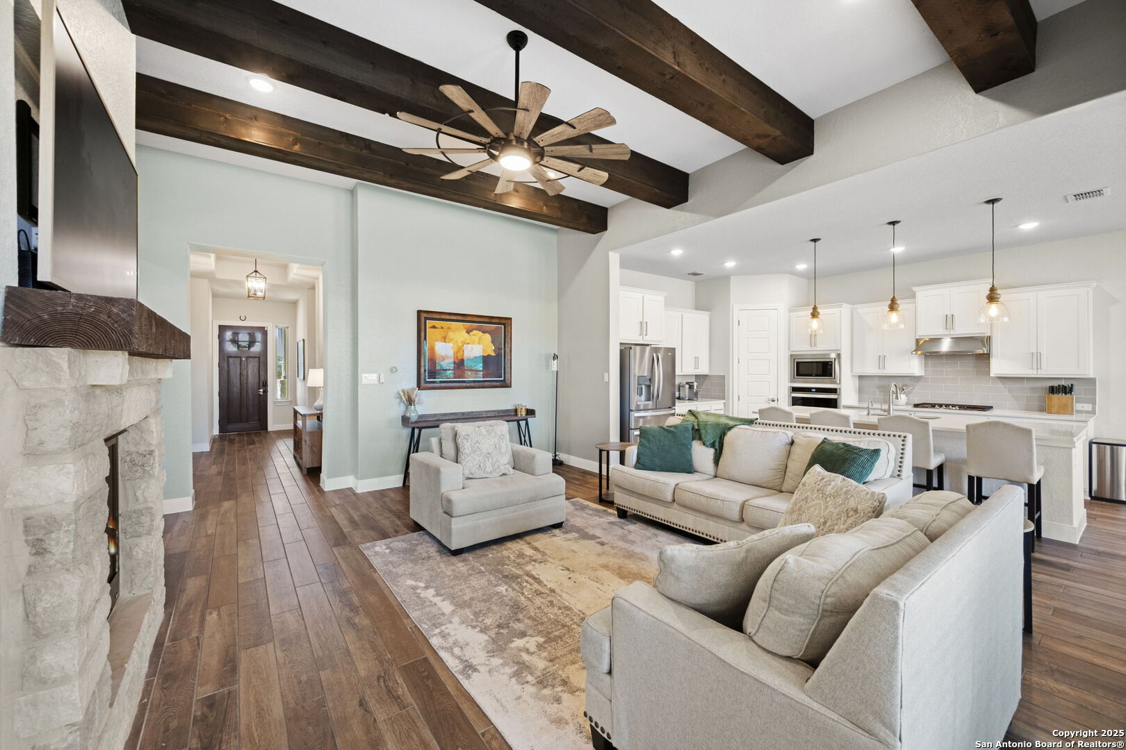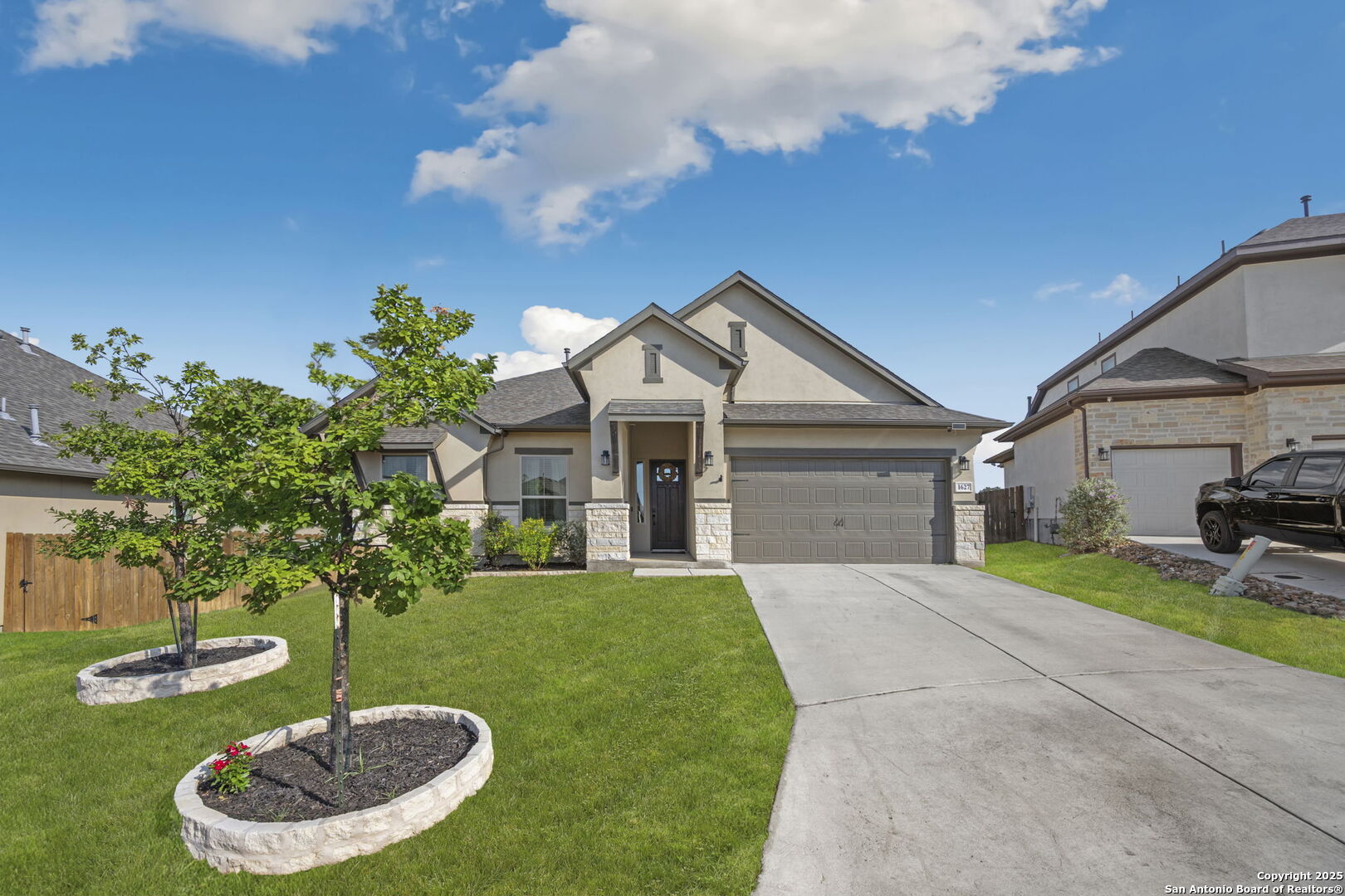 Enjoy the ease of one-story living in this 2,313 sq. ft. Princeton Classic home on a .26-acre lot. With 4 bedrooms and 3 full baths, including a private en suite for guests, there's room for everyone. The owner's retreat is a true escape with tray ceiling, bay windows, and a spa-inspired bath featuring dual vanities, walk-in shower, garden tub, and a generous closet. The heart of the home is the chef's kitchen with quartz counters, gas cooking, and walk-in pantry, opening to an oversized dining area framed by bay windows. Gather in the warm living room with beamed ceilings and fireplace or make use of the versatile flex room with glass doors-perfect for an office, media, or game space. Evenings are made for the oversized covered patio with manual solar shades, overlooking a spacious yard and picture-perfect Texas sunsets. With premier Meyer Ranch amenities, this home blends comfort, style, and community in a way that's hard to beat.