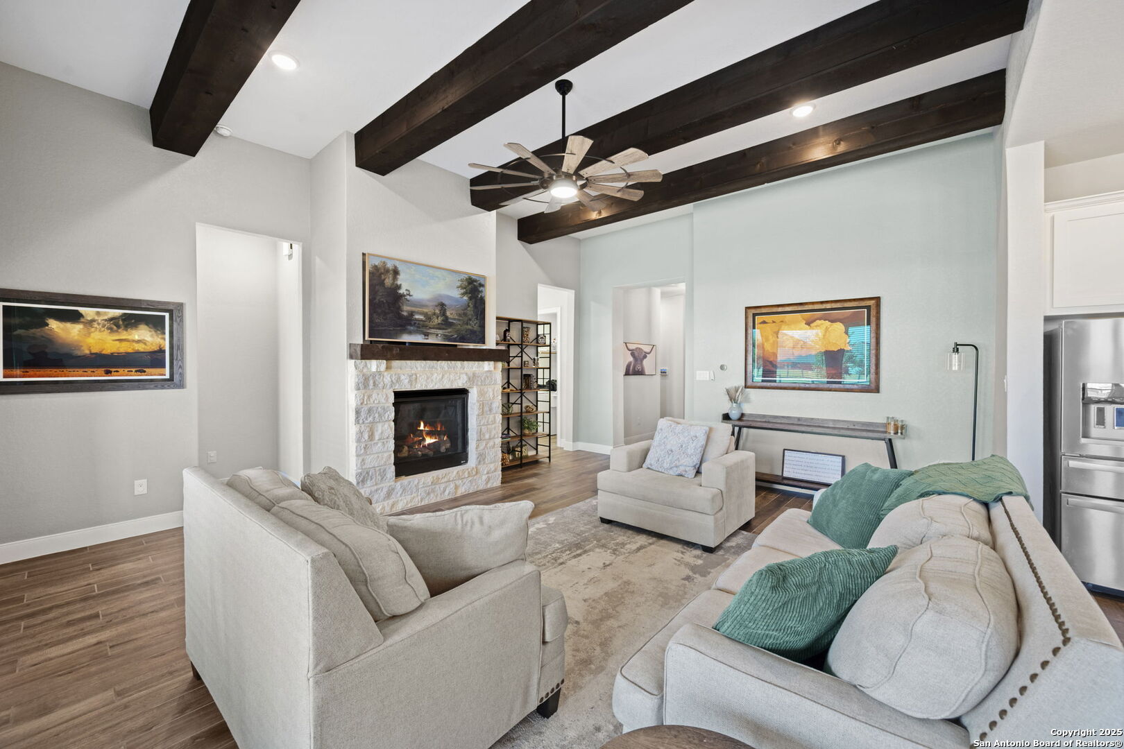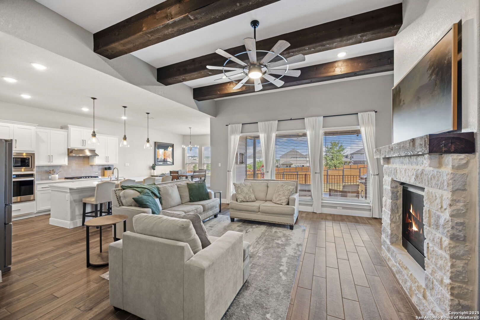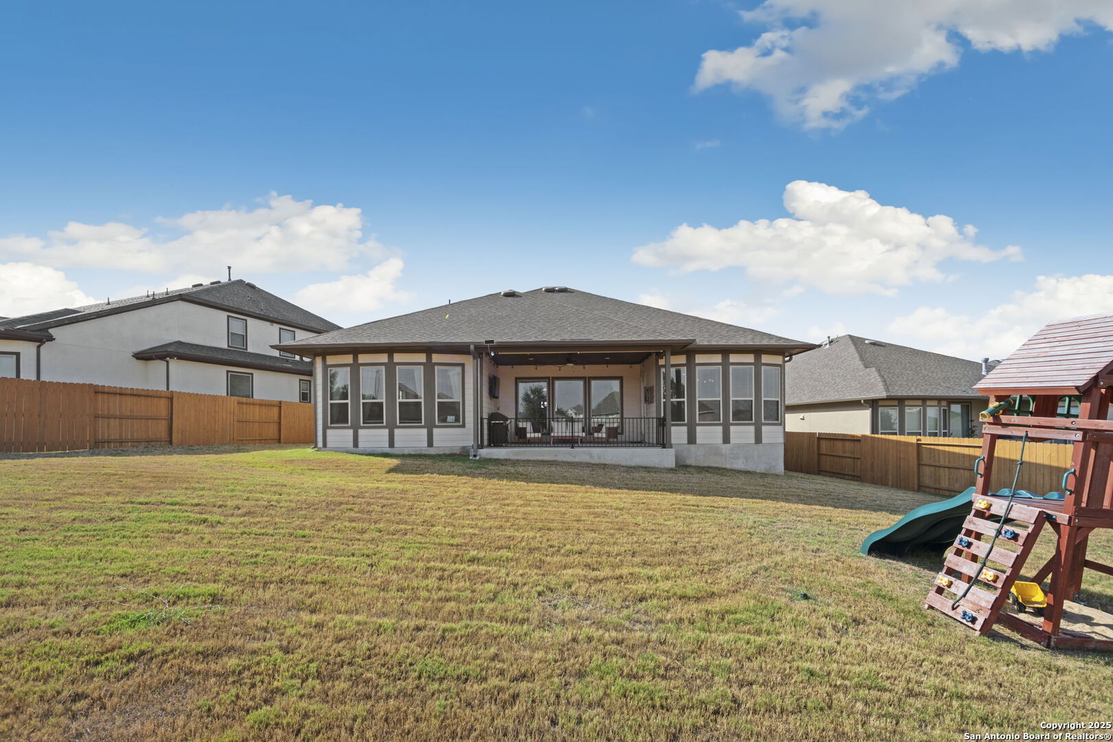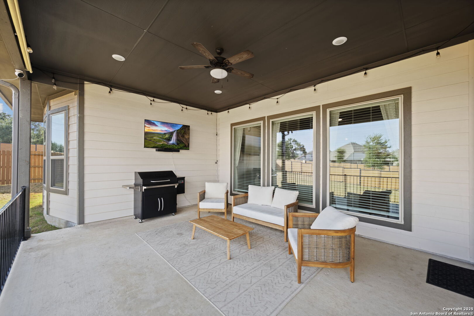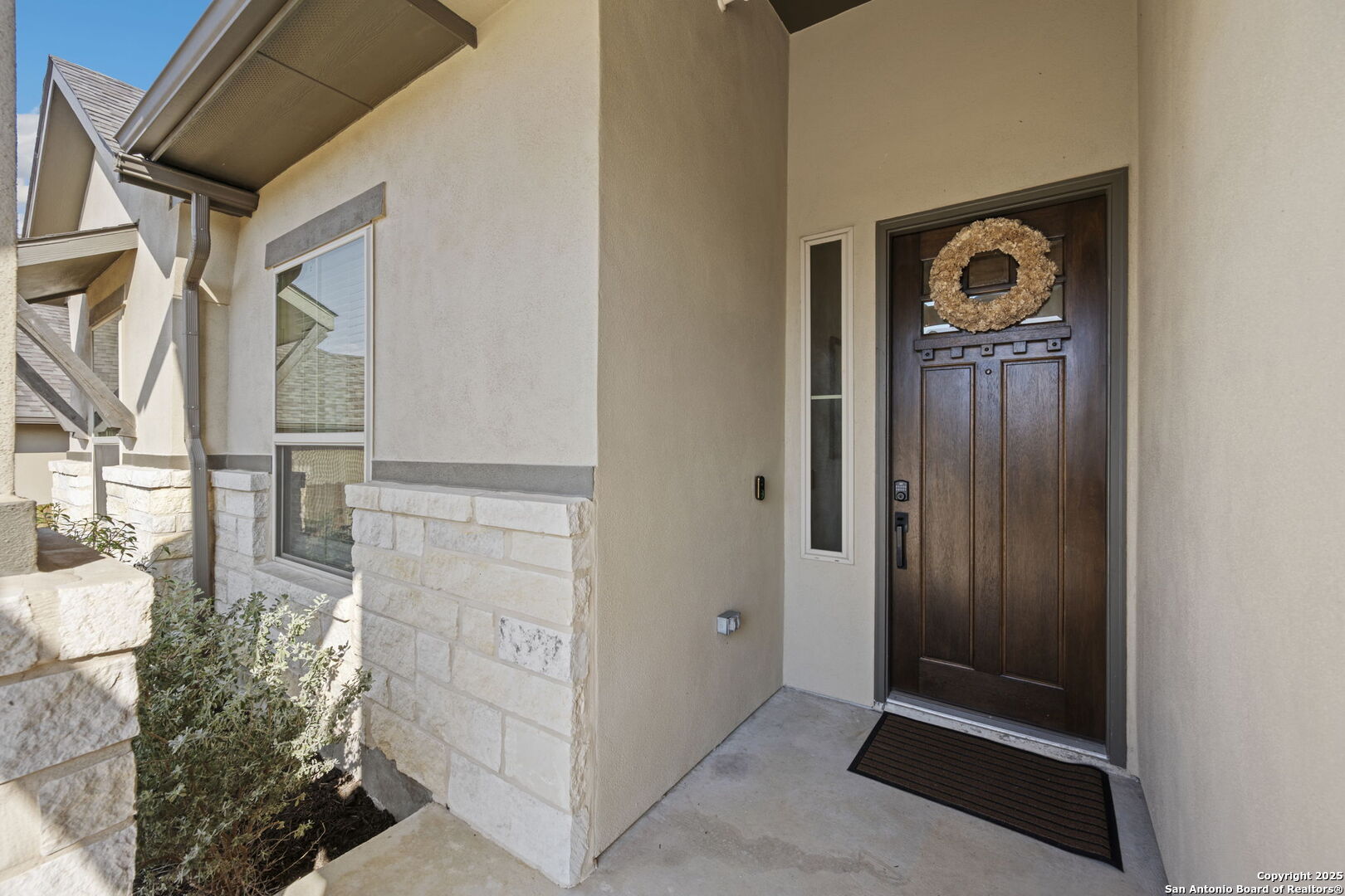 Enjoy the ease of one-story living in this 2,313 sq. ft. Princeton Classic home on a .26-acre lot. With 4 bedrooms and 3 full baths, including a private en suite for guests, there's room for everyone. The owner's retreat is a true escape with tray ceiling, bay windows, and a spa-inspired bath featuring dual vanities, walk-in shower, garden tub, and a generous closet. The heart of the home is the chef's kitchen with quartz counters, gas cooking, and walk-in pantry, opening to an oversized dining area framed by bay windows. Gather in the warm living room with beamed ceilings and fireplace or make use of the versatile flex room with glass doors-perfect for an office, media, or game space. Evenings are made for the oversized covered patio with manual solar shades, overlooking a spacious yard and picture-perfect Texas sunsets. With premier Meyer Ranch amenities, this home blends comfort, style, and community in a way that's hard to beat.