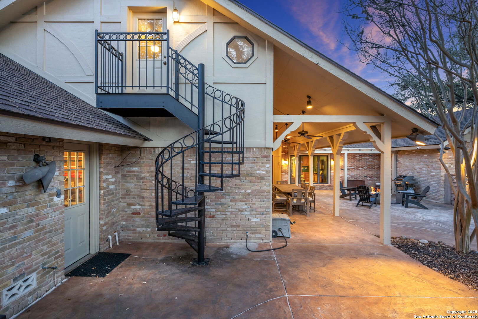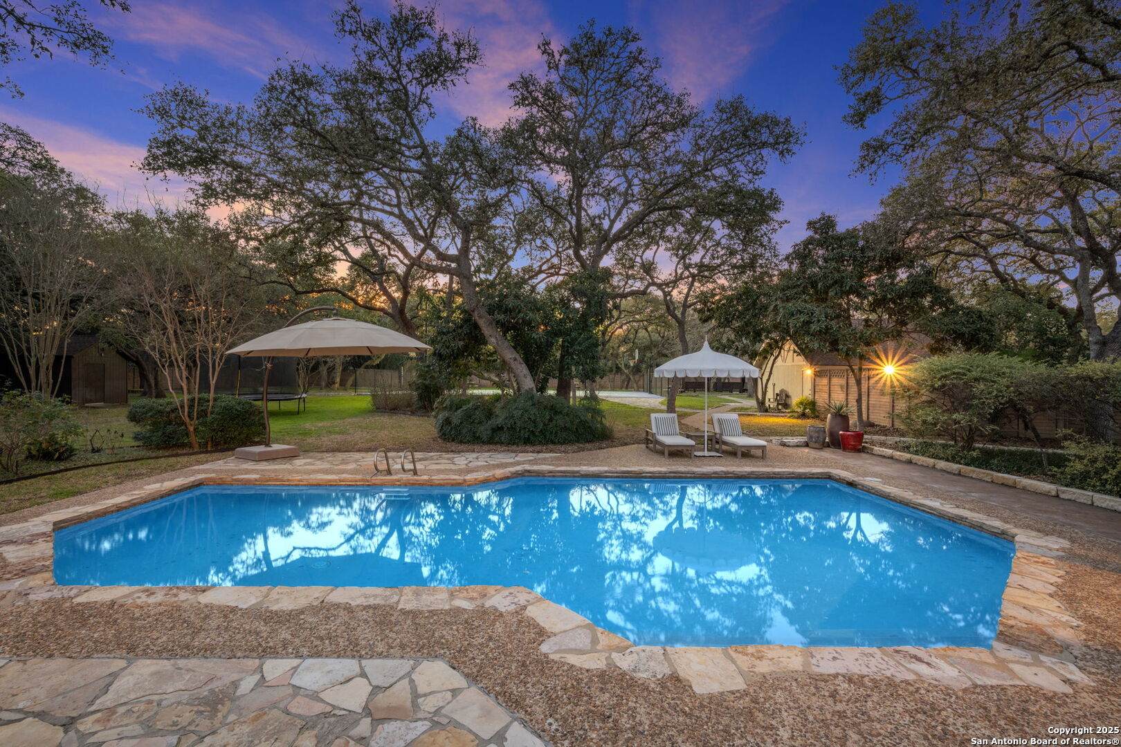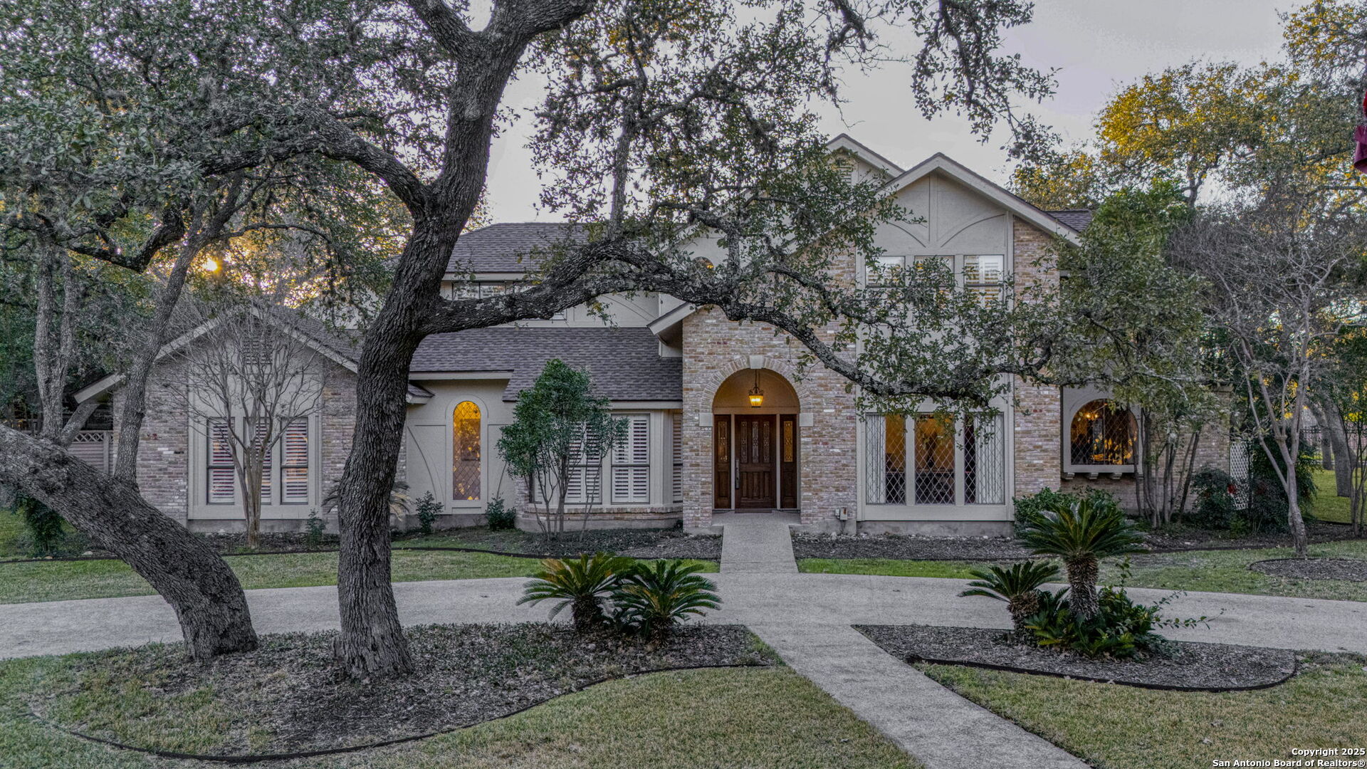This luxurious Tudor-style residence offers a functional layout with 5 spacious bedrooms and 4 full baths. Nestled on two acres of beautifully landscaped land, it provides a perfect blend of country living while being conveniently close to highways, retail, and dining options. As you enter, you'll be greeted by natural light pouring through lead glass windows, illuminating the living spaces. The cathedral ceilings add to the home's elegance, making it feel open and inviting. The heart of the home is the well-equipped kitchen featuring stainless steel Viking refrigerator, double ovens, warming drawer, and gas cooktop with four burners and a griddle. Large breakfast room with built-ins. The kitchen is open to the spacious living room with fireplace, large windows, and more built-in cabinetry. Luxurious primary suite with large walk-in closet, separate vanities, jetted tub, and spacious shower. Enjoy working from home in your dedicated study with a pretty view of the backyard. Upstairs are three large bedrooms, two with walk-in closets, and full bath with double vanity. Additional secondary bedroom/bath on the first floor is currently being used as a playroom. Dream utility room with abundant cabinet/counter space, utility sink, and room for a fridge. Additional features include beautiful hardwood and tile flooring, arched windows and doorways framed in wood, and plantation shutters. Garage apartment (or flex space) with one bedroom and full bath. Outside, enjoy your private oasis featuring an inground pool surrounded by shady oak trees and a lighted tennis/sports court for active recreation. Concrete sidewalks make much of the yard wheelchair accessible. The property offers plenty of space for outdoor activities or simply relaxing in a serene setting. Plenty of parking and storage space are provided by the attached 2-car garage, detached 2-car garage, additional parking pads and circular driveway. This home truly combines luxury with comfort, making it a perfect retreat in the vibrant city of San Antonio.
