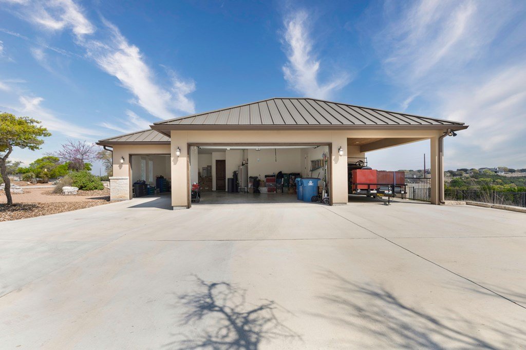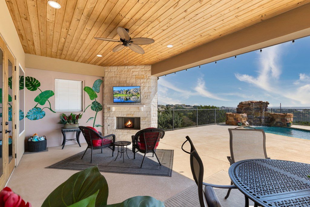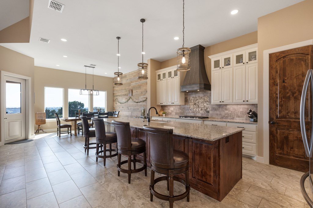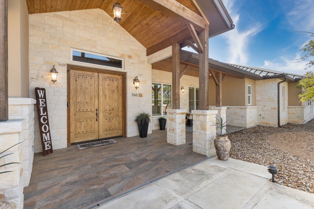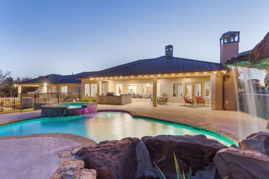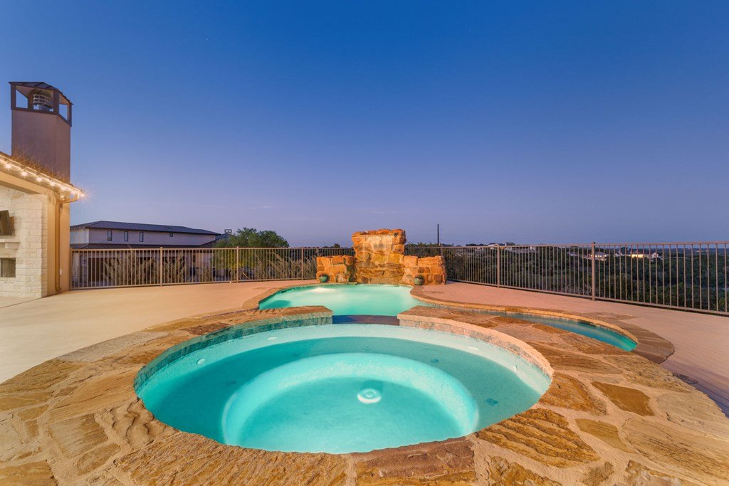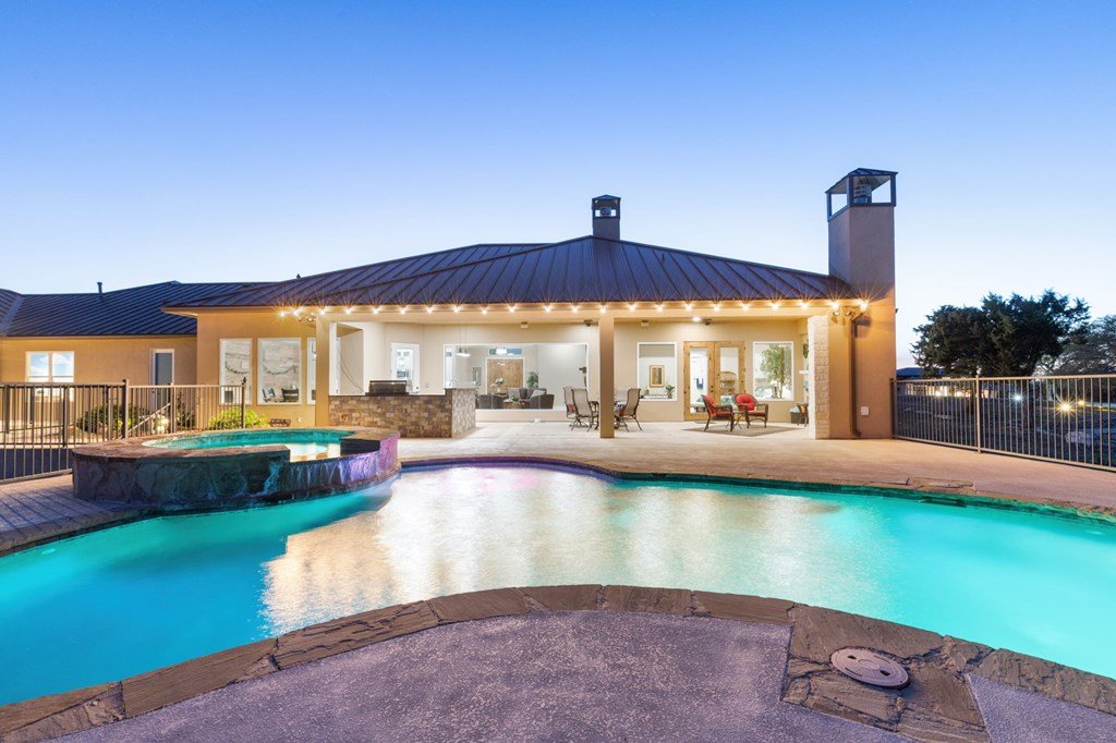Experience Hill Country living at its finest from this stunning hilltop home, offering breathtaking panoramic views and exceptional amenities just minutes from town. Situated on over three wooded acres in a quiet cul-de-sac, this newer custom home blends privacy, comfort, and thoughtful design. Inside, the single-level layout features vaulted ceilings, expansive picture windows, and an open-concept great room that perfectly frames the surrounding landscape. The gourmet kitchen is a true centerpiece, highlighted by a handmade custom vent hood, quality finishes, and ample space for gathering. Tile flooring runs throughout, complemented by an impressive stone fireplace that adds warmth and character. The spacious primary suite is a private retreat, complete with a coffered ceiling, spa-like ensuite featuring a marble soaking tub, walk-in shower, dual vanities, and generous closet space. A split floor plan places two guest bedrooms on the opposite side of the home, sharing a well-appointed bath with separate vanities, while an additional full bath offers convenient access to the pool area. Designed for entertaining, the outdoor living space is unmatched. Enjoy an extended covered deck with a built-in barbecue, sink, and dual mini fridges—all perfectly positioned to capture afternoon shade and overlook the custom pool and spa with a dramatic waterfall feature. The property also includes a large gated lawn, private trails, a charming log cabin with a wood-burning stove and sleeping space, a bridge, and a firepit—creating a true Hill Country escape. Additional highlights include an extended three-car garage and carport, whole-house generator, instant hot water circulation system, and wired outdoor speakers. As an added bonus, select furnishings, smart TVs, and even a UTV may convey with the sale, making this an incredible turnkey opportunity.