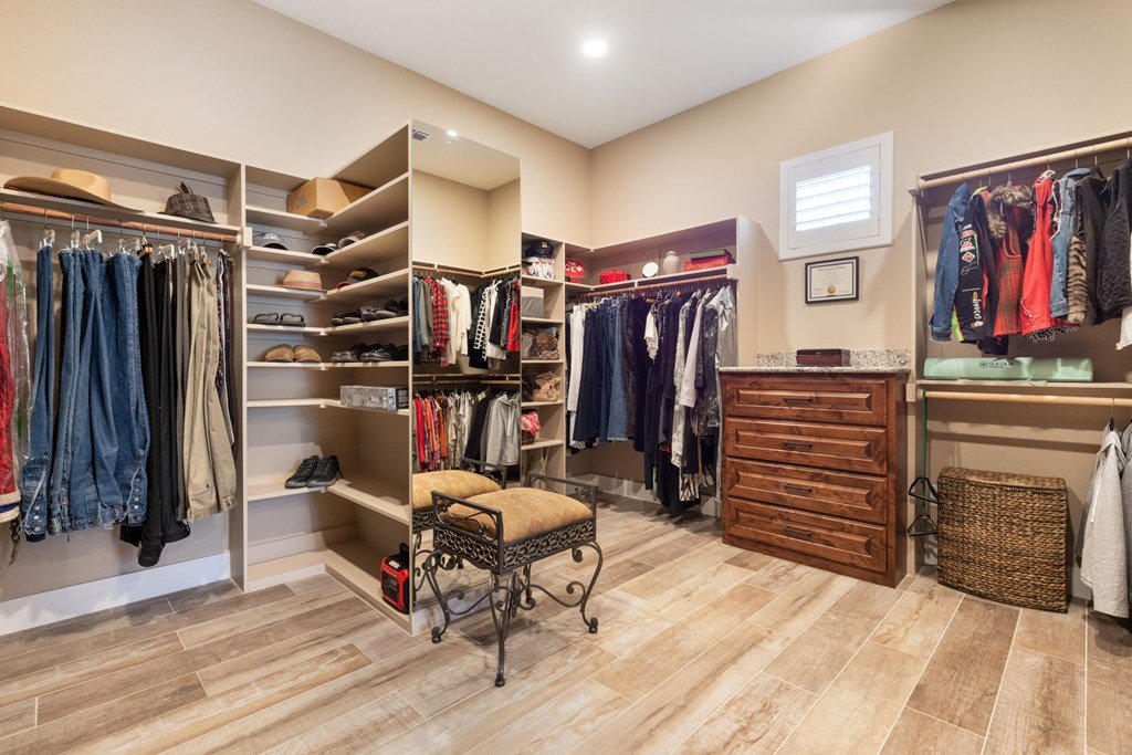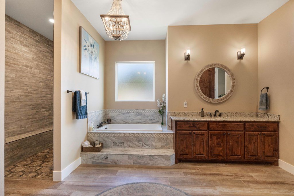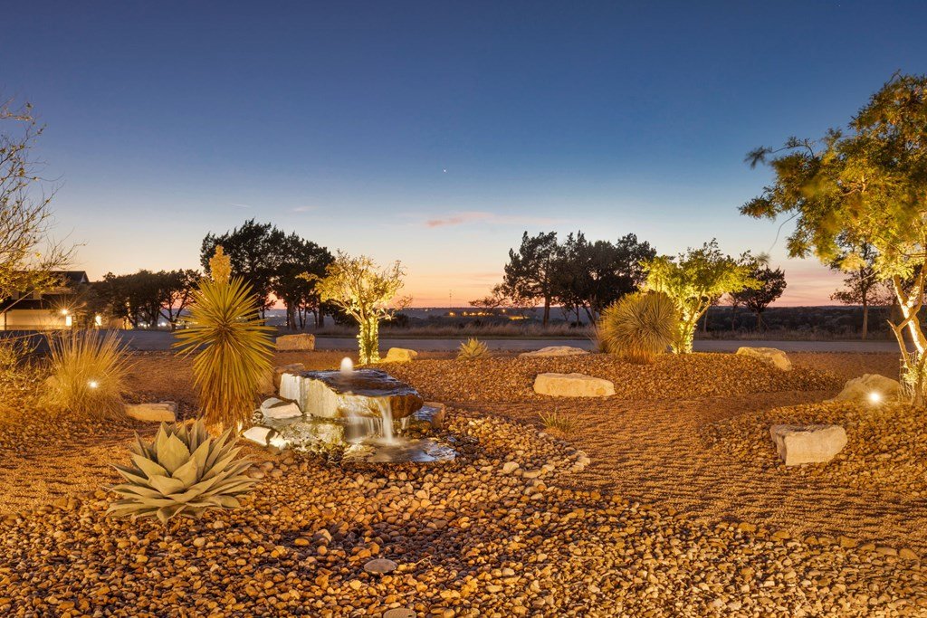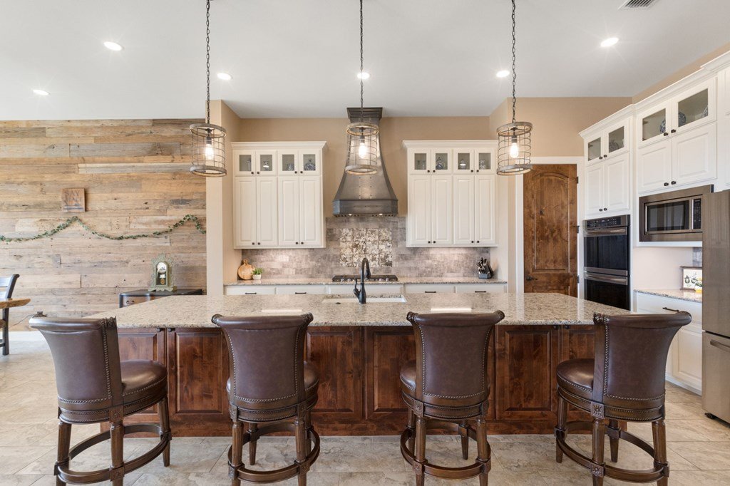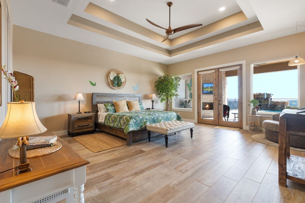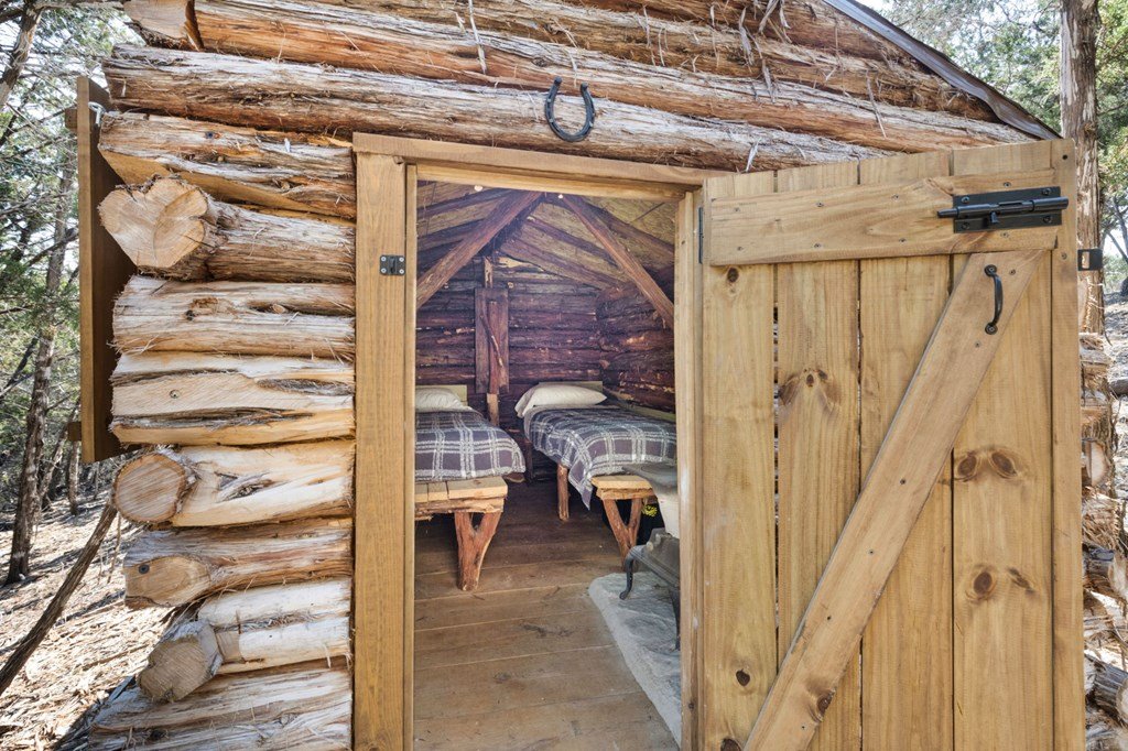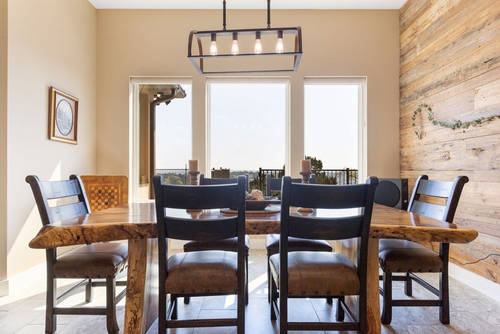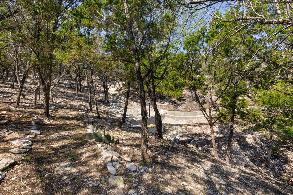 Experience Hill Country living at its finest from this stunning hilltop home, offering breathtaking panoramic views and exceptional amenities just minutes from town. Situated on over three wooded acres in a quiet cul-de-sac, this newer custom home blends privacy, comfort, and thoughtful design. Inside, the single-level layout features vaulted ceilings, expansive picture windows, and an open-concept great room that perfectly frames the surrounding landscape. The gourmet kitchen is a true centerpiece, highlighted by a handmade custom vent hood, quality finishes, and ample space for gathering. Tile flooring runs throughout, complemented by an impressive stone fireplace that adds warmth and character. The spacious primary suite is a private retreat, complete with a coffered ceiling, spa-like ensuite featuring a marble soaking tub, walk-in shower, dual vanities, and generous closet space. A split floor plan places two guest bedrooms on the opposite side of the home, sharing a well-appointed bath with separate vanities, while an additional full bath offers convenient access to the pool area. Designed for entertaining, the outdoor living space is unmatched. Enjoy an extended covered deck with a built-in barbecue, sink, and dual mini fridges—all perfectly positioned to capture afternoon shade and overlook the custom pool and spa with a dramatic waterfall feature. The property also includes a large gated lawn, private trails, a charming log cabin with a wood-burning stove and sleeping space, a bridge, and a firepit—creating a true Hill Country escape. Additional highlights include an extended three-car garage and carport, whole-house generator, instant hot water circulation system, and wired outdoor speakers. As an added bonus, select furnishings, smart TVs, and even a UTV may convey with the sale, making this an incredible turnkey opportunity.