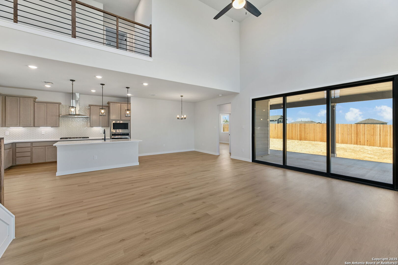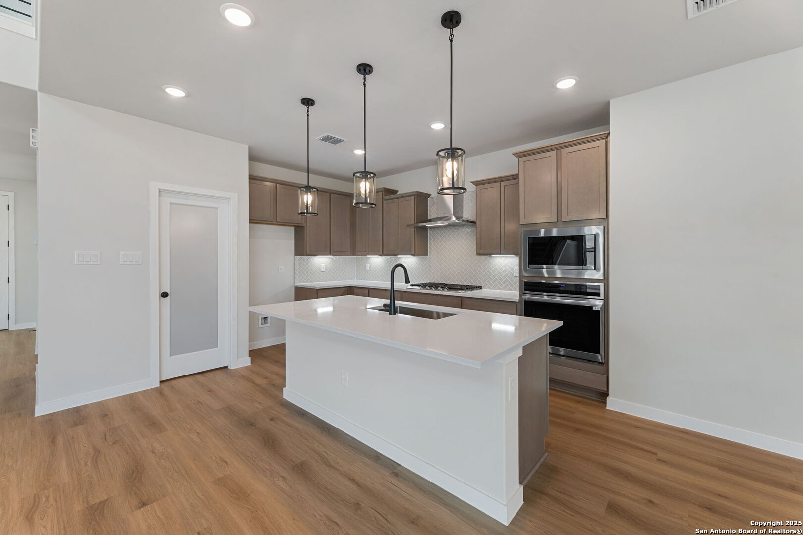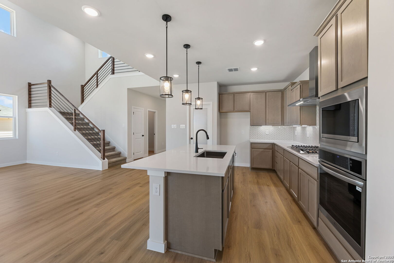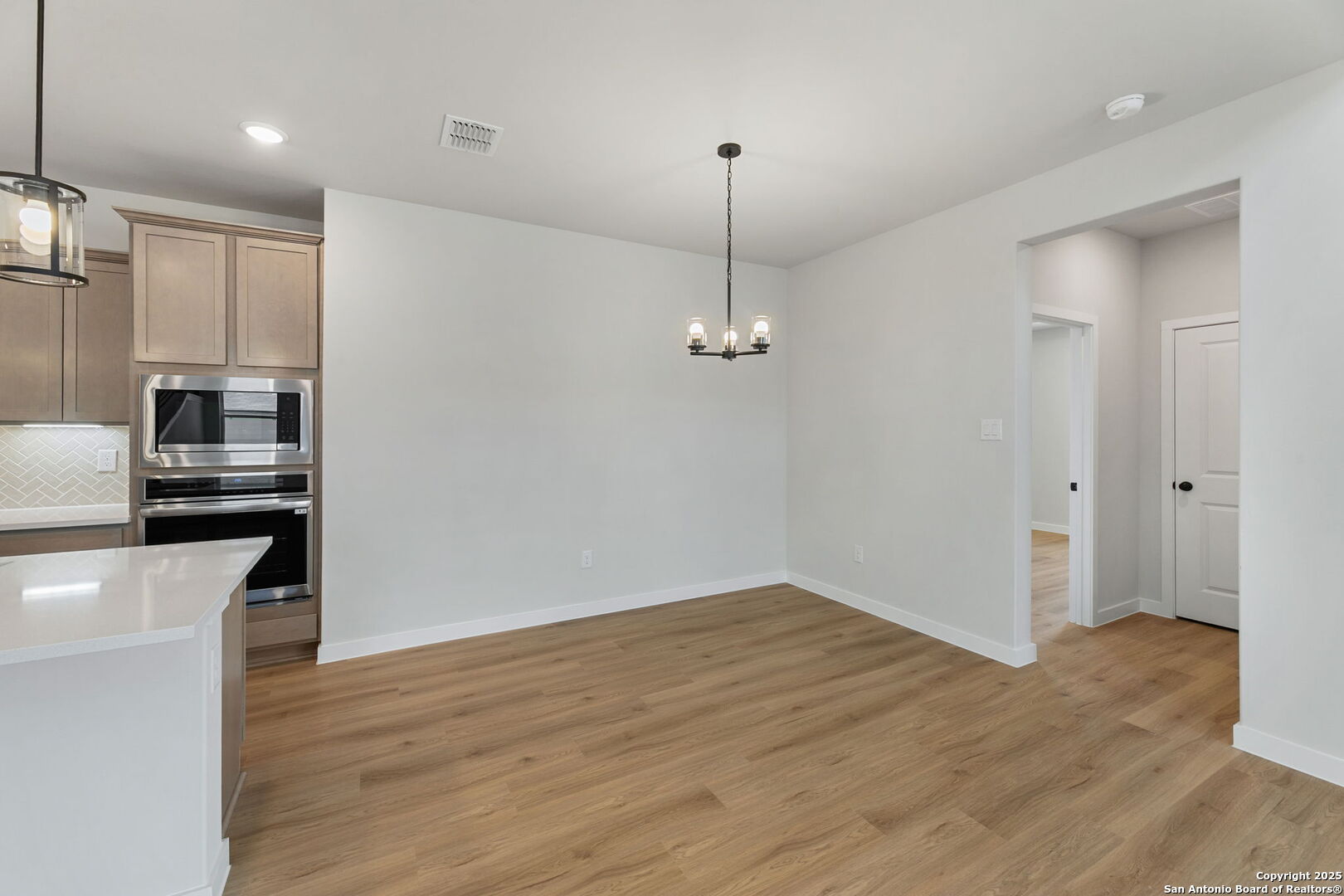 The beautifully upgraded Poinsettia plan blends warmth, style, and functionality in a layout designed for modern living. With striking Modern Farmhouse curb appeal and an 8-ft front door that makes a grand first impression, this home invites you into a light-filled interior featuring luxury vinyl plank flooring throughout the first floor for easy maintenance and timeless charm. The spacious Great Room stuns with soaring ceilings and a dramatic overlook from the second floor accented by elegant iron railing, while a 12-ft wide stacking glass door seamlessly connects indoor and outdoor living-perfect for entertaining-opening to an extended covered patio that's ideally shaded for relaxing late afternoons and evenings. The heart of the home is a chef-inspired gourmet kitchen with a 5-burner gas cooktop, built-in stainless appliances, and a designer finish-out that includes warm grey stained Shaker cabinets, crisp white quartz countertops, and a herringbone-pattern taupe backsplash-creating a space that's as beautiful as it is functional. The downstairs owner's suite is a peaceful retreat with a walk-in shower, dual vanity with generous storage, and an oversized walk-in closet. A flexible bonus room downstairs adapts to your lifestyle-ideal for an office, gym, or playroom. Upstairs, a cozy loft offers a second living area flanked by three well-sized secondary bedrooms, and a thoughtfully designed full bathroom provides extra privacy with a separate vanity and wet area. Additional linen closets upstairs ensure everyone has room to stay organized. Designed for connection and comfort, this home offers the perfect balance of shared spaces and quiet corners for every member of the household. Visit our Hakes Brothers model home in Hickory Ridge to tour this home today!