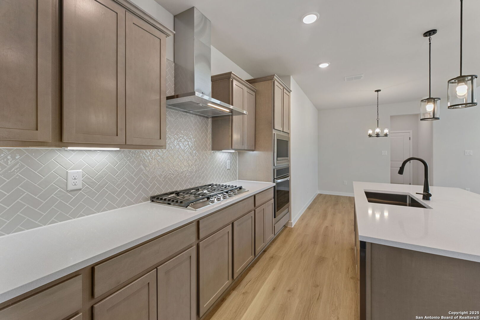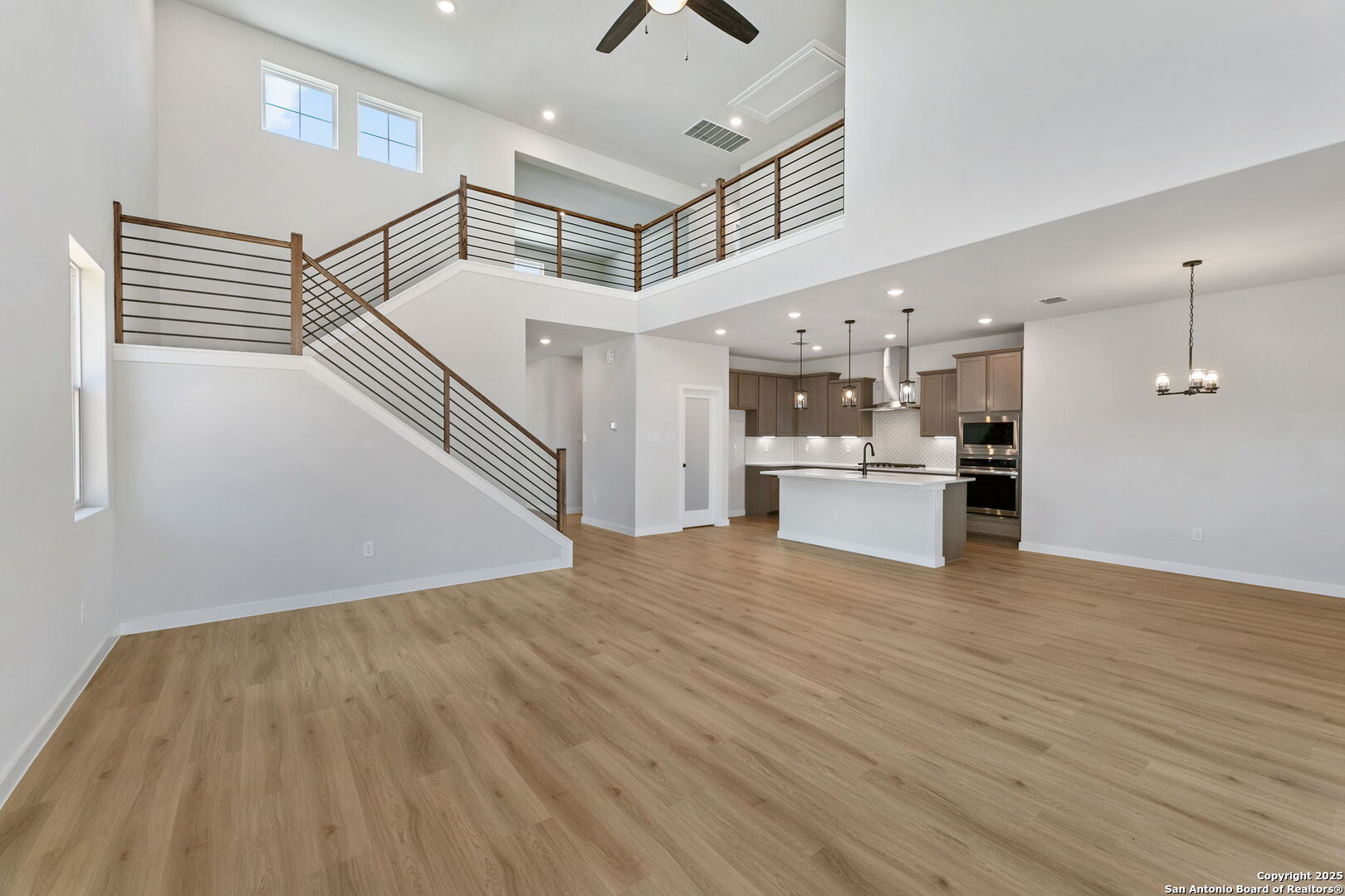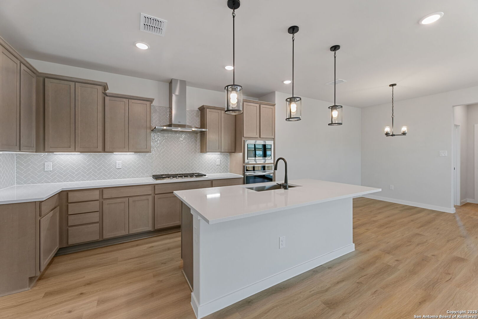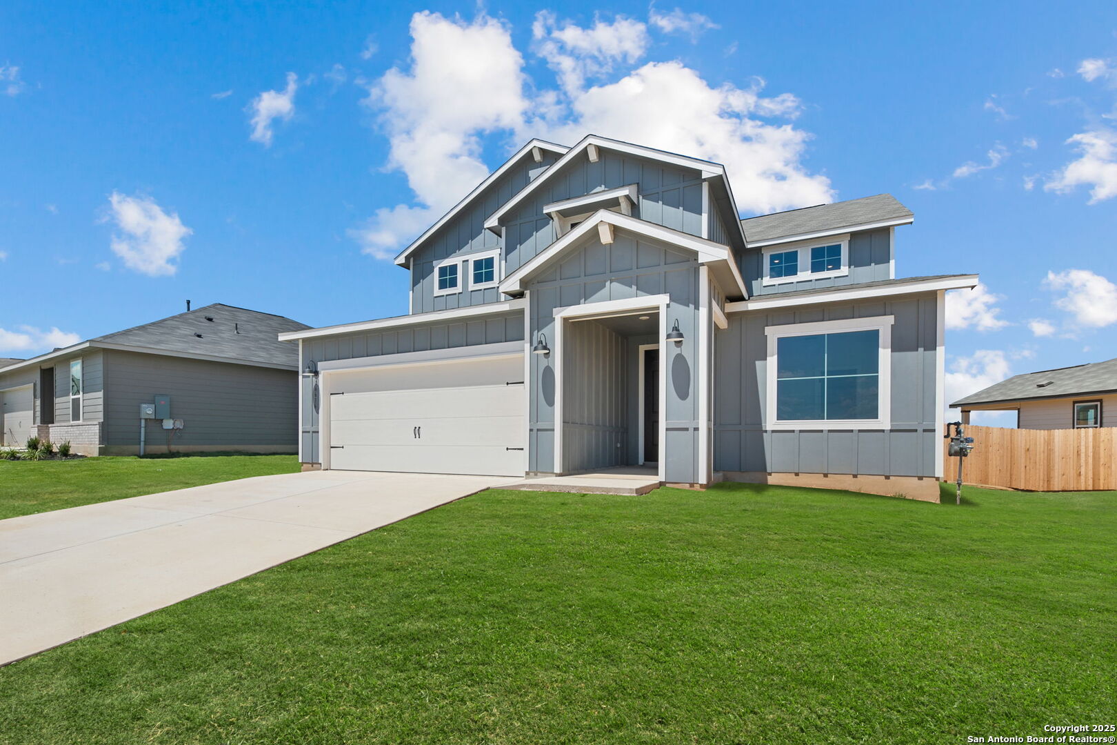 The beautifully upgraded Poinsettia plan blends warmth, style, and functionality in a layout designed for modern living. With striking Modern Farmhouse curb appeal and an 8-ft front door that makes a grand first impression, this home invites you into a light-filled interior featuring luxury vinyl plank flooring throughout the first floor for easy maintenance and timeless charm. The spacious Great Room stuns with soaring ceilings and a dramatic overlook from the second floor accented by elegant iron railing, while a 12-ft wide stacking glass door seamlessly connects indoor and outdoor living-perfect for entertaining-opening to an extended covered patio that's ideally shaded for relaxing late afternoons and evenings. The heart of the home is a chef-inspired gourmet kitchen with a 5-burner gas cooktop, built-in stainless appliances, and a designer finish-out that includes warm grey stained Shaker cabinets, crisp white quartz countertops, and a herringbone-pattern taupe backsplash-creating a space that's as beautiful as it is functional. The downstairs owner's suite is a peaceful retreat with a walk-in shower, dual vanity with generous storage, and an oversized walk-in closet. A flexible bonus room downstairs adapts to your lifestyle-ideal for an office, gym, or playroom. Upstairs, a cozy loft offers a second living area flanked by three well-sized secondary bedrooms, and a thoughtfully designed full bathroom provides extra privacy with a separate vanity and wet area. Additional linen closets upstairs ensure everyone has room to stay organized. Designed for connection and comfort, this home offers the perfect balance of shared spaces and quiet corners for every member of the household. Visit our Hakes Brothers model home in Hickory Ridge to tour this home today!