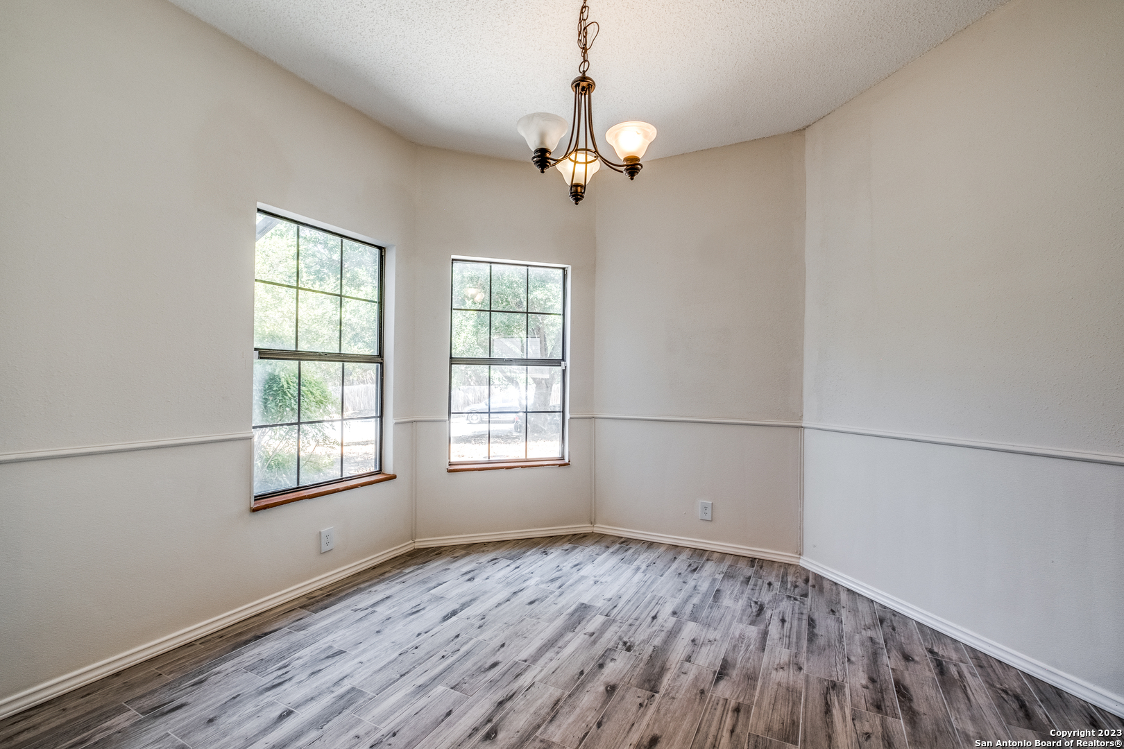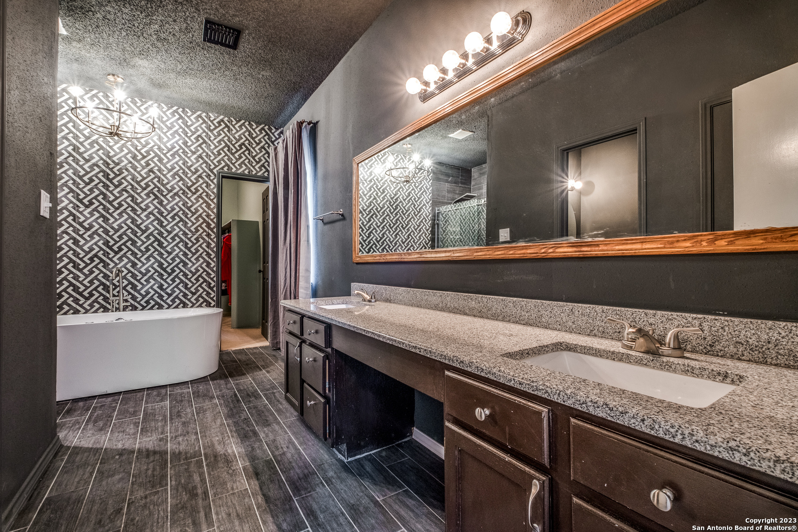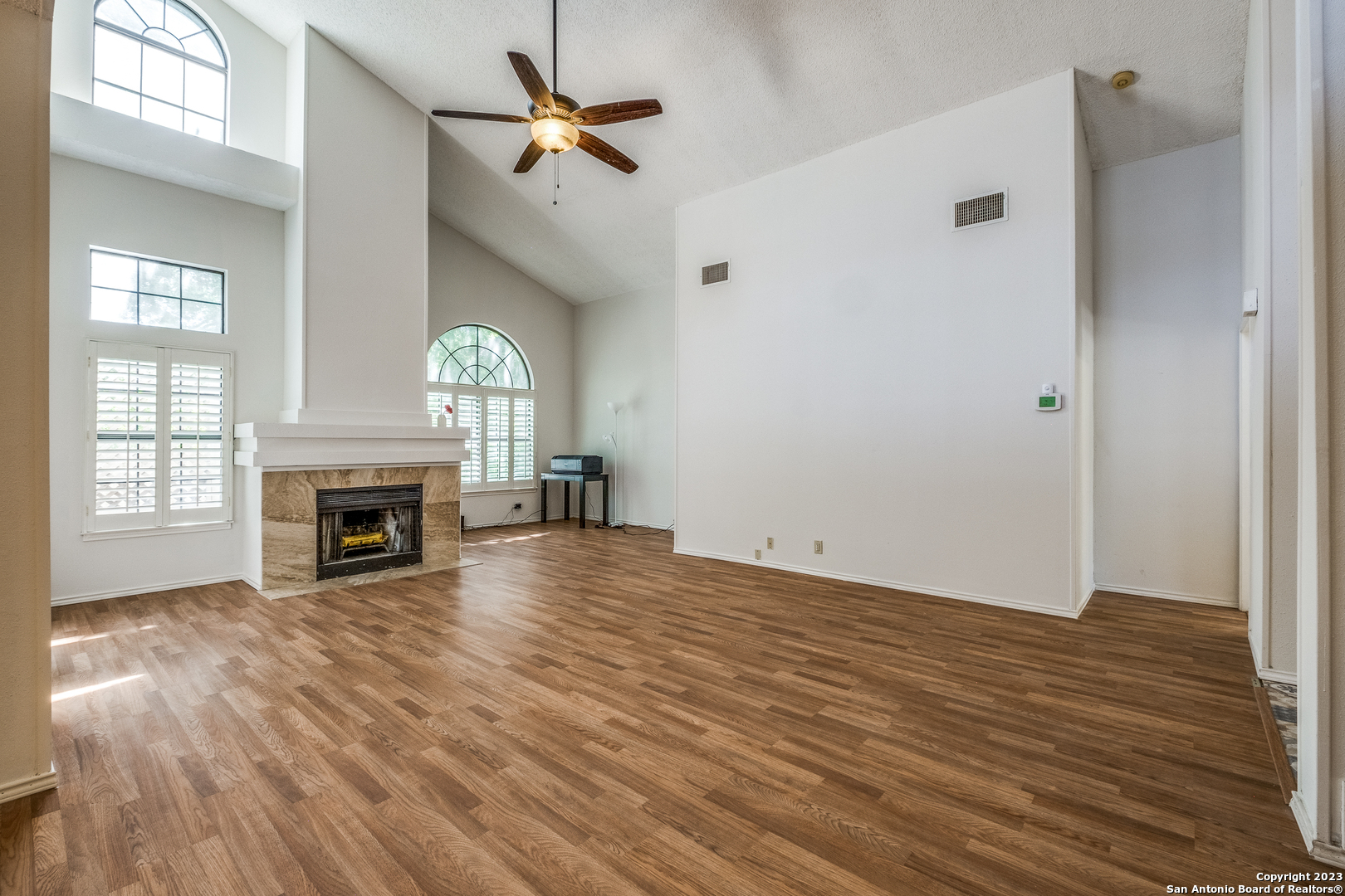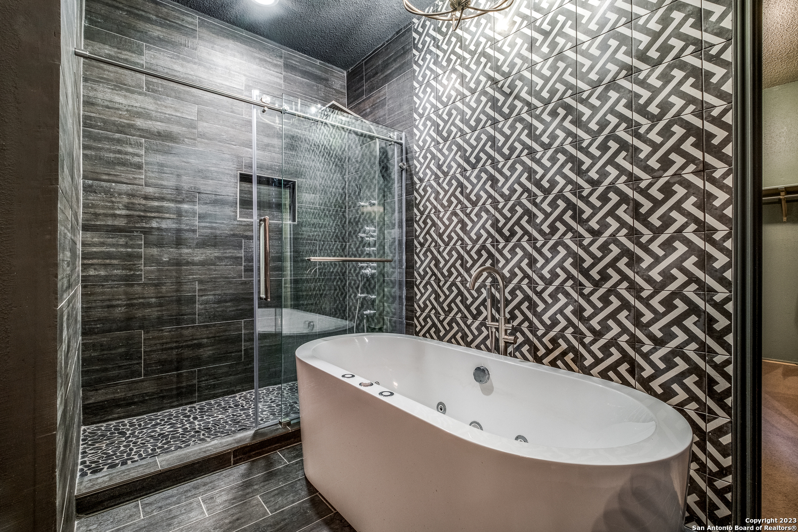 Welcome to this charming two-story home in the Eden Roc community located near Loop 1604, 281, Morgan's Wonderland, Retama Park, Heroes Stadium, and so much more! Upon entering the home, you are greeted by natural light, soaring ceilings, many great windows, hardwood flooring throughout, a separate dining room, and a wood burning fireplace. The main level Master Bedroom has its own fireplace and a beautifully updated modern, master bathroom, featuring a glass walk-in shower, a standalone jetted tub, a dual vanity and a large walk-in closet. The tastefully updated Kitchen features abundant cabinetry, granite counter tops, a built-in oven, a glass cooktop and a breakfast nook. Upstairs, a second family room perfect for game night and two additional bedrooms. Step outside to the fully covered patio overlooking the large backyard with mature shade trees and a full privacy fence!