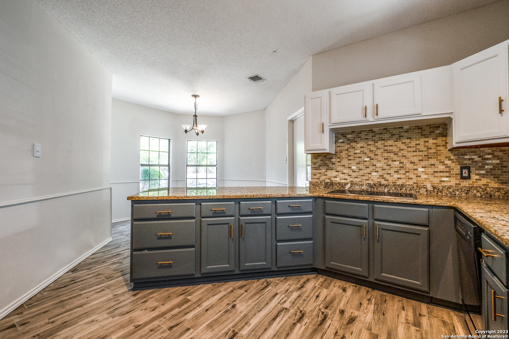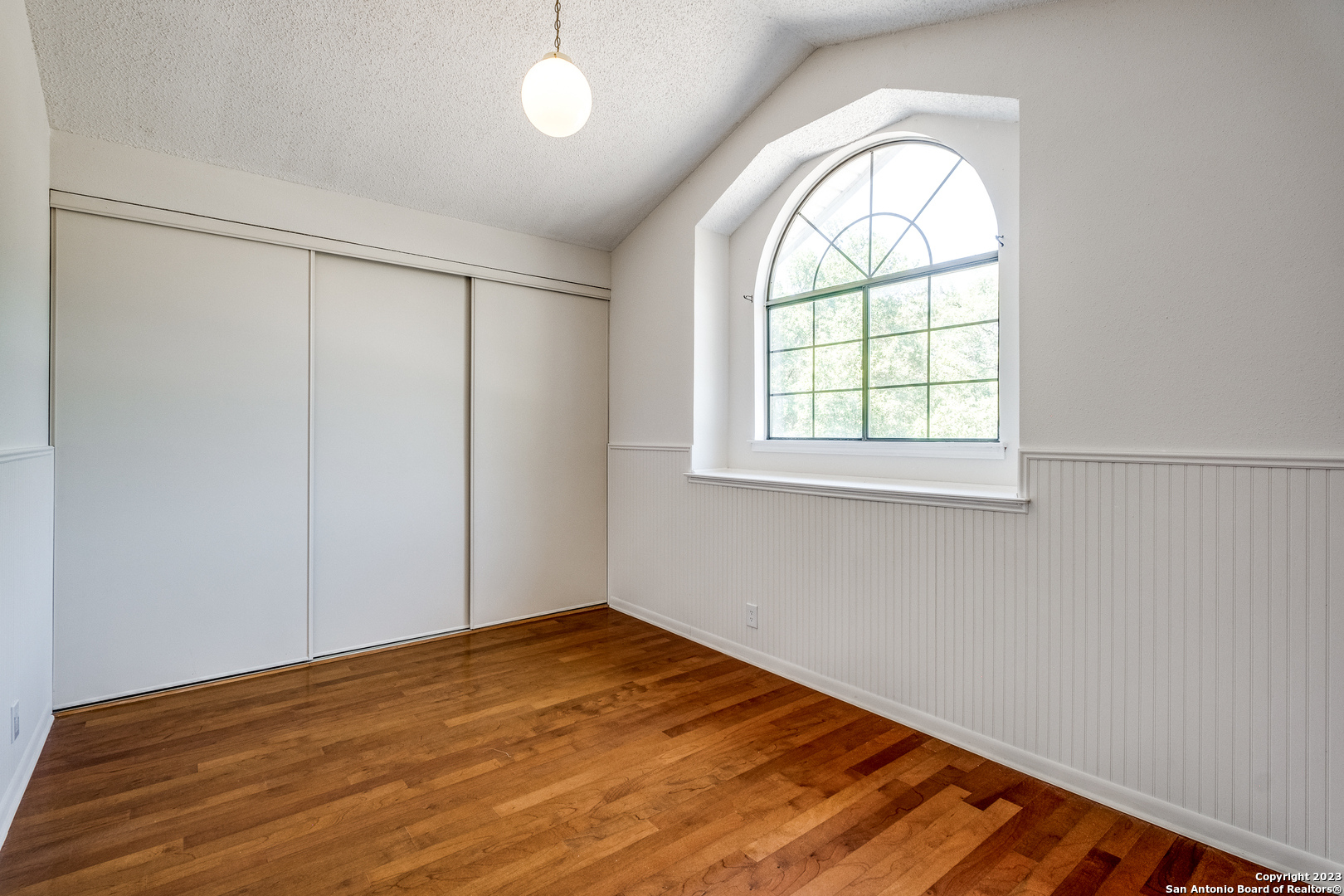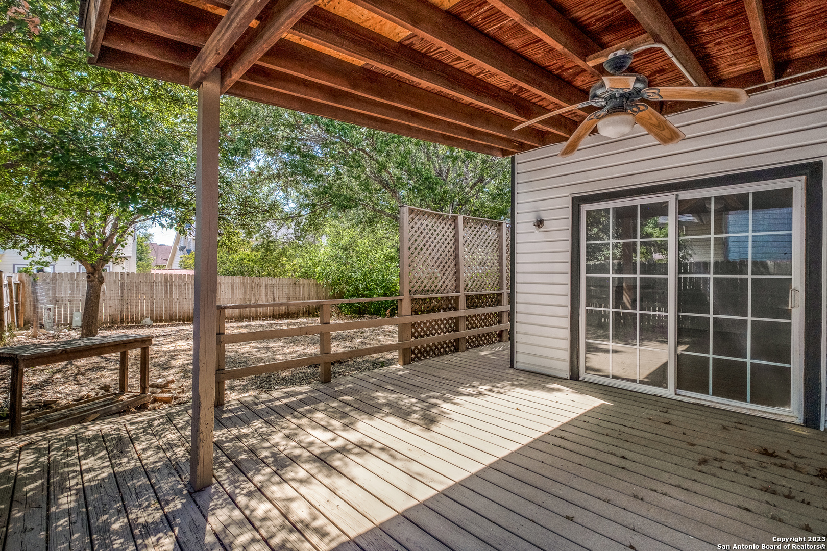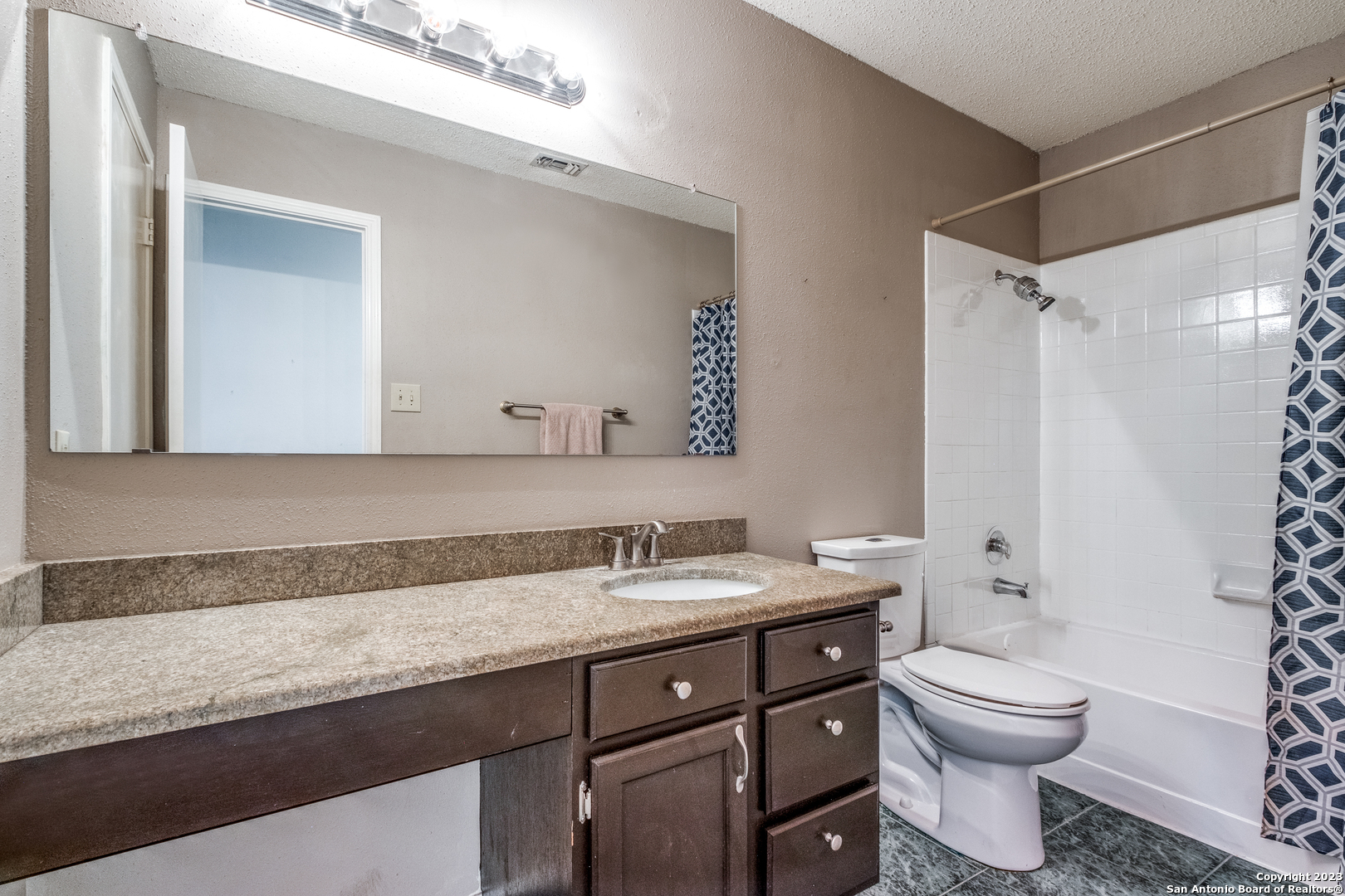 Welcome to this charming two-story home in the Eden Roc community located near Loop 1604, 281, Morgan's Wonderland, Retama Park, Heroes Stadium, and so much more! Upon entering the home, you are greeted by natural light, soaring ceilings, many great windows, hardwood flooring throughout, a separate dining room, and a wood burning fireplace. The main level Master Bedroom has its own fireplace and a beautifully updated modern, master bathroom, featuring a glass walk-in shower, a standalone jetted tub, a dual vanity and a large walk-in closet. The tastefully updated Kitchen features abundant cabinetry, granite counter tops, a built-in oven, a glass cooktop and a breakfast nook. Upstairs, a second family room perfect for game night and two additional bedrooms. Step outside to the fully covered patio overlooking the large backyard with mature shade trees and a full privacy fence!