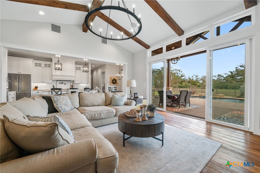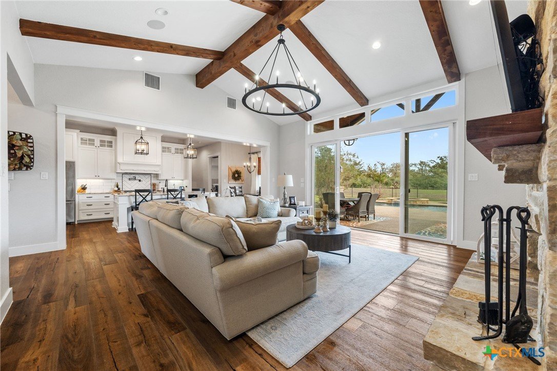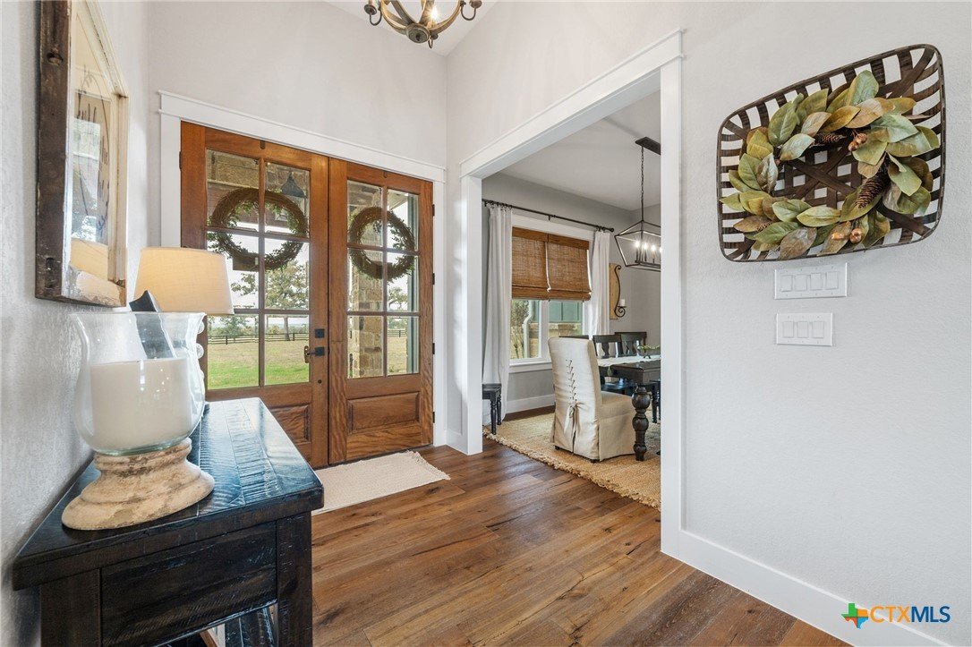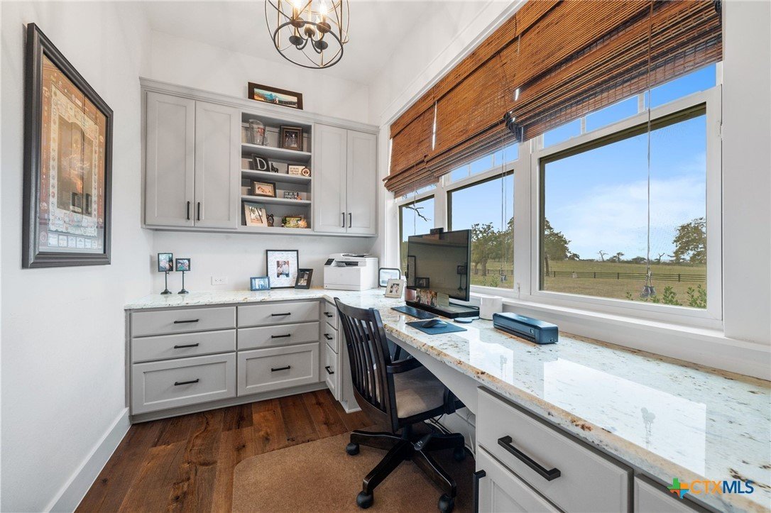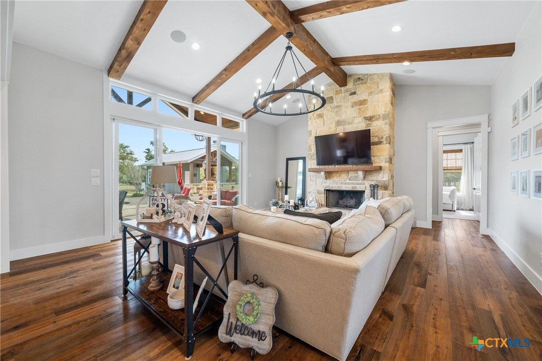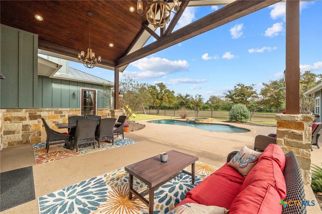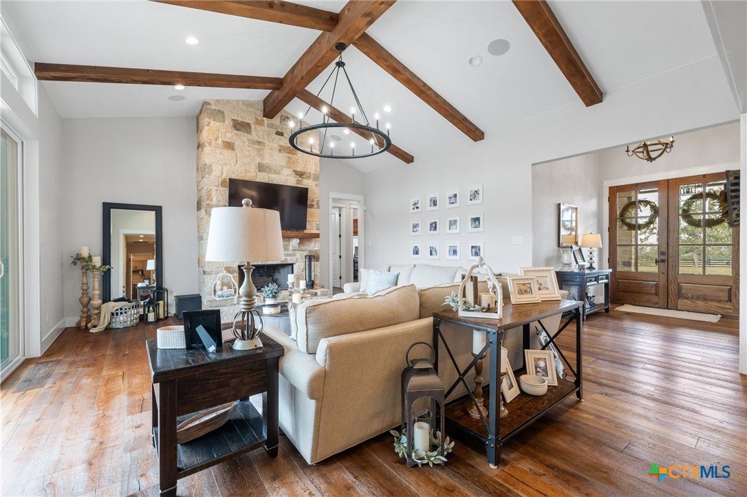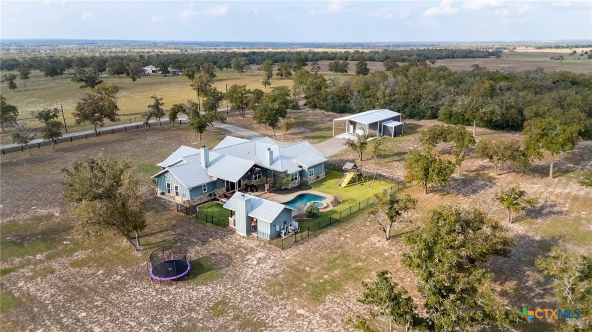 This exceptional country home offers approximately 2,303 sq. ft. of thoughtfully designed living space. The beautiful vaulted family room features a cozy fireplace and flows seamlessly into the open kitchen, complete with a gas stove, pot filler, custom cabinetry, and abundant workspace—perfect for entertaining. A formal dining room adds an elegant touch for special gatherings. The primary suite is a true retreat, featuring its own fireplace, a luxurious bath with a walk-in shower and soaking tub, and a spacious walk-in closet with custom built-ins. Additional highlights include a home office, mudroom, walk-in pantry, two beautifully appointed guest bedrooms, and a guest bath. Step outside to enjoy the large covered patio, outdoor kitchen, fireplace, inground pool, and pool house with bathroom, ideal for relaxing or hosting guests. The property is fully fenced with a custom wrought iron fence and includes a three-car attached garage. A standout feature is the 1,380 sq. ft. insulated workshop with a covered porch—perfect for hobbies, storage, or a home business. Enjoy stunning country views and abundant wildlife, all while being just minutes from Luling and Lockhart, offering a convenient commute with the peace of country living. This property is exceptional!