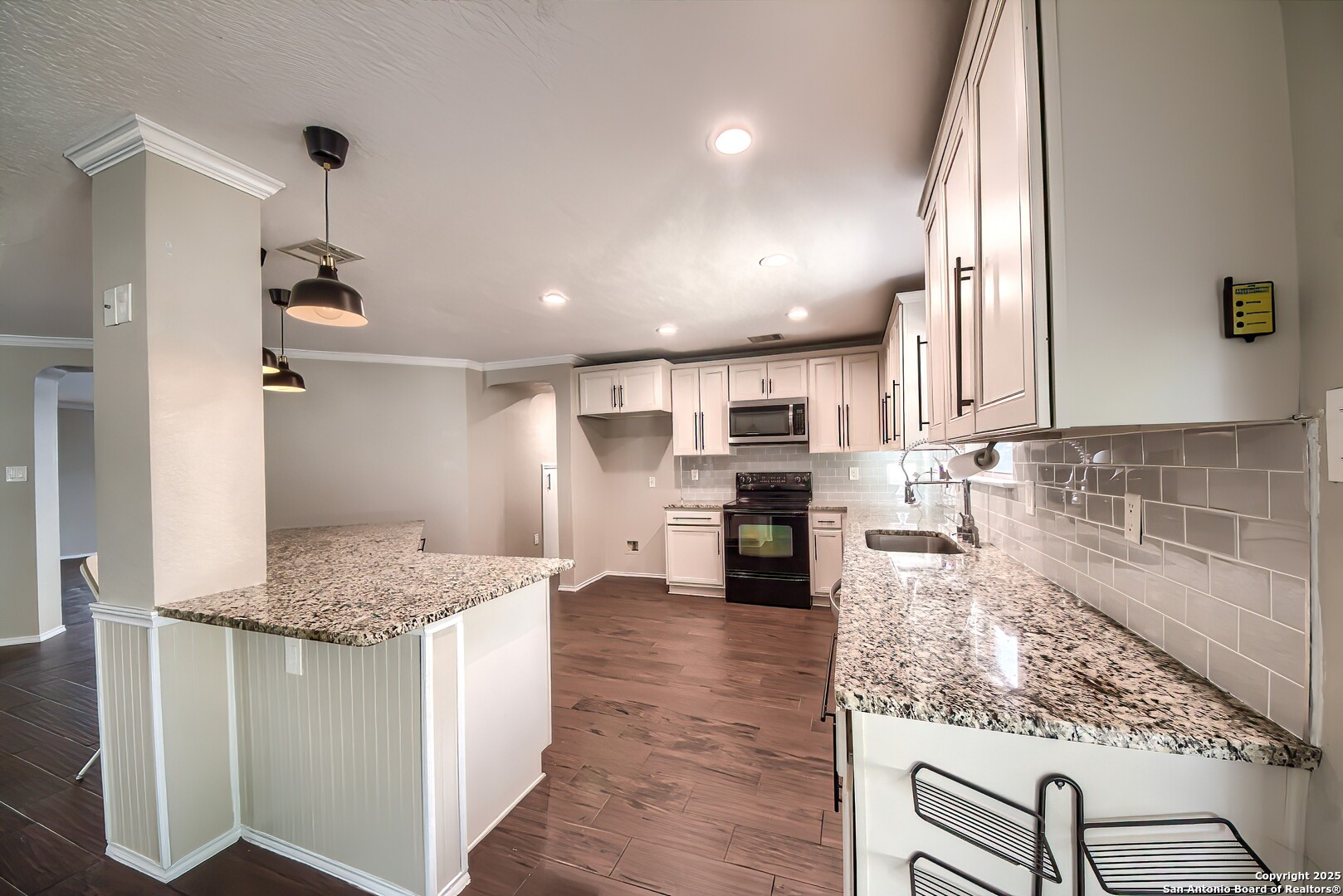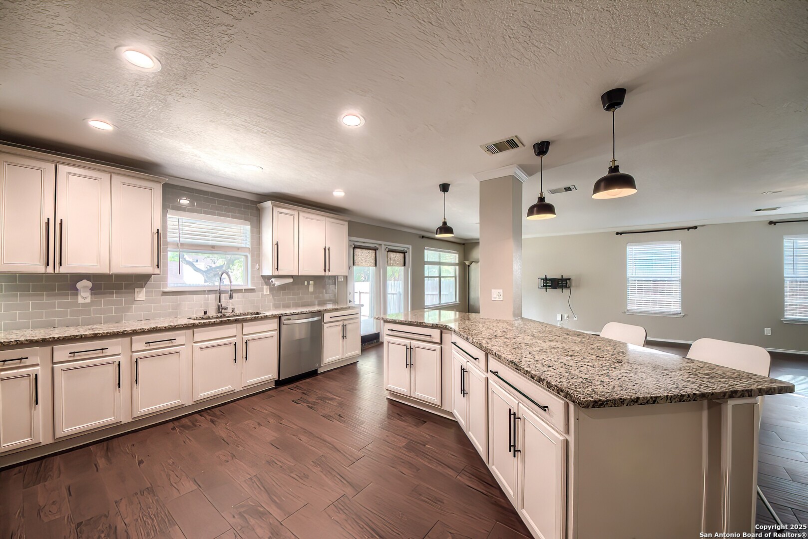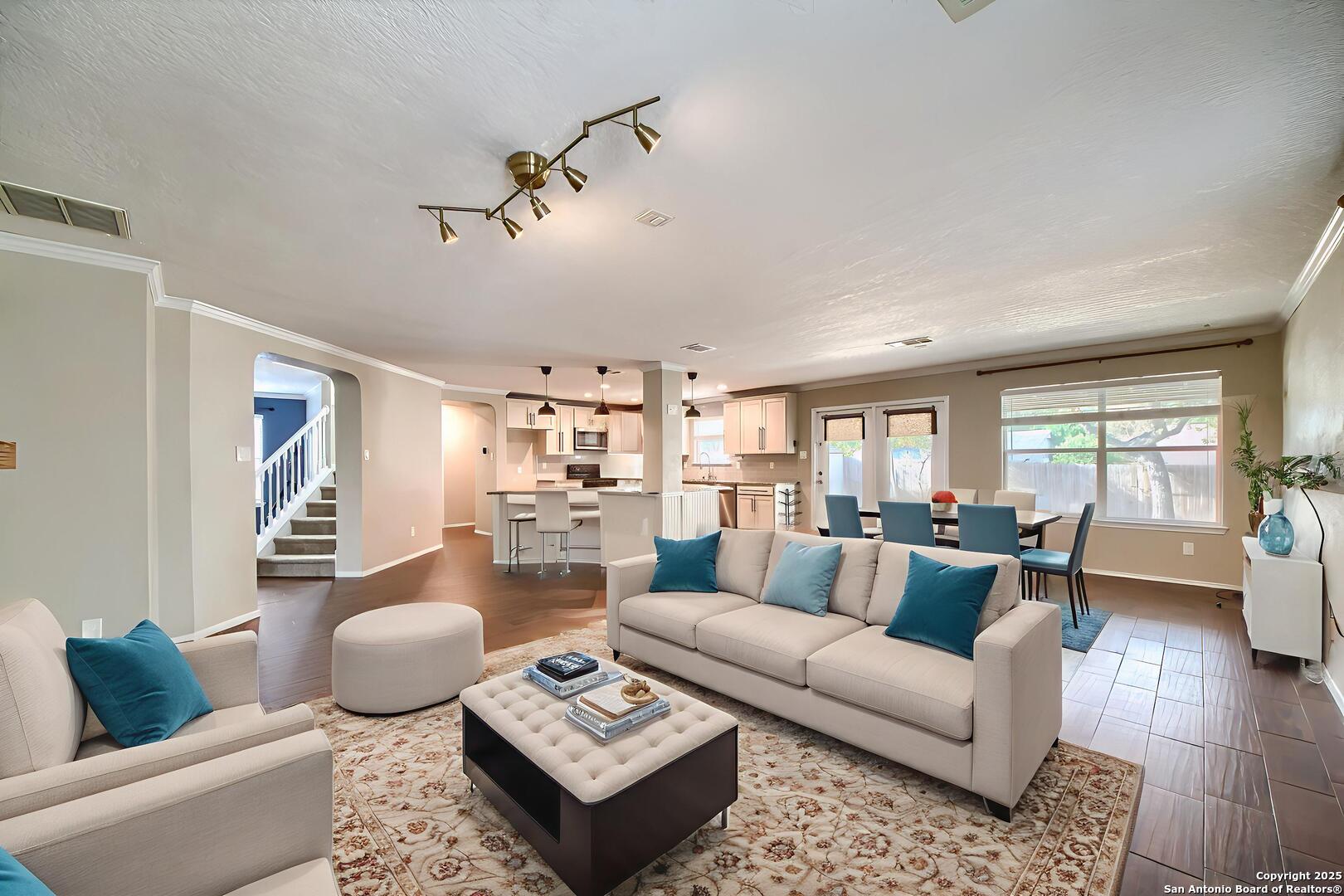 16739 Basin Oak, San Antonio, Texas. Welcome to this beautifully updated two-story home in the desirable Emerald Pointe community. Built in 2004, this 2,897 sq. ft. residence offers 4 spacious bedrooms, 2.5 bathrooms, and a thoughtful open layout perfect for family living and entertaining. Recent upgrades include a carpet, a 2025 HVAC system, a 2025 water heater, and a 3-year-old roof for peace of mind. The home showcases wood-look tile flooring downstairs, new carpet upstairs, and fresh modern paint throughout. The remodeled kitchen features 42" cabinets with crown molding, granite countertops, stainless steel appliances, and a breakfast bar overlooking the eat-in area and family room with a rock-accented electric fireplace. Upstairs, the large primary suite features an updated bathroom with a double vanity, tub/shower combination, and bidet. Three additional bedrooms share a second remodeled full bath, also with double vanities. Outdoor living features a covered front porch, a covered patio, a private fenced yard, a storage shed, and mature trees for added shade. Additional highlights include LED lighting, updated fixtures, and a two-car garage. Located in North East ISD near Loop 1604 and I-35, with quick access to Randolph AFB, Fort Sam Houston, The Forum, and San Antonio International Airport.