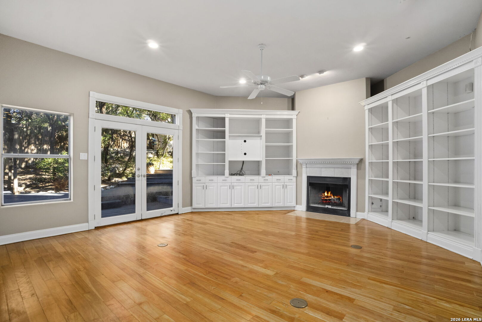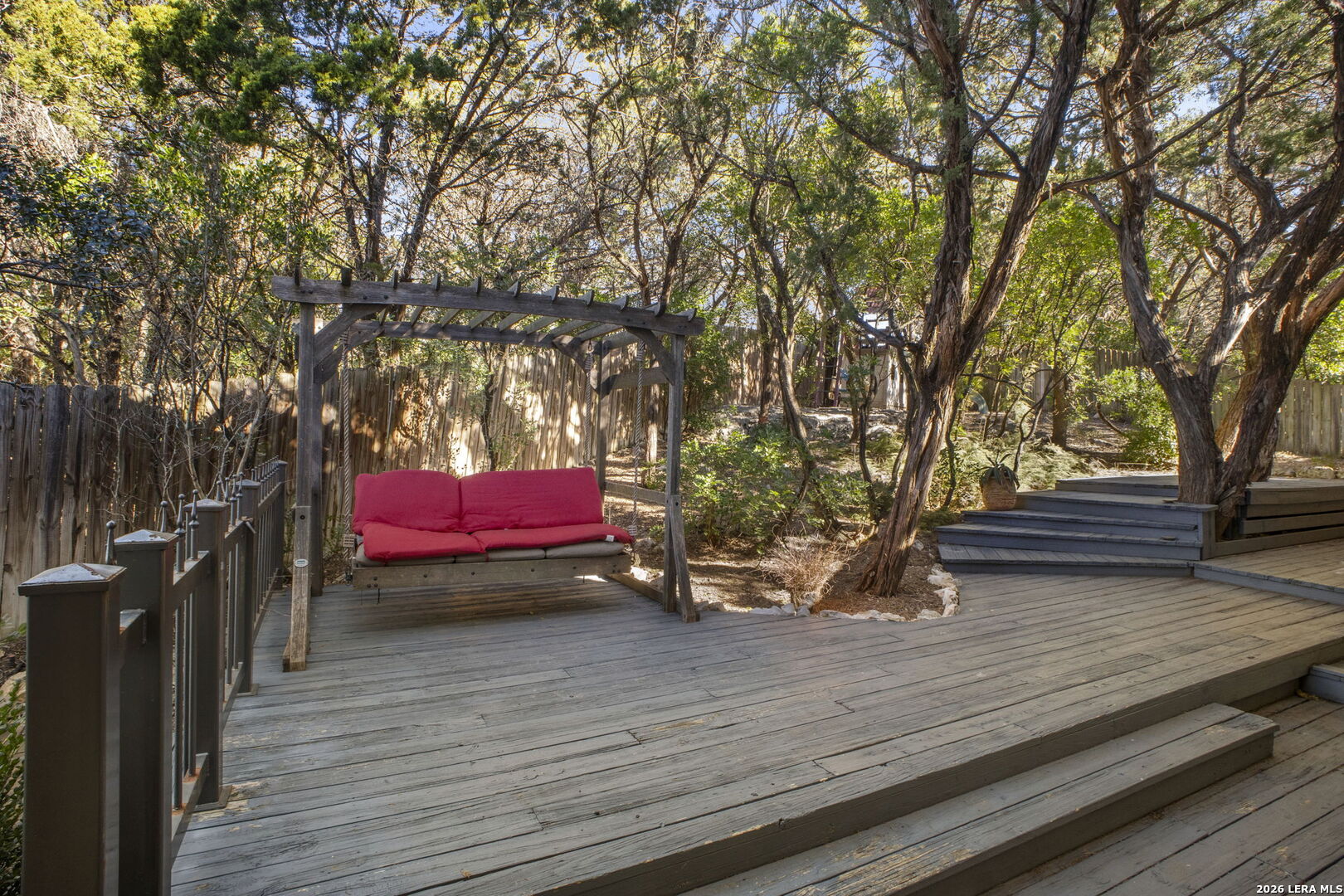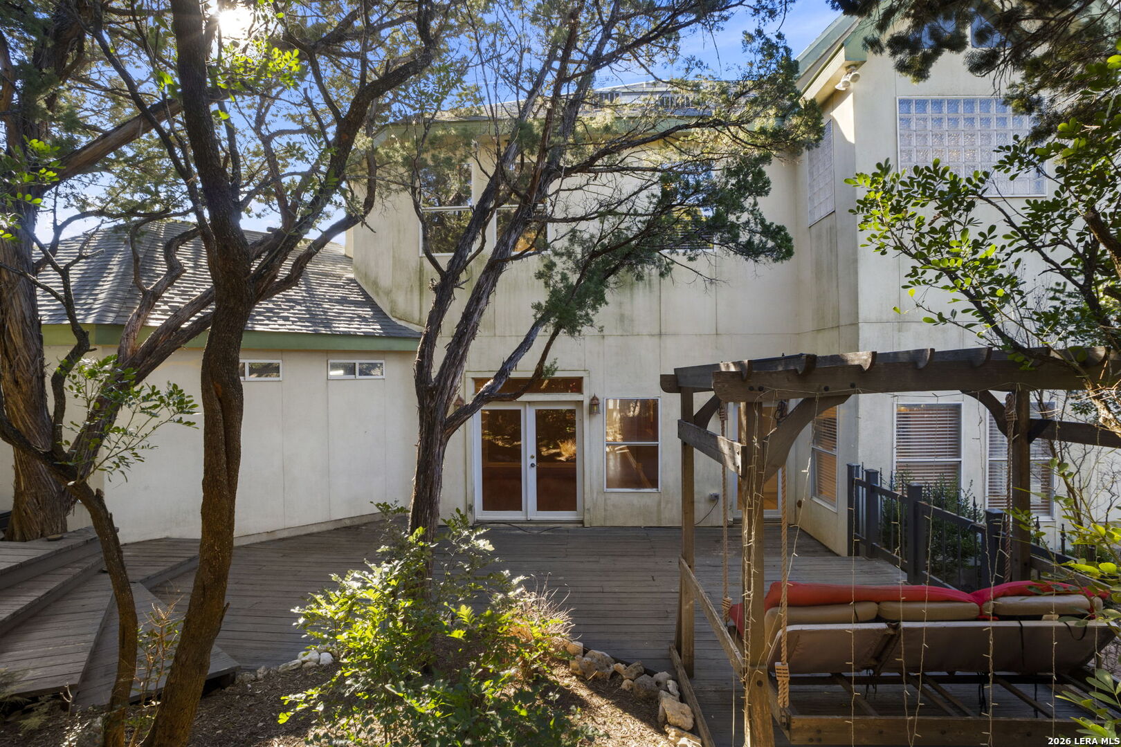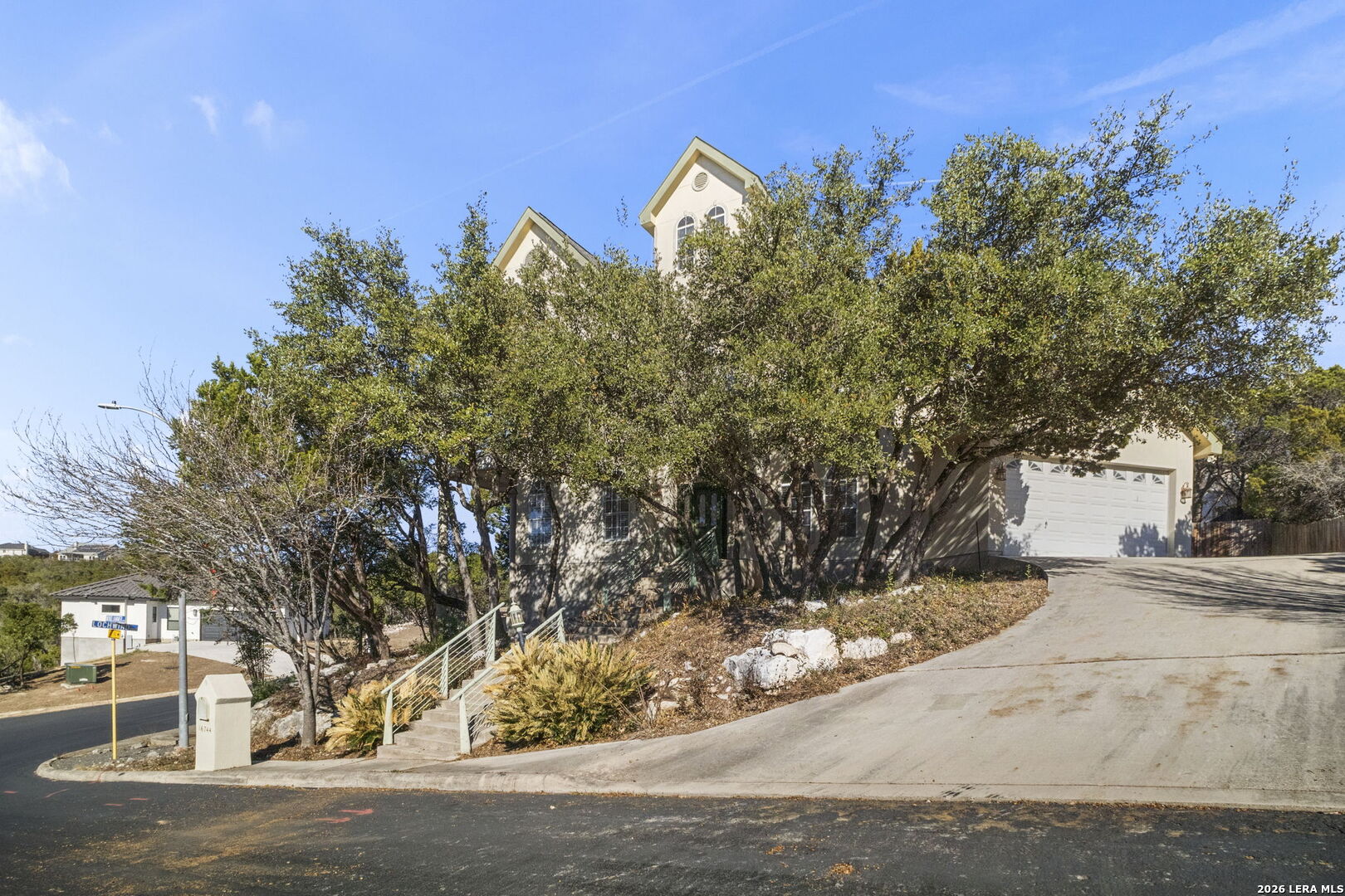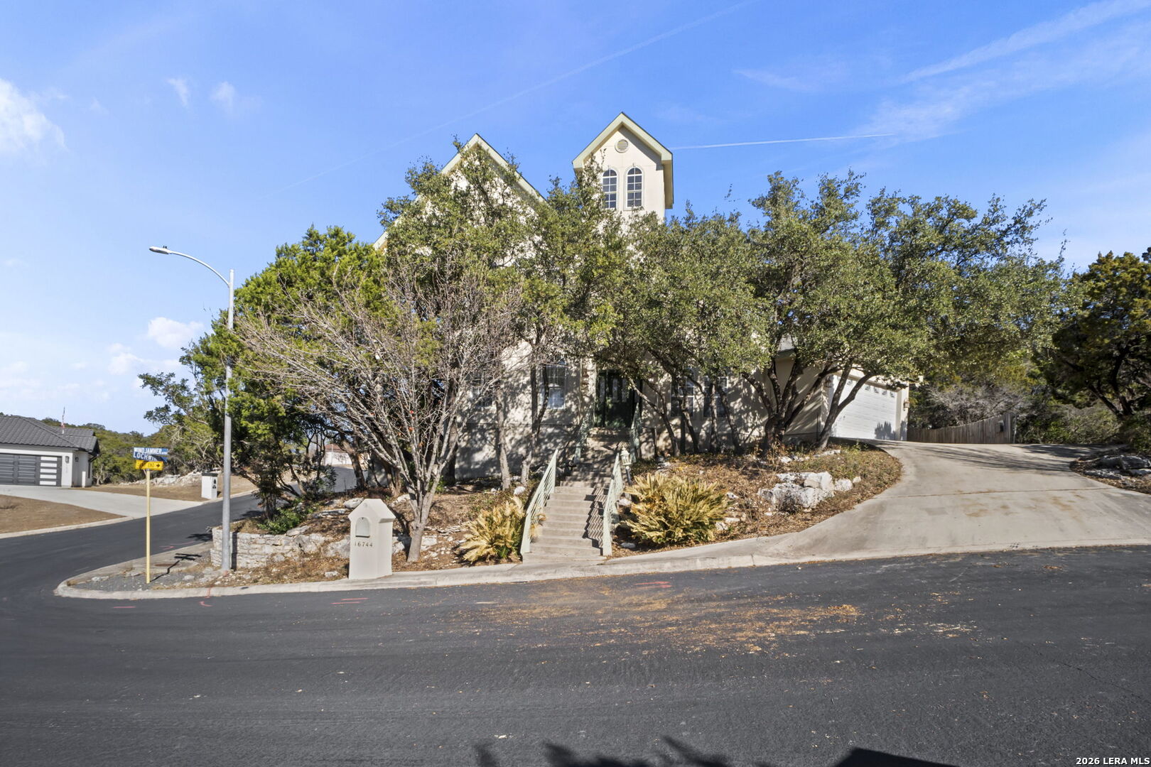 High on a hill with miles of panoramic views, this home showcases spectacular architectural details and grand open spaces, ideal for entertaining including a circular gathering wet-bar while capturing the majestic Hill Country scenery. The interior features beautiful Canadian maple wood flooring and a kitchen tailored for the aspiring chef, with a Thermador gas cooktop and abundant cabinet and counter space. The primary suite is a true oasis with a cozy fireplace, private balcony with unparalleled views, and a luxurious spa-like bath. The family room features walls of custom cabinets and a fireplace. Also a dedicated easy access study with a wall of custom shelving. Outside, a private backyard overlooks mature trees, offering a serene retreat. An oversized 2-car garage is complemented by an additional workshop area that could be finished as a media room or casita for guests.