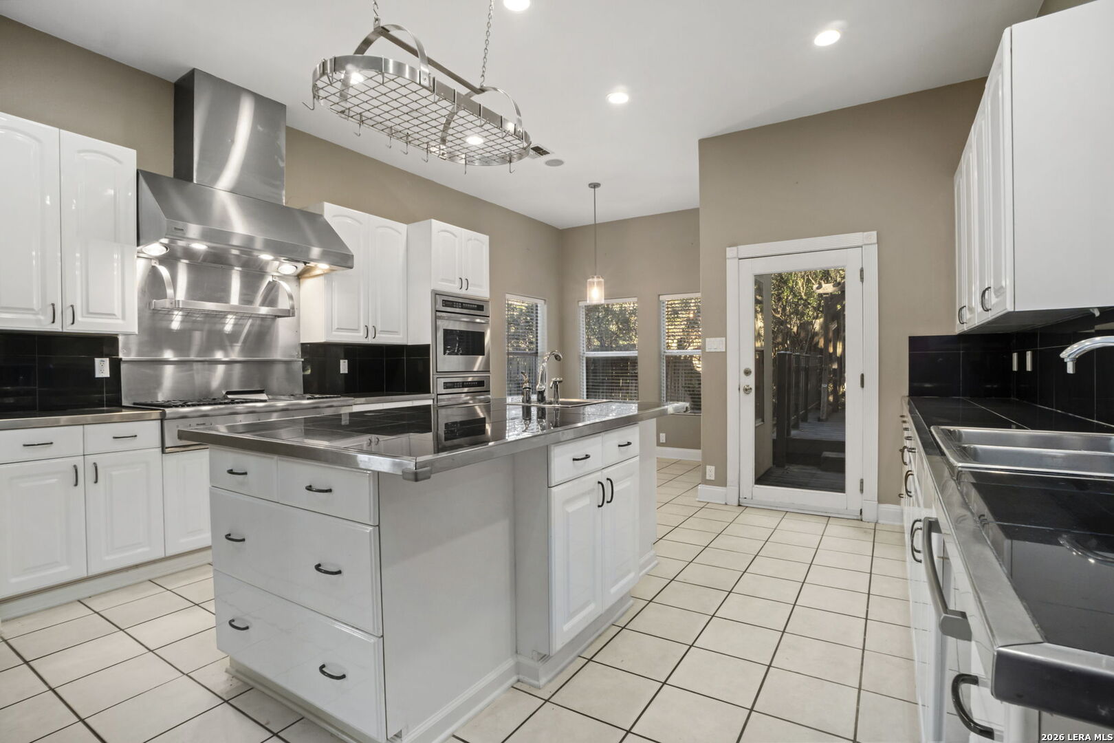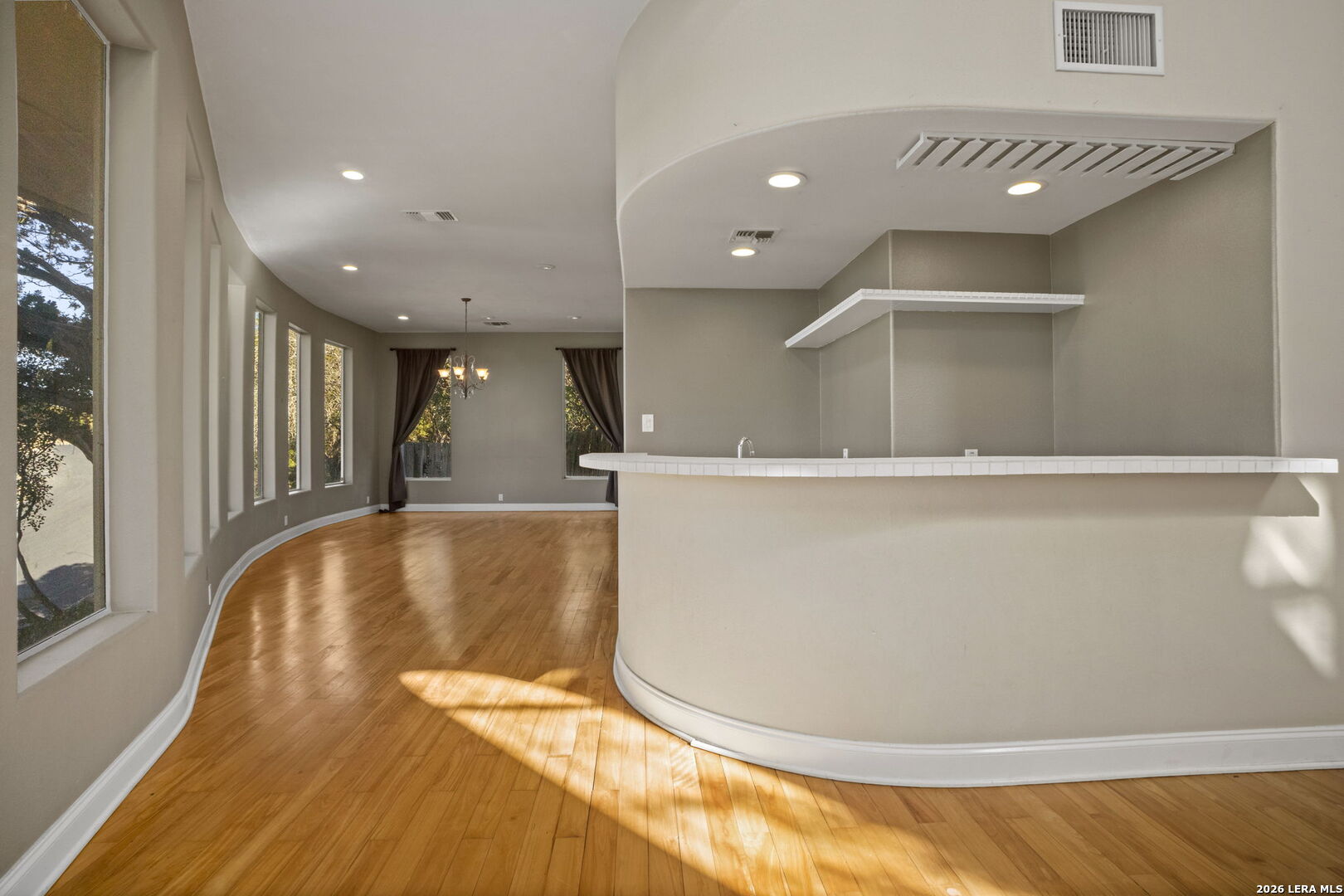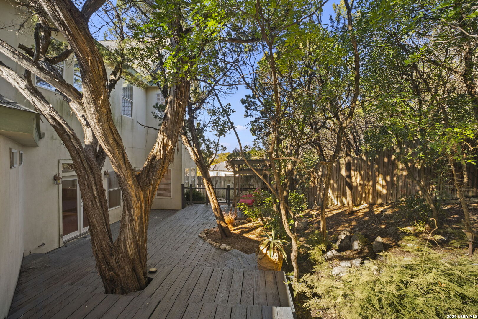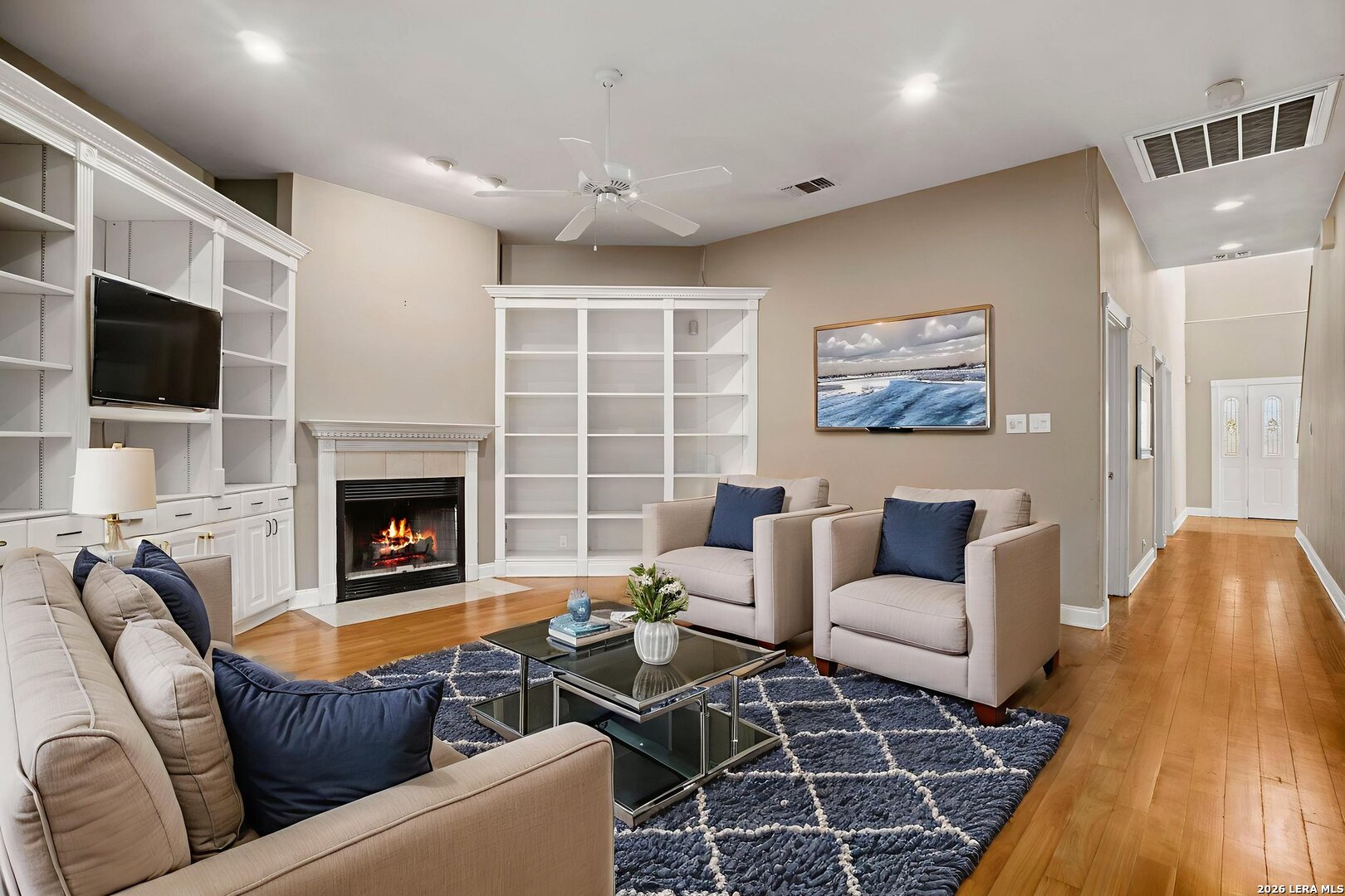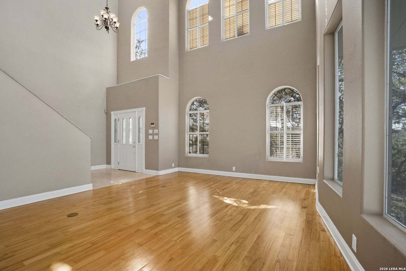 High on a hill with miles of panoramic views, this home showcases spectacular architectural details and grand open spaces, ideal for entertaining including a circular gathering wet-bar while capturing the majestic Hill Country scenery. The interior features beautiful Canadian maple wood flooring and a kitchen tailored for the aspiring chef, with a Thermador gas cooktop and abundant cabinet and counter space. The primary suite is a true oasis with a cozy fireplace, private balcony with unparalleled views, and a luxurious spa-like bath. The family room features walls of custom cabinets and a fireplace. Also a dedicated easy access study with a wall of custom shelving. Outside, a private backyard overlooks mature trees, offering a serene retreat. An oversized 2-car garage is complemented by an additional workshop area that could be finished as a media room or casita for guests.