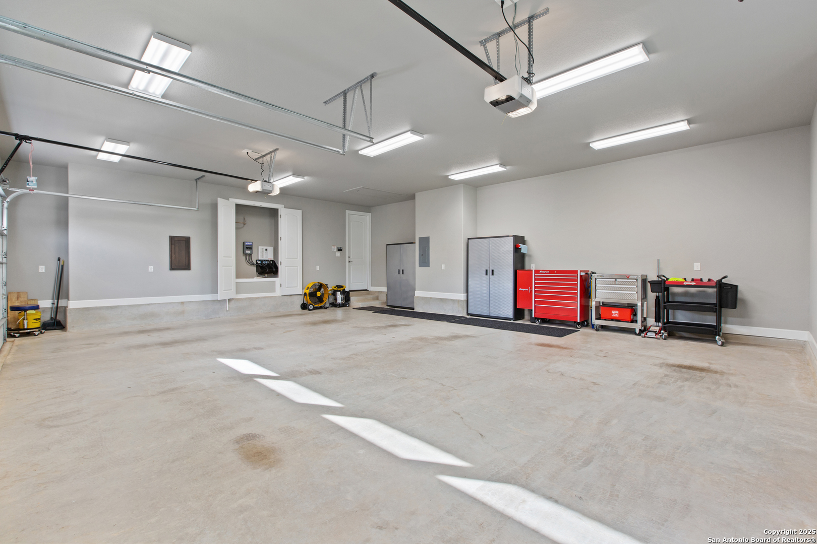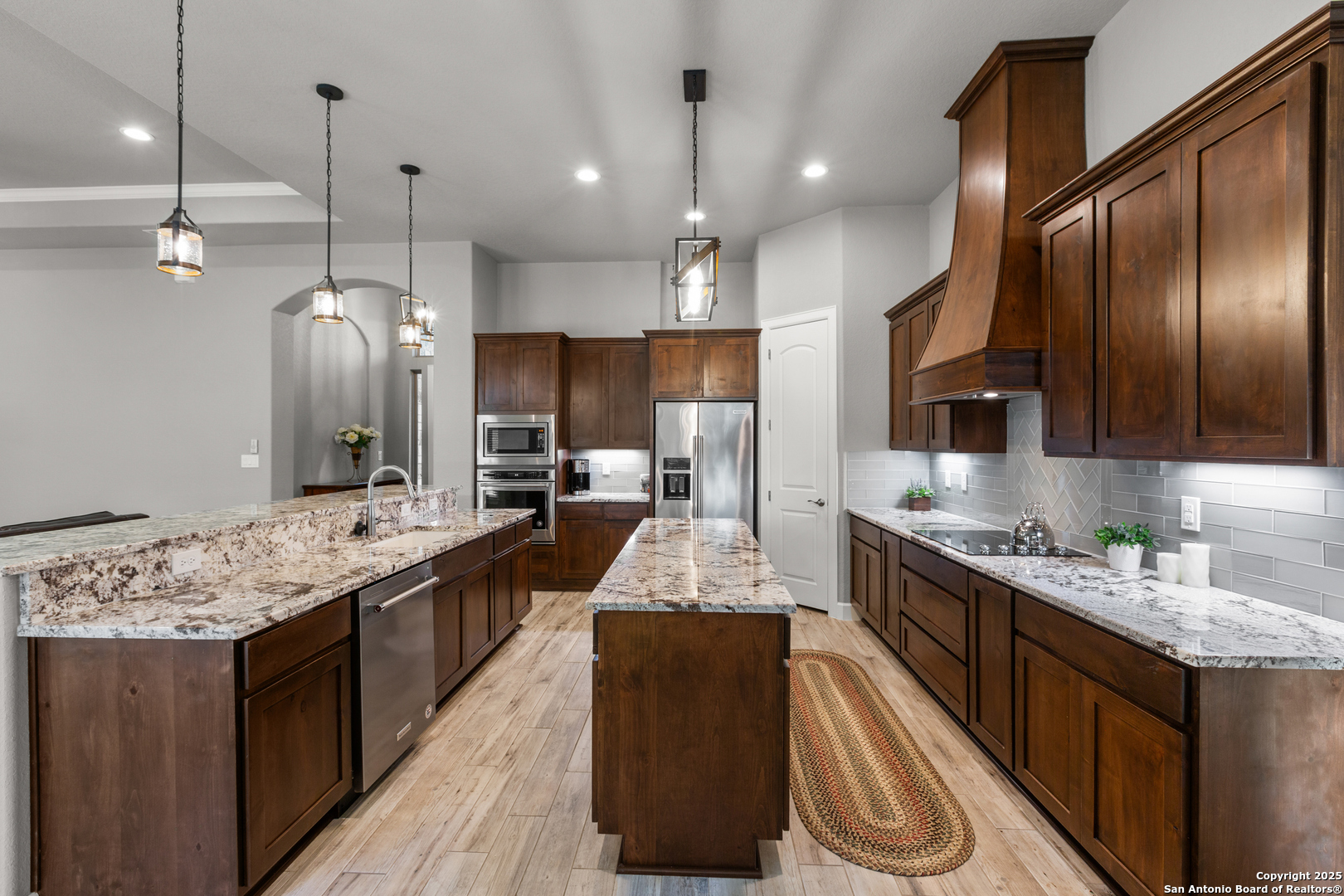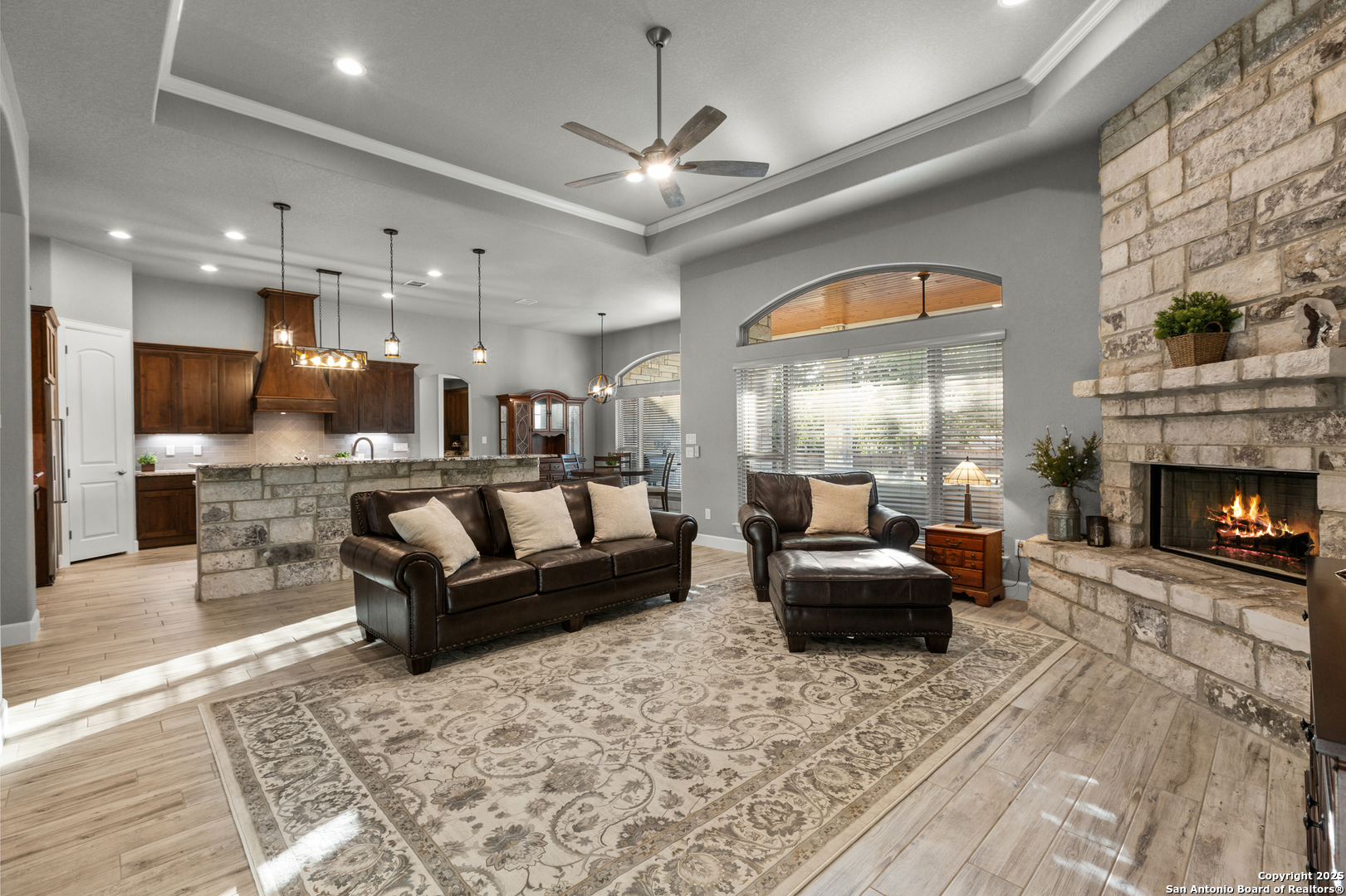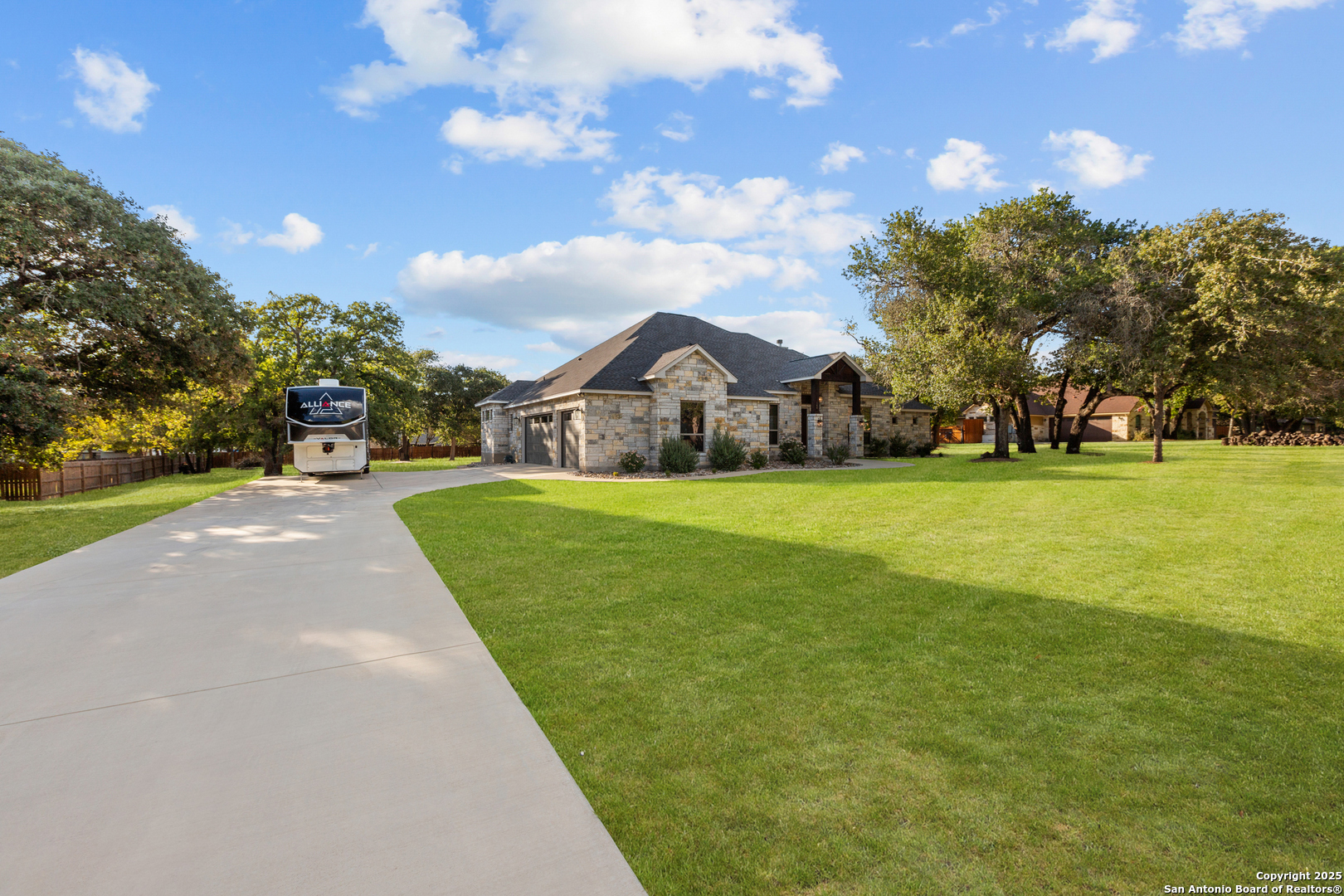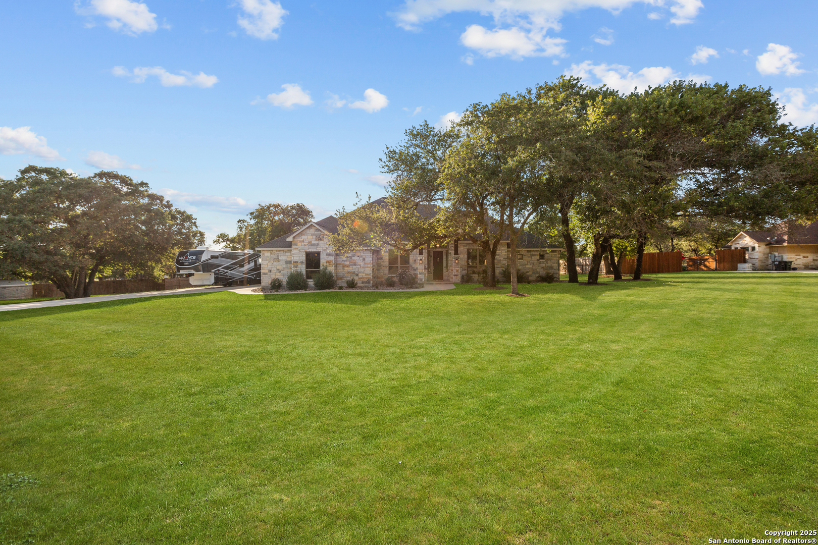 Located in the sought-after Eden Crossing community, this custom one-story home sits on 1.23 acres and is loaded with thoughtful upgrades. Offering 4 bedrooms, 2.5 baths, and 2,853 sq. ft., the residence showcases soaring 15-ft ceilings, 8-ft doors, and porcelain tile flooring throughout, creating an open and elegant feel. At the heart of the home, the chef's kitchen features dual oversized islands, granite counters, walk-in pantry, and premium KitchenAid Red Dot Series appliances - blending style and performance. A dedicated office/flex room adds versatility to the layout. The private primary suite offers tray ceilings, plantation shutters, and a spa-style bath with dual vanities, garden tub, separate shower, and two walk-in closets with custom built-ins. Secondary bedrooms include coffered ceilings and walk-in closets. Outdoor living includes an oversized covered patio with a wood ceiling, TV outlet, and pre-wired sound. The oversized 3-car garage (1,044 sq. ft., 27 ft deep with commercial insulated doors) offers attic storage, upgraded lighting, and a 30-amp RV outlet with waste drain. Additional features include XPel window tint, tankless water heater, sprinkler system, smart fiber wiring, full security system, water softener plumbing, and a widened 16-ft driveway. Community amenities include a stocked pond, walking trails, and park. Zoned to La Vernia ISD, with GVEC fiber internet and an easy commute to San Antonio, Fort Sam Houston, and Randolph AFB, this property delivers both convenience and countryside living.