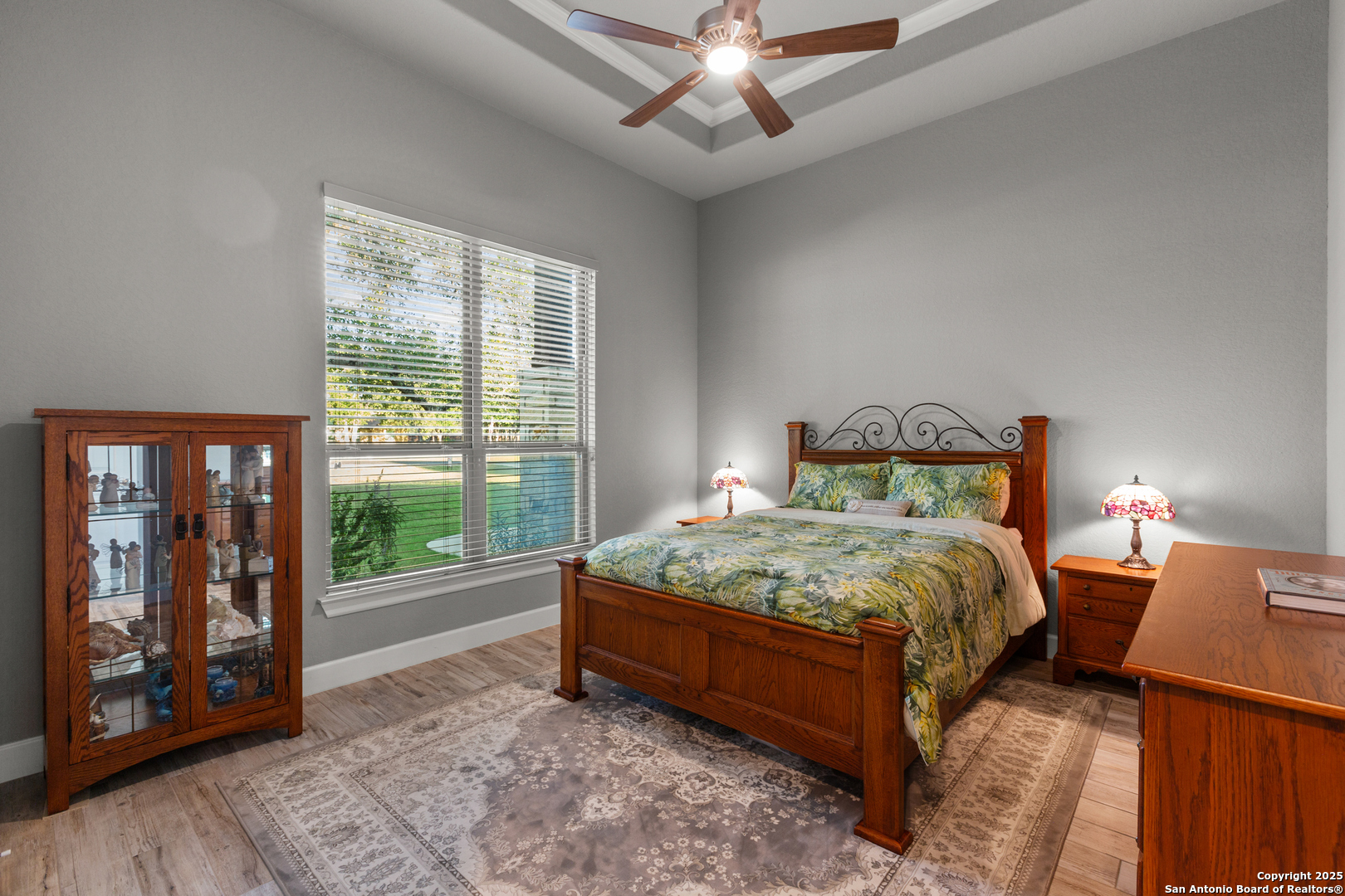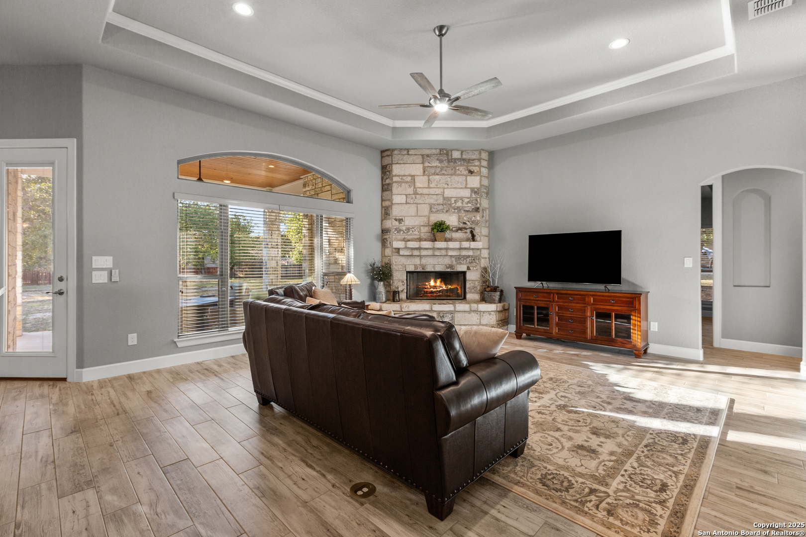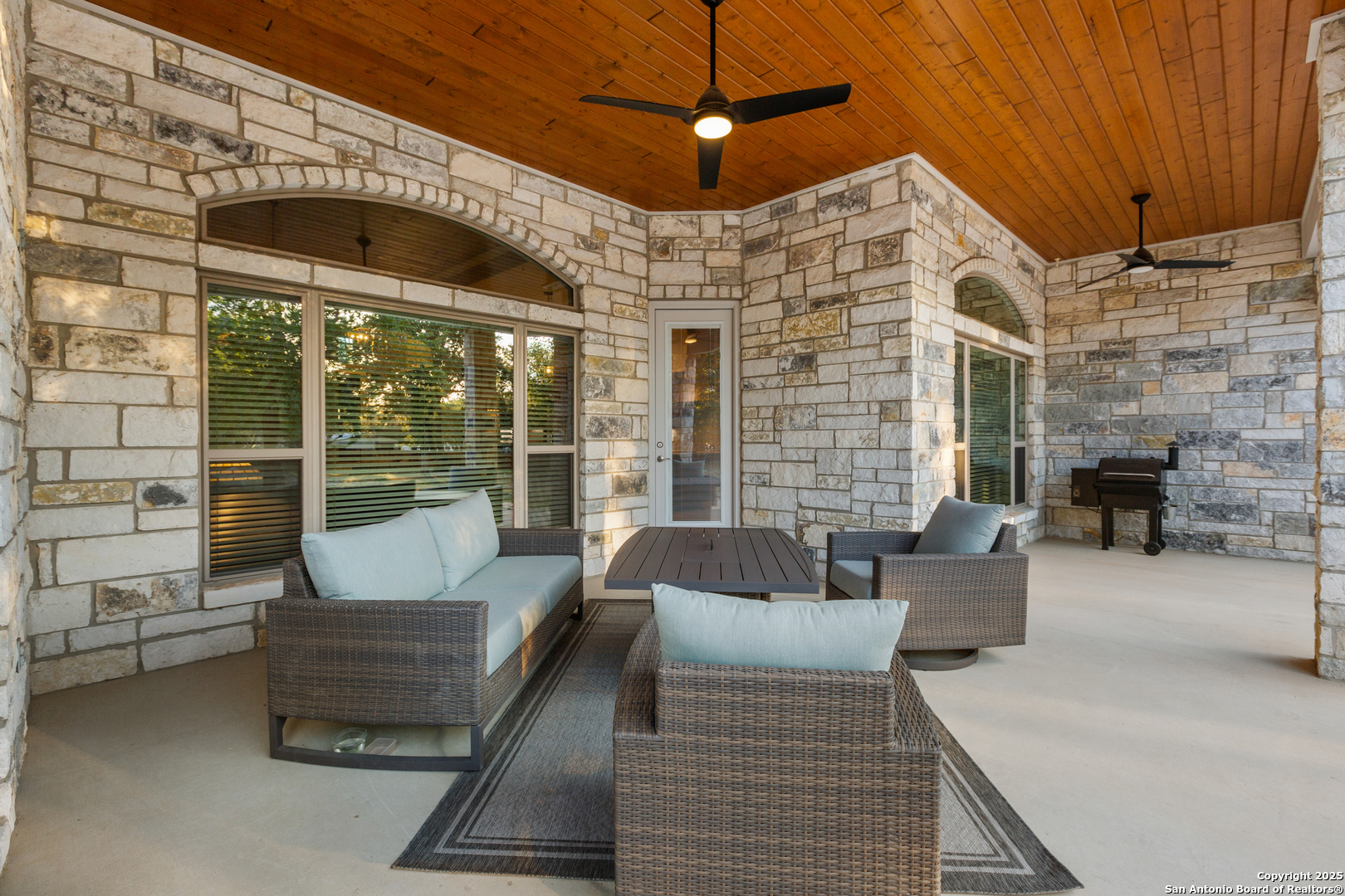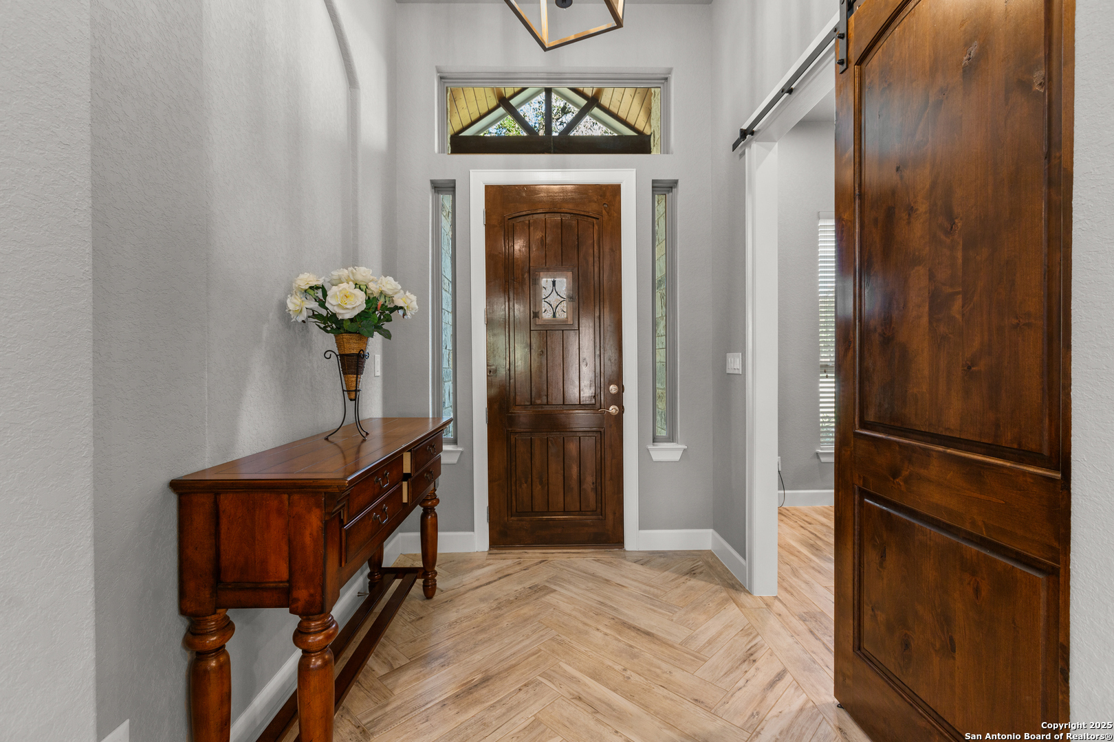 Located in the sought-after Eden Crossing community, this custom one-story home sits on 1.23 acres and is loaded with thoughtful upgrades. Offering 4 bedrooms, 2.5 baths, and 2,853 sq. ft., the residence showcases soaring 15-ft ceilings, 8-ft doors, and porcelain tile flooring throughout, creating an open and elegant feel. At the heart of the home, the chef's kitchen features dual oversized islands, granite counters, walk-in pantry, and premium KitchenAid Red Dot Series appliances - blending style and performance. A dedicated office/flex room adds versatility to the layout. The private primary suite offers tray ceilings, plantation shutters, and a spa-style bath with dual vanities, garden tub, separate shower, and two walk-in closets with custom built-ins. Secondary bedrooms include coffered ceilings and walk-in closets. Outdoor living includes an oversized covered patio with a wood ceiling, TV outlet, and pre-wired sound. The oversized 3-car garage (1,044 sq. ft., 27 ft deep with commercial insulated doors) offers attic storage, upgraded lighting, and a 30-amp RV outlet with waste drain. Additional features include XPel window tint, tankless water heater, sprinkler system, smart fiber wiring, full security system, water softener plumbing, and a widened 16-ft driveway. Community amenities include a stocked pond, walking trails, and park. Zoned to La Vernia ISD, with GVEC fiber internet and an easy commute to San Antonio, Fort Sam Houston, and Randolph AFB, this property delivers both convenience and countryside living.