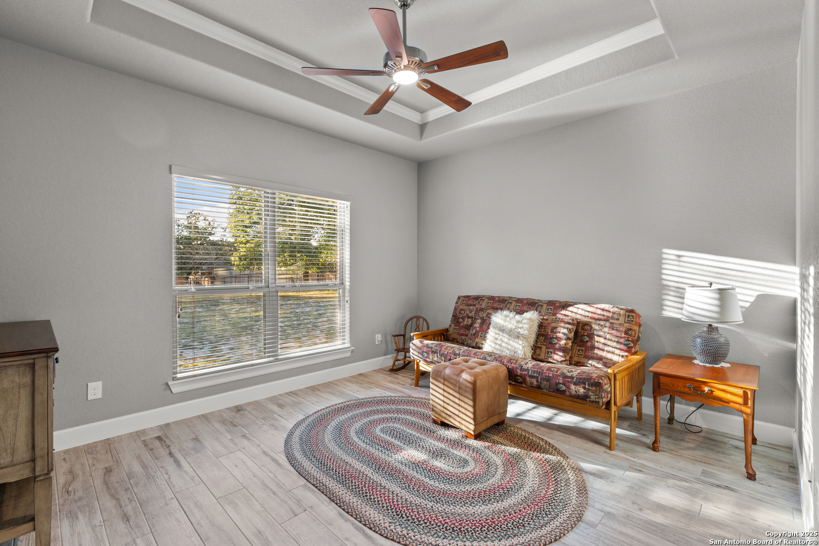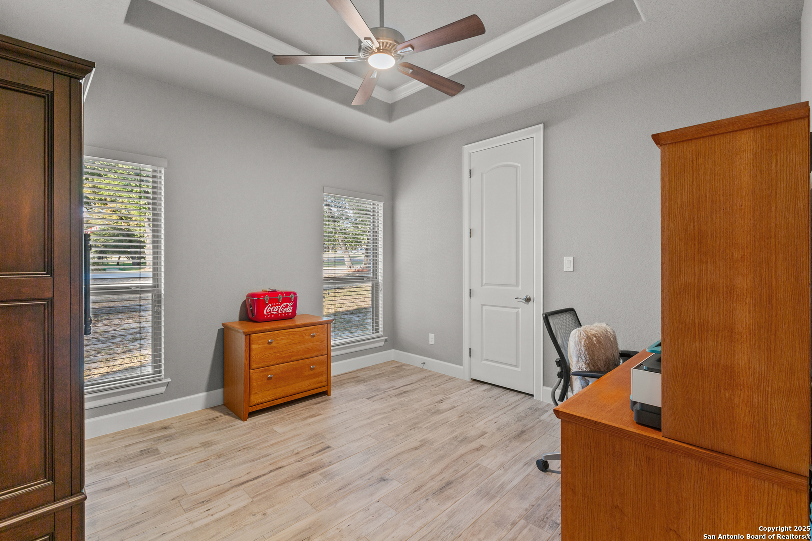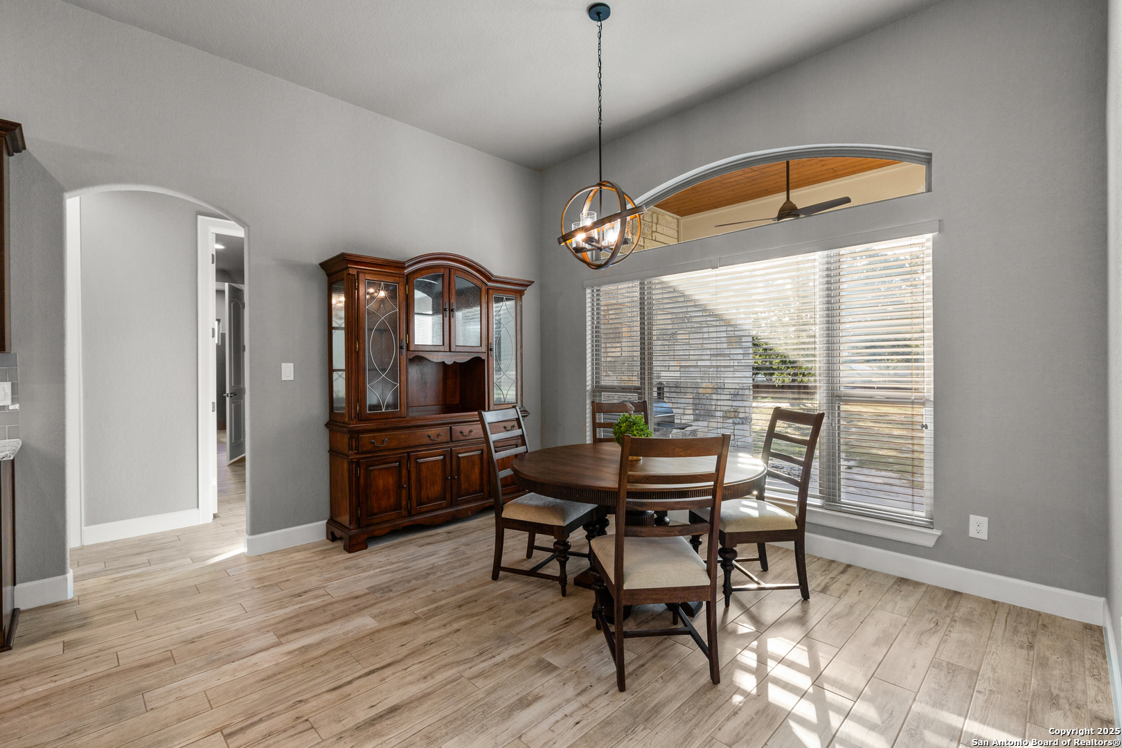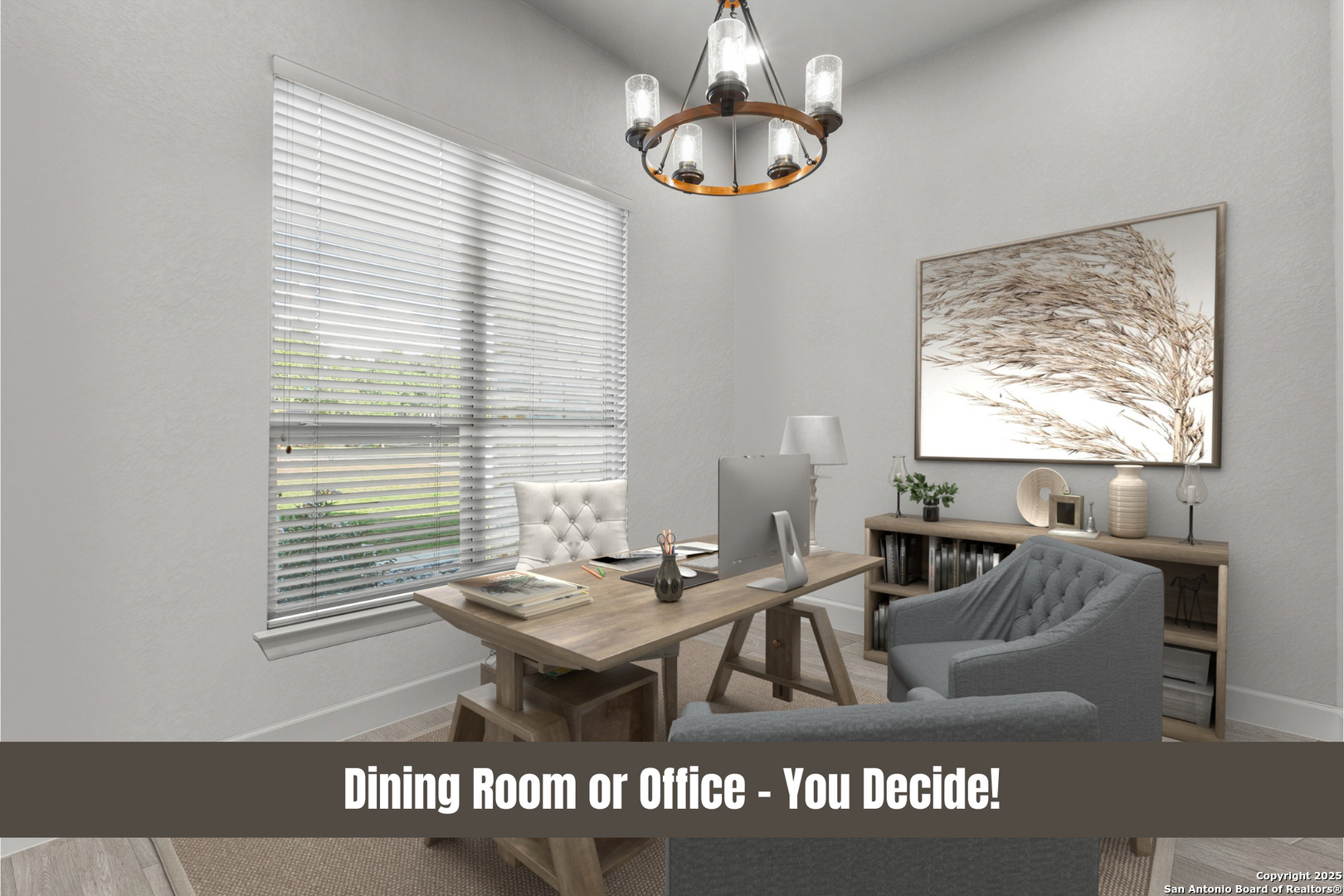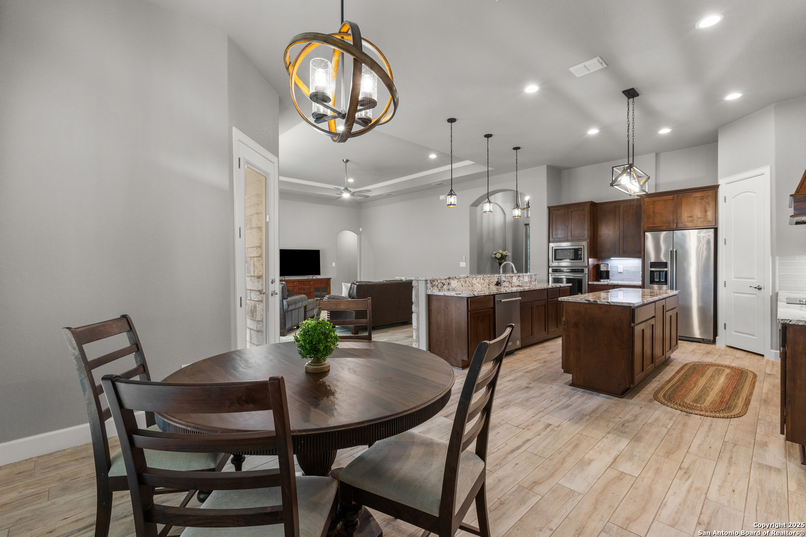 Located in the sought-after Eden Crossing community, this custom one-story home sits on 1.23 acres and is loaded with thoughtful upgrades. Offering 4 bedrooms, 2.5 baths, and 2,853 sq. ft., the residence showcases soaring 15-ft ceilings, 8-ft doors, and porcelain tile flooring throughout, creating an open and elegant feel. At the heart of the home, the chef's kitchen features dual oversized islands, granite counters, walk-in pantry, and premium KitchenAid Red Dot Series appliances - blending style and performance. A dedicated office/flex room adds versatility to the layout. The private primary suite offers tray ceilings, plantation shutters, and a spa-style bath with dual vanities, garden tub, separate shower, and two walk-in closets with custom built-ins. Secondary bedrooms include coffered ceilings and walk-in closets. Outdoor living includes an oversized covered patio with a wood ceiling, TV outlet, and pre-wired sound. The oversized 3-car garage (1,044 sq. ft., 27 ft deep with commercial insulated doors) offers attic storage, upgraded lighting, and a 30-amp RV outlet with waste drain. Additional features include XPel window tint, tankless water heater, sprinkler system, smart fiber wiring, full security system, water softener plumbing, and a widened 16-ft driveway. Community amenities include a stocked pond, walking trails, and park. Zoned to La Vernia ISD, with GVEC fiber internet and an easy commute to San Antonio, Fort Sam Houston, and Randolph AFB, this property delivers both convenience and countryside living.