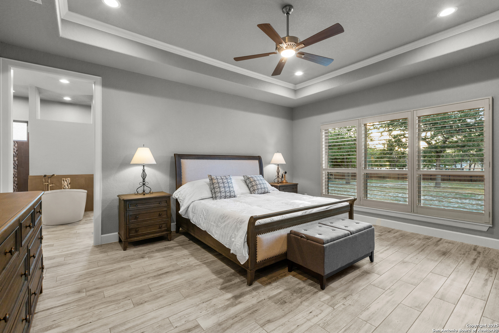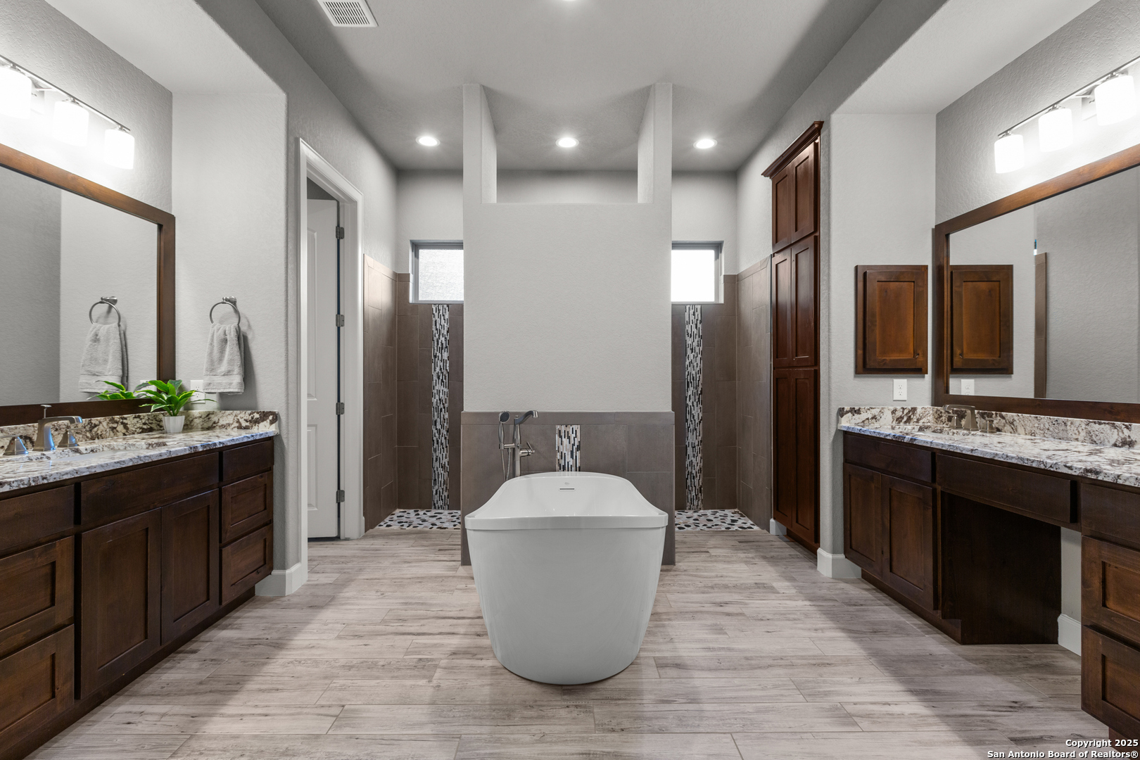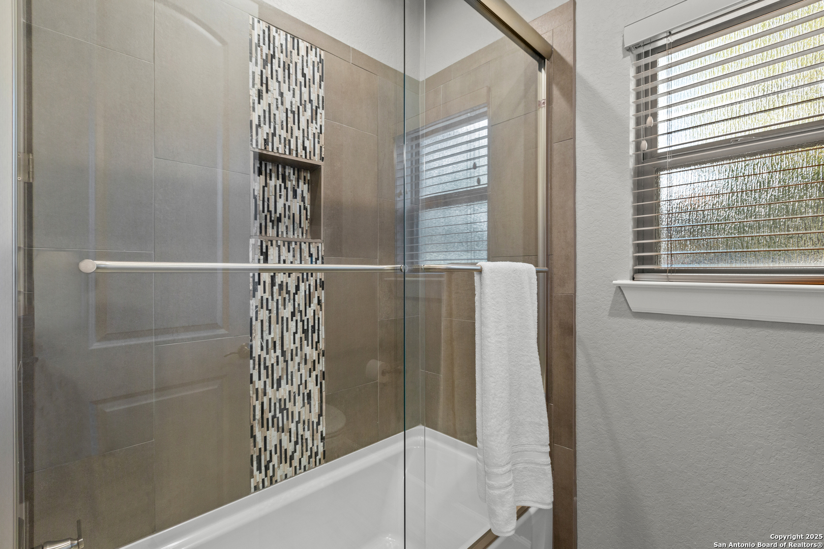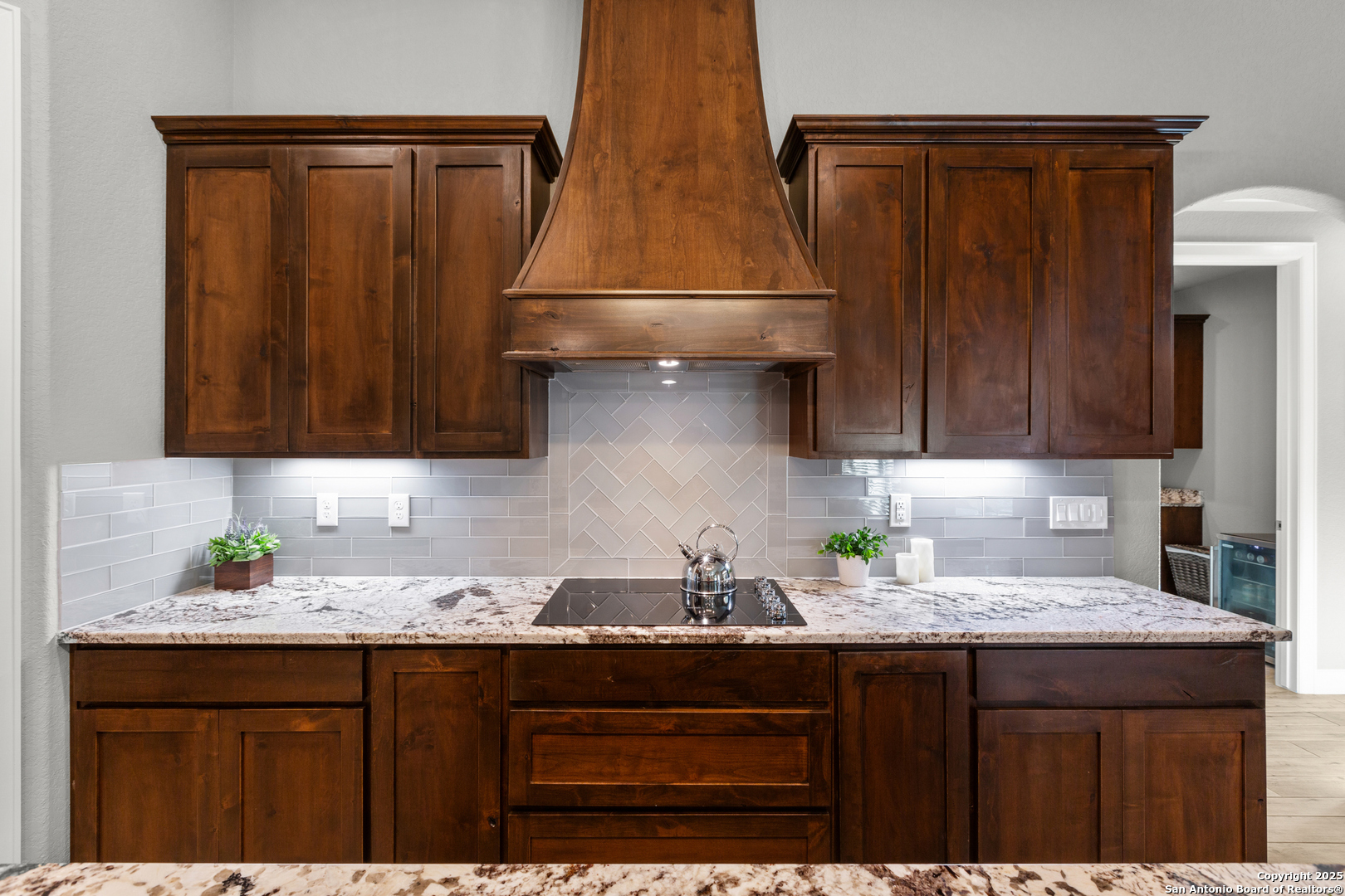 Located in the sought-after Eden Crossing community, this custom one-story home sits on 1.23 acres and is loaded with thoughtful upgrades. Offering 4 bedrooms, 2.5 baths, and 2,853 sq. ft., the residence showcases soaring 15-ft ceilings, 8-ft doors, and porcelain tile flooring throughout, creating an open and elegant feel. At the heart of the home, the chef's kitchen features dual oversized islands, granite counters, walk-in pantry, and premium KitchenAid Red Dot Series appliances - blending style and performance. A dedicated office/flex room adds versatility to the layout. The private primary suite offers tray ceilings, plantation shutters, and a spa-style bath with dual vanities, garden tub, separate shower, and two walk-in closets with custom built-ins. Secondary bedrooms include coffered ceilings and walk-in closets. Outdoor living includes an oversized covered patio with a wood ceiling, TV outlet, and pre-wired sound. The oversized 3-car garage (1,044 sq. ft., 27 ft deep with commercial insulated doors) offers attic storage, upgraded lighting, and a 30-amp RV outlet with waste drain. Additional features include XPel window tint, tankless water heater, sprinkler system, smart fiber wiring, full security system, water softener plumbing, and a widened 16-ft driveway. Community amenities include a stocked pond, walking trails, and park. Zoned to La Vernia ISD, with GVEC fiber internet and an easy commute to San Antonio, Fort Sam Houston, and Randolph AFB, this property delivers both convenience and countryside living.