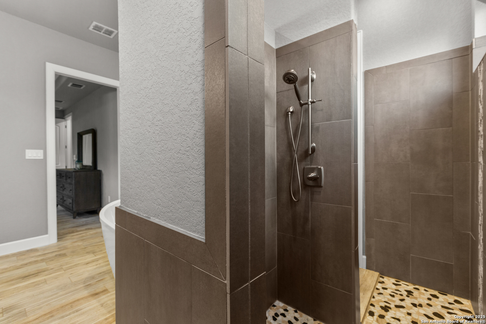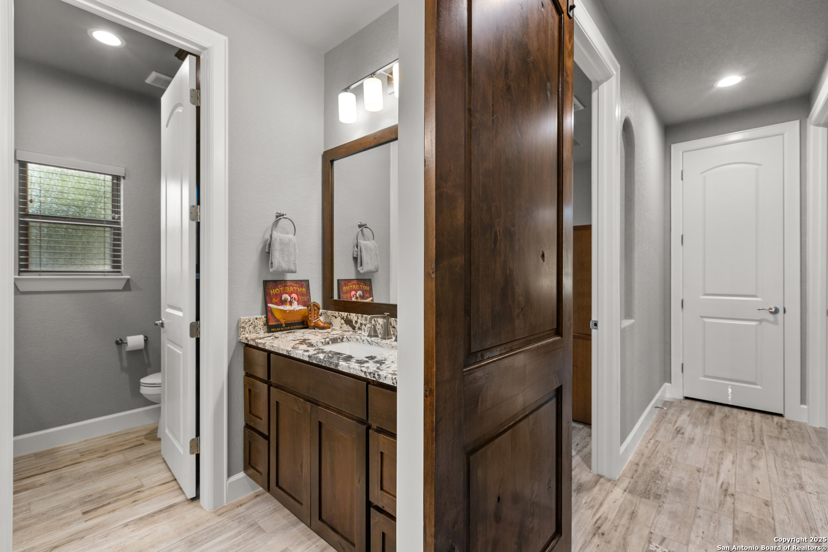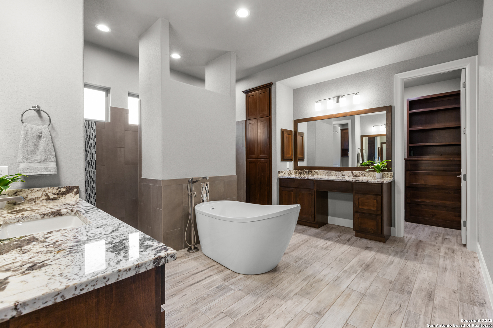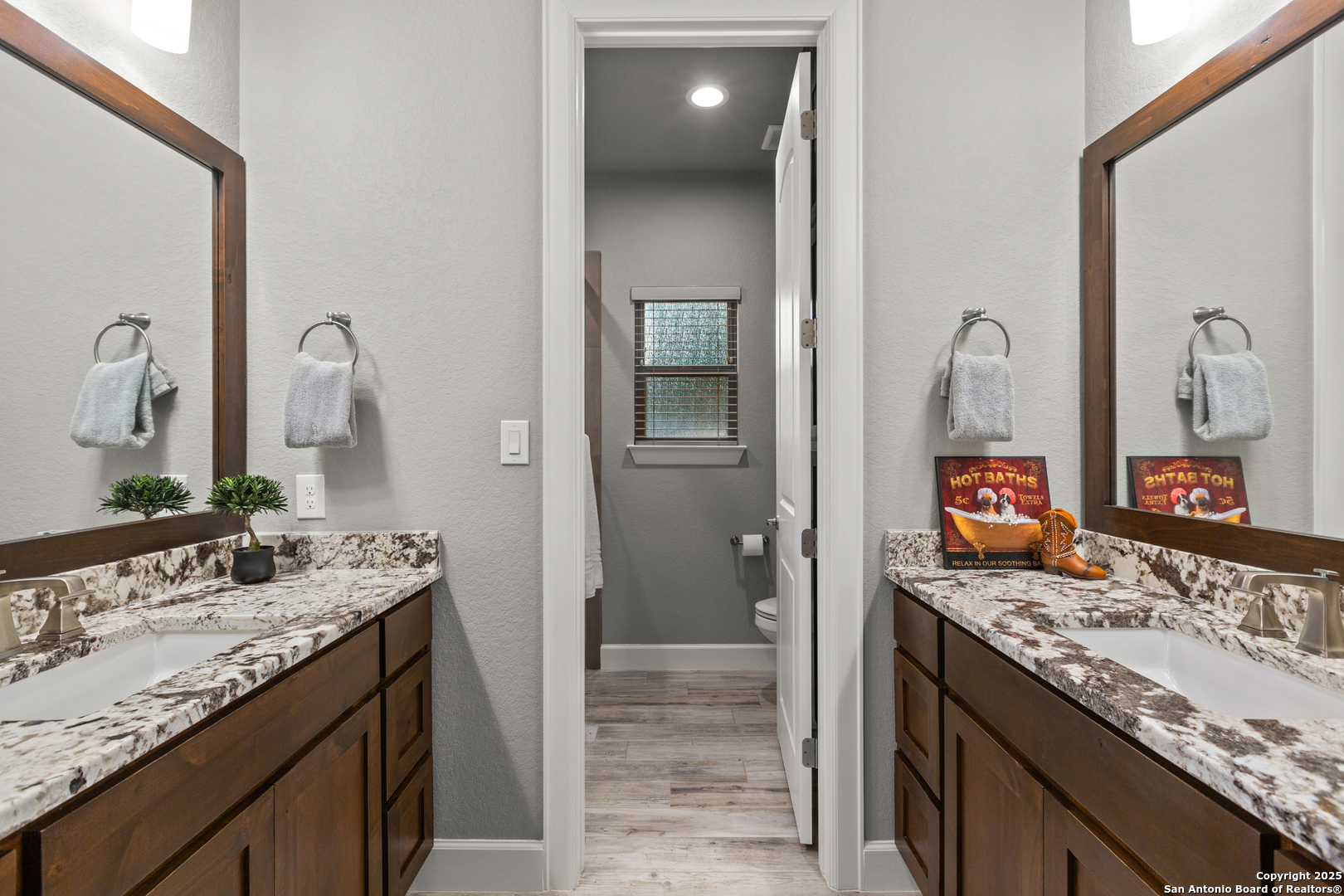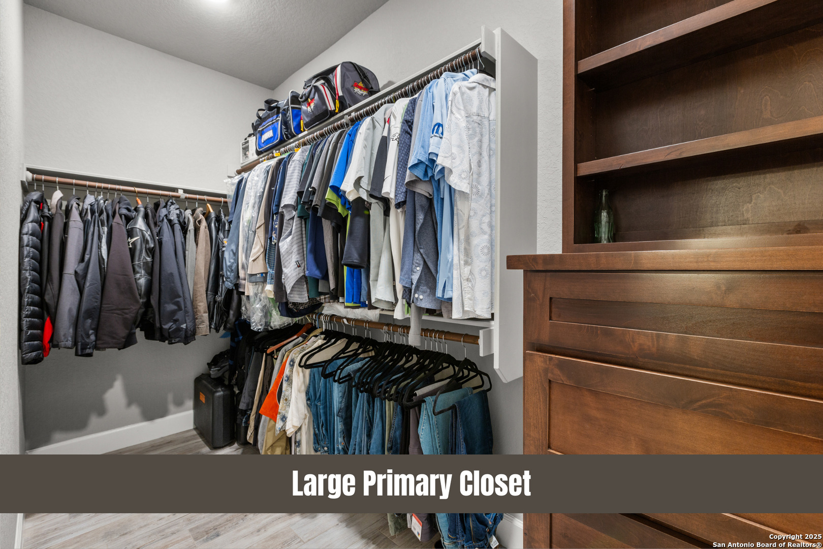 Located in the sought-after Eden Crossing community, this custom one-story home sits on 1.23 acres and is loaded with thoughtful upgrades. Offering 4 bedrooms, 2.5 baths, and 2,853 sq. ft., the residence showcases soaring 15-ft ceilings, 8-ft doors, and porcelain tile flooring throughout, creating an open and elegant feel. At the heart of the home, the chef's kitchen features dual oversized islands, granite counters, walk-in pantry, and premium KitchenAid Red Dot Series appliances - blending style and performance. A dedicated office/flex room adds versatility to the layout. The private primary suite offers tray ceilings, plantation shutters, and a spa-style bath with dual vanities, garden tub, separate shower, and two walk-in closets with custom built-ins. Secondary bedrooms include coffered ceilings and walk-in closets. Outdoor living includes an oversized covered patio with a wood ceiling, TV outlet, and pre-wired sound. The oversized 3-car garage (1,044 sq. ft., 27 ft deep with commercial insulated doors) offers attic storage, upgraded lighting, and a 30-amp RV outlet with waste drain. Additional features include XPel window tint, tankless water heater, sprinkler system, smart fiber wiring, full security system, water softener plumbing, and a widened 16-ft driveway. Community amenities include a stocked pond, walking trails, and park. Zoned to La Vernia ISD, with GVEC fiber internet and an easy commute to San Antonio, Fort Sam Houston, and Randolph AFB, this property delivers both convenience and countryside living.