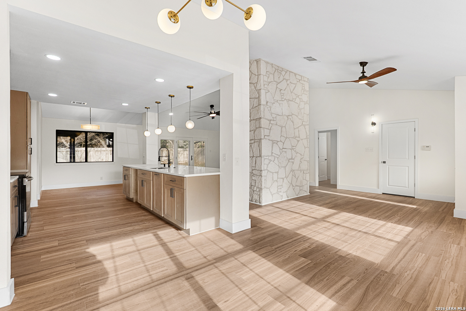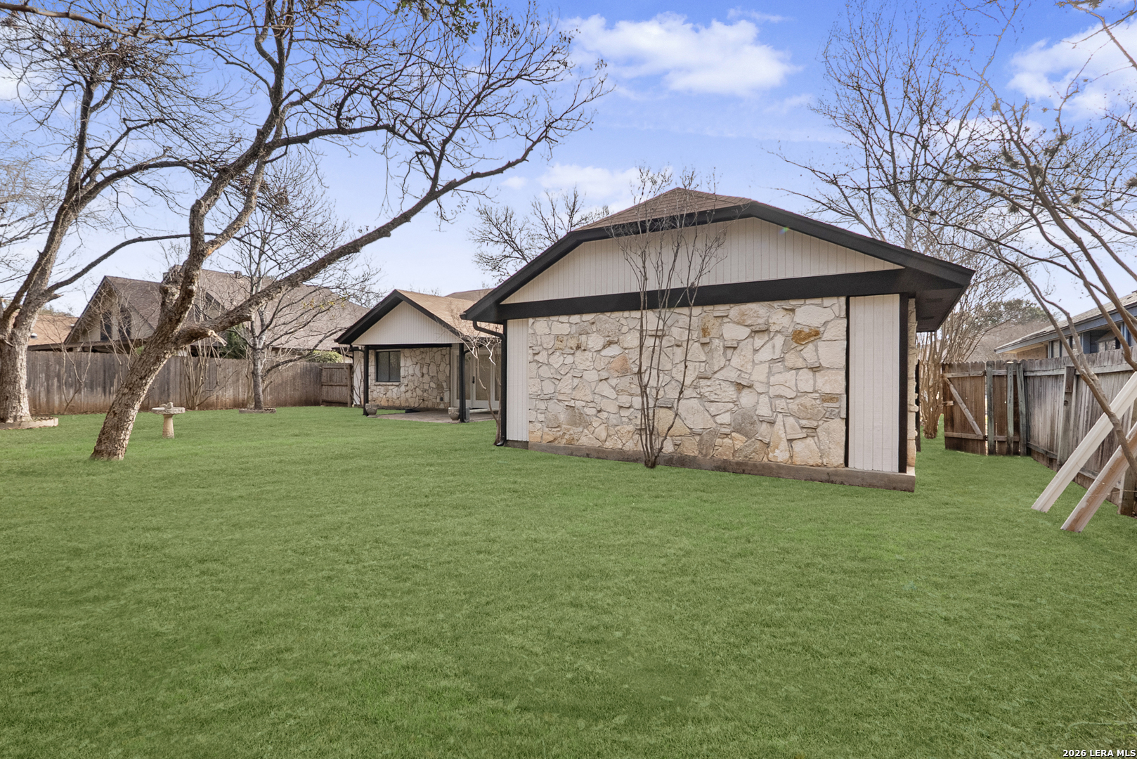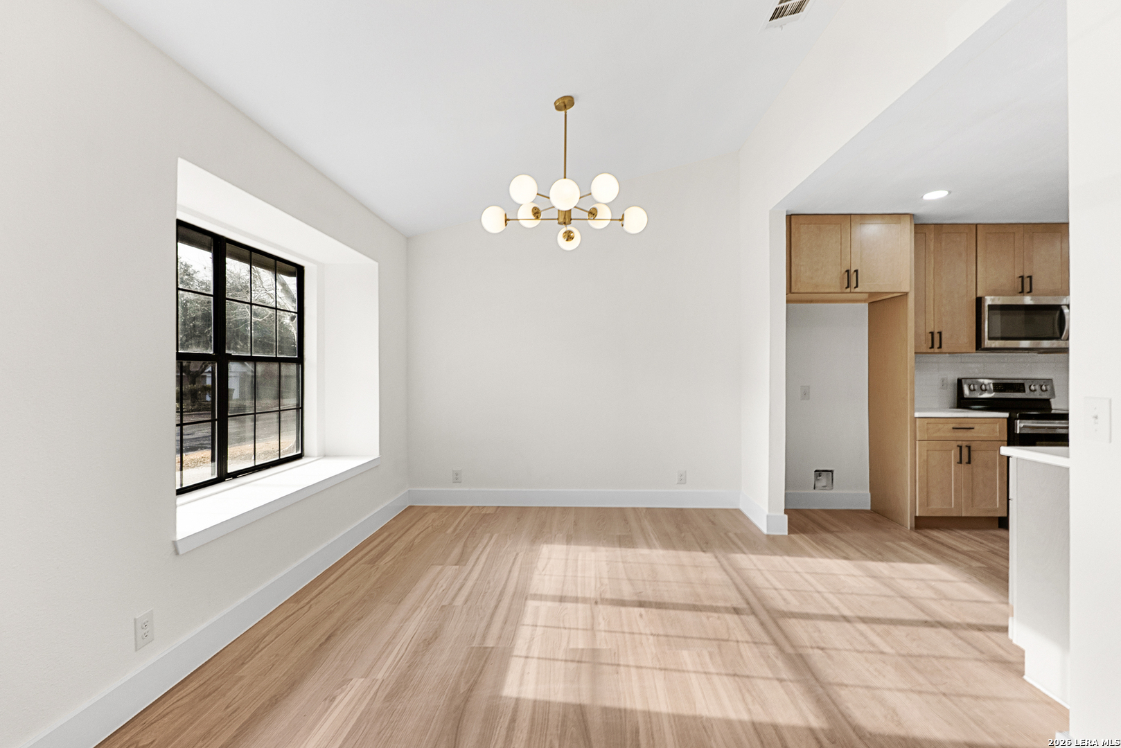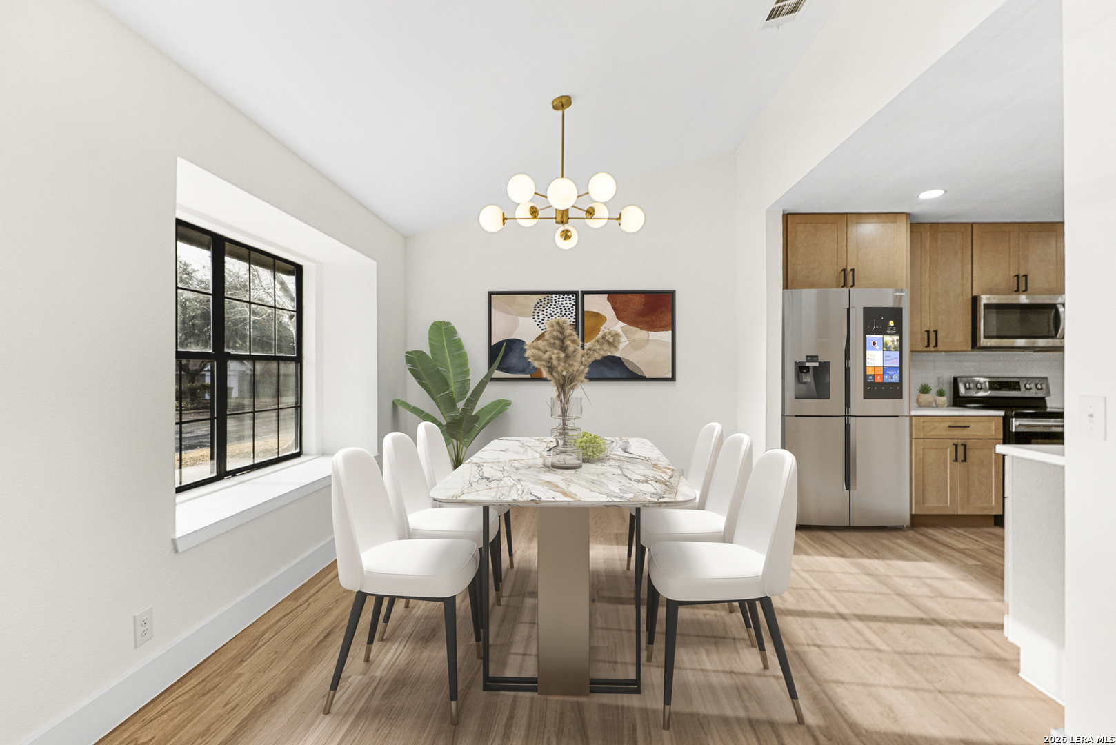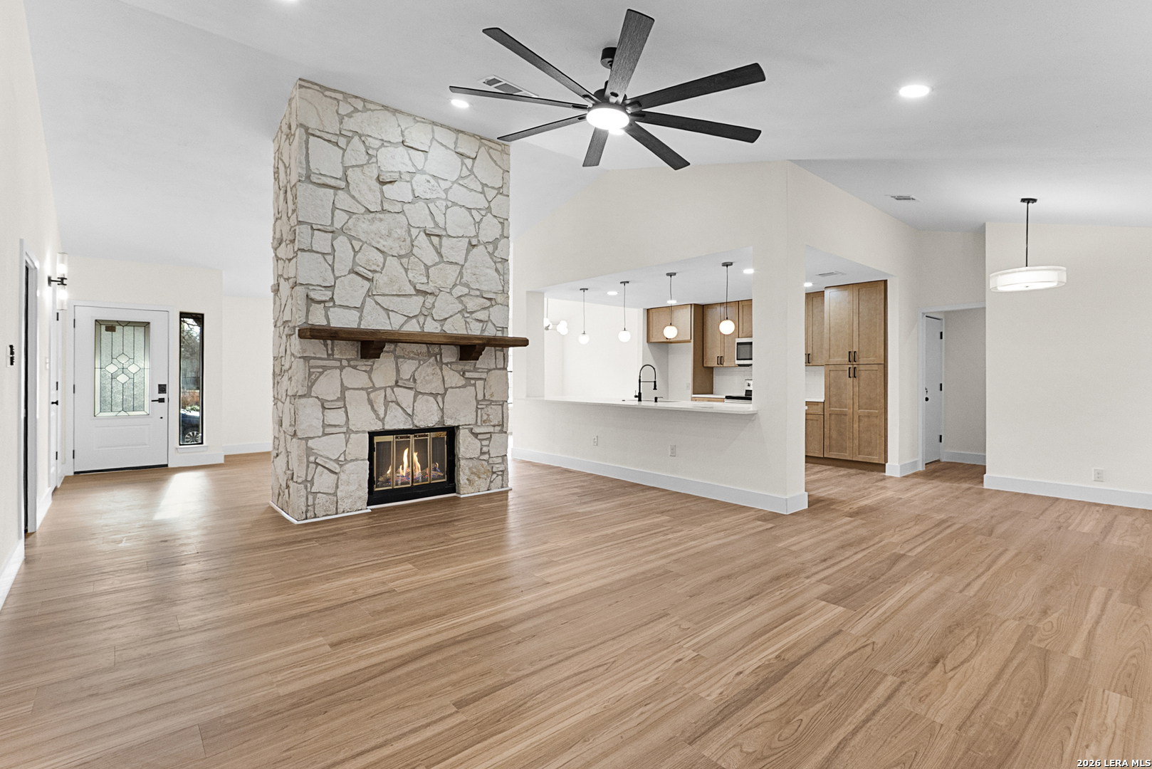 Welcome to 16923 Hidden Timber Wood! This home is the perfect blend of timeless charm and modern updates! Nestled on a quiet street just off Blanco Road inside Loop 1604, this beautifully renovated one-story home offers the character of an established neighborhood with the feel of new construction. This home features brand-new flooring throughout (no carpet!), a fully updated kitchen, and an open-concept layout created by opening the kitchen to the living and dining areas-perfect for entertaining. The flexible floor plan offers the potential for two living areas or two dining spaces to fit your lifestyle needs. Enjoy cozy evenings by the fireplace and appreciate the thoughtful upgrades throughout, including ceiling fans in every bedroom, a full walk-in shower in the primary suite, and a tub/shower combo in the guest bath. Step outside to a covered patio overlooking a large backyard-ideal for gatherings, pets, or simply relaxing. Additional features include central air, soaring ceilings, and an oversized garage. Located near the University of Texas at San Antonio, San Antonio International Airport, major highways, shopping, dining, and more-you truly get the best of convenience and community. This move-in-ready home delivers the best of an older charming home and a new home all in one. Don't miss your opportunity to own this stunning transformation in a highly desirable area!