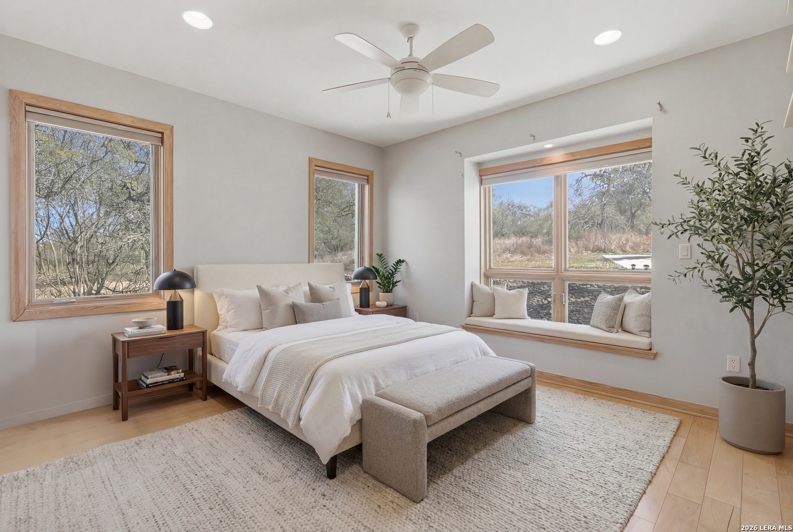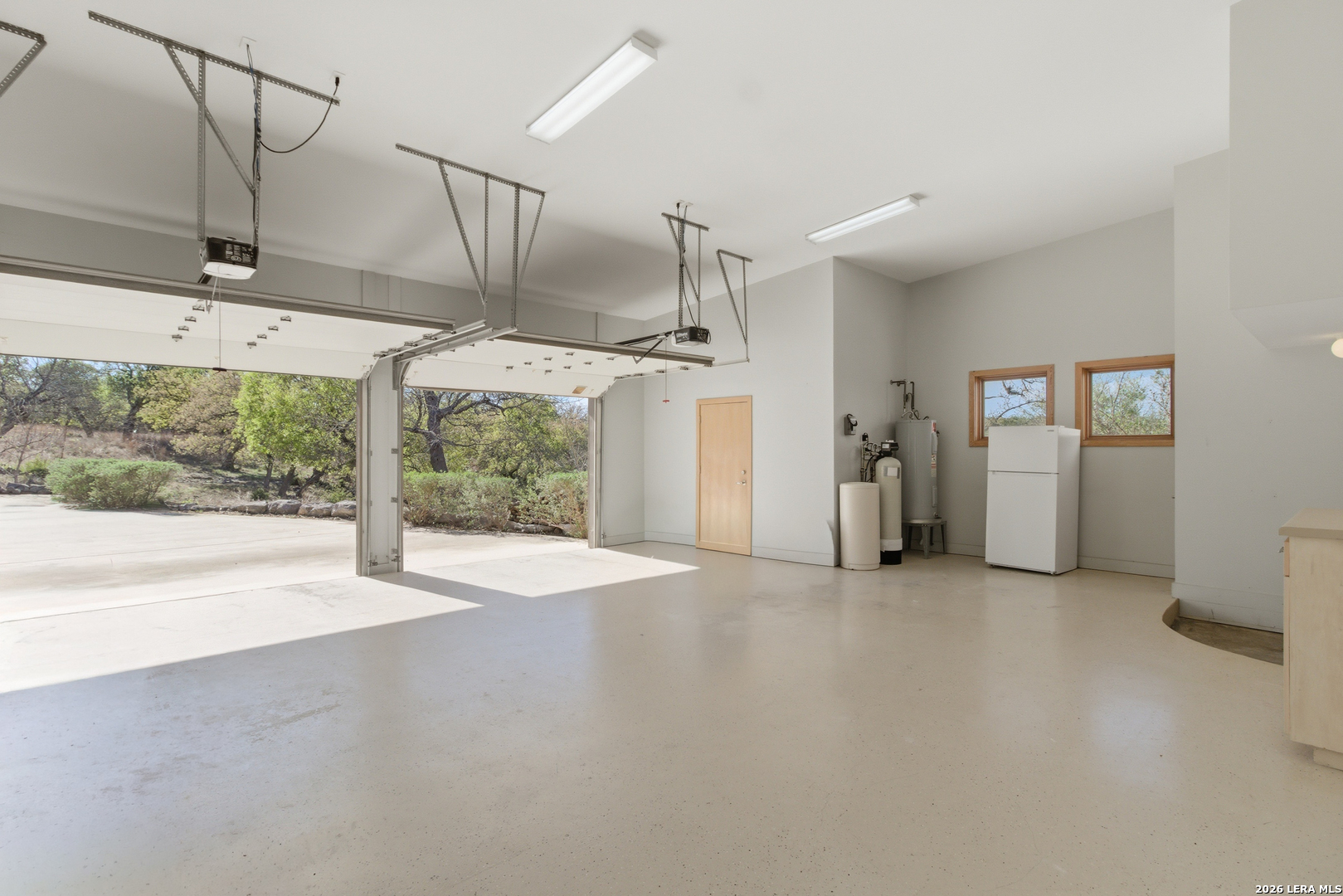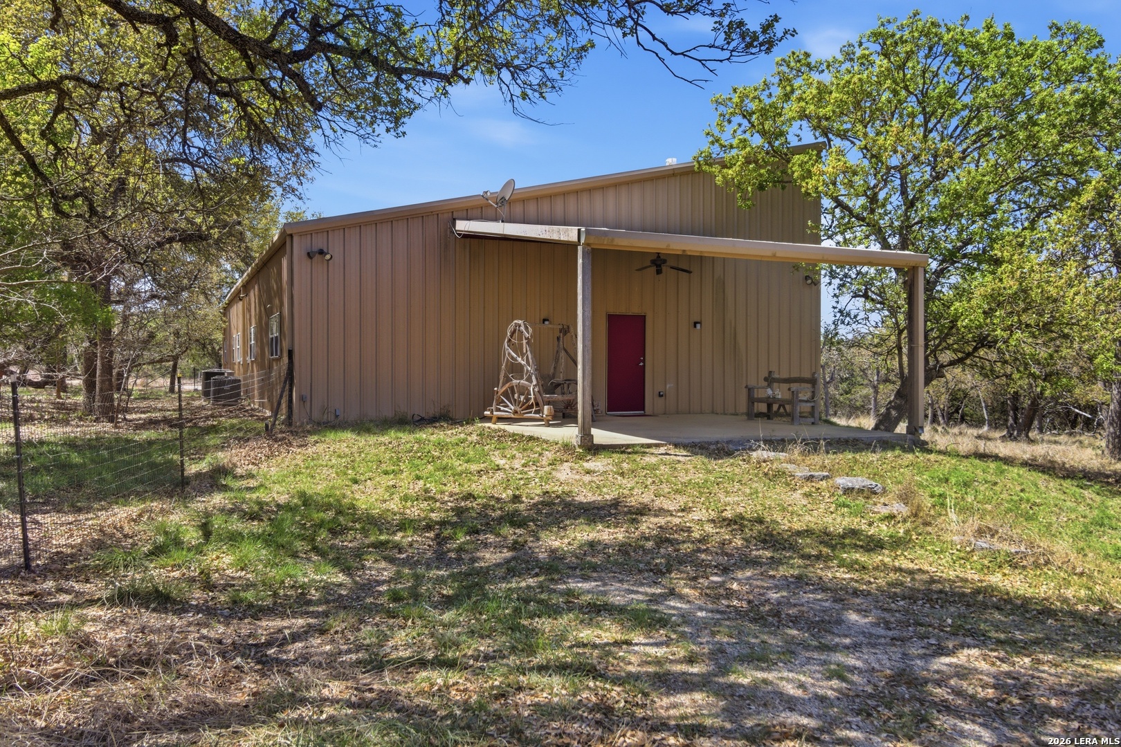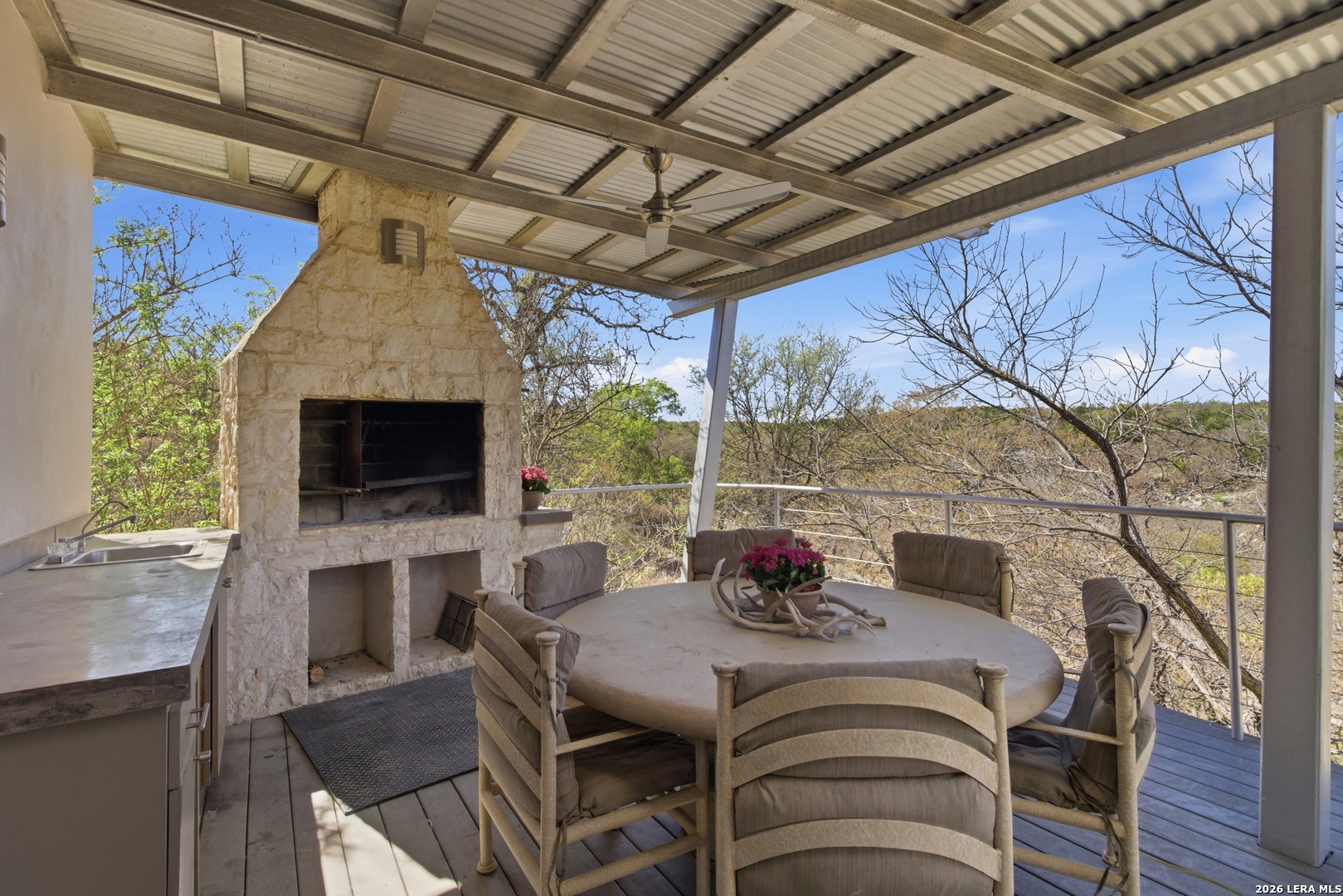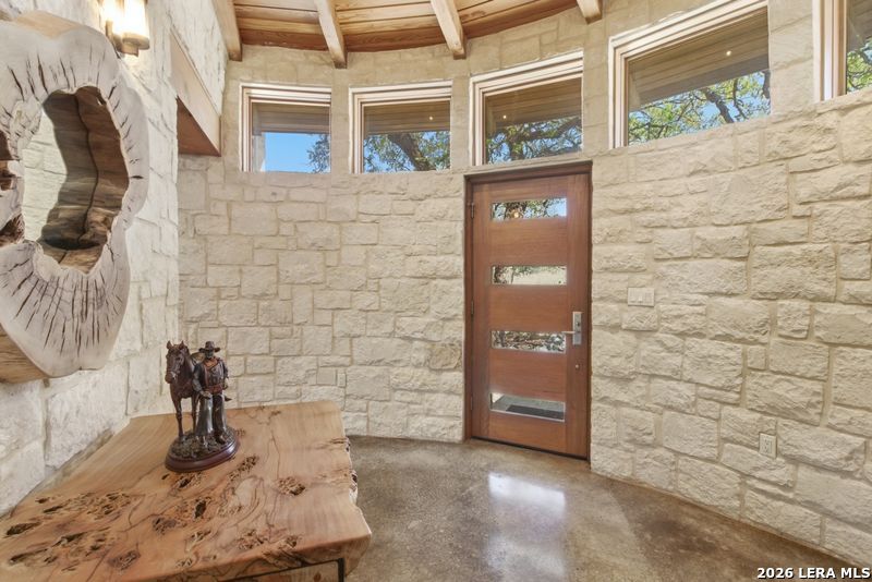 This exceptional 50+/- acre Hill Country estate, located in Kerrville,TX offers a rare blend of refined modern living, thoughtful land stewardship, & turnkey ranch functionality. Gently rolling terrain ranging from approximately 1,920' to 2,020' in elevation showcases expansive views, a spring-fed creek, & a mostly cleared landscape that balances usability with natural beauty. The striking 3,162+/- sqft contemporary main residence, constructed of rock & stucco, pairs clean architectural lines with a warm, intentional design. Massive windows capture phenomenal Hill Country views from both inside & out, filling the home with natural light & creating a bright, airy atmosphere. High ceilings enhance the open-concept layout, which includes three bedrooms, two dedicated offices, & three-and-a-half bathrooms. An oversized 986-sqft attached two-car garage features an epoxy floor & additional storage. Interior finishes include stained concrete, wood, & tile flooring, while xeriscape landscaping with native plants & rock elements minimizes yard maintenance. The chef's kitchen is designed for both daily living & entertaining, featuring a Sub-Zero refrigerator, Thermador gas range with six burners, grill, & double ovens, dual Bosch dishwashers, & a Frigidaire microwave. Additional features include a Dacor warming drawer, Hydrotech reverse osmosis system, under-cabinet lighting, dual stainless sinks, & a large pantry with wine storage. The living room centers around a wood-burning fireplace & flows seamlessly within the open-concept design connecting the kitchen, dining, & living areas. Designed with entertaining in mind, the home is equipped with an integrated indoor & outdoor surround sound system, enhancing both everyday living & gatherings. The dining space features oversized windows & high ceilings, while French doors from the kitchen lead to the covered patio, enhancing indoor-outdoor living. The upstairs primary suite offers a private retreat with a walk-in shower, two large closets, & sweeping canyon views, along with a thoughtfully designed stairwell featuring a softly lit mid-landing & large windows. Two additional bedrooms are located downstairs. One has patio access & overlooks the canyon & pool. It has a bathroom with a walk-in shower. The other bedroom has a large window with a bench seat & its own bathroom with a shower/tub combo. Each bedroom has built-ins in the closets. Two offices with built-in desks & cabinetry provide functional work-from-home space. Outdoor living is designed for relaxation & entertaining, featuring a covered porch with galvanized beams & railing, a fully equipped outdoor kitchen with grill/fireplace, sink, & cabinetry, Trex decking, & a separate partially covered patio. A resort-style heated in-ground 10'x80' lap pool ranging from 3'-6' deep with attached hot tub is complemented by subtle tree lighting that enhances the ambiance after sunset. A 3,000+/- sqft multipurpose metal building offers exceptional versatility with living quarters, including two bedrooms or offices, one bathroom, laundry room, workroom, & kitchen area with a large open gathering space. Additional features include stained concrete floors, double-paned windows, gutters, a covered patio, & an attached two-car carport-ideal for guests or flexible use. Equestrian improvements include a 2,400+/- sqft horse barn with five stalls, two tack/storage rooms, a round pen, & two fenced paddocks with lean-tos. Fully equipped for ranch & recreational use, the property includes 4 deer blinds and 2 feeders. Conveniently located minutes from IH 10, the property offers easy access while maintaining privacy, with large neighboring ranches & native wildlife enhancing the sense of seclusion. With underground electric, quality infrastructure, & a seamless blend of luxury improvements & usable wildlife exempt acreage, this property stands apart as a true Hill Country retreat-ideal as a full-time residence, weekend escape, or legacy ranch.