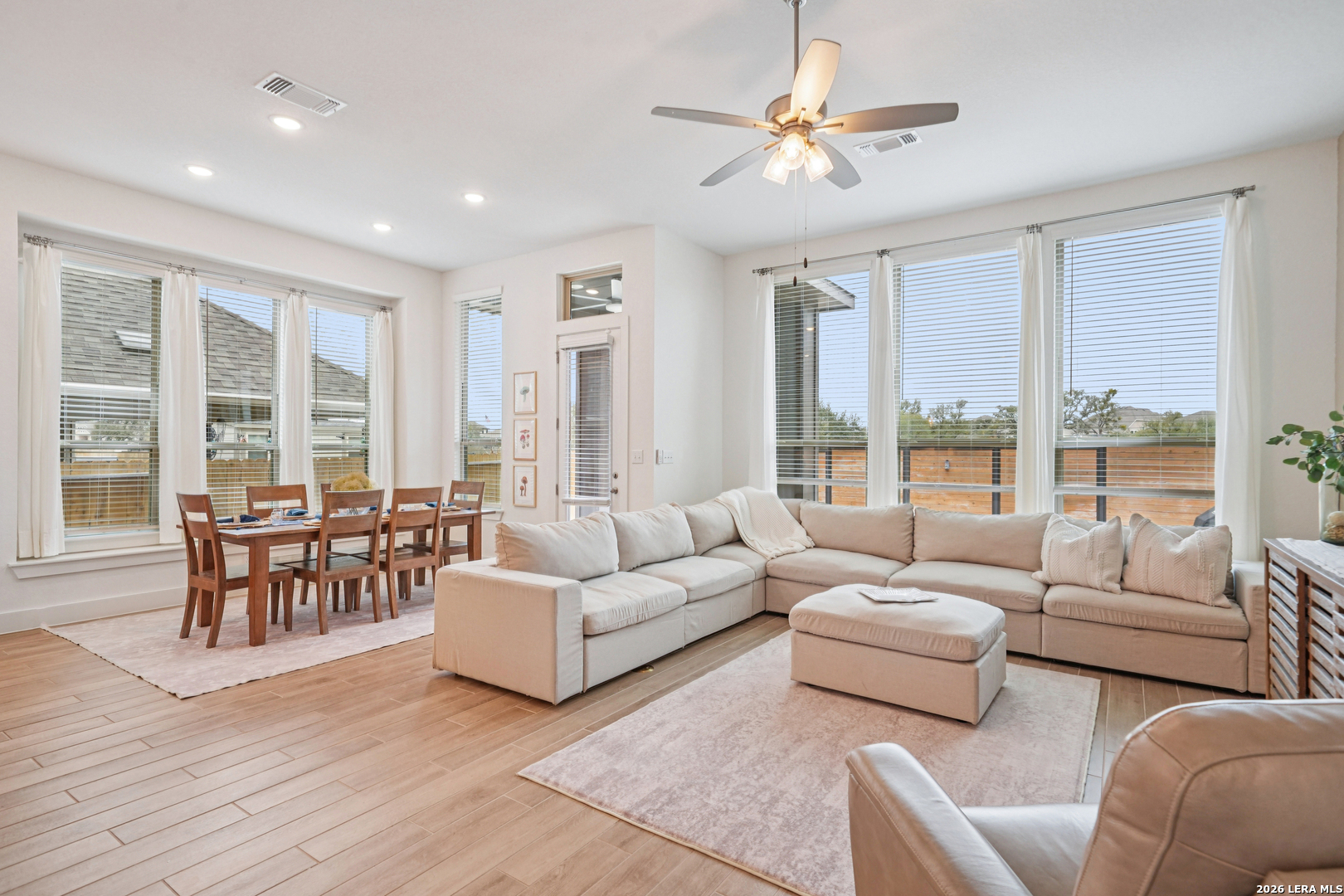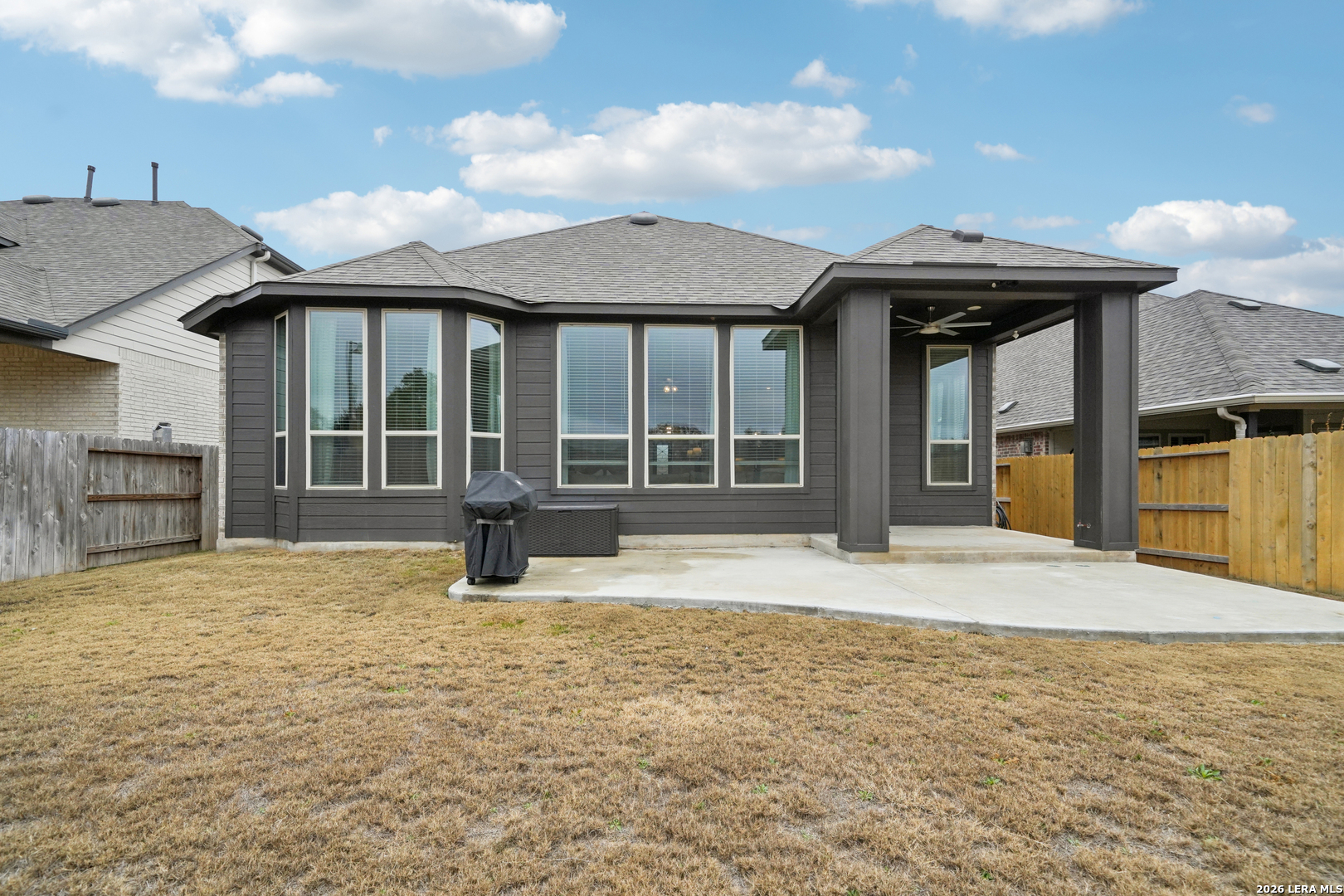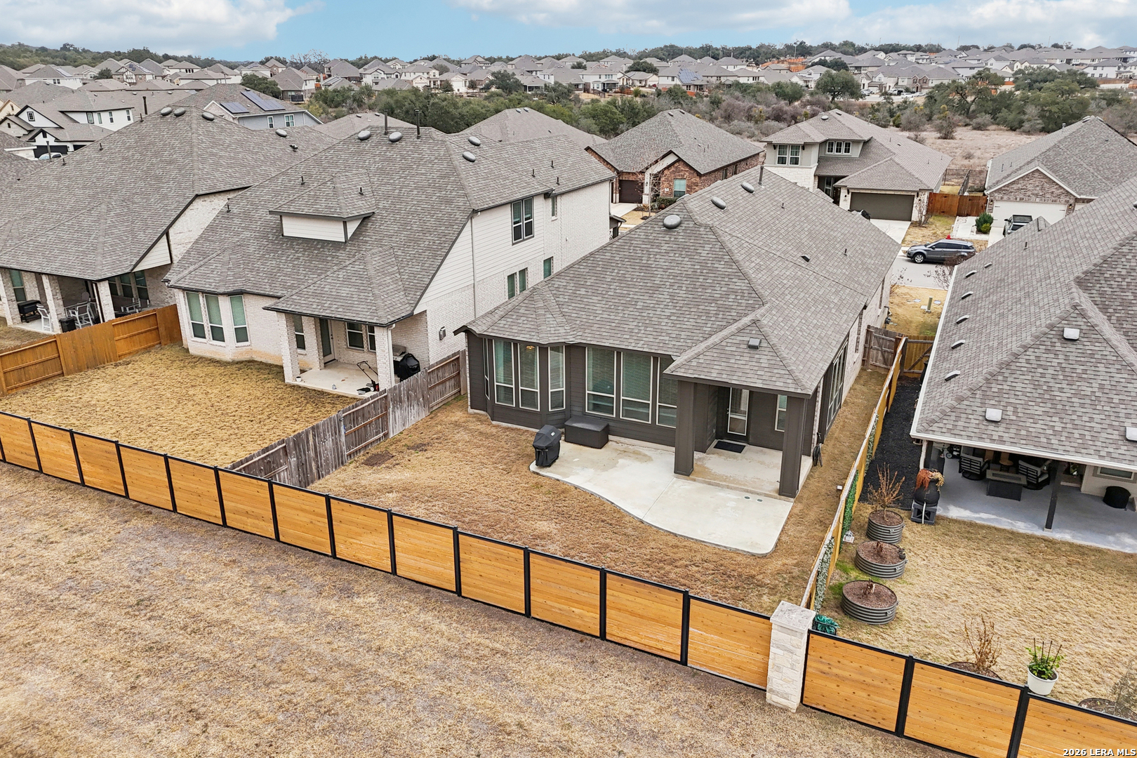 Single-story Highland home -The Davenport plan- where sunsets stream through the living room windows and privacy meets thoughtful design. This beautifully upgraded 4 bedroom, 3 full bath home with a dedicated study offers an efficient, highly livable layout. An inviting entryway opens to soaring 11' ceilings and a spacious open-concept living area centered around an eat-in kitchen and oversized island, ideal for daily living and entertaining. The gourmet kitchen features quartz countertops, designer backsplash, high-end, stainless steel appliances, and a chef-inspired gas range, all overlooking the dining and living spaces. Wood-like tile runs throughout the main living and wet areas for both durability and style, while expansive 8' rear windows capture peaceful views with No BACK NEIGHBOR! The private primary suite includes a bay window sitting area and connects to a spa-like bath with upgraded walk-in shower and extended double vanities, and large primary closet. Secondary bedrooms are thoughtfully separated, offering flexibility for guests or work-from-home needs. Other notable upgrades include reverse osmosis system, soft close cabinets, custom blinds, owned water softener, gas heat, gas tankless water heater, oversized pantry, and a covered patio with an extension - perfect for enjoying evening breezes and Hill Country skies. Located within walking distance to the historic Heimer House and the future on-site elementary school, Meyer Ranch residents enjoy two amenity centers, trails, gathering spaces, and year-round neighborhood events.