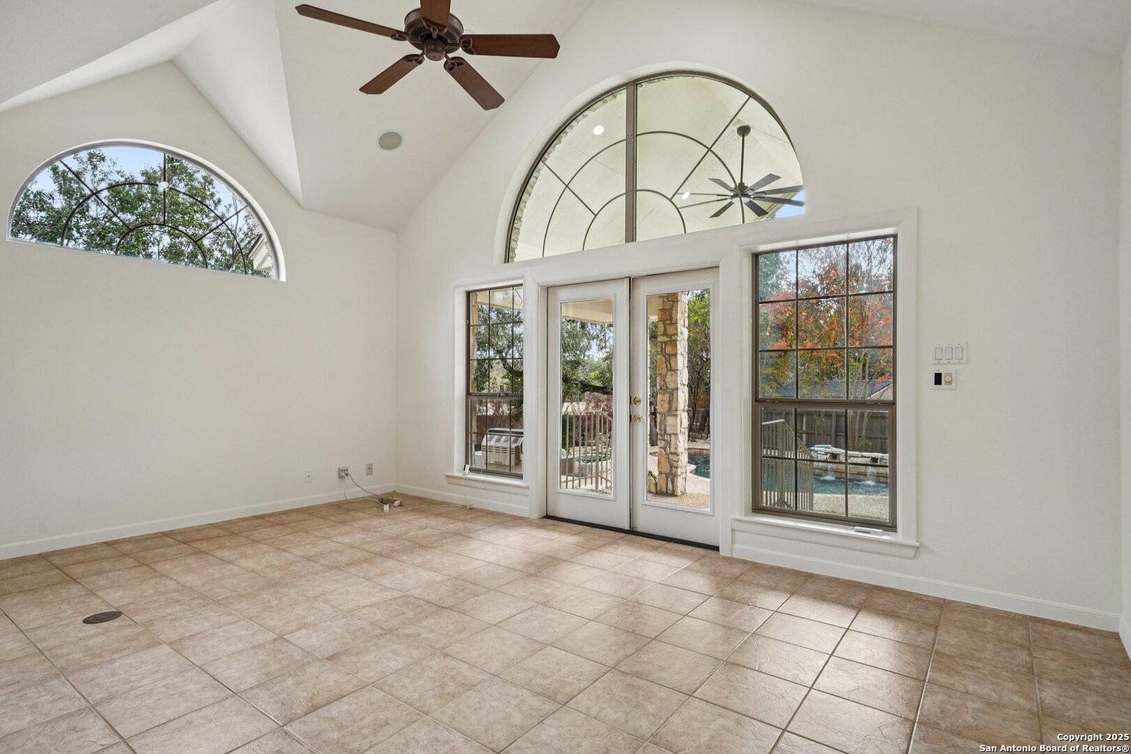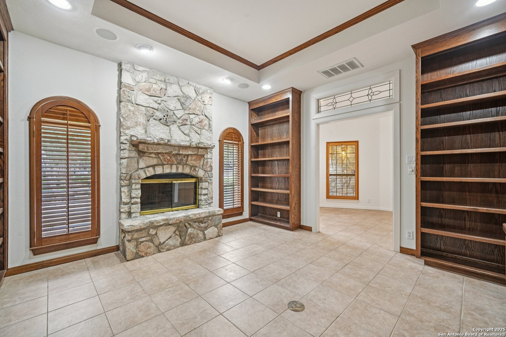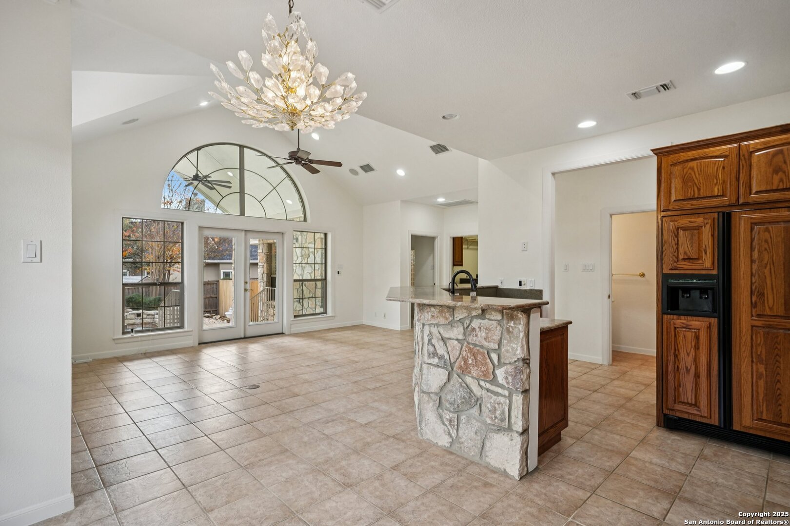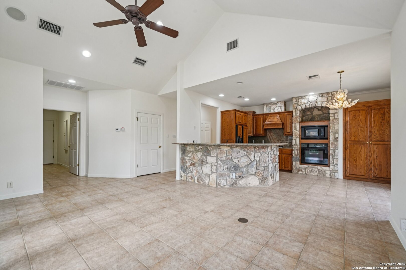 *OPEN HOUSE SAT. 12/27/25 2PM - 4PM & 12/28/25 2PM - 4PM* Located in the highly desirable Fountains at Deerfield, this well-maintained single-story home offers an exceptional blend of comfort, elegance, and privacy within a gated, guard-monitored community. Situated on an oversized cul-de-sac lot, the property is surrounded by mature trees, refreshed landscaping, and a peaceful setting, all while remaining inside Loop 1604 with convenient access to shopping, dining, and major highways. The front exterior features low-maintenance xeriscaping. Inside, the bright and open floor plan showcases tall vaulted ceilings, graceful architectural arches, and abundant natural light across multiple living areas. A private front office features a striking stone fireplace, custom built-in cabinetry, and integrated speakers, with the flexibility and layout to function as a potential 4th bedroom. The formal dining room is highlighted by a beautiful chandelier, creating an elegant space for entertaining. The spacious primary suite serves as a private retreat with separate vanities, a generous walk-in closet, and a large walk-in shower enhanced by thoughtful lighting. The kitchen is designed for both everyday living and entertaining, offering high-end granite countertops, a substantial stone island, custom cabinetry, a gas cooktop, and built-in oven and microwave. Outdoor living is equally impressive with a large covered patio, an in-ground pool with fountains, and a stone privacy wall. Recent updates include approximately $100,000 in updates made to the home, full interior painting, newer carpet, newer exterior trim paint, a newer garage door with repainted doors, painted garage floors, refreshed front and back landscaping with new sod, and professional tree trimming. Additional features include a reverse osmosis water filtration system, a fully serviced HVAC system with a newer thermostat, sealed ductwork, electrical updates brought to current standards, ceiling fans, and newer exterior lighting. This quiet cul-de-sac home offers thoughtful upgrades, timeless design, and a prime San Antonio location within Deerfield. Zoned to the highly regarded NEISD and Churchill High School, with easy access to Loop 1604 and a short commute to Camp Bullis Military Base.