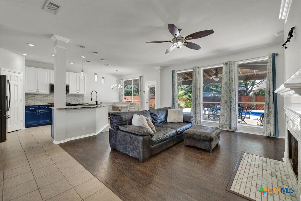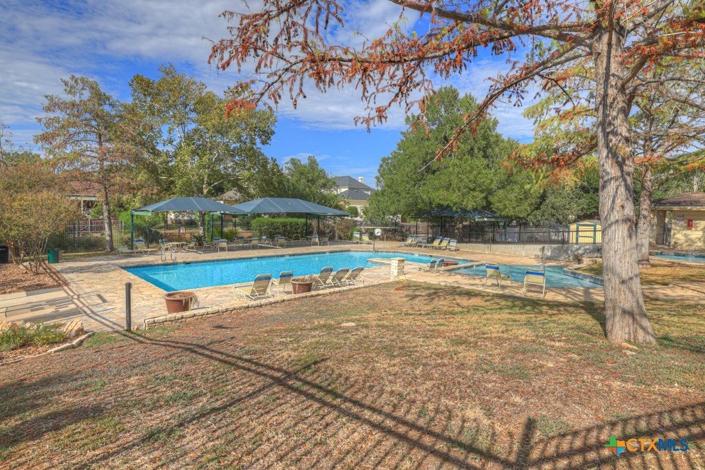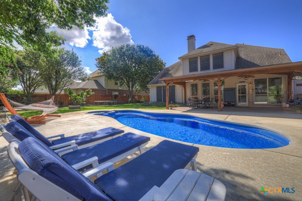 ** NEW ROOF INSTALLED wk of 11/3/25. ** This home has it all! A backyard oasis complete with pool and spa, space to spread out with multiple living areas, upgrades galore, and a neighborhood amenities center. This welcoming 4 bed, 2.5 bath residence offers the perfect blend of comfort, style, and functionality. Step inside to find a separate formal living and dining room downstairs, complemented by an open family room with a cozy fireplace, a beautifully upgraded kitchen with sunny breakfast nook with views of your private backyard sanctuary. The downstairs primary suite offers ample space for relaxation with an upgraded en suite with dual sinks and a princess makeup space. Upstairs, a versatile loft-style flex space connects three bedrooms, plus an office/study with French doors, perfect for working from home or quiet reading. Thoughtful upgrades to the kitchen and bathrooms add modern flair, while abundant storage ensures everything has its place. Step outside to your resort-worthy backyard, complete with a shimmering pool and spa, and an impressive pergola-covered patio (27x14) for outdoor living and dining. Whether hosting a gathering or savoring a quiet evening, this space delivers the ultimate in indoor-outdoor living. Located in a vibrant community with pool, playground, tennis courts, basketball, and scenic walking trails, this home is ideal for families who love both activity and relaxation. Easily walk to Veramendi Elementary or Oak Run Middle. Located close to shopping and restaurants. Short distance to Gruene and downtown. Come enjoy all that New Braunfels has to offer.
