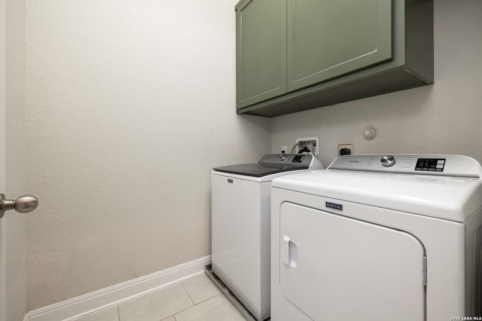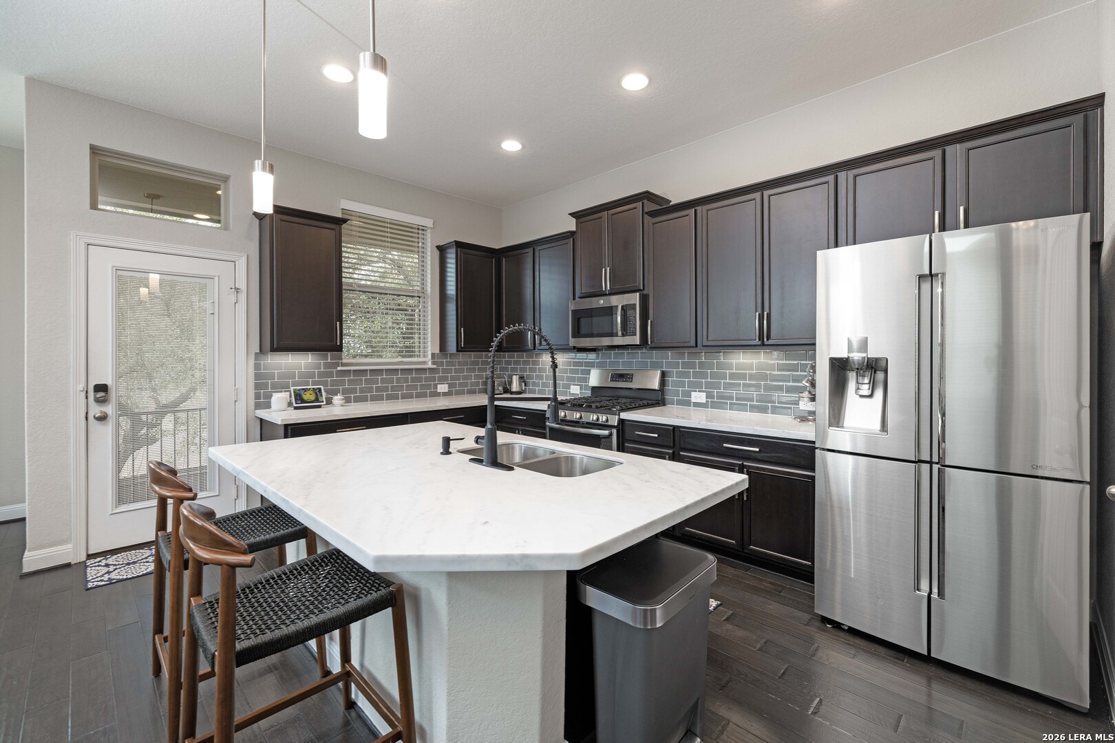 Exquisite style meets everyday comfort in this stunning 3-bedroom, 2.5-bath Townhome with a 2-car garage, offering just over 1,900 square feet of thoughtfully designed living space. Ideally located just off Loop 1604 and Judson Road in the charming community of The Reserves at Knoll Creek, this home blends convenience with elegance. Step inside to a striking wrought-iron staircase that sets the tone for the home's sophisticated design. A short staircase leads up to the main living level, where soaring ceilings and an open-concept layout create an inviting, airy atmosphere. The living room, dining area, chef's kitchen, and private primary suite flow seamlessly together, perfect for both entertaining and daily living. From the entry, a short staircase down leads to two spacious guest bedrooms and a generous game room with direct outdoor access to the backyard-ideal for guests, hobbies, or a second living space. Rich wood flooring runs throughout all main living areas, including the kitchen, adding warmth and a custom feel. Accent upper windows fill the home with natural light, enhancing the bright, open ambiance in every room. The chef-inspired kitchen is a true centerpiece, featuring granite countertops, stainless steel appliances, custom 42-inch cabinetry, a stylish backsplash, a large island, gas range, and abundant prep space. The owner is also conveying the Samsung stainless steel refrigerator, along with a Maytag washer and dryer, adding exceptional move-in-ready value. The primary suite is thoughtfully separated from the secondary bedrooms for maximum privacy. The spa-like ensuite bath includes a garden tub, designer-tiled walk-in shower, dual vanities, and a spacious walk-in closet. This energy-efficient home showcases the quality craftsmanship expected from Chesmar Homes. The exterior was recently painted and brand-new gutters have just been installed, enhancing both curb appeal and function. Modern smart-home features include Yale digital door locks on all entry doors, Google Nest Learning Thermostats on both floors, and Google Nest security cameras positioned over the driveway, above the garage entry door, at the back door, and Google Nest doorbell camera at front door.