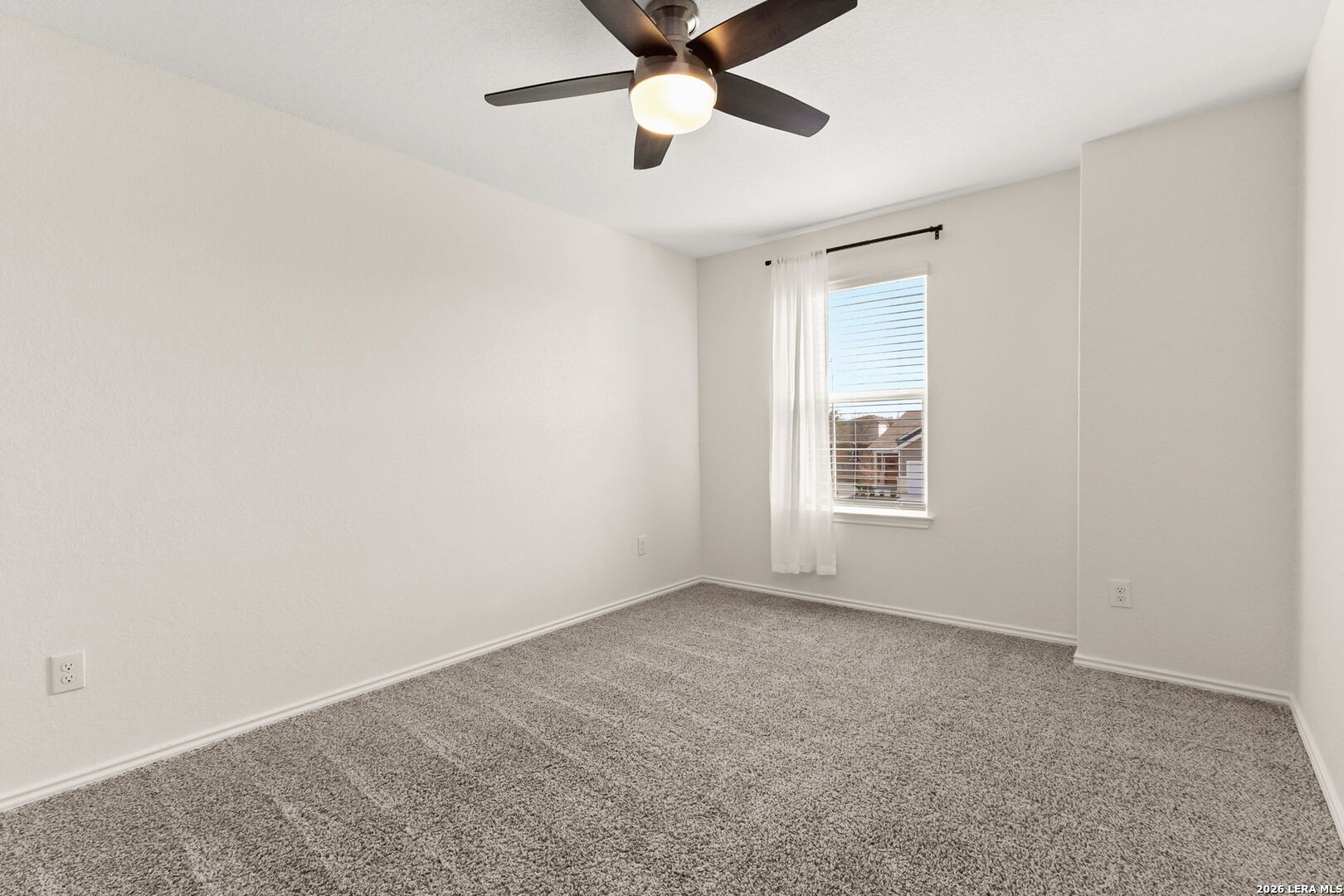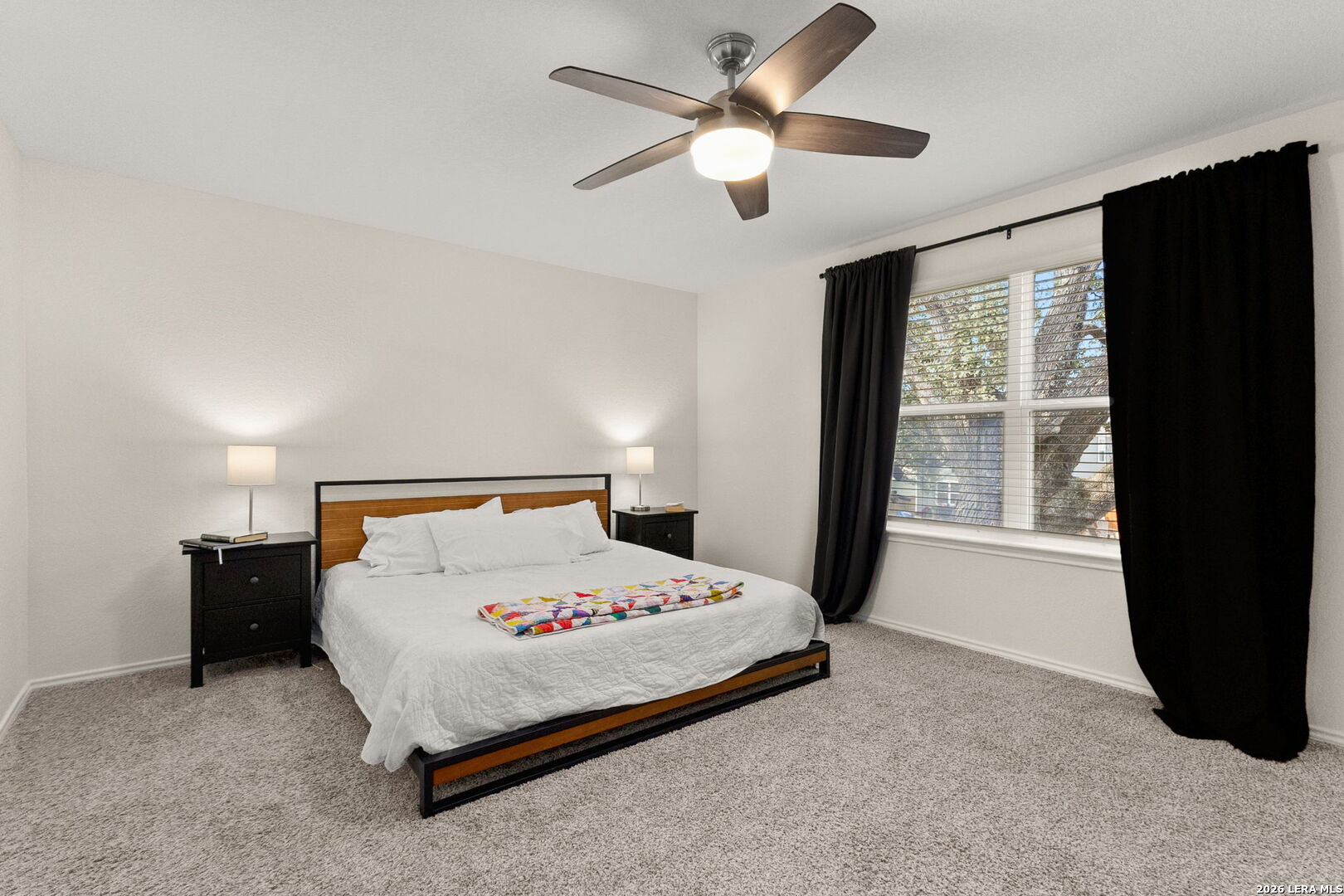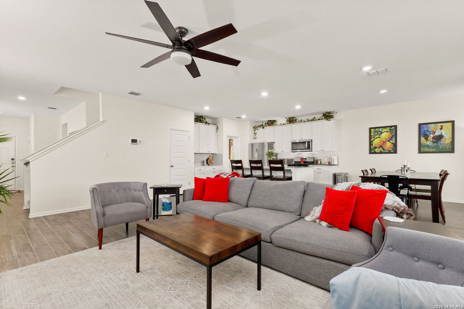 Move-in ready and thoughtfully designed, this home offers a flexible layout ideal for today's lifestyle. The open-concept main living area flows seamlessly into the kitchen and breakfast nook, featuring a center island, large pantry, granite countertops, white cabinetry, subway tile backsplash, and upgraded stainless-steel appliances. A first-floor bedroom with a full bath nearby provides excellent space for guests or a home office. Upstairs, a spacious loft separates the secondary bedrooms from the private primary suite, which includes dual sinks, a walk-in shower, and a generous walk-in closet. Enjoy outdoor living with a covered patio and a large backyard shaded by a mature oak tree-perfect for relaxing or entertaining. Additional features include a 6' sliding glass door and water softner.