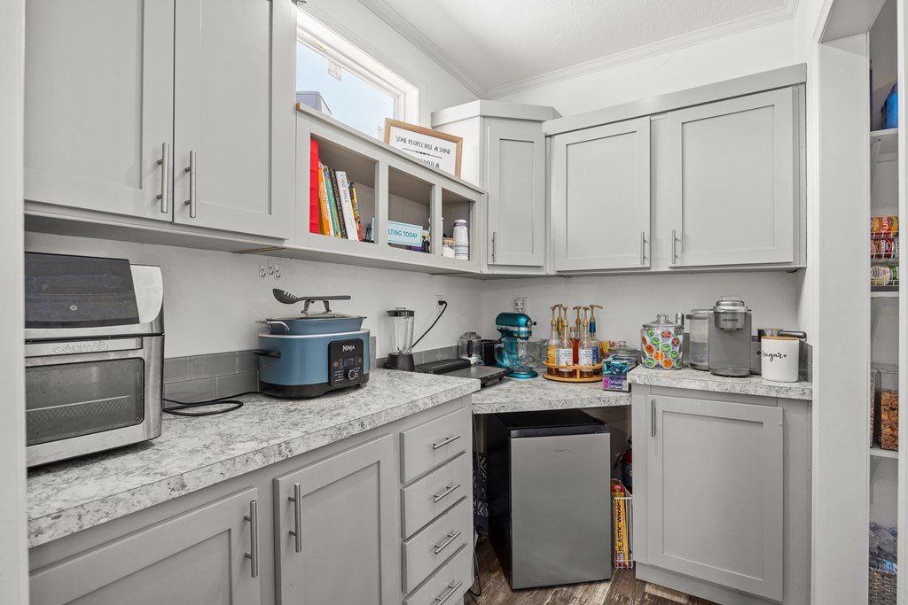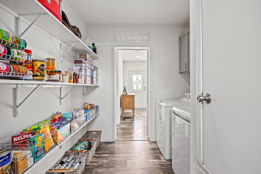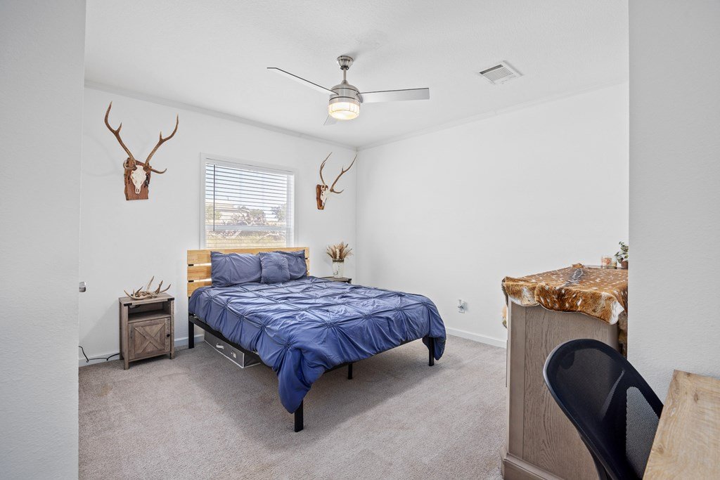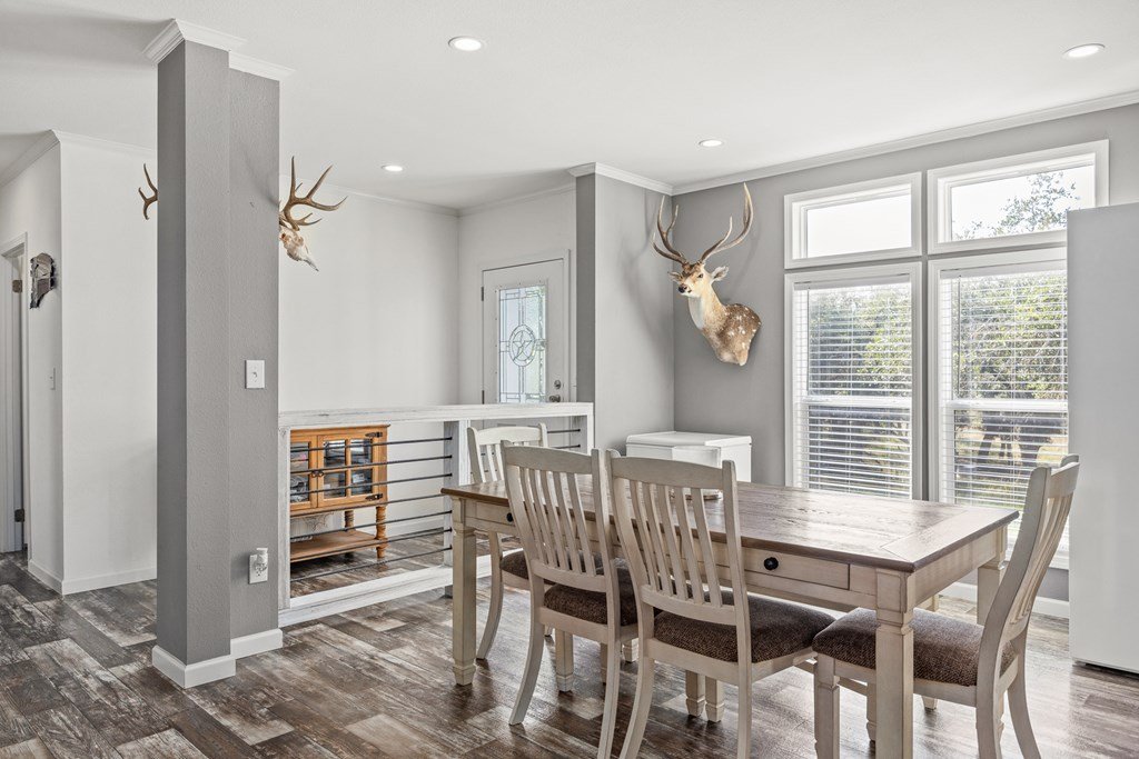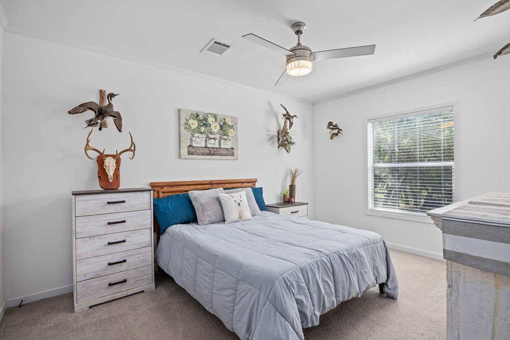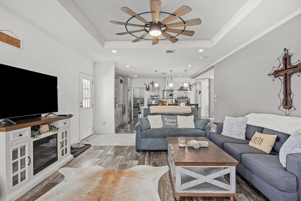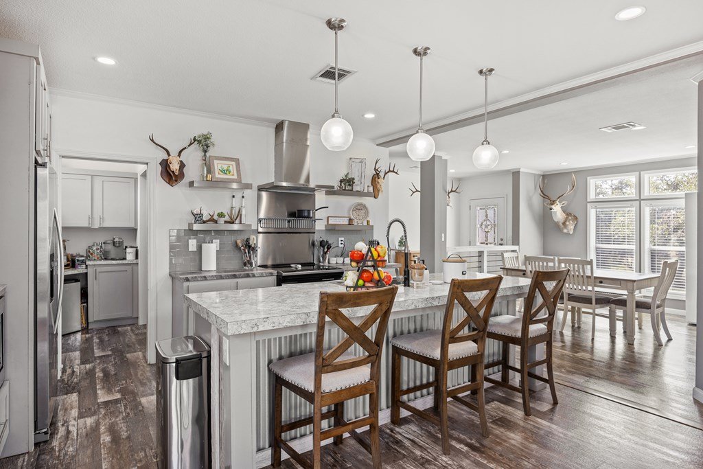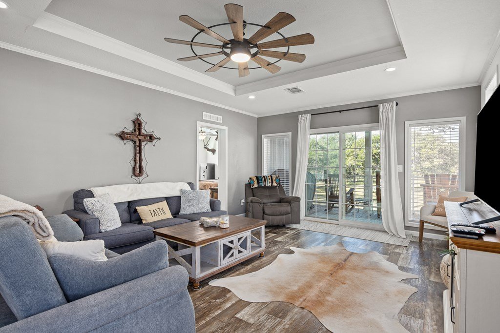 Welcome to country living in beautiful Harper Estates! This 2019 Titan home is so immaculately maintained it still feels brand new! It offers 3 bedrooms, 3 baths, and over 1, 900 sq. ft. of comfortable living space on 5.05 tree-covered acres at the end of a quiet cul-de-sac with no city taxes. The open, light-filled floor plan features a spacious living room with tray ceiling that flows right onto a covered front deck, perfect for morning coffee or evening sunsets to watch the wildlife. The kitchen is a true entertainer's dream, complete with a large island that seats many, stainless appliances, and one of the home's biggest highlights: an amazing walk-in butler's pantry plus an additional pantry for even more storage. A huge laundry room provides tons of additional storage/ pantry space. The split floor plan offers generously sized guest bedrooms, while the primary suite boasts peaceful property views, dual closets, a double vanity, and an oversized walk-in shower. With modern finishes, fresh updates, and plenty of room to roam, this Hill Country retreat is ready to welcome you home.