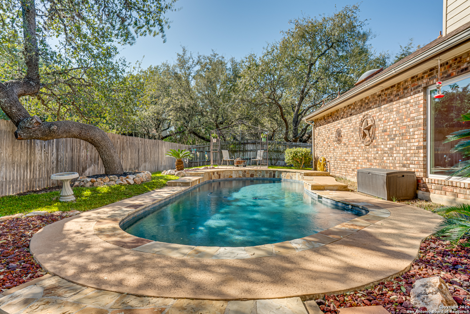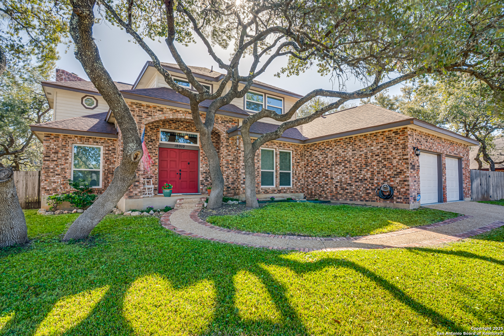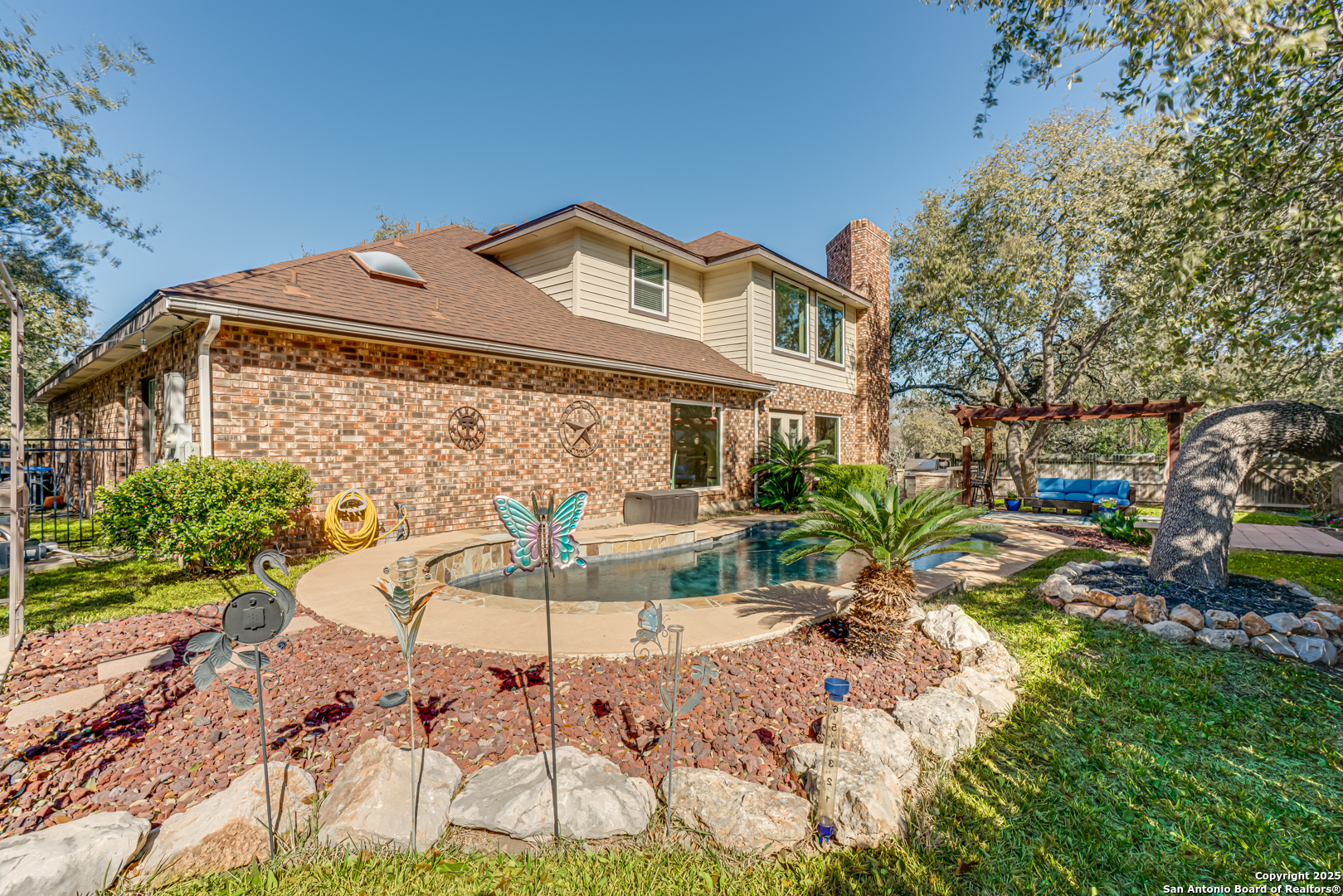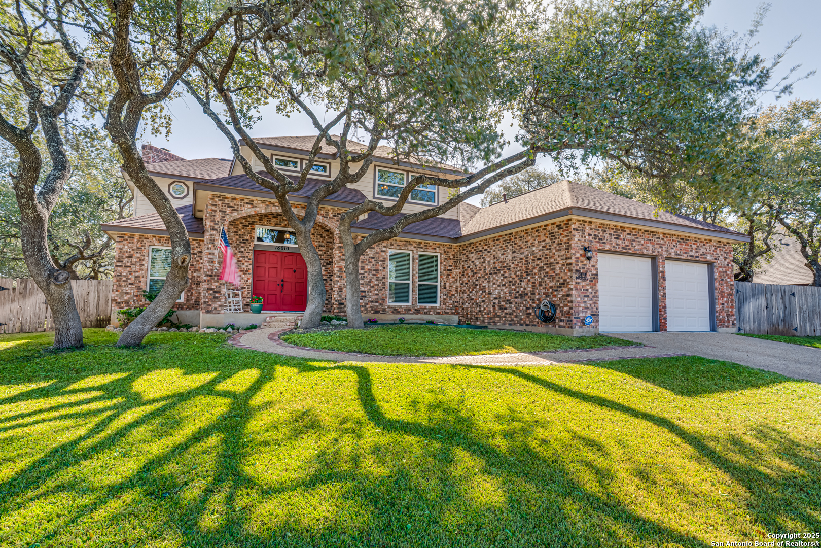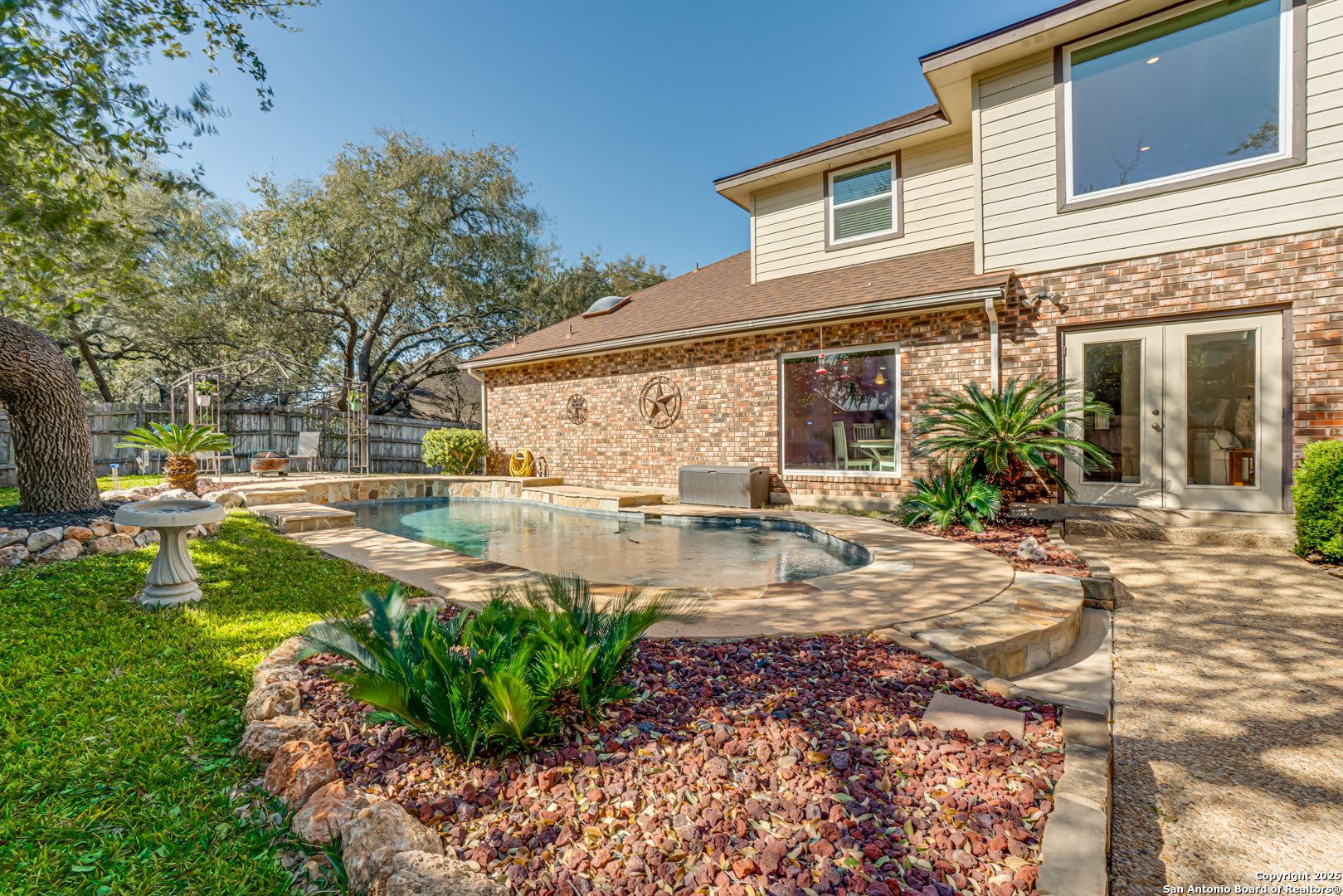 Step inside and say hello to this beautiful home, perfectly situated in the sought-after Stone Oak area-conveniently located on the hospital grid in a quiet, low-traffic neighborhood. With easy access to churches, Reagan High School, and major freeways, you'll enjoy the benefits of Stone Oak living without being too deep into the area. Sitting atop a spacious quarter-acre lot, this property provides both comfort and functionality with thoughtful updates and exceptional features. The home has been meticulously maintained, with a new roof installed in 2019 and energy-efficient windows replaced in 2023 by Southwest Exteriors, offering a transferable lifetime warranty. Inside, the spacious primary suite features elegant tray ceilings, a garden tub, and a walk-in shower designed for easy access. A secondary bedroom downstairs provides flexibility, while the additional bedrooms upstairs share a Jack and Jill bathroom. The heart of the home is the open-concept kitchen, which seamlessly flows into the family room, where soaring 18-foot ceilings and an abundance of natural light create a warm and inviting atmosphere, perfect for entertaining. Step outside to your private backyard retreat, where a saltwater pool designed by Gary Pools offers the perfect place to relax, shaded in the afternoon and equipped for a volleyball net for added fun. An outdoor kitchen with a sink and running water makes outdoor gatherings effortless. Additional features include a gated side yard or dog run, a water softener, and an in-ground sprinkler system. This exceptional home combines comfort, style, and convenience in one of Stone Oak's most sought-after locations. Schedule your showing today and experience all it has to offer!