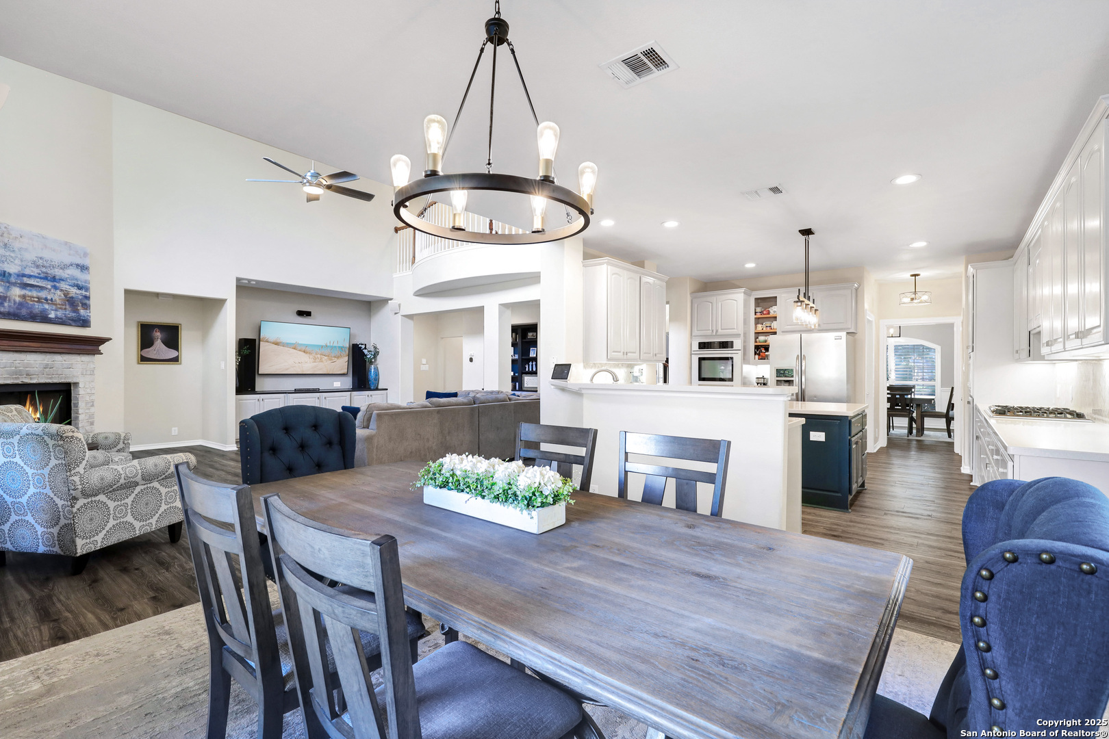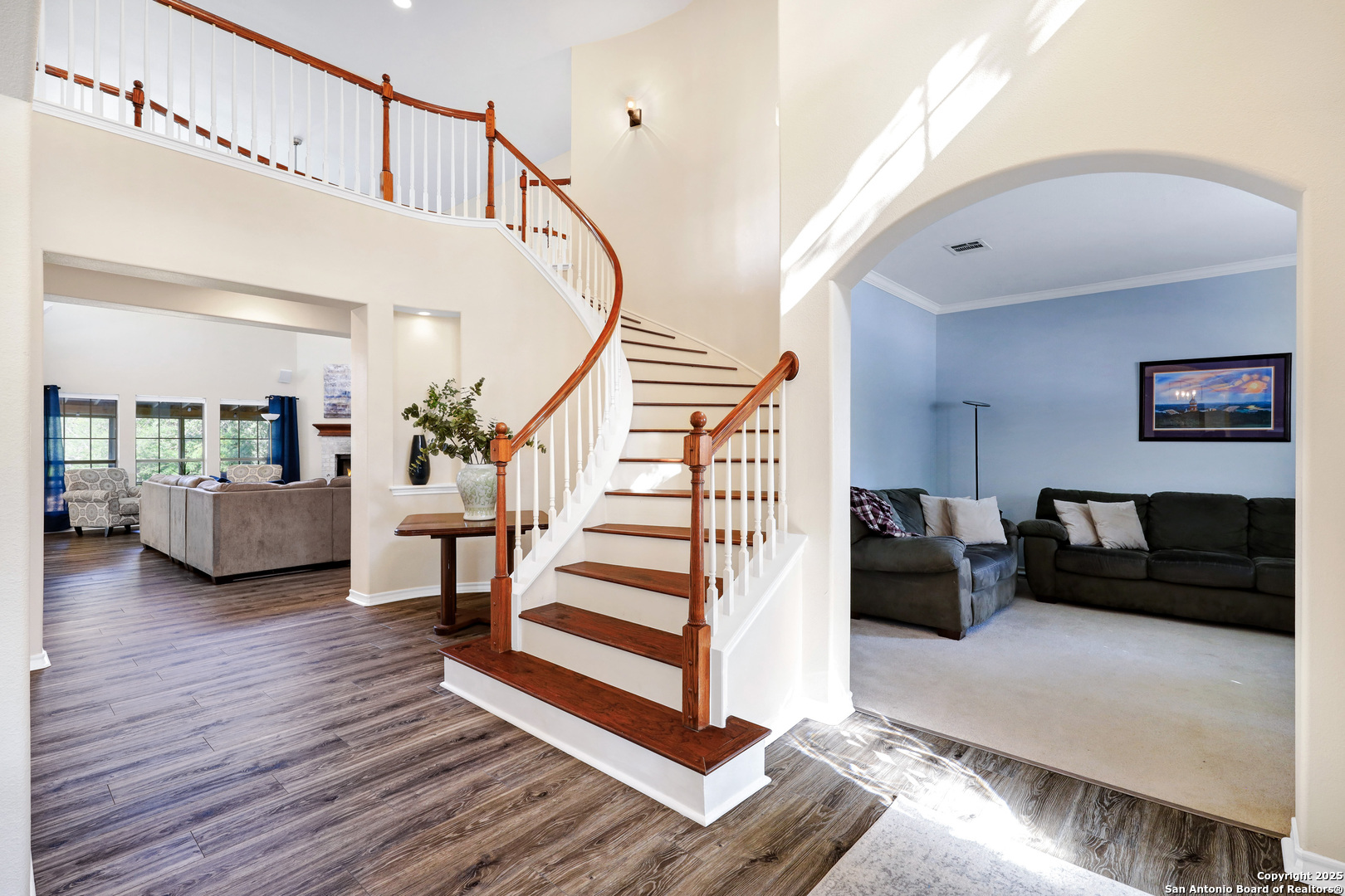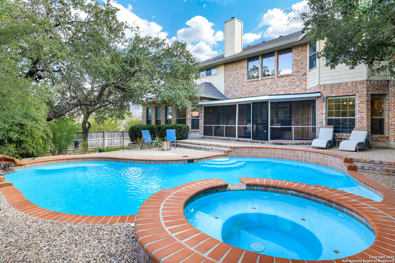 Located in the esteemed Rogers Ranch Point Bluff community, this exceptional home is a harmonious blend of elegance and comfort. With 5 spacious bedrooms, 3.5 bathrooms, and 4,437 square feet on a tranquil tree-lined corner lot, it offers a peaceful retreat. A grand, winding staircase greets you upon entry, leading to an open-concept design perfect for contemporary living. The formal living room, with its cozy fireplace and custom built-ins, sets the stage for relaxation and entertaining. The kitchen, featuring ample counter space, a gas cooktop, and a central island, is ideal for culinary enthusiasts. The master suite serves as a personal sanctuary with a sitting area and direct access to a beautifully landscaped backyard. Upstairs, you'll find four additional bedrooms, a game room, and a versatile craft/flex room. Step outside to a stunning outdoor oasis with mature trees, a pristine pool, and spa-perfect for enjoying sunny days and peaceful evenings. Additional amenities include a three-car garage and convenient proximity to top-rated schools, biking/walking trails, shopping, and dining options.
