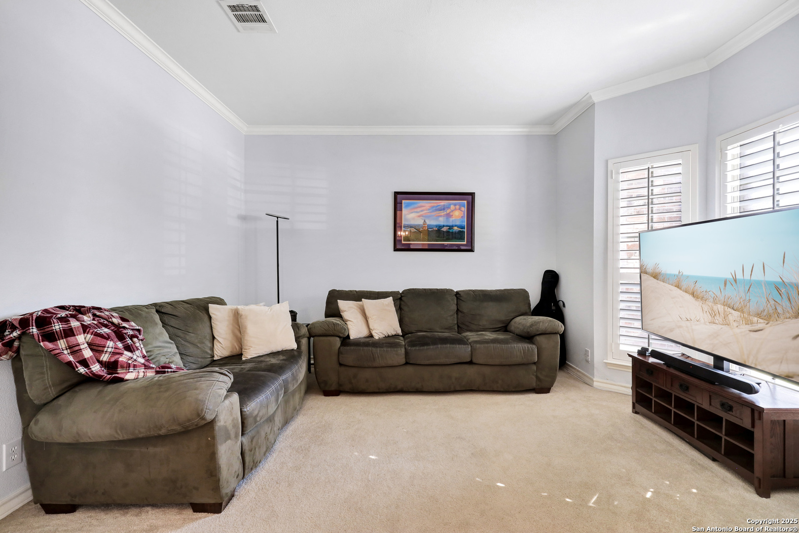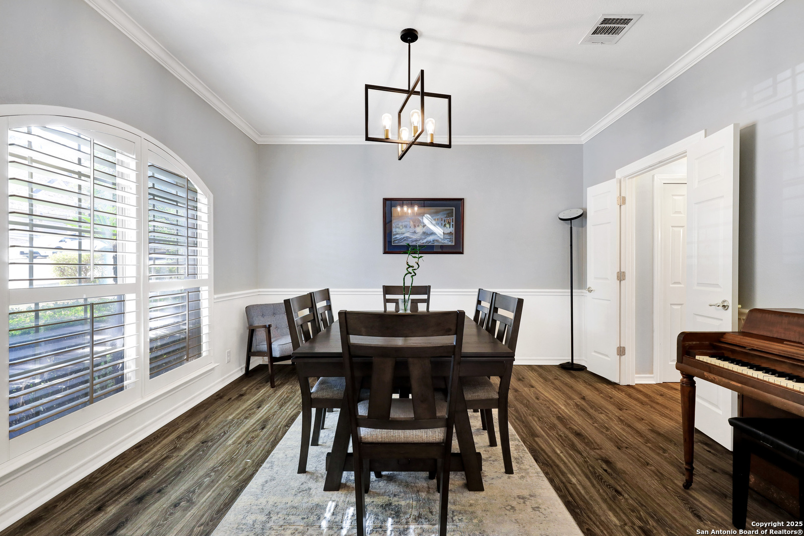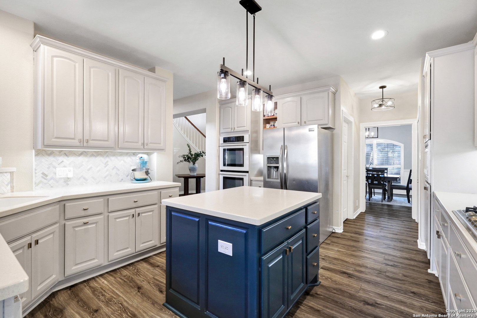 Located in the esteemed Rogers Ranch Point Bluff community, this exceptional home is a harmonious blend of elegance and comfort. With 5 spacious bedrooms, 3.5 bathrooms, and 4,437 square feet on a tranquil tree-lined corner lot, it offers a peaceful retreat. A grand, winding staircase greets you upon entry, leading to an open-concept design perfect for contemporary living. The formal living room, with its cozy fireplace and custom built-ins, sets the stage for relaxation and entertaining. The kitchen, featuring ample counter space, a gas cooktop, and a central island, is ideal for culinary enthusiasts. The master suite serves as a personal sanctuary with a sitting area and direct access to a beautifully landscaped backyard. Upstairs, you'll find four additional bedrooms, a game room, and a versatile craft/flex room. Step outside to a stunning outdoor oasis with mature trees, a pristine pool, and spa-perfect for enjoying sunny days and peaceful evenings. Additional amenities include a three-car garage and convenient proximity to top-rated schools, biking/walking trails, shopping, and dining options.