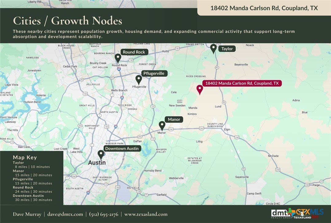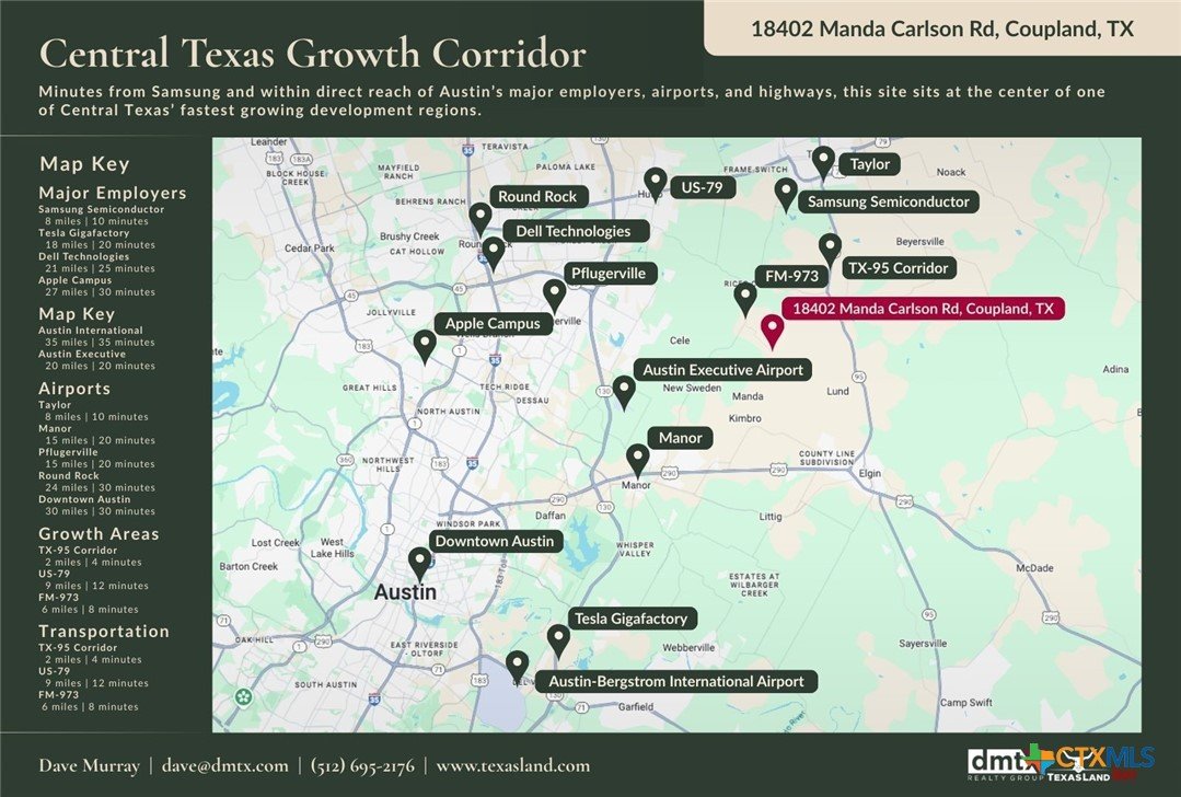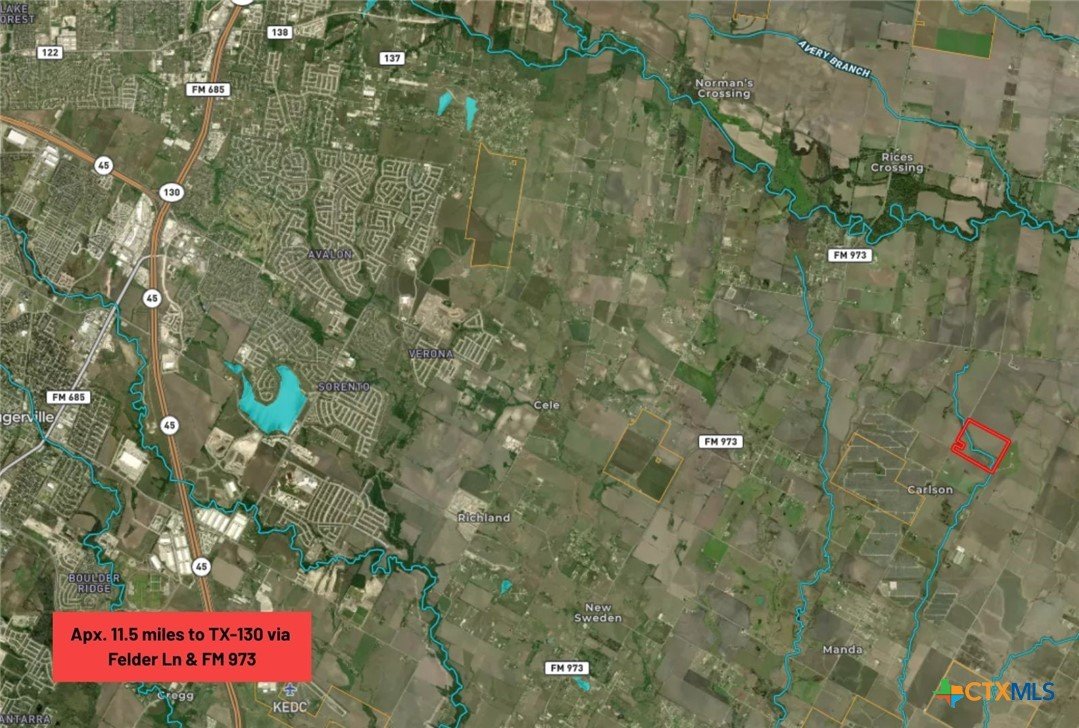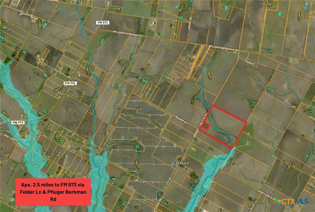 Set on 116 plus or minus acres with direct access off FM 973 via Felder Lane, this exceptional tract is located in an area experiencing explosive growth and is surrounded by active and planned development. The property lies within the Pflugerville ETJ and is served by Elgin ISD, offering a strategic position along one of Central Texas’s fastest-expanding corridors. A water line is available at the property through Aqua Water, adding valuable infrastructure for future development. The land features level topography, no FEMA floodplain, and no known restrictions, providing maximum flexibility for a wide range of uses. Its location is highly advantageous—offering excellent access to Samsung, Tesla, and Austin-Bergstrom International Airport via the 130 Toll Road. With its size, accessibility, and placement amid major infrastructure and employment hubs, this property represents a compelling opportunity for development, investment, or long-term land hold in the direct path of Austin’s eastern expansion.