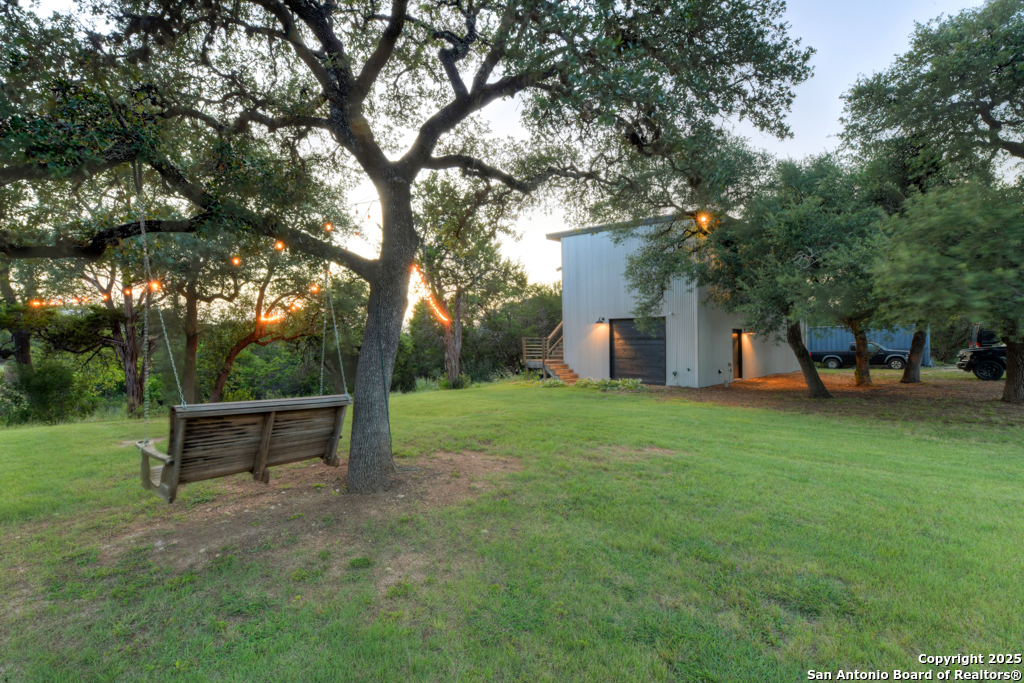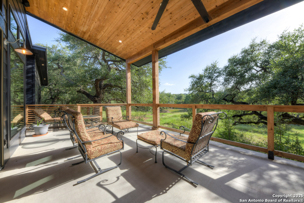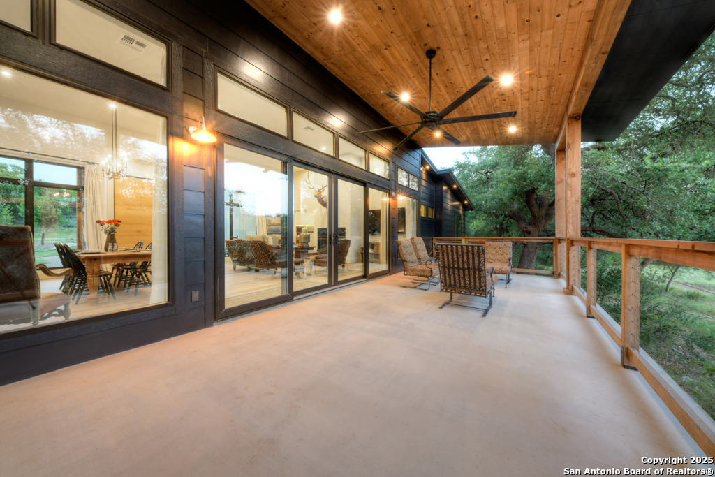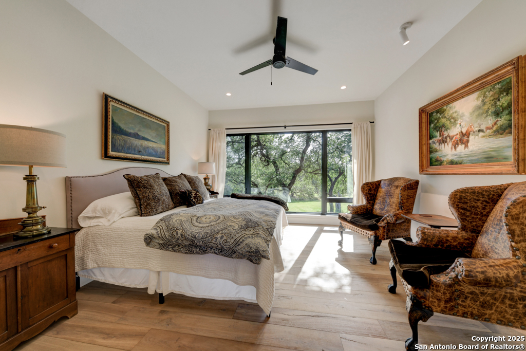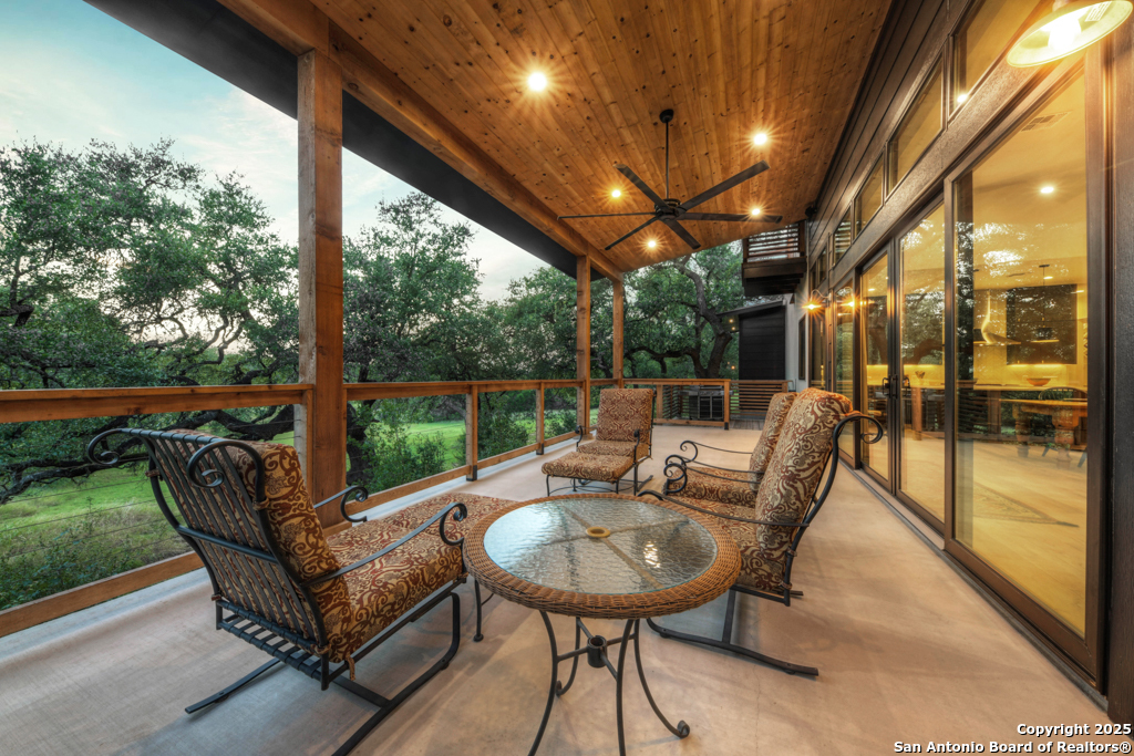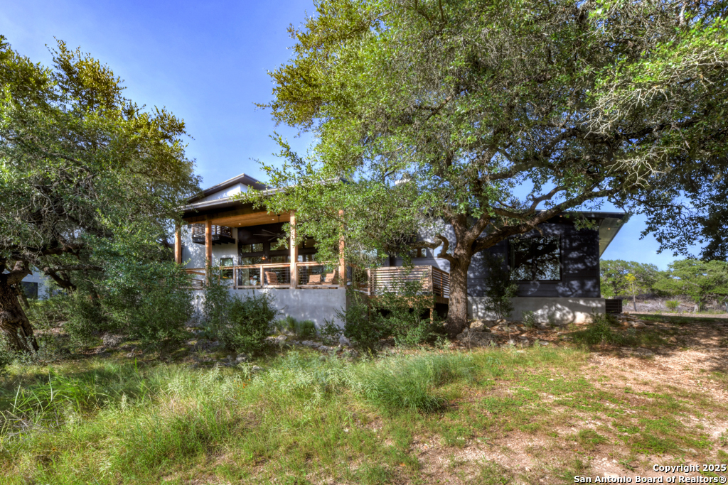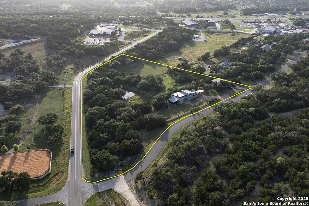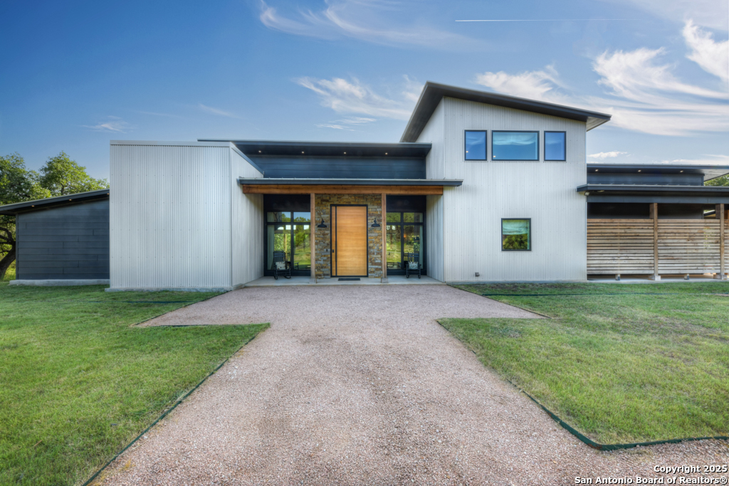 Luxury Hill Country Modern Estate! A masterpiece of design and craftsmanship, this stunning estate sits on nearly 7 acres of oak-studded land, blending luxurious living with serene Texas beauty. Every detail has been thoughtfully curated-from the 3/4-bedroom, 2 1-2 bath main residence to the separate 800 sq ft 2 bedroom 1 bath with full kitchen guest apartment and fully air-conditioned workshop with its own full bath. Inside, soaring 14' ceilings and massive custom windows flood the home with natural light, showcasing exquisite finishes like white oak plank flooring, 8' solid core doors, a vaulted great room with Heatilator fireplace, and a jaw-dropping wine room. The chef's kitchen is a dream: a 10' seamless island, high-end JennAir appliances, dual sinks, custom alder cabinetry, and polished nickel finishes that exude sophistication. Outside, a pivoting custom iron front door sets the tone for architectural excellence. Enjoy evenings on the expansive back porch beneath Douglas Fir beams and LED-lit pine ceilings, cooled by the Big A Fan and views of the stocked tank and surrounding pasture-ideal for horses, livestock, or gardening. Drip irrigation feeds fruit trees, and the red granite driveway adds curb appeal. Additional features include a whole-house water filtration system, sound-dampening insulation, in-house vacuum system, and even a bank vault door near kitchen. Located just minutes from city conveniences yet worlds away, this is a one-of-a-kind retreat where elegance meets functionality and nature. A rare opportunity for modern ranch living at its finest.