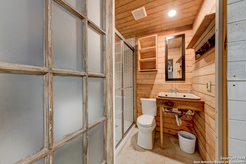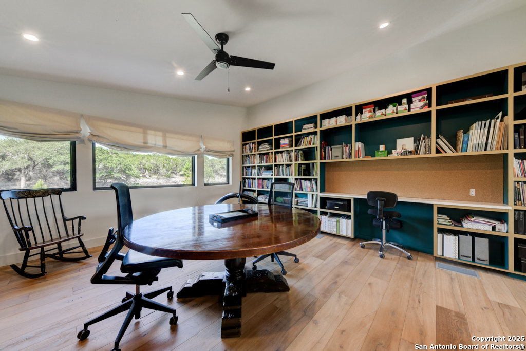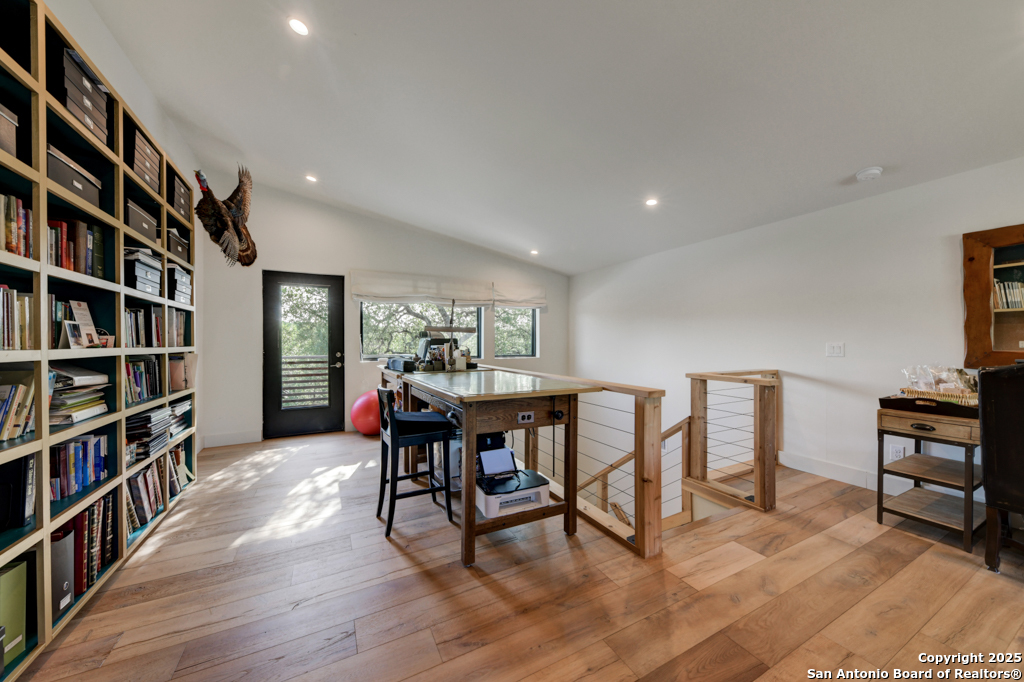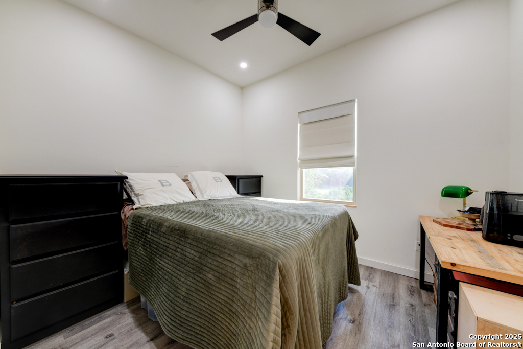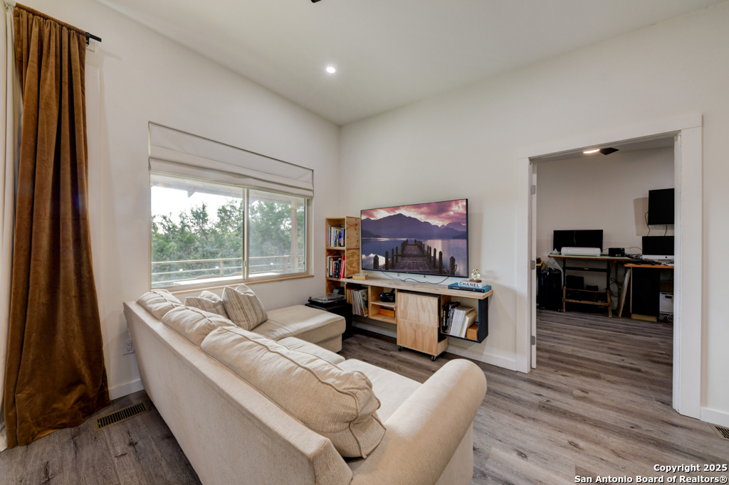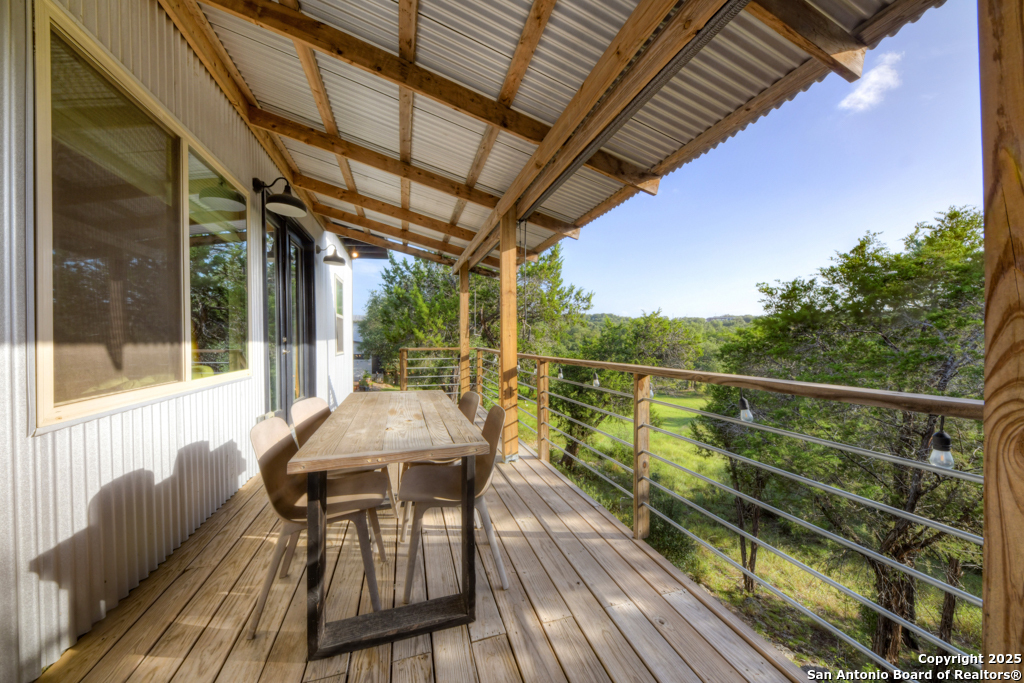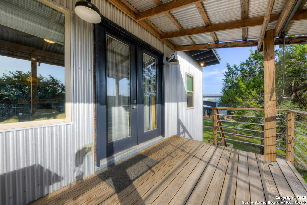 Luxury Hill Country Modern Estate! A masterpiece of design and craftsmanship, this stunning estate sits on nearly 7 acres of oak-studded land, blending luxurious living with serene Texas beauty. Every detail has been thoughtfully curated-from the 3/4-bedroom, 2 1-2 bath main residence to the separate 800 sq ft 2 bedroom 1 bath with full kitchen guest apartment and fully air-conditioned workshop with its own full bath. Inside, soaring 14' ceilings and massive custom windows flood the home with natural light, showcasing exquisite finishes like white oak plank flooring, 8' solid core doors, a vaulted great room with Heatilator fireplace, and a jaw-dropping wine room. The chef's kitchen is a dream: a 10' seamless island, high-end JennAir appliances, dual sinks, custom alder cabinetry, and polished nickel finishes that exude sophistication. Outside, a pivoting custom iron front door sets the tone for architectural excellence. Enjoy evenings on the expansive back porch beneath Douglas Fir beams and LED-lit pine ceilings, cooled by the Big A Fan and views of the stocked tank and surrounding pasture-ideal for horses, livestock, or gardening. Drip irrigation feeds fruit trees, and the red granite driveway adds curb appeal. Additional features include a whole-house water filtration system, sound-dampening insulation, in-house vacuum system, and even a bank vault door near kitchen. Located just minutes from city conveniences yet worlds away, this is a one-of-a-kind retreat where elegance meets functionality and nature. A rare opportunity for modern ranch living at its finest.