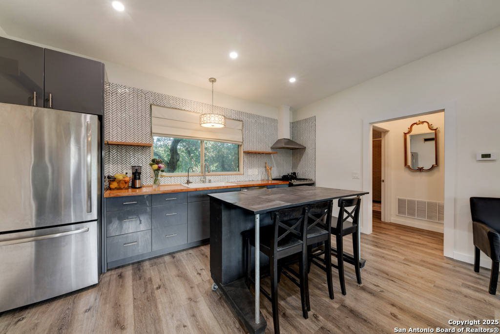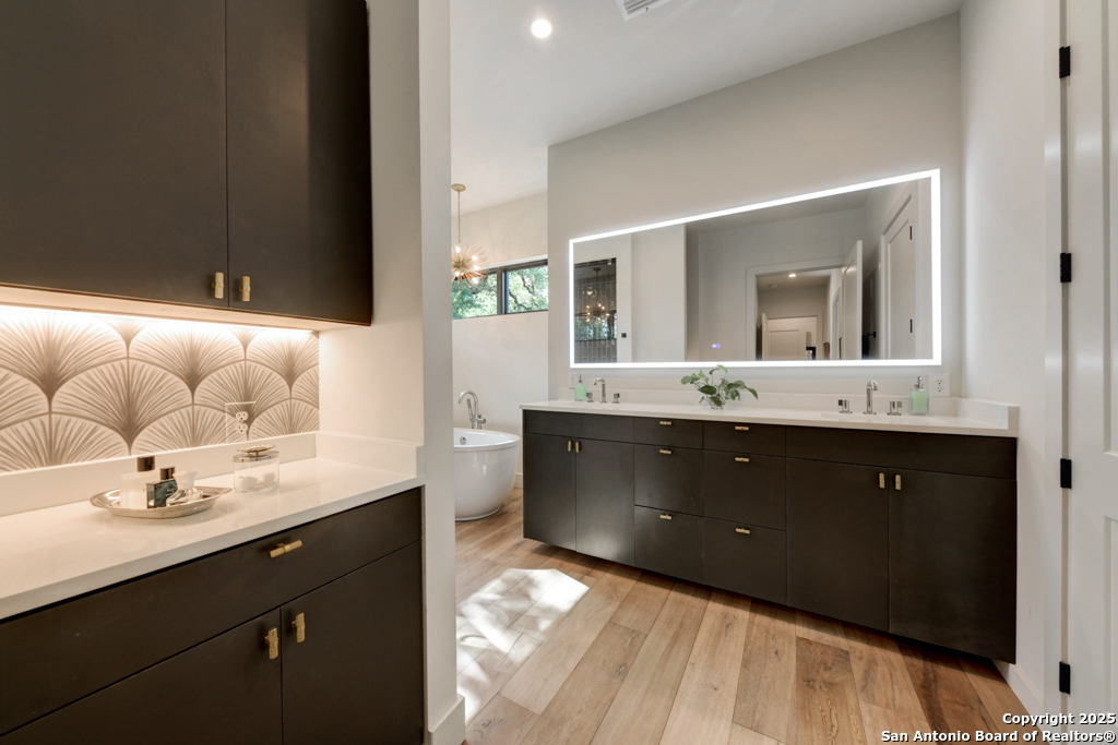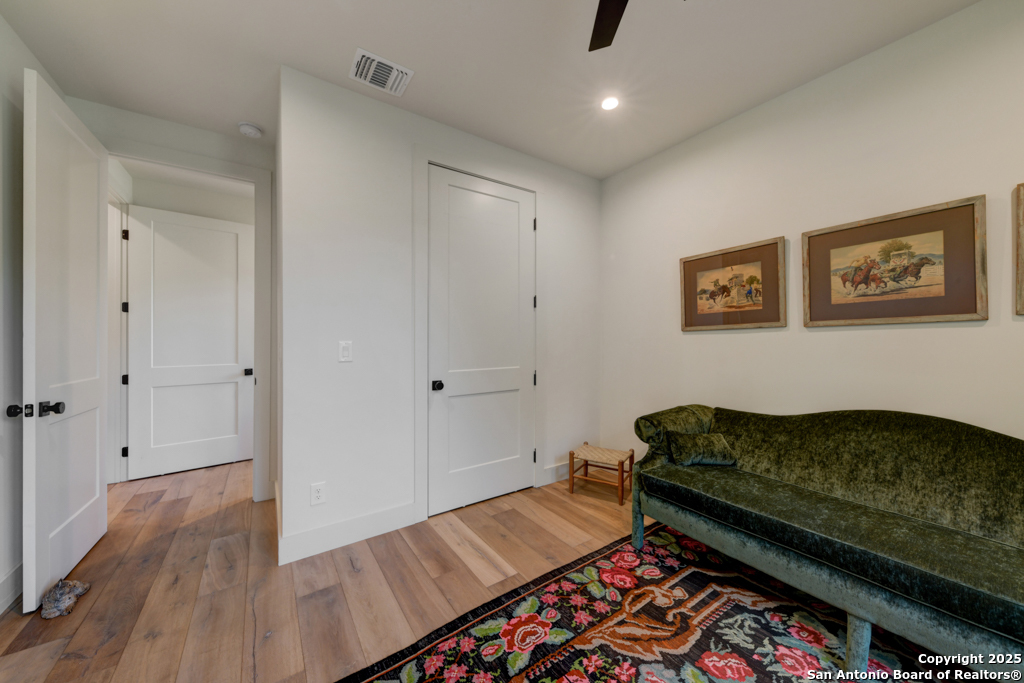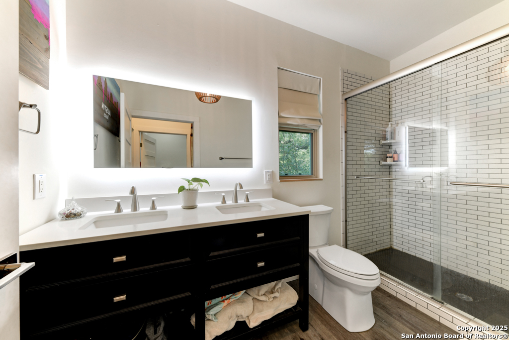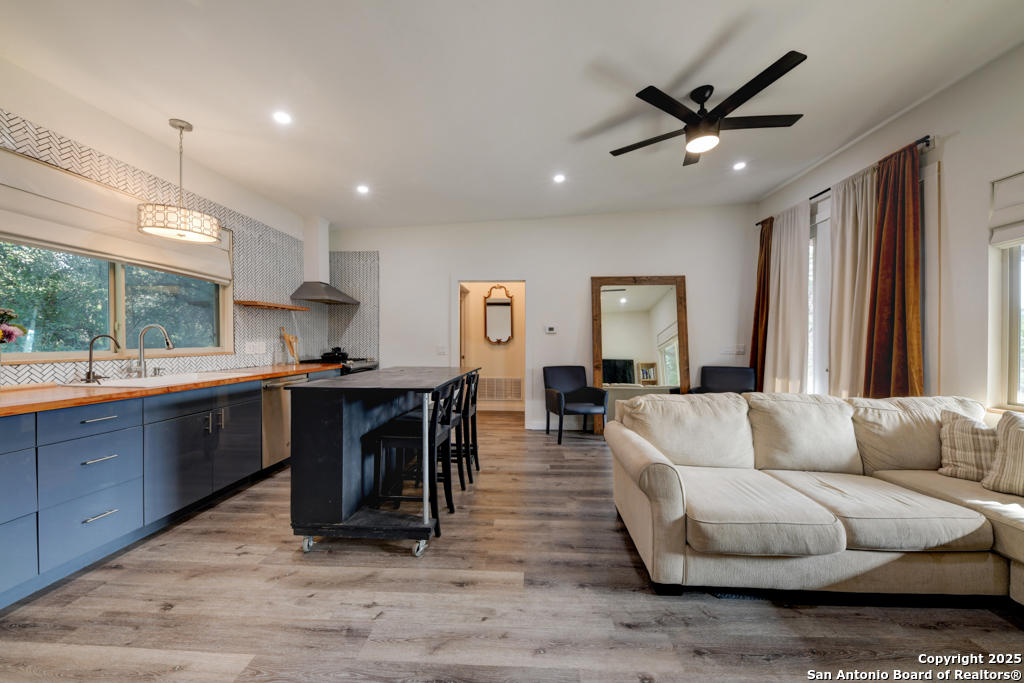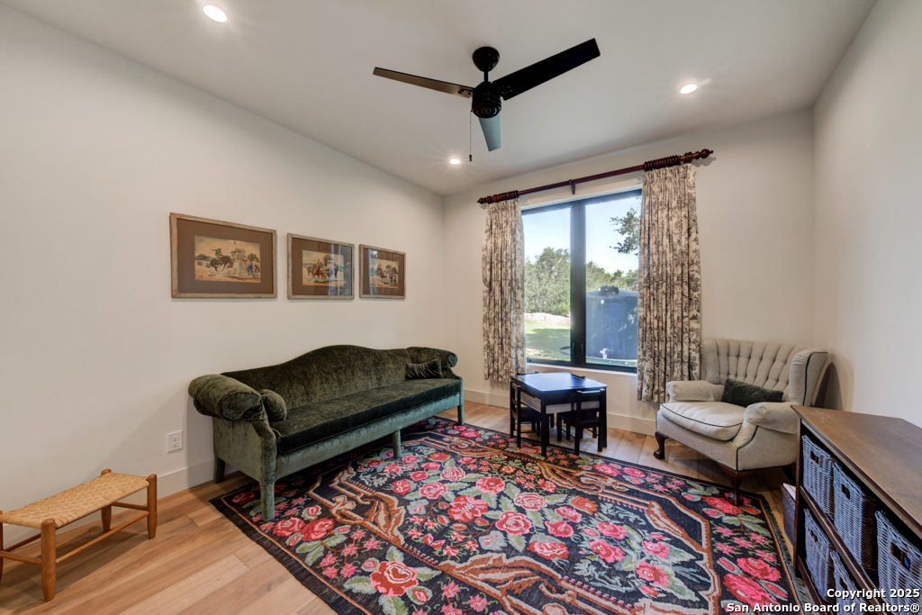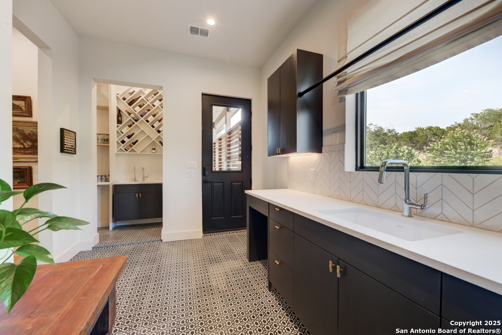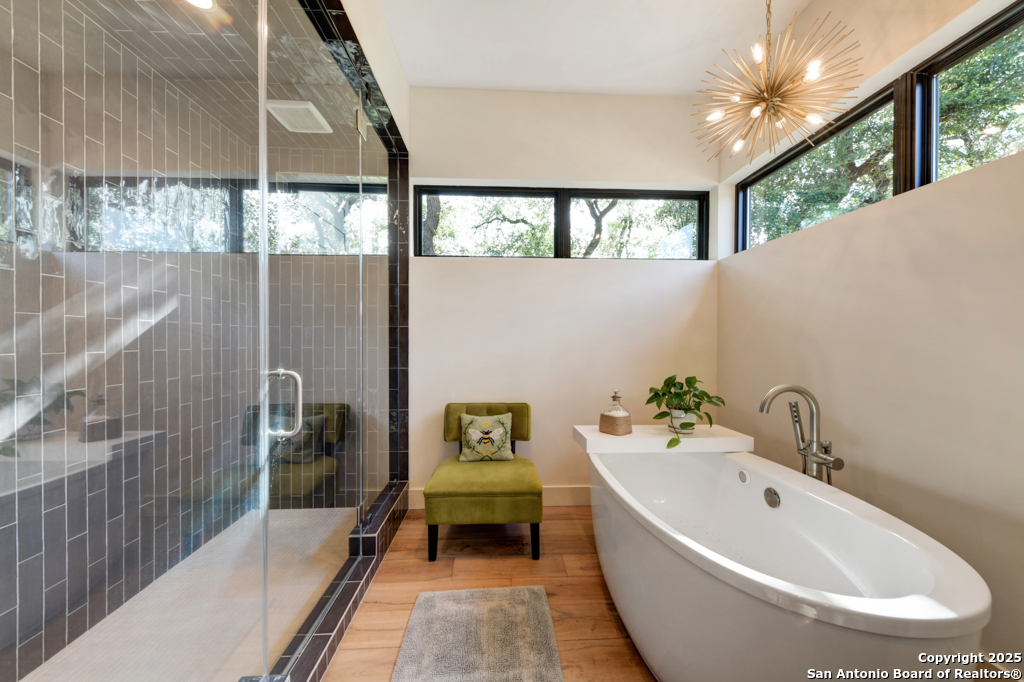 Luxury Hill Country Modern Estate! A masterpiece of design and craftsmanship, this stunning estate sits on nearly 7 acres of oak-studded land, blending luxurious living with serene Texas beauty. Every detail has been thoughtfully curated-from the 3/4-bedroom, 2 1-2 bath main residence to the separate 800 sq ft 2 bedroom 1 bath with full kitchen guest apartment and fully air-conditioned workshop with its own full bath. Inside, soaring 14' ceilings and massive custom windows flood the home with natural light, showcasing exquisite finishes like white oak plank flooring, 8' solid core doors, a vaulted great room with Heatilator fireplace, and a jaw-dropping wine room. The chef's kitchen is a dream: a 10' seamless island, high-end JennAir appliances, dual sinks, custom alder cabinetry, and polished nickel finishes that exude sophistication. Outside, a pivoting custom iron front door sets the tone for architectural excellence. Enjoy evenings on the expansive back porch beneath Douglas Fir beams and LED-lit pine ceilings, cooled by the Big A Fan and views of the stocked tank and surrounding pasture-ideal for horses, livestock, or gardening. Drip irrigation feeds fruit trees, and the red granite driveway adds curb appeal. Additional features include a whole-house water filtration system, sound-dampening insulation, in-house vacuum system, and even a bank vault door near kitchen. Located just minutes from city conveniences yet worlds away, this is a one-of-a-kind retreat where elegance meets functionality and nature. A rare opportunity for modern ranch living at its finest.