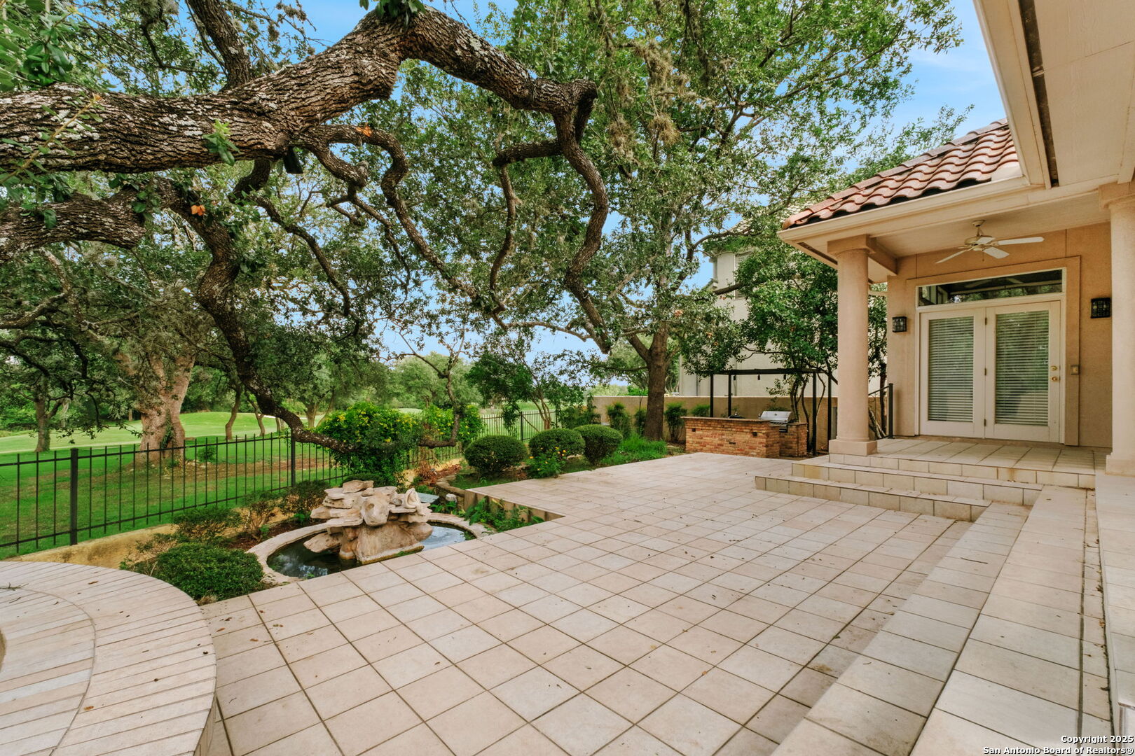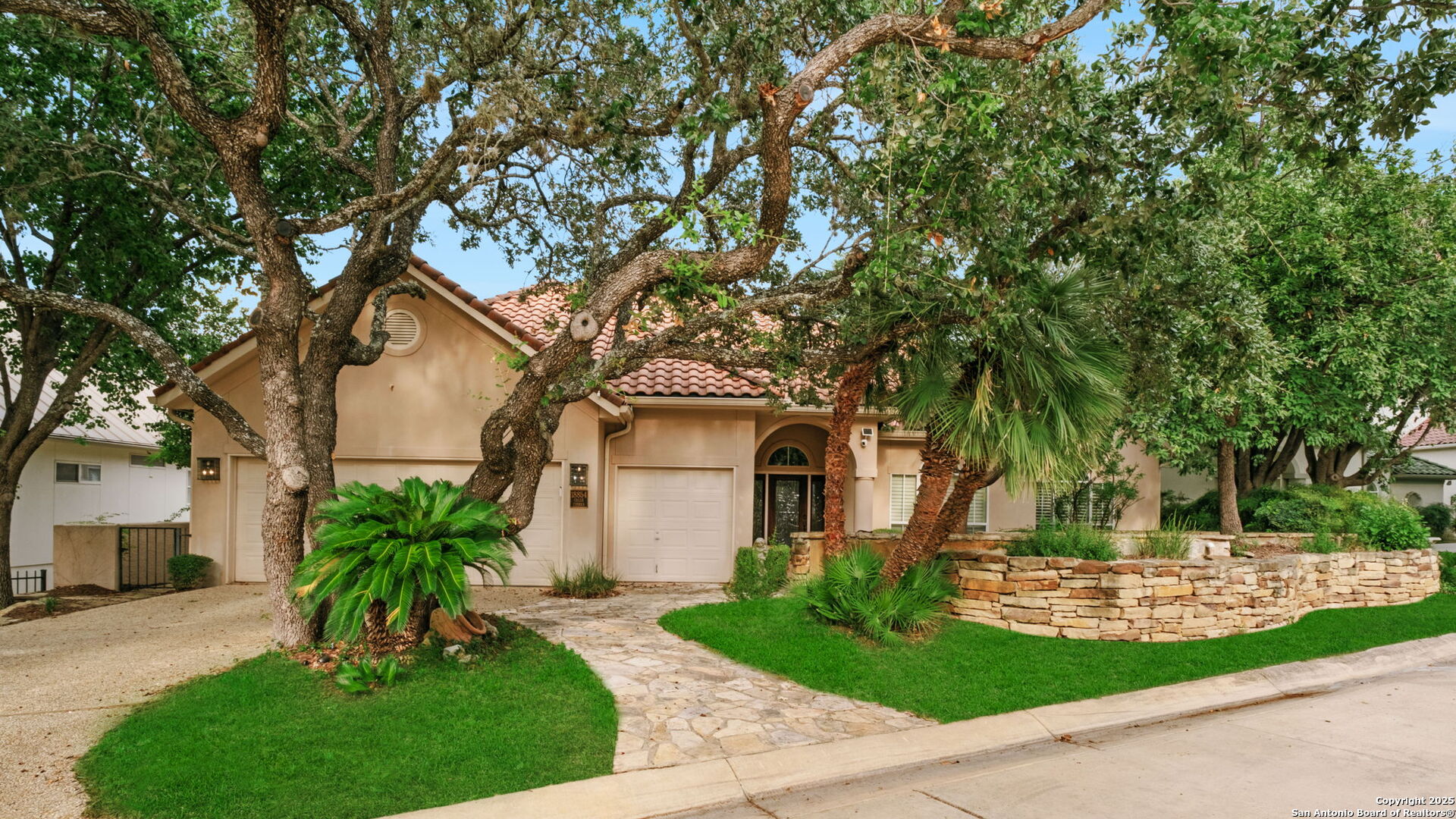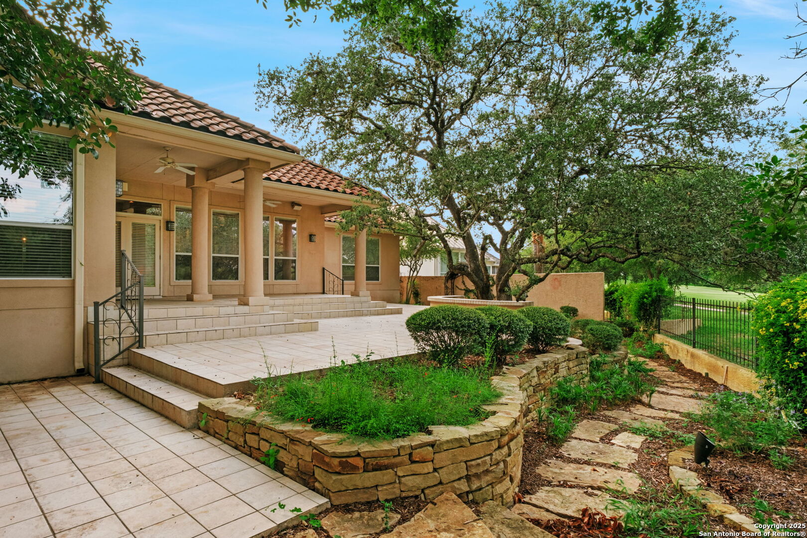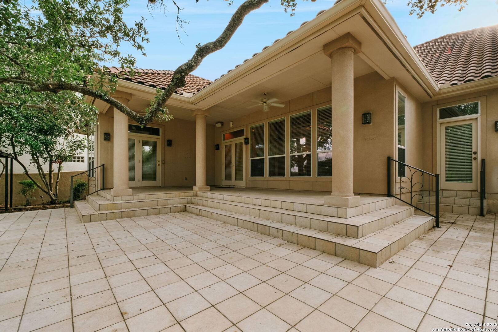 Exquisite single-story residence with 3 bedrooms, 3.5 baths, and over 3,400 sq. ft. in the prestigious gated community of La Cierra at Sonterra. Mediterranean influence paired with thoughtful enhancements throughout creates a warm yet refined atmosphere, highlighted by soaring ceilings, a glass-detailed entry, and an open, flowing floor plan designed for both entertaining and everyday living. The gourmet kitchen offers granite counters, double ovens, and abundant cabinetry, opening seamlessly into the family room with fireplace and custom built-ins. A private study with wood accents enhances functionality, while formal and casual dining areas provide flexibility for gatherings. The serene primary suite features a spa-inspired bath with dual vanities, jetted tub, and glass block shower. Each secondary bedroom offers an en-suite bath, ensuring comfort and privacy. Designed with minimal yard maintenance in mind, the property's outdoor living space includes a tiled terrace shaded by mature trees and overlooking the Sonterra golf course-a tranquil setting for outdoor dining or quiet relaxation. A front water feature, arched windows, and fine millwork further elevate the home's character. Ideally located just north of San Antonio, residents enjoy the exclusivity of Sonterra with close proximity to The Shops at La Cantera, The RIM, and Stone Oak Village, as well as convenient access to major highways. This rare single-level home presents an exceptional opportunity in one of the area's most desirable gated communities.