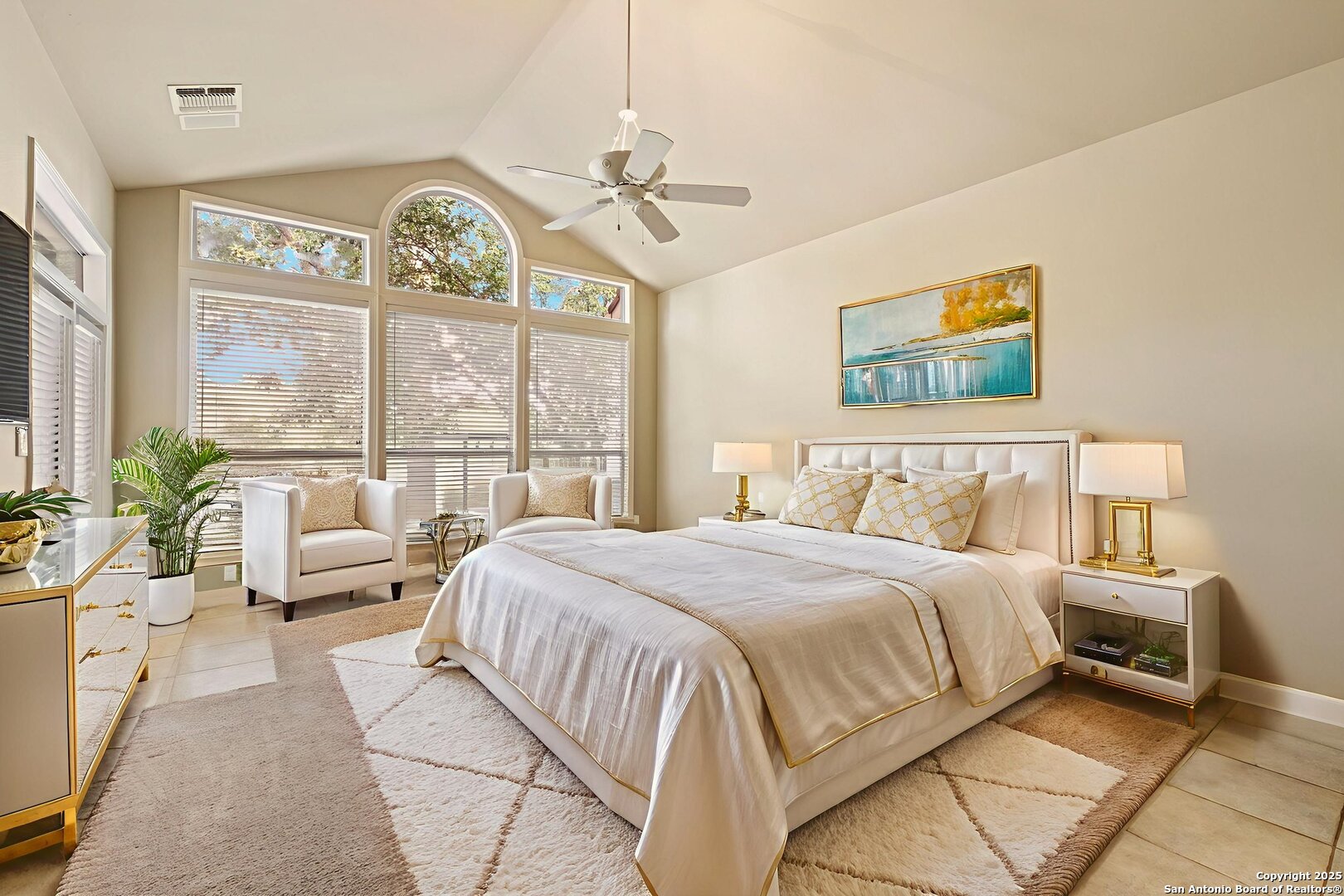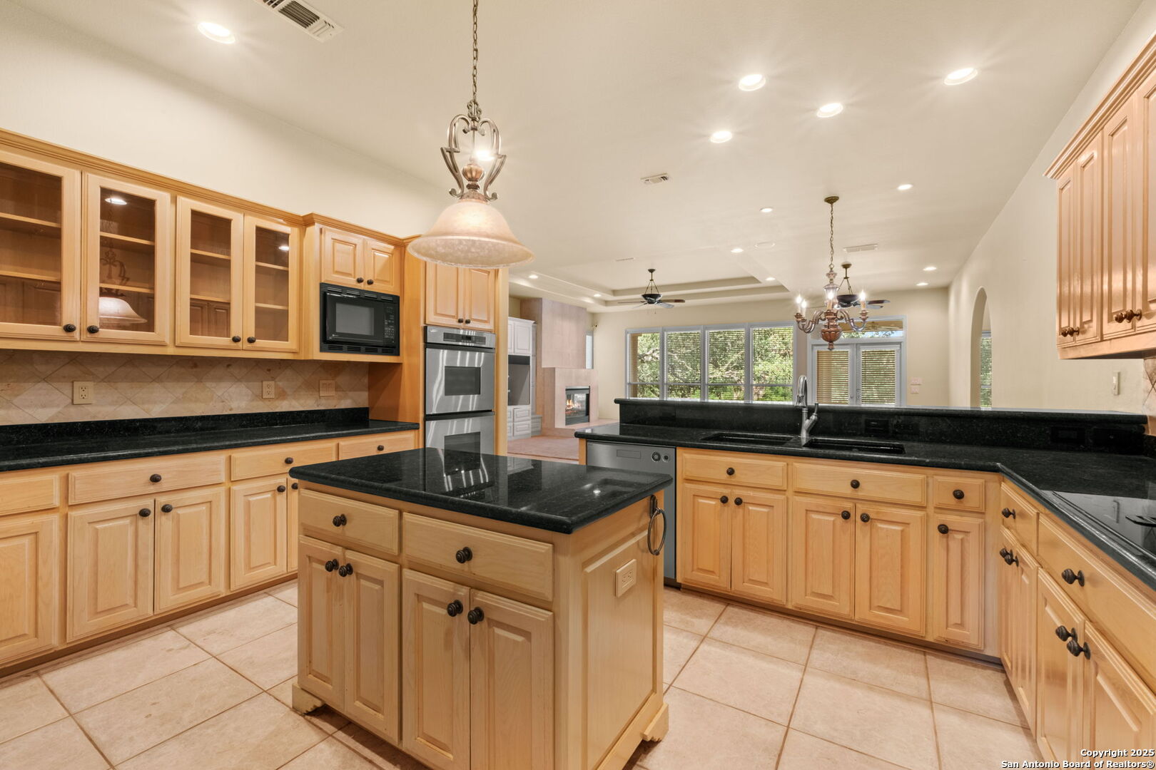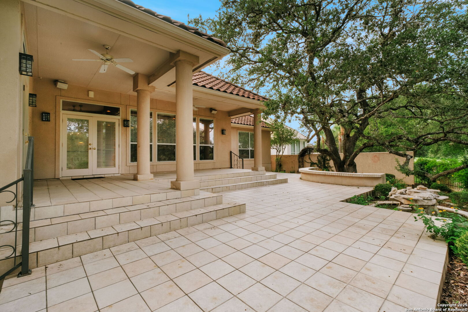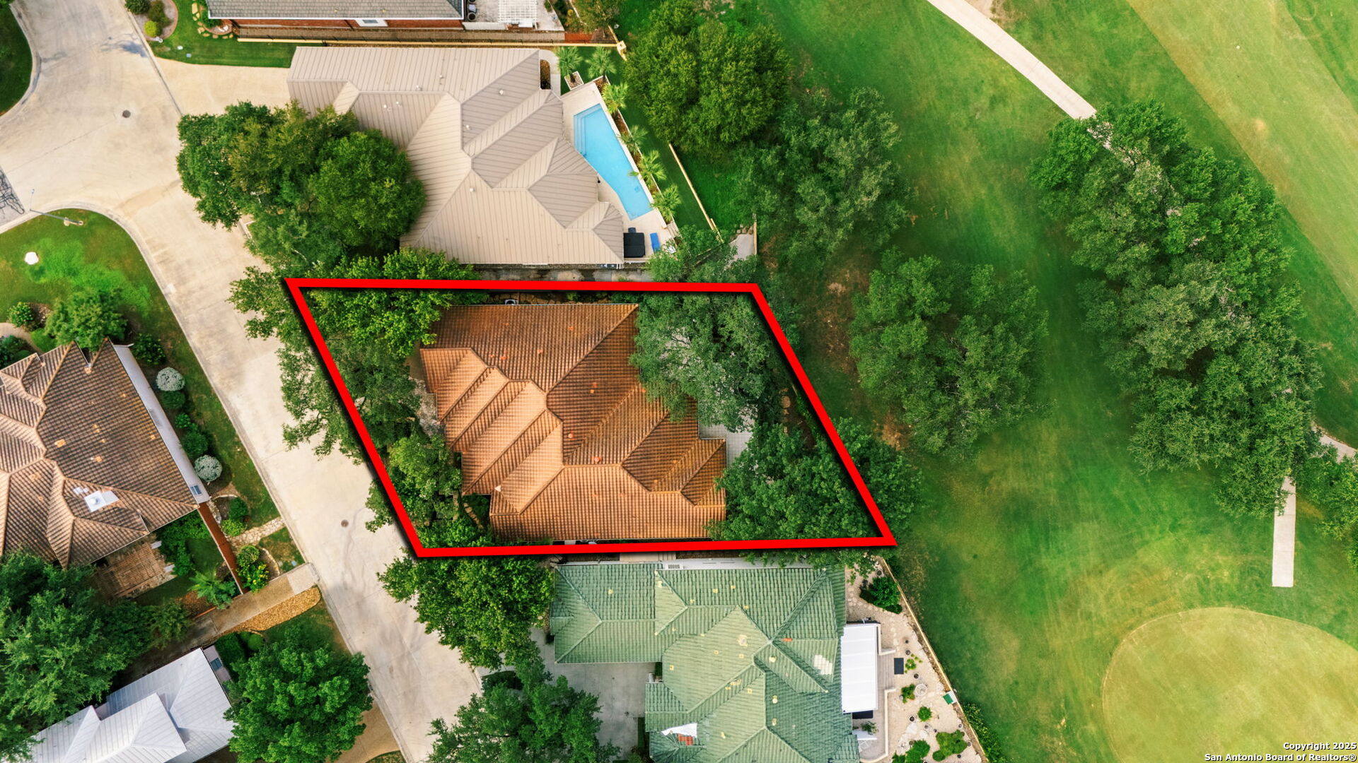 Exquisite single-story residence with 3 bedrooms, 3.5 baths, and over 3,400 sq. ft. in the prestigious gated community of La Cierra at Sonterra. Mediterranean influence paired with thoughtful enhancements throughout creates a warm yet refined atmosphere, highlighted by soaring ceilings, a glass-detailed entry, and an open, flowing floor plan designed for both entertaining and everyday living. The gourmet kitchen offers granite counters, double ovens, and abundant cabinetry, opening seamlessly into the family room with fireplace and custom built-ins. A private study with wood accents enhances functionality, while formal and casual dining areas provide flexibility for gatherings. The serene primary suite features a spa-inspired bath with dual vanities, jetted tub, and glass block shower. Each secondary bedroom offers an en-suite bath, ensuring comfort and privacy. Designed with minimal yard maintenance in mind, the property's outdoor living space includes a tiled terrace shaded by mature trees and overlooking the Sonterra golf course-a tranquil setting for outdoor dining or quiet relaxation. A front water feature, arched windows, and fine millwork further elevate the home's character. Ideally located just north of San Antonio, residents enjoy the exclusivity of Sonterra with close proximity to The Shops at La Cantera, The RIM, and Stone Oak Village, as well as convenient access to major highways. This rare single-level home presents an exceptional opportunity in one of the area's most desirable gated communities.