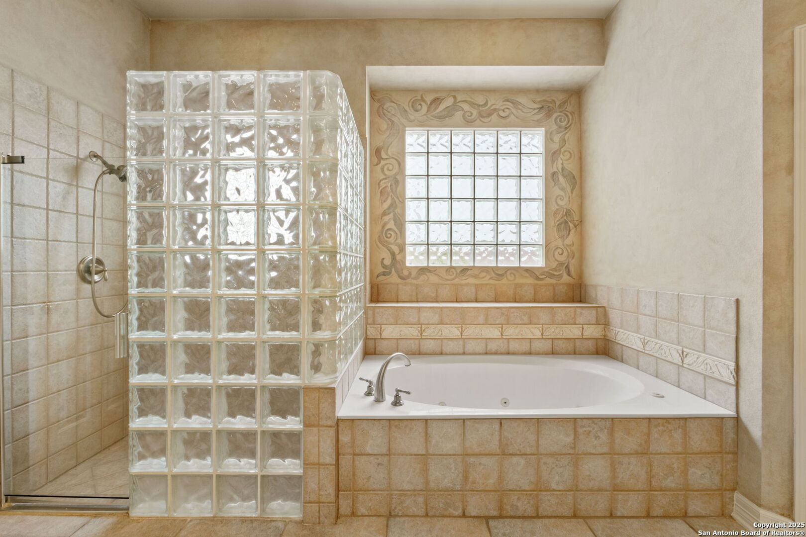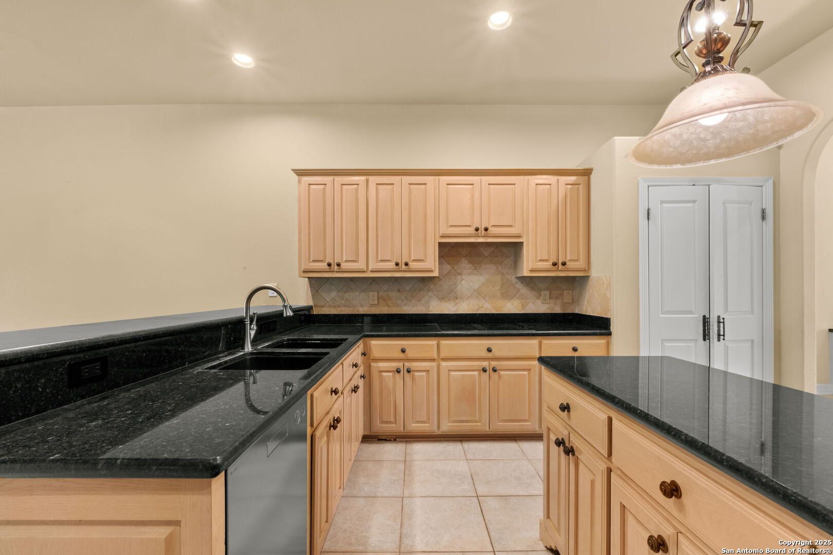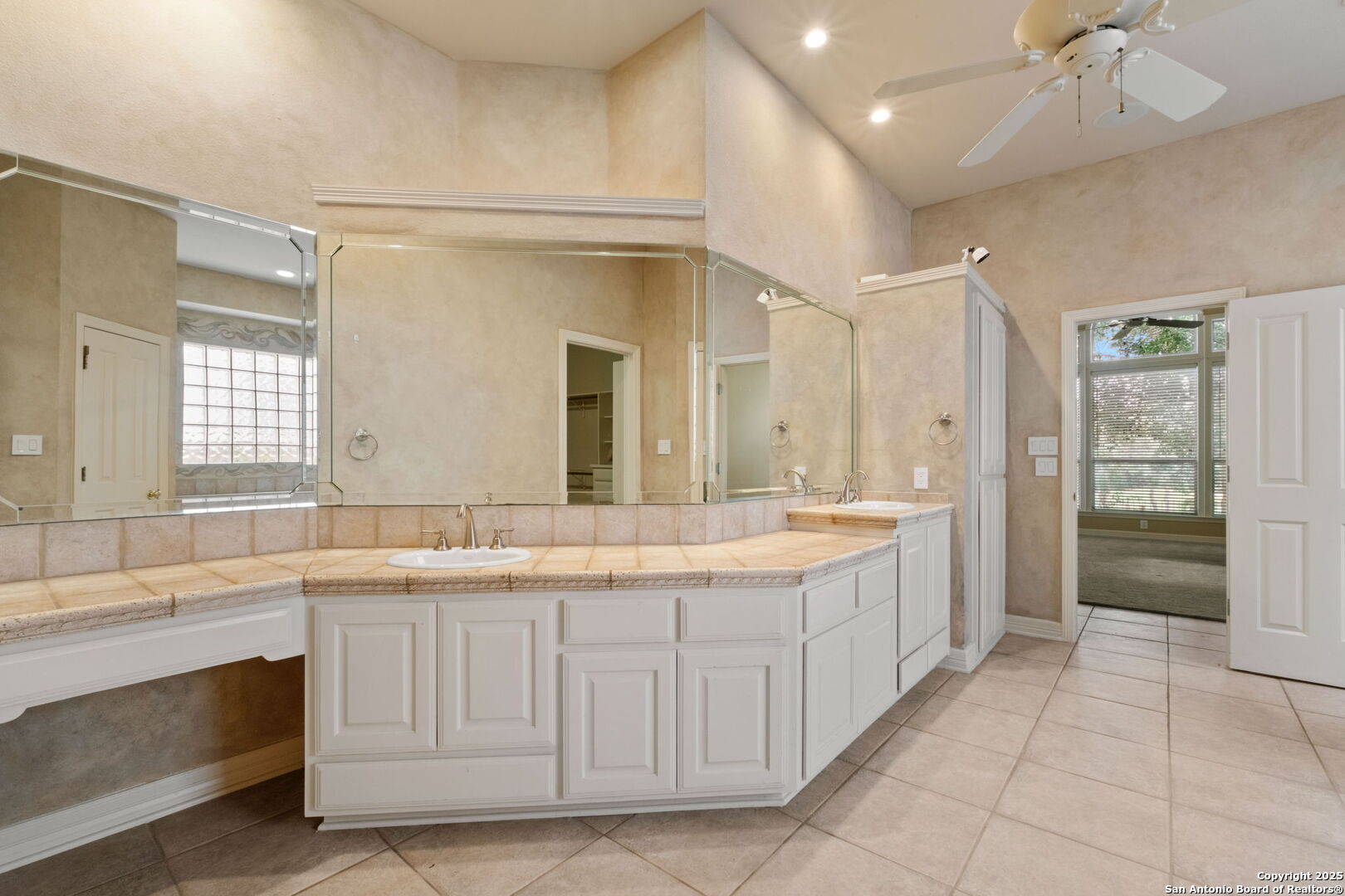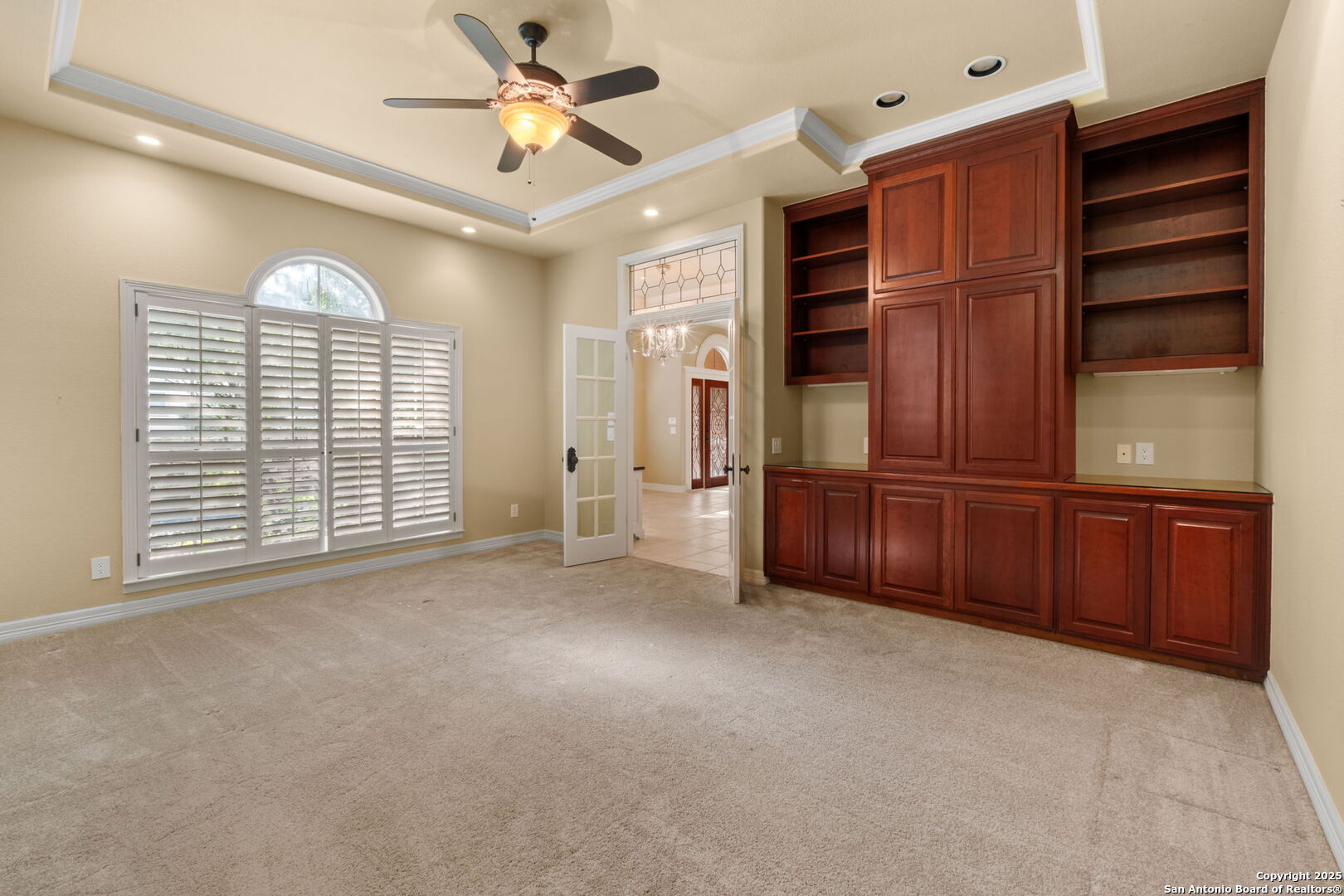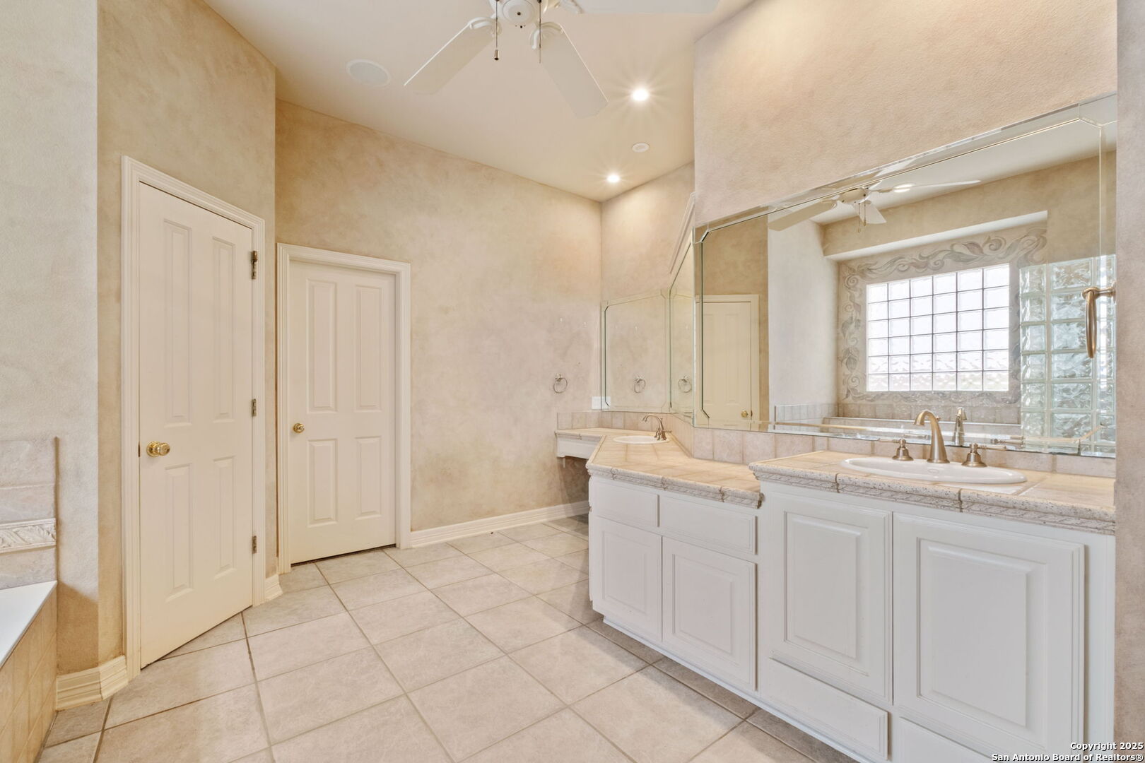 Exquisite single-story residence with 3 bedrooms, 3.5 baths, and over 3,400 sq. ft. in the prestigious gated community of La Cierra at Sonterra. Mediterranean influence paired with thoughtful enhancements throughout creates a warm yet refined atmosphere, highlighted by soaring ceilings, a glass-detailed entry, and an open, flowing floor plan designed for both entertaining and everyday living. The gourmet kitchen offers granite counters, double ovens, and abundant cabinetry, opening seamlessly into the family room with fireplace and custom built-ins. A private study with wood accents enhances functionality, while formal and casual dining areas provide flexibility for gatherings. The serene primary suite features a spa-inspired bath with dual vanities, jetted tub, and glass block shower. Each secondary bedroom offers an en-suite bath, ensuring comfort and privacy. Designed with minimal yard maintenance in mind, the property's outdoor living space includes a tiled terrace shaded by mature trees and overlooking the Sonterra golf course-a tranquil setting for outdoor dining or quiet relaxation. A front water feature, arched windows, and fine millwork further elevate the home's character. Ideally located just north of San Antonio, residents enjoy the exclusivity of Sonterra with close proximity to The Shops at La Cantera, The RIM, and Stone Oak Village, as well as convenient access to major highways. This rare single-level home presents an exceptional opportunity in one of the area's most desirable gated communities.