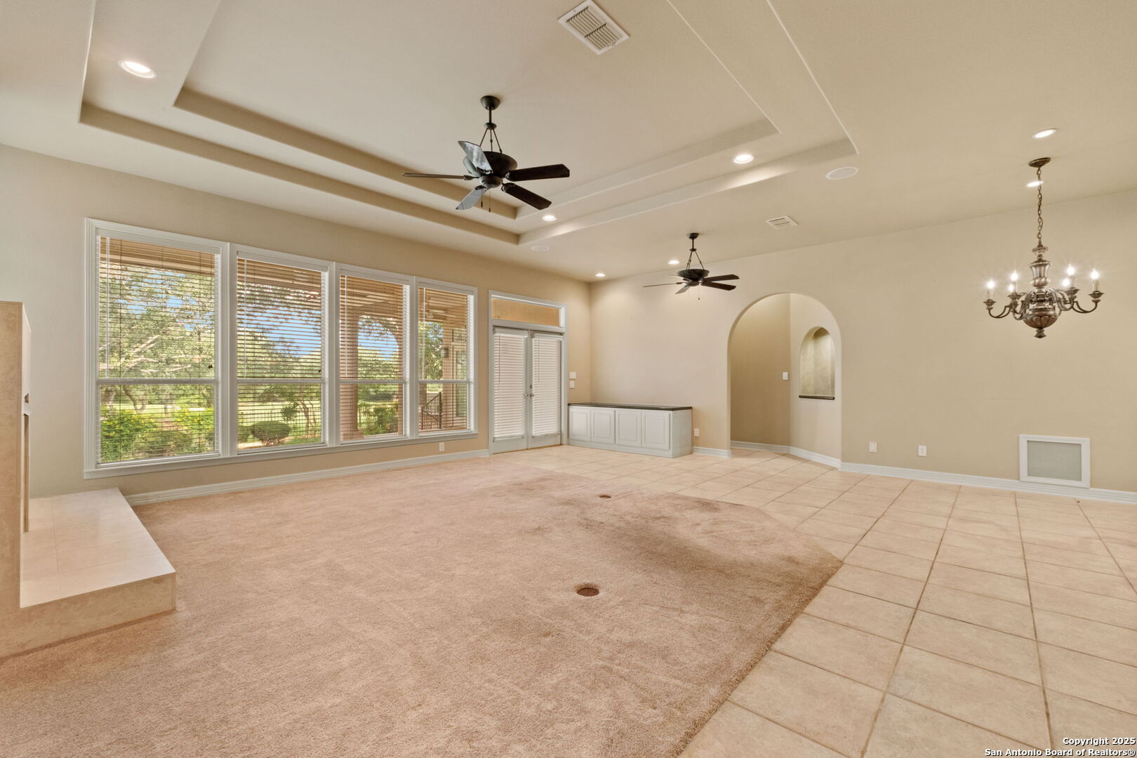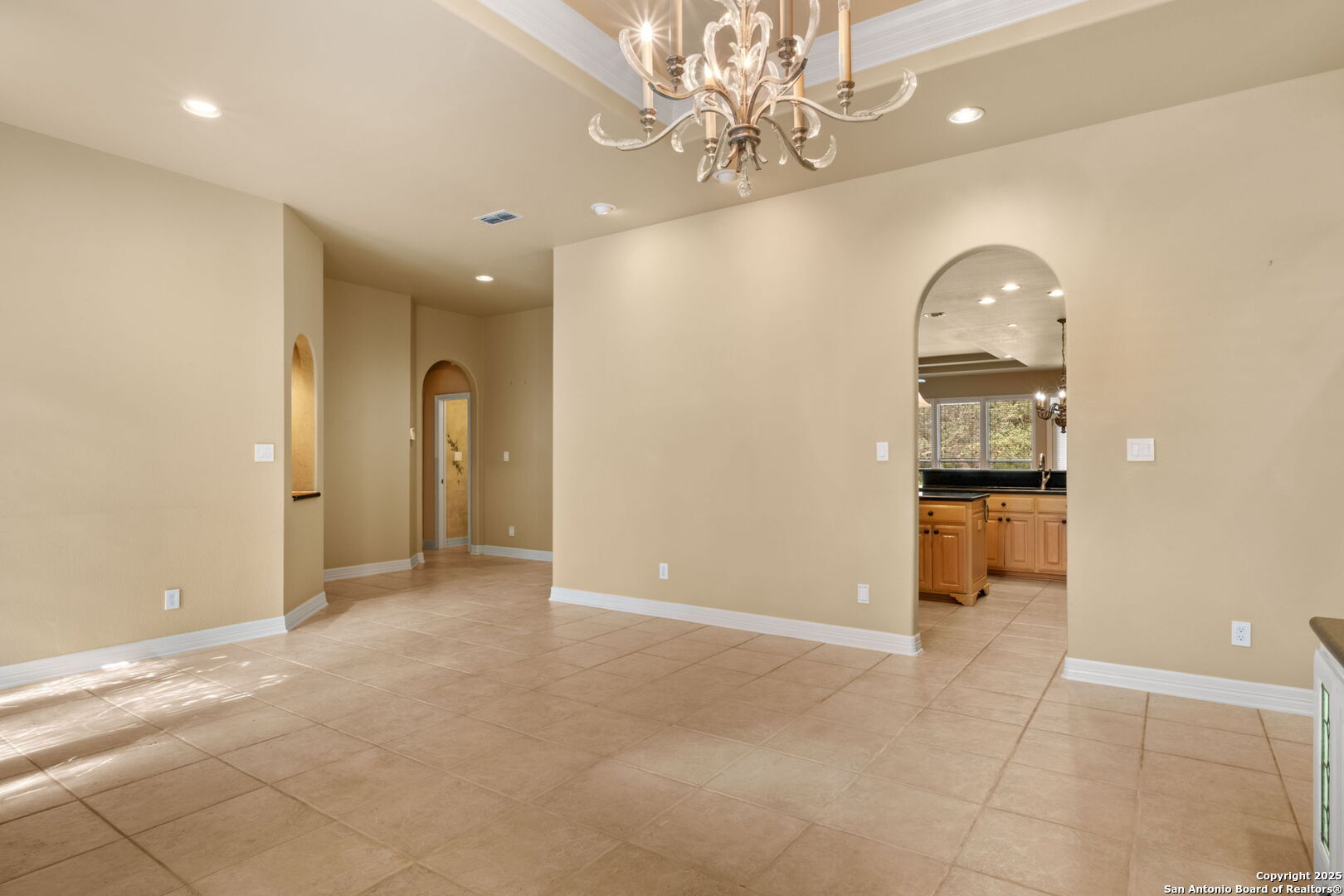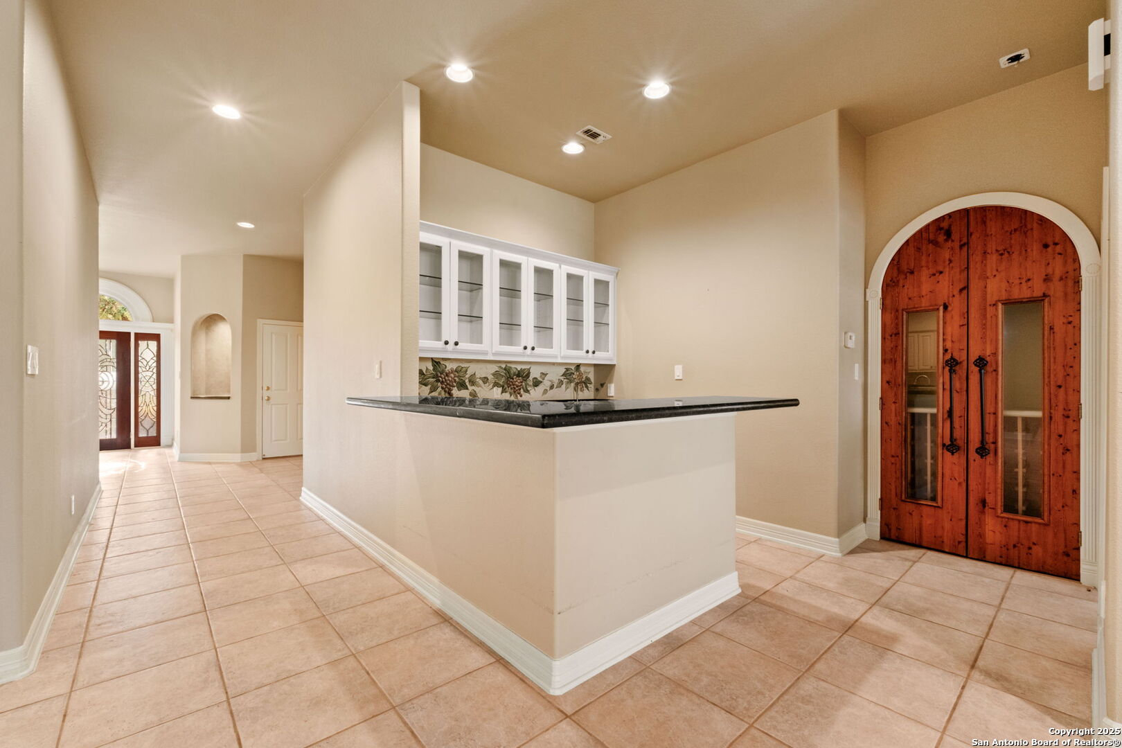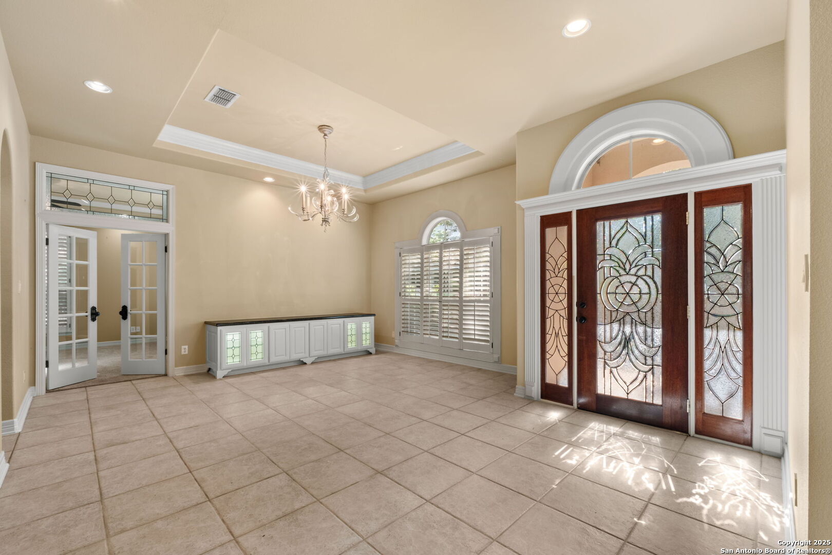 Exquisite single-story residence with 3 bedrooms, 3.5 baths, and over 3,400 sq. ft. in the prestigious gated community of La Cierra at Sonterra. Mediterranean influence paired with thoughtful enhancements throughout creates a warm yet refined atmosphere, highlighted by soaring ceilings, a glass-detailed entry, and an open, flowing floor plan designed for both entertaining and everyday living. The gourmet kitchen offers granite counters, double ovens, and abundant cabinetry, opening seamlessly into the family room with fireplace and custom built-ins. A private study with wood accents enhances functionality, while formal and casual dining areas provide flexibility for gatherings. The serene primary suite features a spa-inspired bath with dual vanities, jetted tub, and glass block shower. Each secondary bedroom offers an en-suite bath, ensuring comfort and privacy. Designed with minimal yard maintenance in mind, the property's outdoor living space includes a tiled terrace shaded by mature trees and overlooking the Sonterra golf course-a tranquil setting for outdoor dining or quiet relaxation. A front water feature, arched windows, and fine millwork further elevate the home's character. Ideally located just north of San Antonio, residents enjoy the exclusivity of Sonterra with close proximity to The Shops at La Cantera, The RIM, and Stone Oak Village, as well as convenient access to major highways. This rare single-level home presents an exceptional opportunity in one of the area's most desirable gated communities.
