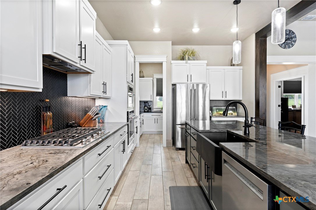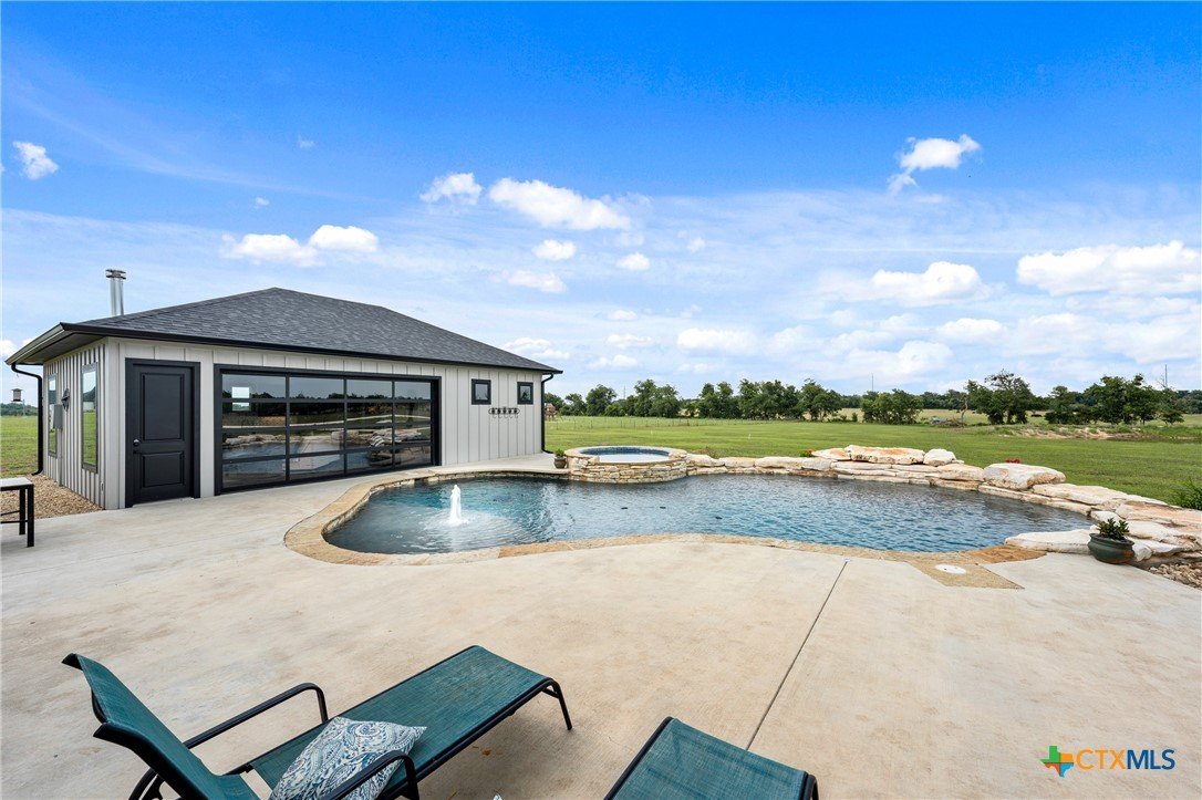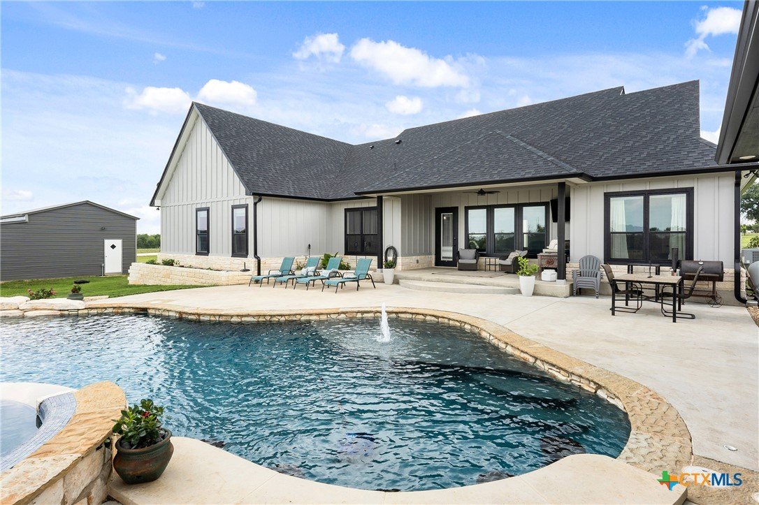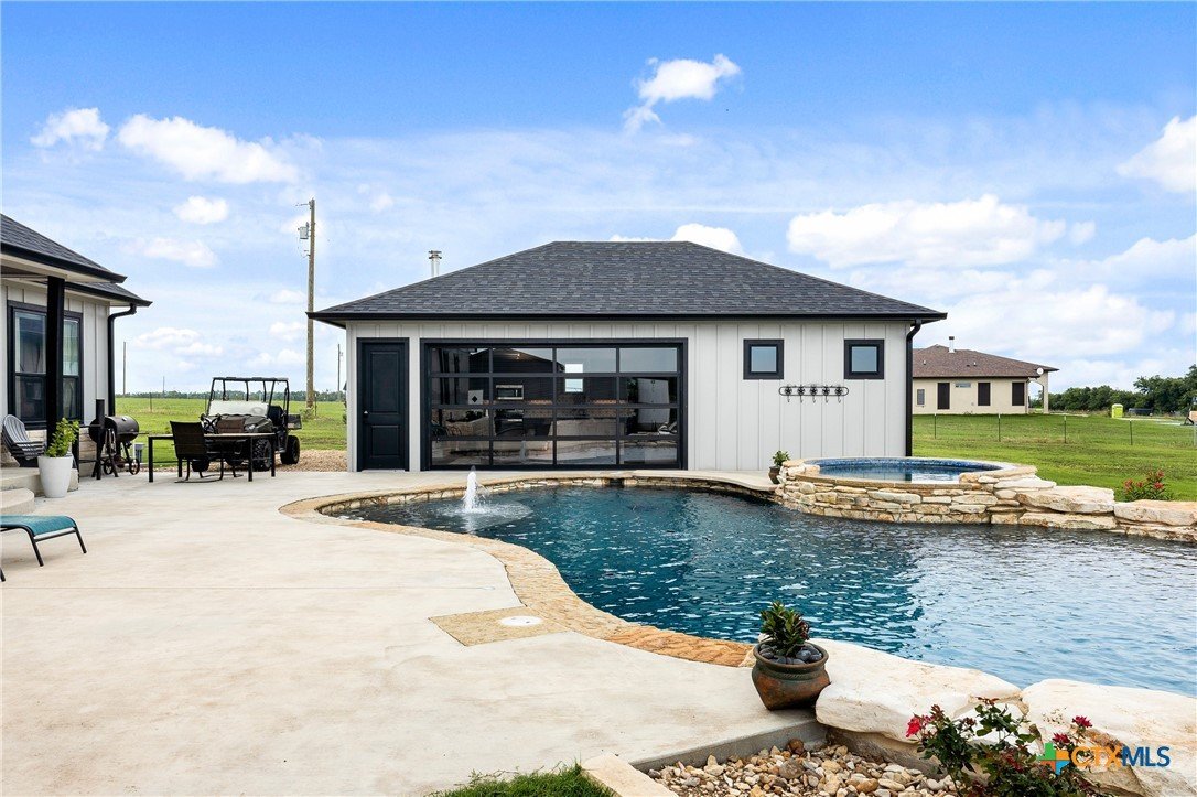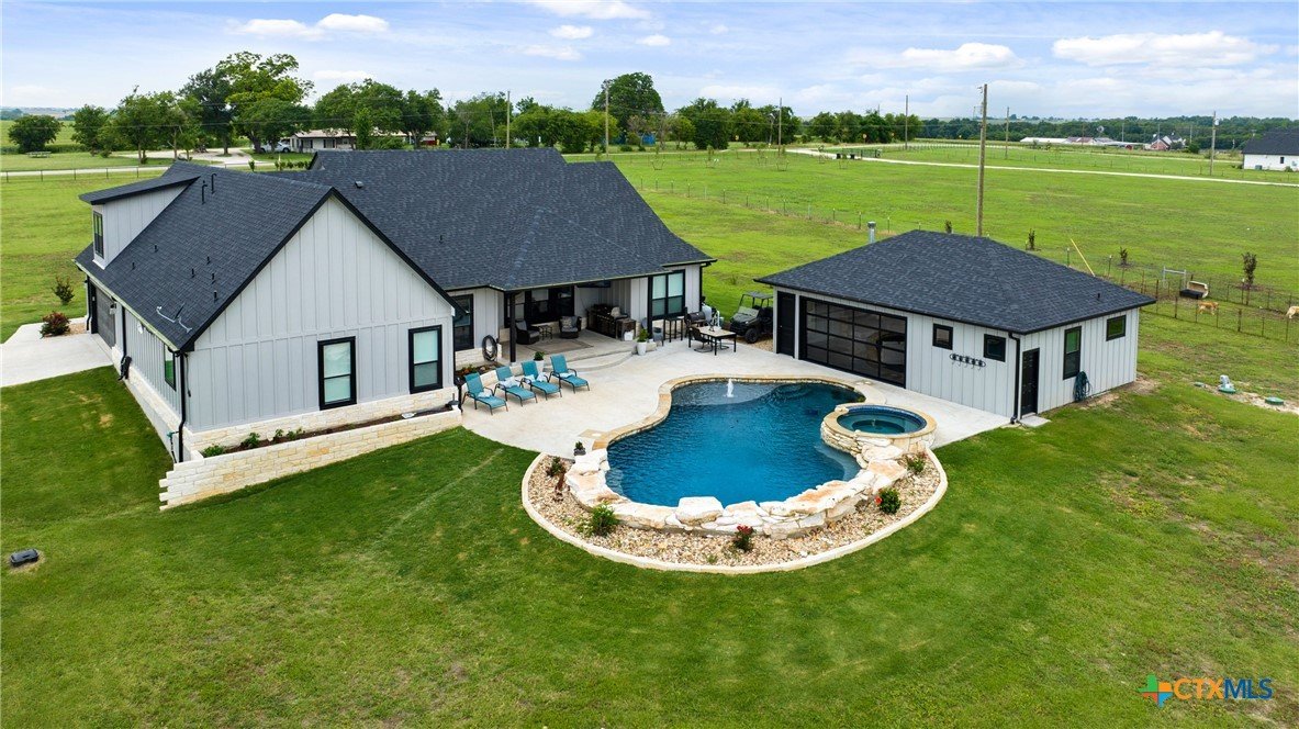 Come see this beautiful gated property on 5 acres! This farmhouse offers 4 bedrooms and 3 baths with a flex room/study. Kitchen is perfect for entertaining with large quartz waterfall island, gas cooktop, and grand butler's panty. Step outside into your private oasis, where endless entertainment options await. A shimmering pool with an accompanying spa beckons for refreshing dips on warm summer days. The pool house complete with a bedroom, kitchen, full bath, and washer/dryer connections, offers a perfect retreat for guests or a peaceful escape from the main home. On top of this there is a metal building which is 18x25 on inside with a 12X25 overhang barn/workshop for all you hobbies. Main house is approx 2968 sqft. Pool house is approx 875 soft. Buyer to verify all square footage.