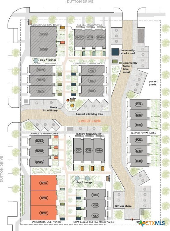 Reach out to walk through a furnished unit with us today! Finished interior photos coming soon. Lively Lane is a pocket neighborhood of contemporary townhomes located in the heart of San Marcos. Its convenient location makes it possible to own a new home in town and not miles away from the city center. High quality standard specifications and professionally managed condominium association support lock-and-leave convenience for a modern lifestyle. New homes completed in 2025 at Lively Lane are Energy Star®, EPA Indoor AirPlus, and Department of Energy Zero Energy Home Ready (ZERH) rated. The neighborhood is near a multitude of walkable services and even more essential destinations by bike. That means that sustainability comes standard, and - for those that want to do more - add-ons are available including solar packages, solar carport, and electric vehicle chargers. Other standard features include interior finishes like hardwood flooring, quartz kitchen and bath countertops, vaulted top floor ceilings, Daikin Smart Thermostats, GE and GE Profile appliances with induction range included, heat-pump air conditioning and water heaters, Pella casement windows, advanced framing techniques, native landscaping, a permeable paver system, and so much more. Lively Lane has also partnered with a neighborhood exclusive carshare service, available to residents and guests. The Innovative Live-Work is for those that embody entrepreneurship. A neighborhood storefront along the streetscape provides a customizable ground floor commercial space ready to serve as a professional office, workshop, studio, shop, or gallery. Above, the home features an open living plan complete with two beds, two baths, and two bonus storage lofts with a private, fenced rear garden, a storage/bike shed, and a welcoming planter at the shop front. Whether you’re a small-business owner, entrepreneur, WFH-pro, or ADU-lover, the Innovative Live-Work fits many circumstances and can adapt to your needs over time.