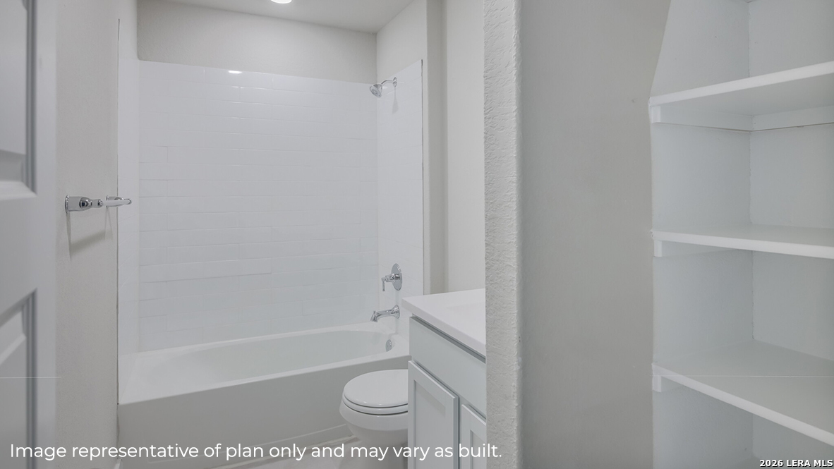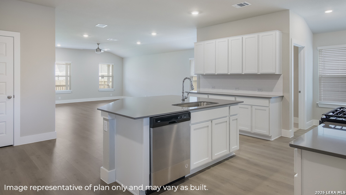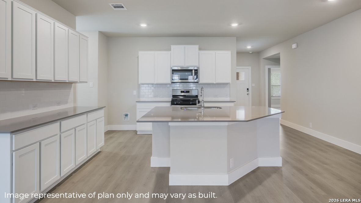 Step into The Kingston floor plan at Veranda located in San Antonio, TX, a single story home offering 4 bedrooms and 2 bathrooms. This home also features 2 classic front exteriors, a 2-car garage and 2024 square feet of comfortable living. The Kingston features and open-concept layout that blends together to form the perfect space for everyday living. An inviting foyer welcomes you into the kitchen, complete with a natural gas cooking range, stainless steel appliances, subjway tile backsplash, quartz or granite countertops and shaker style cabinets. The kitchen island faces the dining area and living room and offers a deep, single bowl sink and extra countertop space, perfect for bar seating. The private main bedroom suite is located off the living room towards the back of the home and features quality carpet, large windows and a ceiling fan. Your connected bathroom is an oasis, complete with dual vanity sinks, quartz or granite countertops, a tiled walk-in shower, shaker style cabinets and a separate room for the toilet. You'll have all the space you need to get ready in the morning with a large walk-in closet. You'll find quality carpet and closets in all of your secondary bedrooms, which can also be used as offices, play rooms or other bonus rooms. Head out the back door located off the living room to find the rear covered patio (per plan) and full yard landscaping & irrigation. Additional features of The Kingston include hard surface flooring at entry, downstairs, halls, living room, kitchen, and dining/breakfast area and pre-plumb for water softener loop and faux wood window blinds throughout the home. This home also includes our HOME IS CONNECTED base package. Using one central hub that talks to all the devices in your home, you can control the lights, thermostat and locks, all from your cellular device.