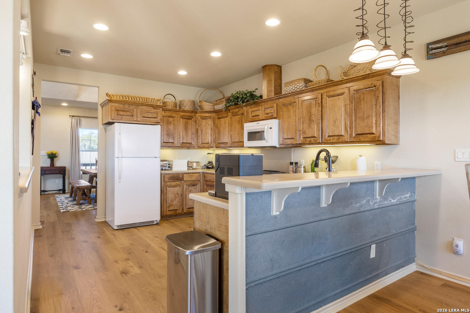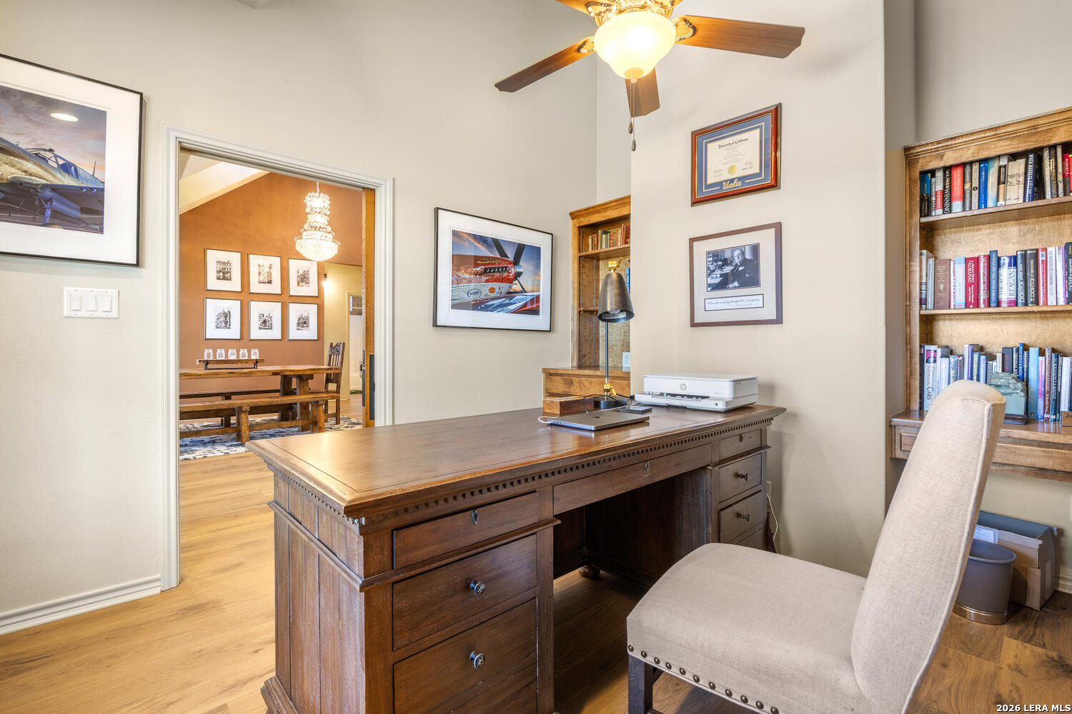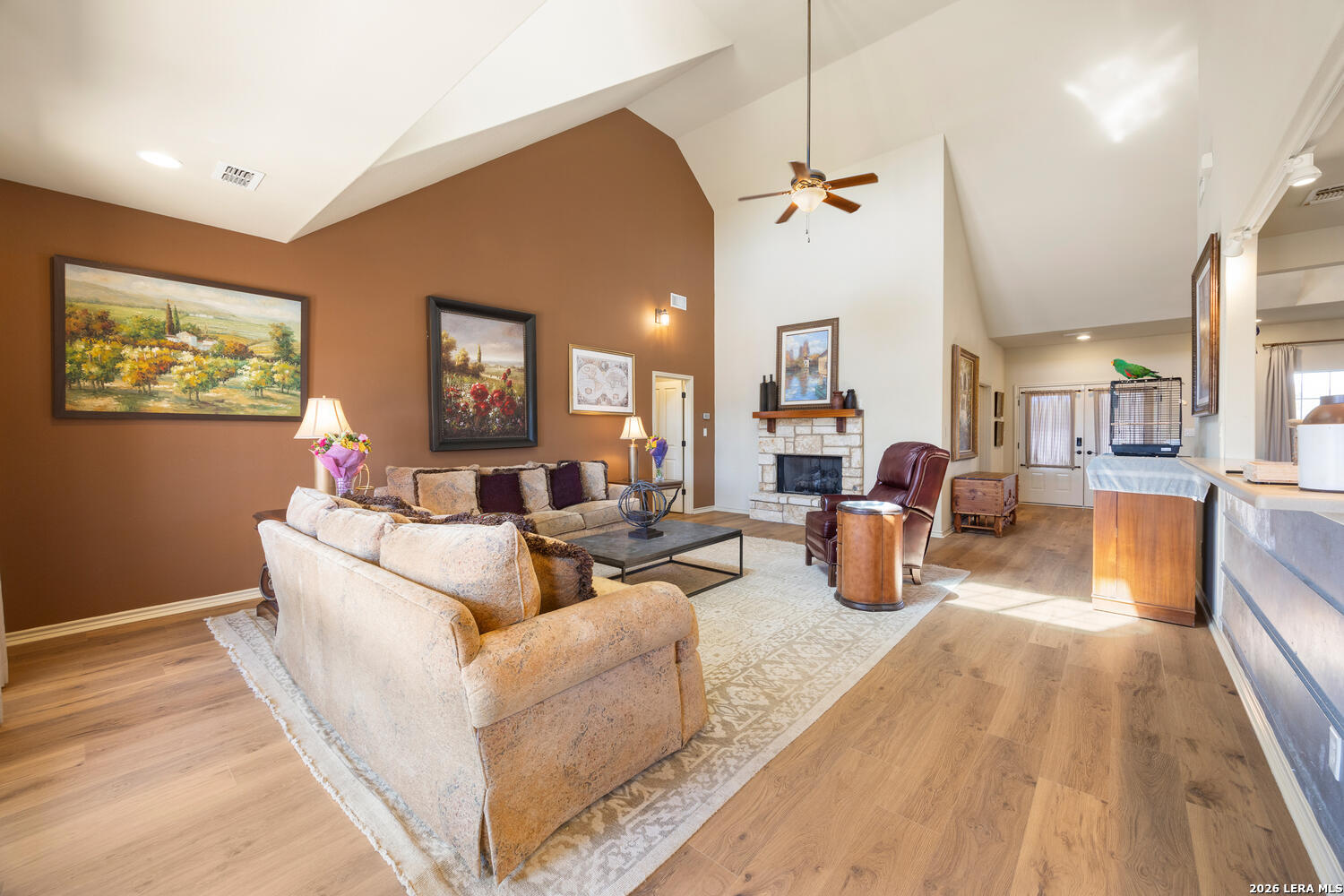Discover peaceful Hill Country living in this beautifully maintained home on 1.15 private acres, thoughtfully cut from a larger tract. so the property feels wonderfully open and secluded-far more expansive than its size suggests. Located just 3 miles from the Historic Blanco Courthouse and charming Blanco Square, this home sits in the heart of some of the most desirable Hill Country communities, with quick access to Wimberley, Johnson City, Henly, and Dripping Springs. Scenic drives, rolling countryside, and endless local attractions surround you. Inside, the home shines with brand-new laminate wood flooring throughout the home. High ceilings and an open flow create an inviting space for entertaining. The floor plan is ideal: the primary suite is privately situated on one side of the home, while the two secondary bedrooms are on the opposite side, and a spacious study with built-in cabinetry sits near the entry, offering the perfect work-from-home or hobby space. Every room feels airy and filled with natural light. Car lovers, boat owners, and hobbyists will appreciate the extra-deep 800 sq. ft. garage, designed to accommodate large vehicles. This is a perfect place to park your RV while not traveling. Enjoy Hill Country mornings and evenings from the covered front and back porches, perfect for sunrises, sunsets, or stargazing under Blanco's famously dark skies. This is a wonderful setting for families, retirees, or anyone craving a slower pace and a peaceful retreat from the city.