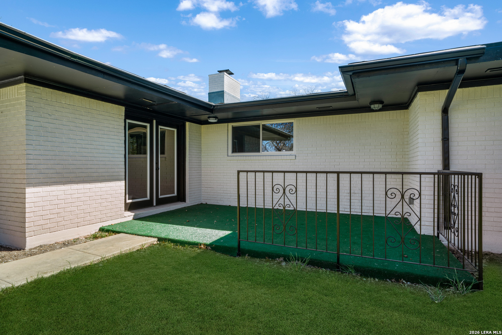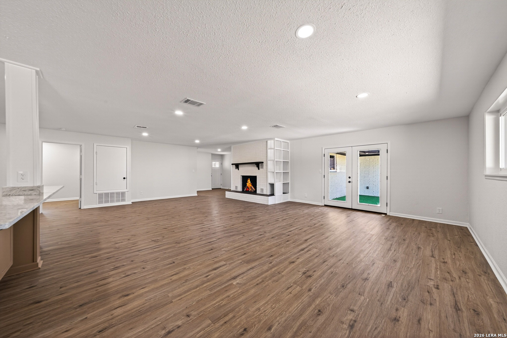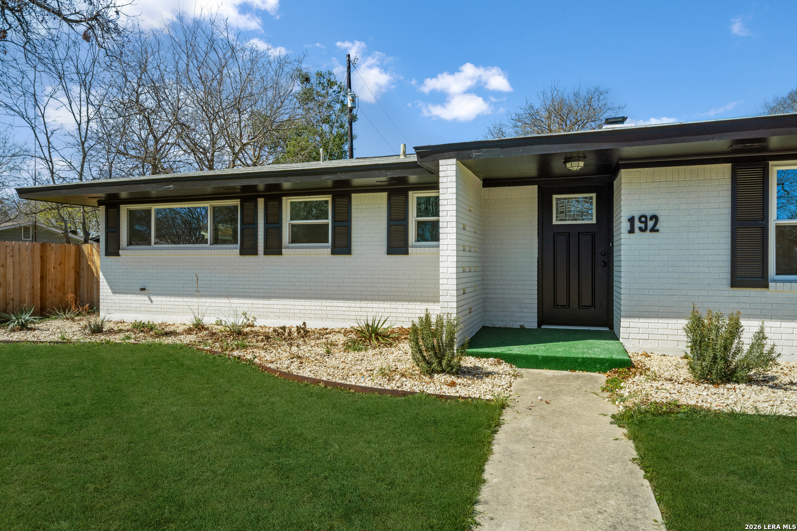 This fully renovated single-story Mid-Century Modern home offers a rare combination of thoughtful design, expanded living space, and exceptional lot size. Situated on a corner double lot, the property provides ample room for future improvements such as a pool, second garage, workshop, or casita, while still maintaining strong curb appeal and privacy. Inside, the open-concept layout is bright and functional, anchored by a modern kitchen with an oversized island that opens directly to the main living area and wood-burning fireplace. The home features five bedrooms, allowing flexibility to use one as a private office. The primary bedroom is set apart from the additional bedrooms, creating a comfortable sense of separation within the layout. The home includes three full bathrooms, all finished with modern design elements. One of the secondary bedrooms features its own private bathroom, making it well suited for overnight guests. In addition to the garage there are two distinct storage or work areas for added functionality. The backyard is enclosed with new privacy fencing, complemented by tall chain-link fencing along the perimeter. Double gate access provides flexibility for future driveway use or backyard access. Mature oak trees shade the yard, emphasizing the size, usability, and potential of this rare double-lot setting. This home is just minutes from downtown New Braunfels, shopping, dining, and just a few blocks from Lake Dunlap