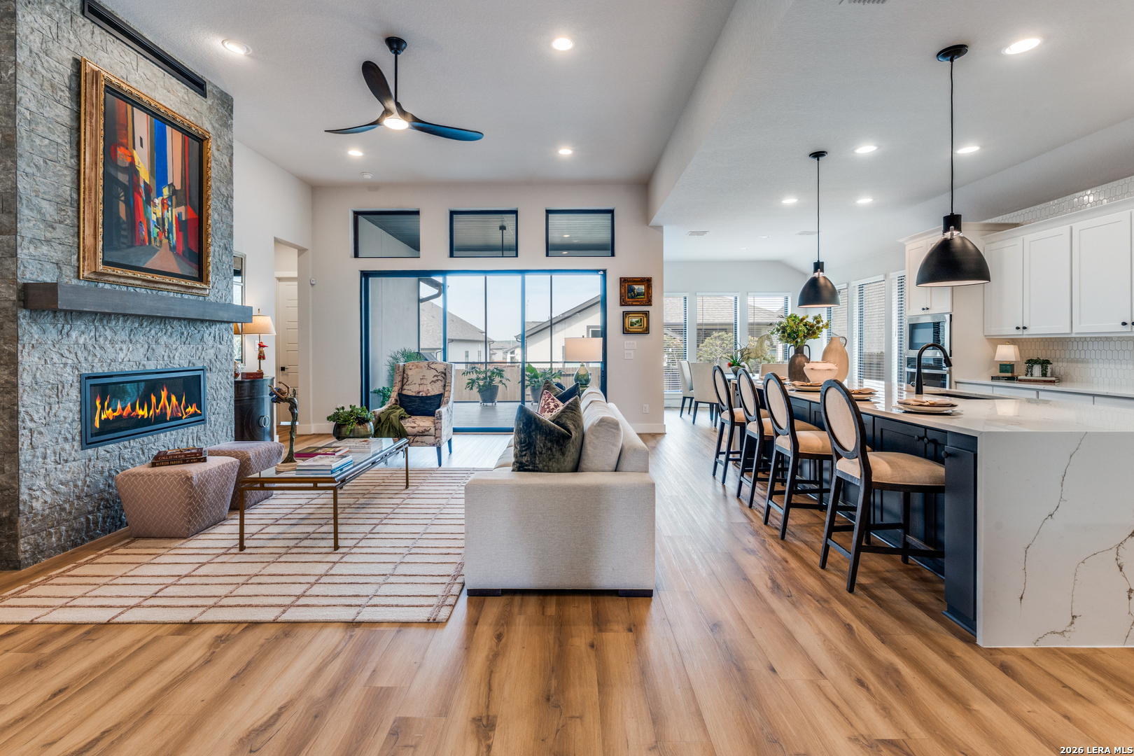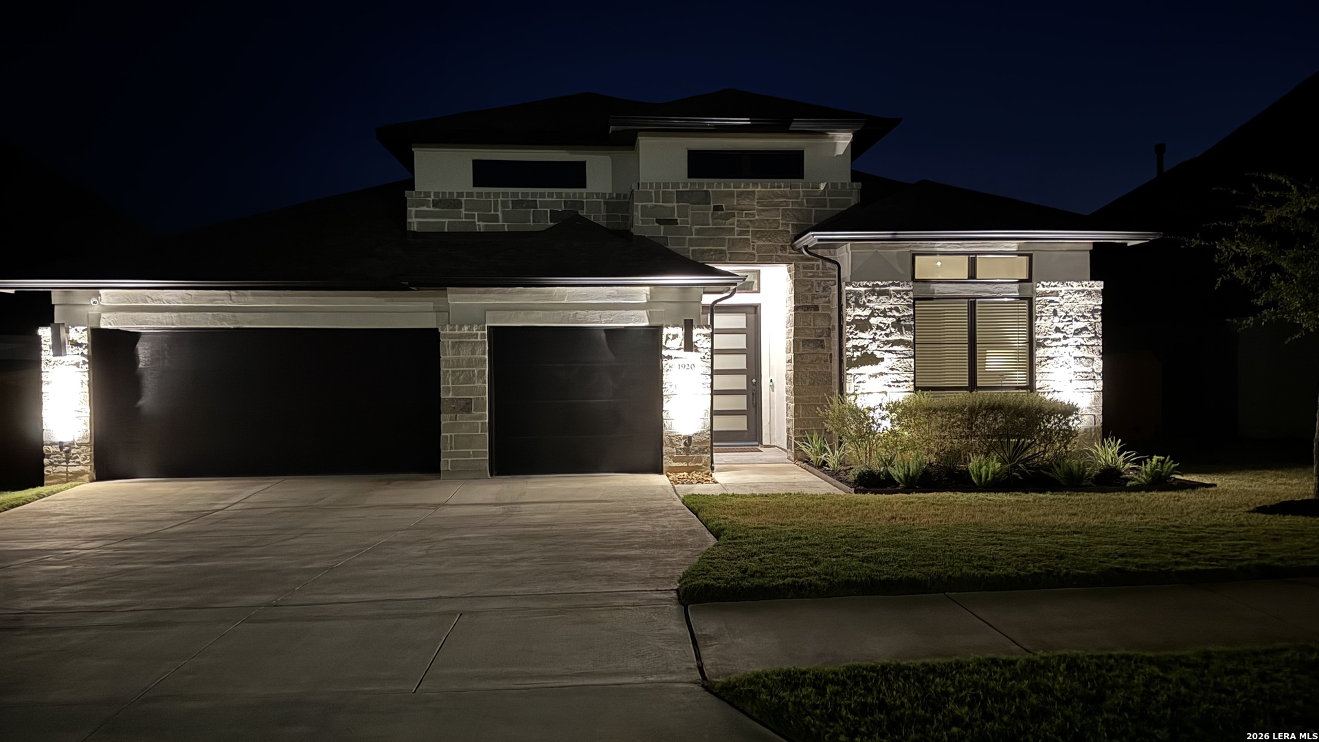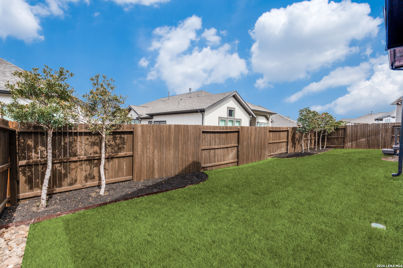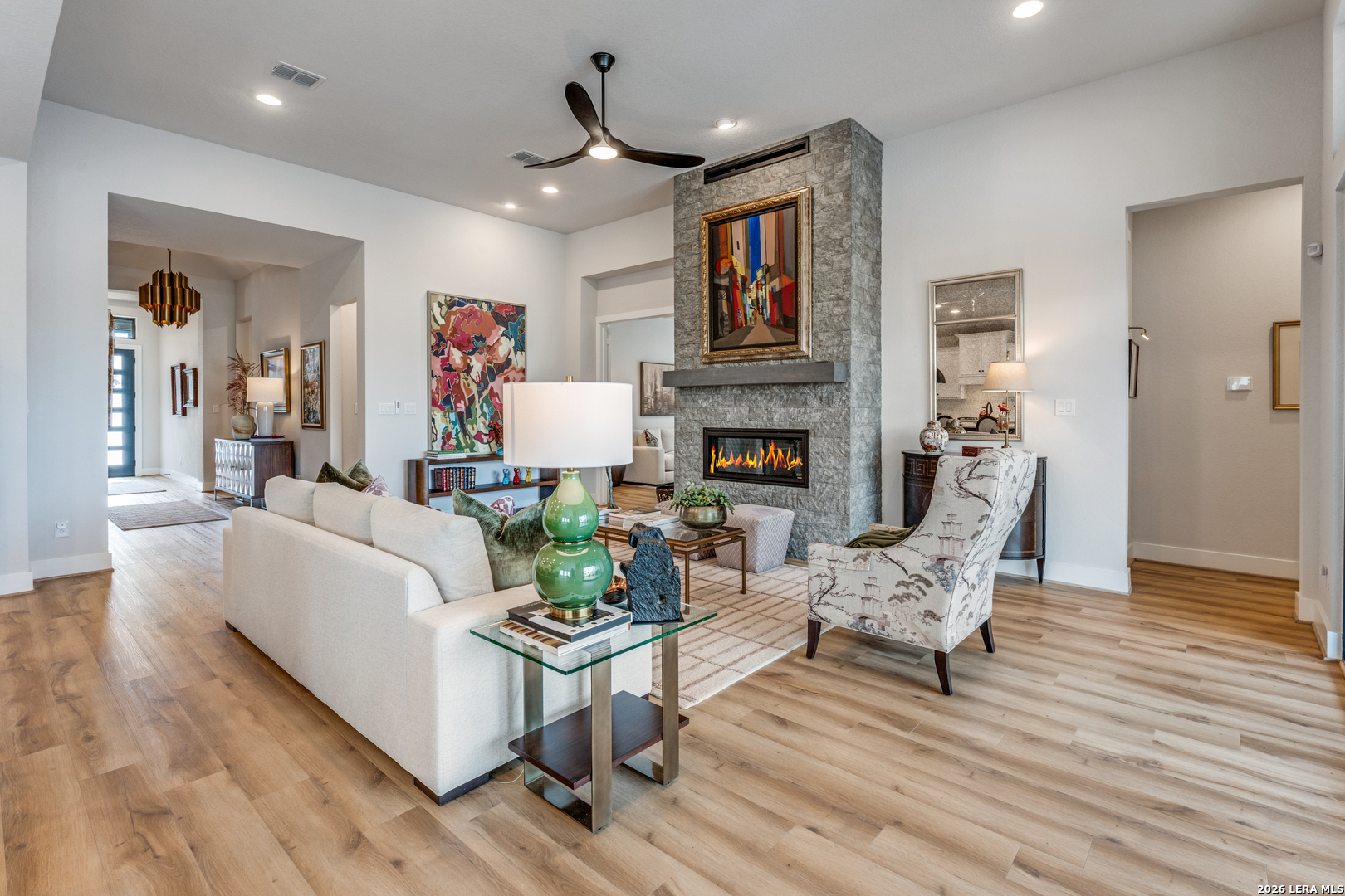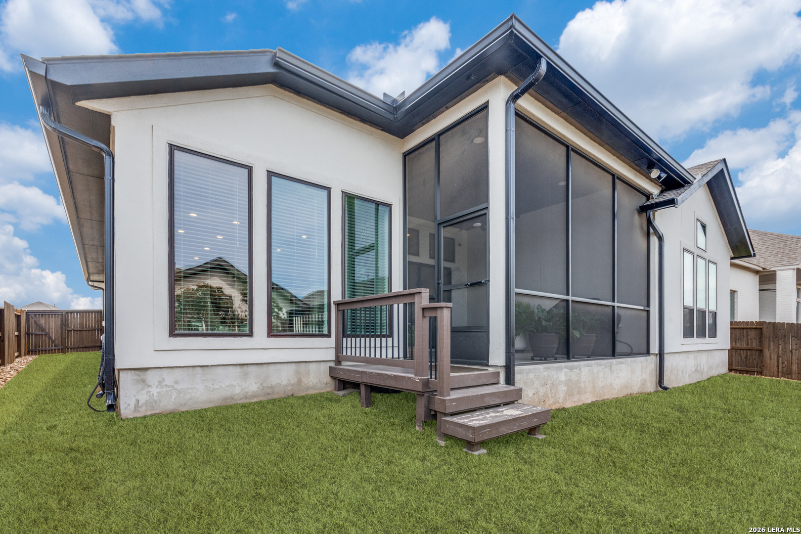 This stunning Perry Homes-built residence, completed in 2023, offers 2,894 sq.ft. of meticulously maintained, single-story living space with remarkable upgrades throughout. The thoughtfully designed floor plan features 4 bedrooms, 3 full baths, 1 half bath, a game room, and an oversized 3-car garage. The rear covered patio has been screened in, seamlessly extending the living area when the multi-slide glass doors are open. The chef-inspired kitchen boasts a large quartz waterfall island and a tile backsplash that reaches the ceiling. The living room is highlighted by a sleek, modern gas linear fireplace with a tile facade extending to the ceiling. In the spacious primary suite, you'll find soaring vaulted ceilings. The primary bath is a true standout, with dual vanities, a full tile wall, a freestanding soaking tub, and a custom-tiled walk-in shower. Two separate walk-in closets with custom built-ins ensure ample storage. Upgrades include professional-grade epoxy garage floors, full gutters, a complete home alarm and automation system, a water softener, ceiling fans throughout, and much more. The home is ideally located with a greenbelt in front and within walking distance to the community swimming pool and restaurant. Don't miss the chance to make this exceptional home in the prestigious Veramendi community yours!