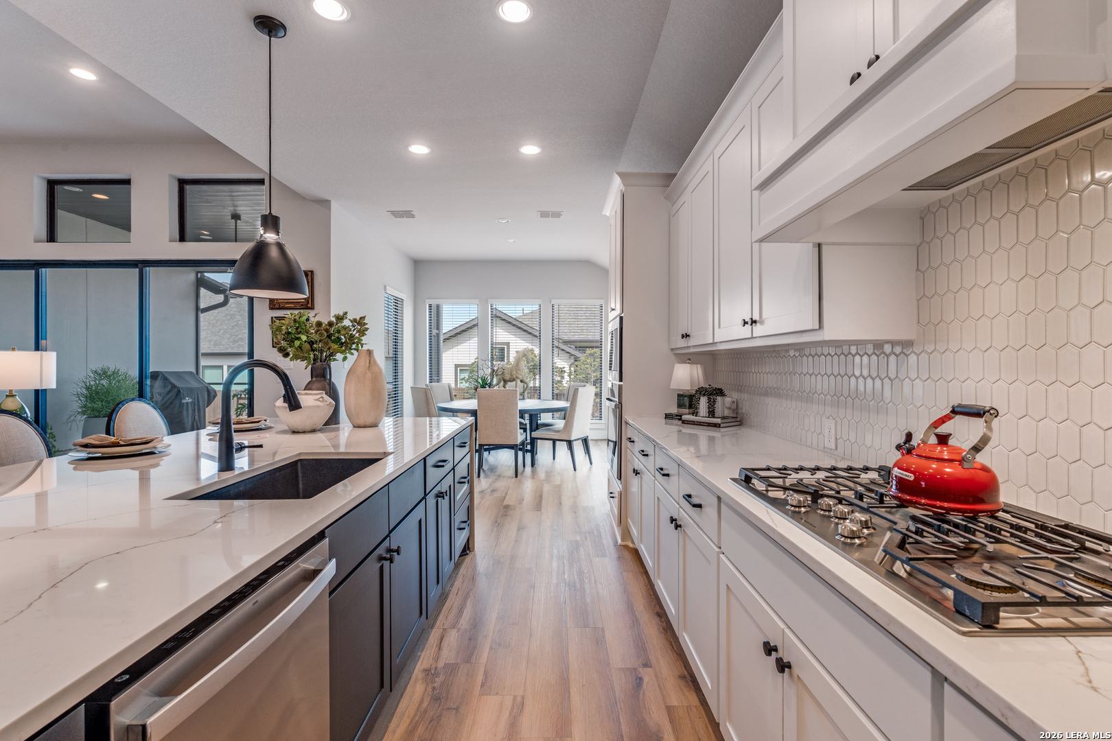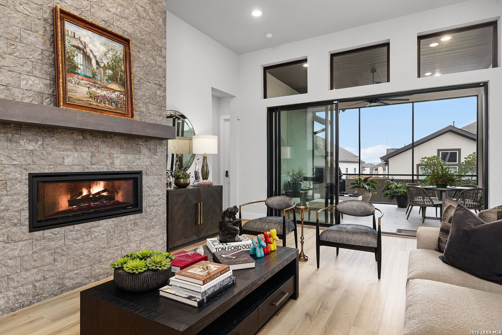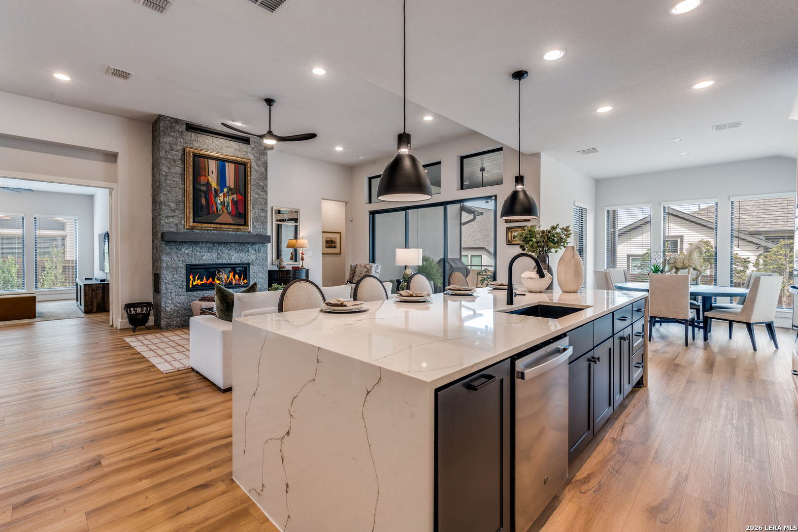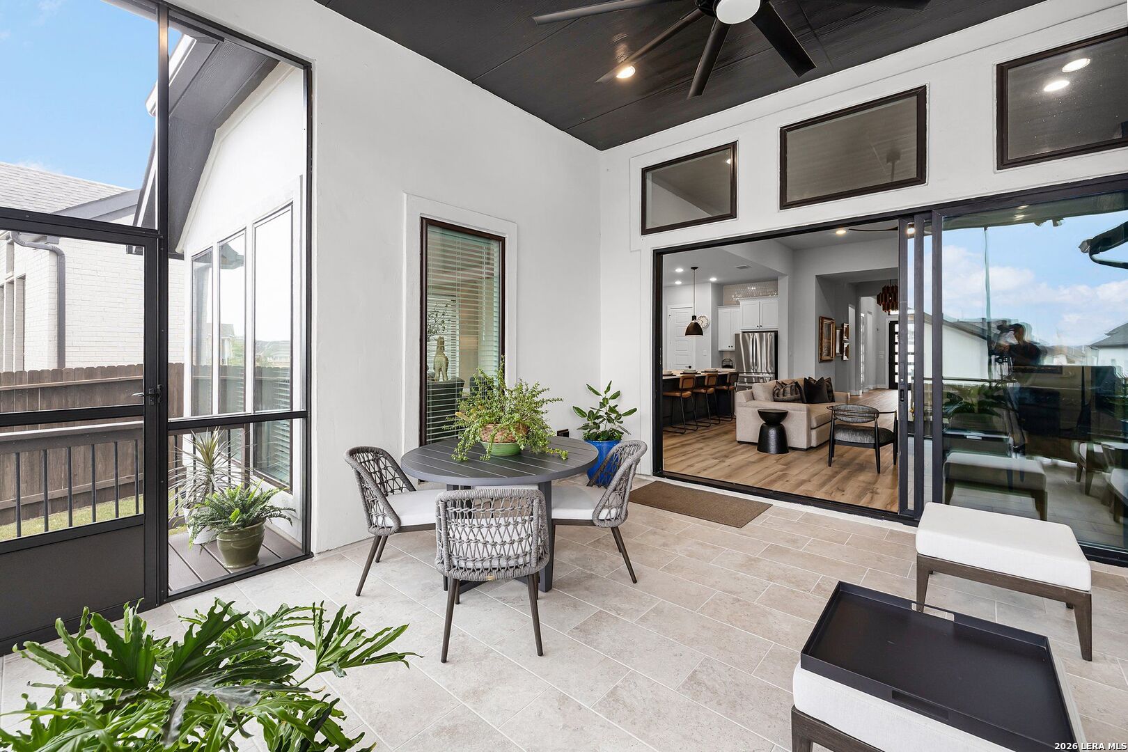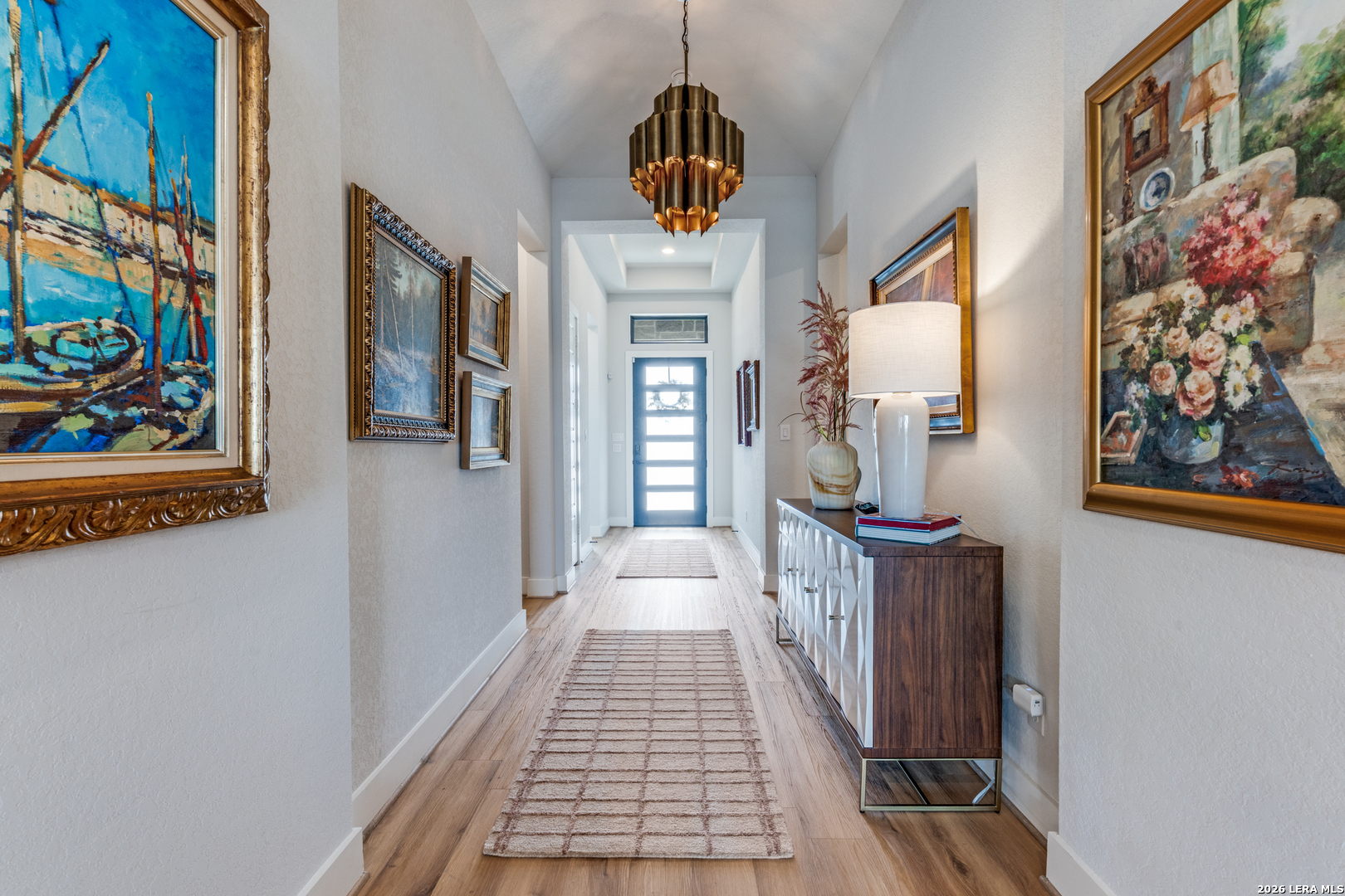 This stunning Perry Homes-built residence, completed in 2023, offers 2,894 sq.ft. of meticulously maintained, single-story living space with remarkable upgrades throughout. The thoughtfully designed floor plan features 4 bedrooms, 3 full baths, 1 half bath, a game room, and an oversized 3-car garage. The rear covered patio has been screened in, seamlessly extending the living area when the multi-slide glass doors are open. The chef-inspired kitchen boasts a large quartz waterfall island and a tile backsplash that reaches the ceiling. The living room is highlighted by a sleek, modern gas linear fireplace with a tile facade extending to the ceiling. In the spacious primary suite, you'll find soaring vaulted ceilings. The primary bath is a true standout, with dual vanities, a full tile wall, a freestanding soaking tub, and a custom-tiled walk-in shower. Two separate walk-in closets with custom built-ins ensure ample storage. Upgrades include professional-grade epoxy garage floors, full gutters, a complete home alarm and automation system, a water softener, ceiling fans throughout, and much more. The home is ideally located with a greenbelt in front and within walking distance to the community swimming pool and restaurant. Don't miss the chance to make this exceptional home in the prestigious Veramendi community yours!