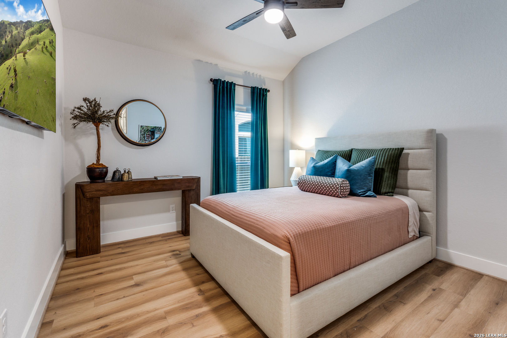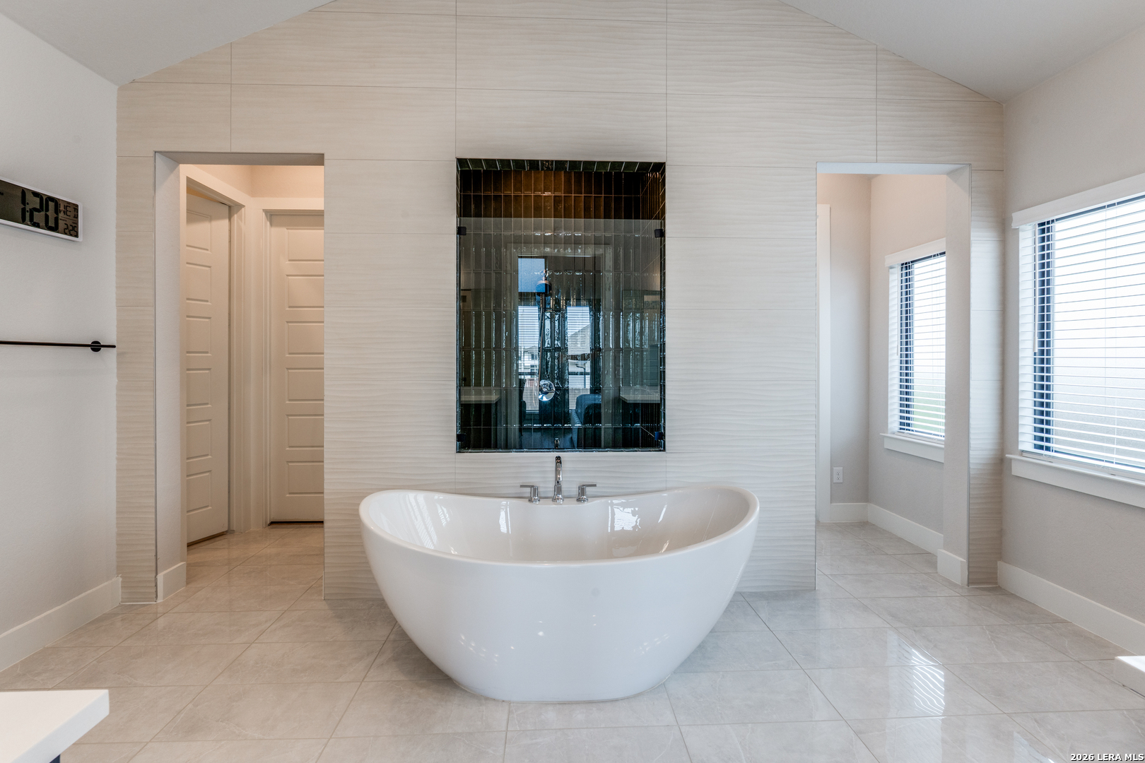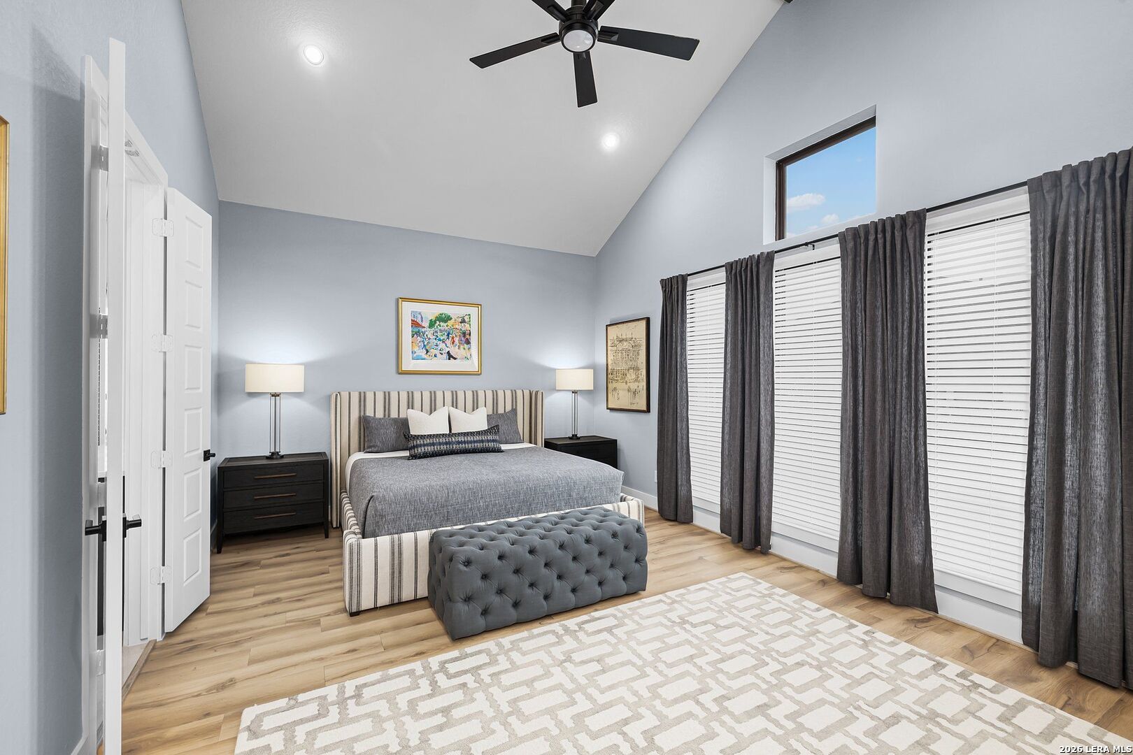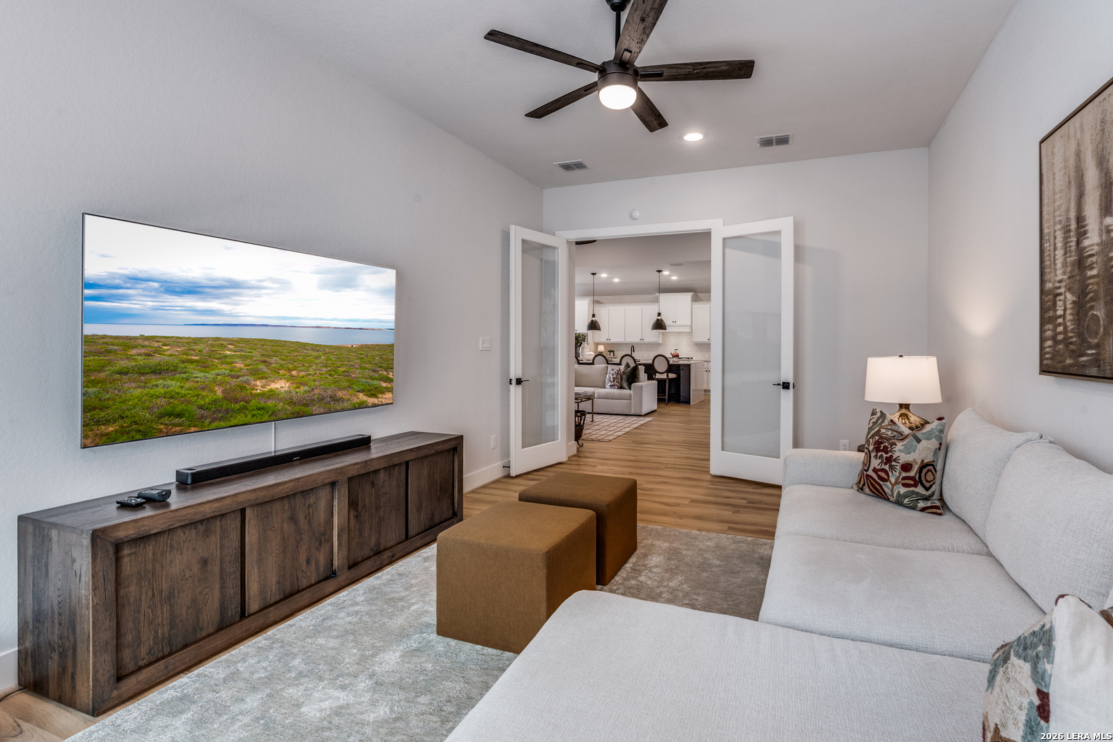This stunning Perry Homes-built residence, completed in 2023, offers 2,894 sq.ft. of meticulously maintained, single-story living space with remarkable upgrades throughout. The thoughtfully designed floor plan features 4 bedrooms, 3 full baths, 1 half bath, a game room, and an oversized 3-car garage. The rear covered patio has been screened in, seamlessly extending the living area when the multi-slide glass doors are open. The chef-inspired kitchen boasts a large quartz waterfall island and a tile backsplash that reaches the ceiling. The living room is highlighted by a sleek, modern gas linear fireplace with a tile facade extending to the ceiling. In the spacious primary suite, you'll find soaring vaulted ceilings. The primary bath is a true standout, with dual vanities, a full tile wall, a freestanding soaking tub, and a custom-tiled walk-in shower. Two separate walk-in closets with custom built-ins ensure ample storage. Upgrades include professional-grade epoxy garage floors, full gutters, a complete home alarm and automation system, a water softener, ceiling fans throughout, and much more. The home is ideally located with a greenbelt in front and within walking distance to the community swimming pool and restaurant. Don't miss the chance to make this exceptional home in the prestigious Veramendi community yours!
