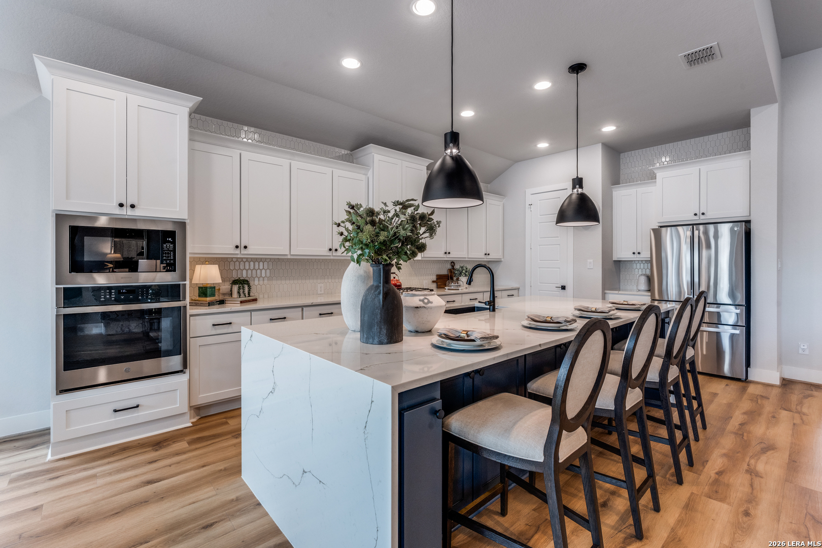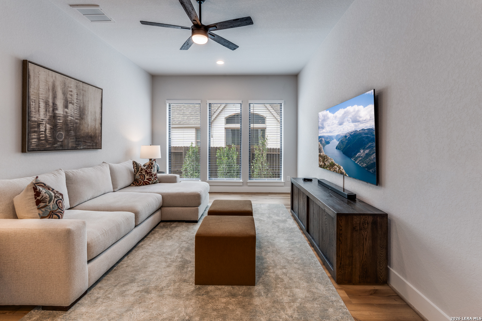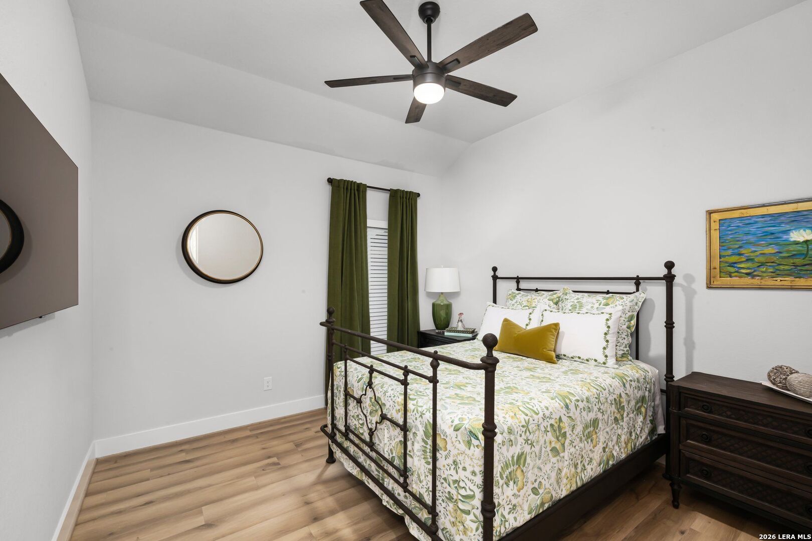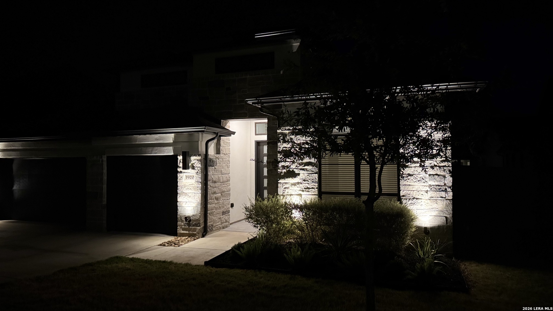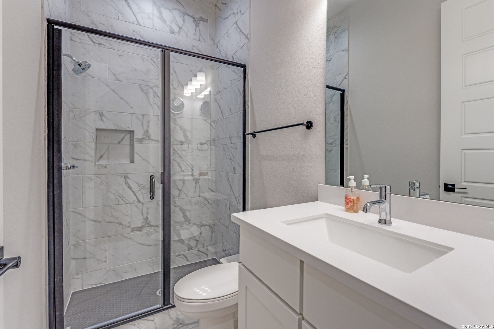 This stunning Perry Homes-built residence, completed in 2023, offers 2,894 sq.ft. of meticulously maintained, single-story living space with remarkable upgrades throughout. The thoughtfully designed floor plan features 4 bedrooms, 3 full baths, 1 half bath, a game room, and an oversized 3-car garage. The rear covered patio has been screened in, seamlessly extending the living area when the multi-slide glass doors are open. The chef-inspired kitchen boasts a large quartz waterfall island and a tile backsplash that reaches the ceiling. The living room is highlighted by a sleek, modern gas linear fireplace with a tile facade extending to the ceiling. In the spacious primary suite, you'll find soaring vaulted ceilings. The primary bath is a true standout, with dual vanities, a full tile wall, a freestanding soaking tub, and a custom-tiled walk-in shower. Two separate walk-in closets with custom built-ins ensure ample storage. Upgrades include professional-grade epoxy garage floors, full gutters, a complete home alarm and automation system, a water softener, ceiling fans throughout, and much more. The home is ideally located with a greenbelt in front and within walking distance to the community swimming pool and restaurant. Don't miss the chance to make this exceptional home in the prestigious Veramendi community yours!
