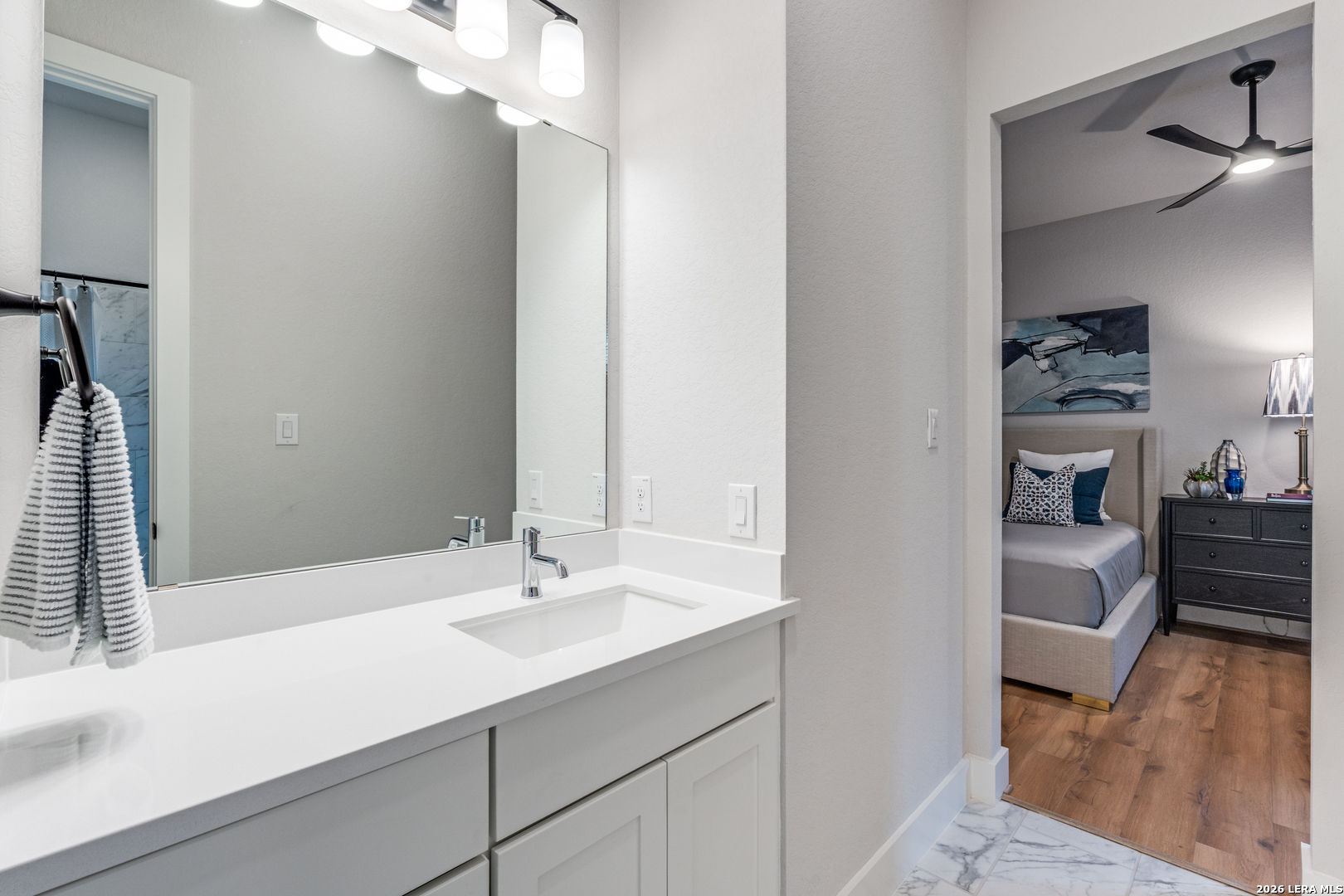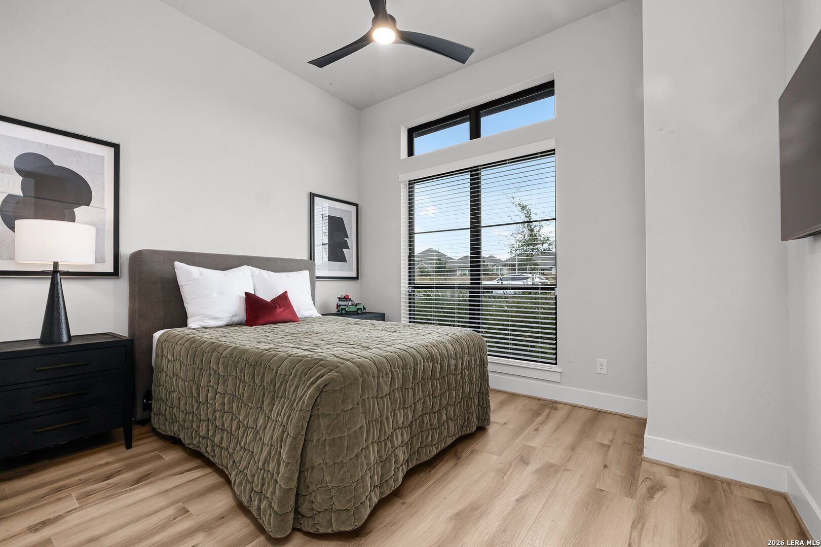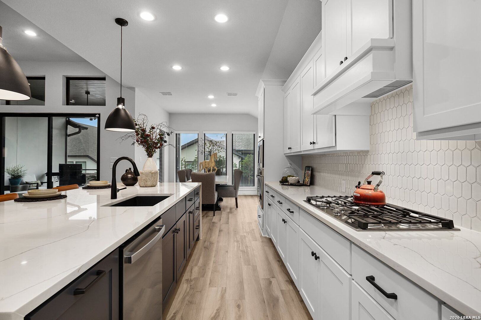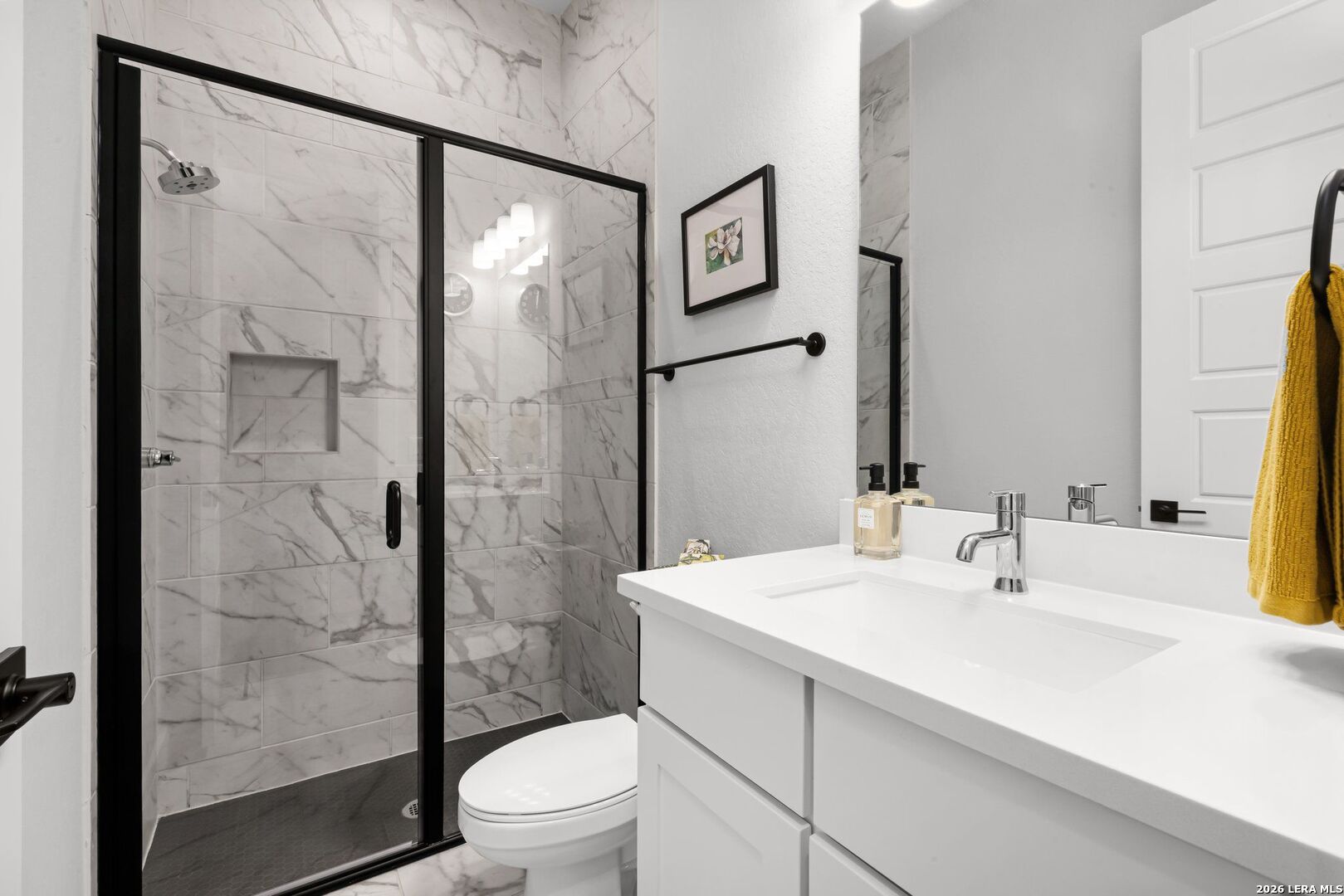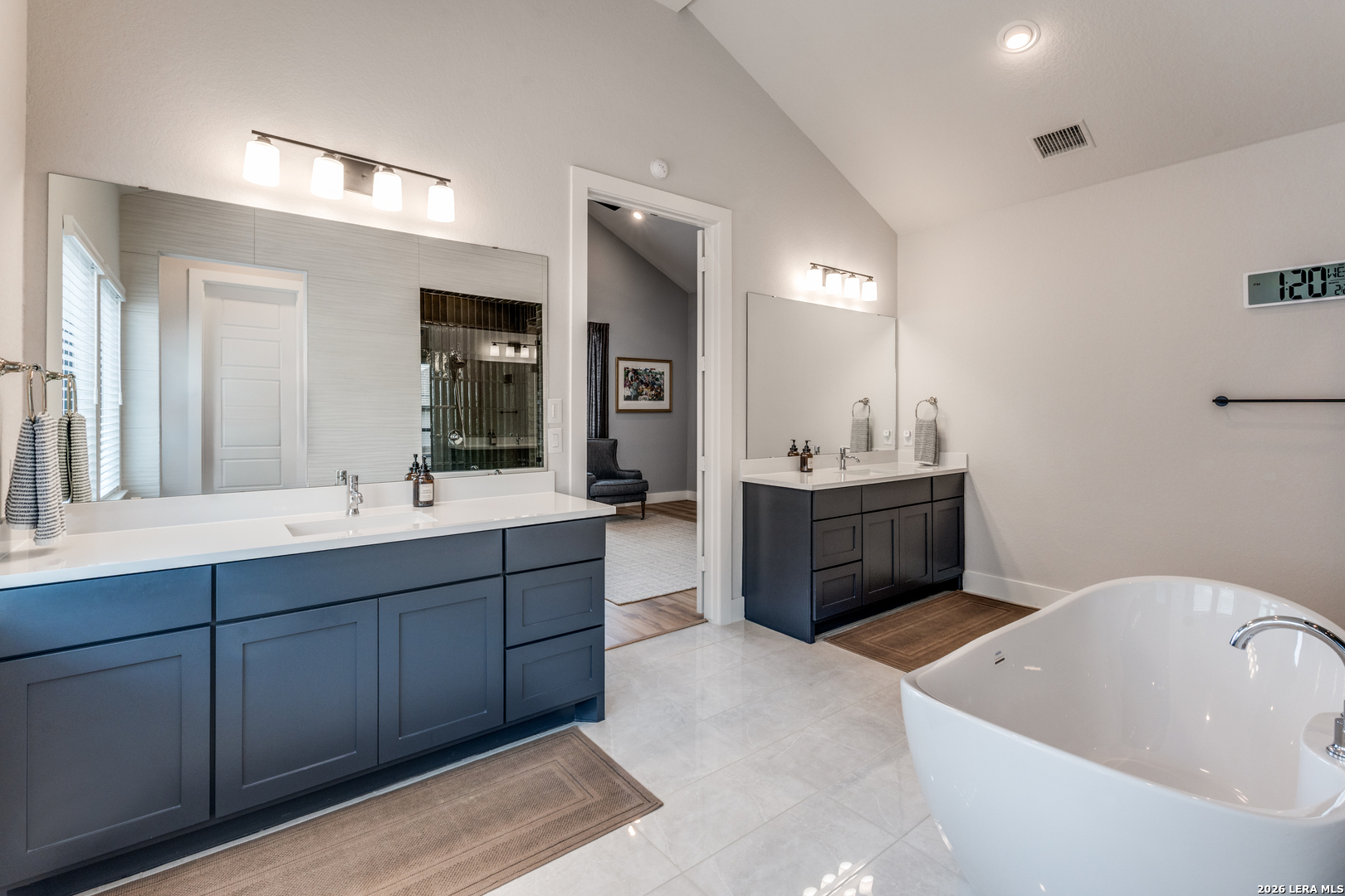 This stunning Perry Homes-built residence, completed in 2023, offers 2,894 sq.ft. of meticulously maintained, single-story living space with remarkable upgrades throughout. The thoughtfully designed floor plan features 4 bedrooms, 3 full baths, 1 half bath, a game room, and an oversized 3-car garage. The rear covered patio has been screened in, seamlessly extending the living area when the multi-slide glass doors are open. The chef-inspired kitchen boasts a large quartz waterfall island and a tile backsplash that reaches the ceiling. The living room is highlighted by a sleek, modern gas linear fireplace with a tile facade extending to the ceiling. In the spacious primary suite, you'll find soaring vaulted ceilings. The primary bath is a true standout, with dual vanities, a full tile wall, a freestanding soaking tub, and a custom-tiled walk-in shower. Two separate walk-in closets with custom built-ins ensure ample storage. Upgrades include professional-grade epoxy garage floors, full gutters, a complete home alarm and automation system, a water softener, ceiling fans throughout, and much more. The home is ideally located with a greenbelt in front and within walking distance to the community swimming pool and restaurant. Don't miss the chance to make this exceptional home in the prestigious Veramendi community yours!
