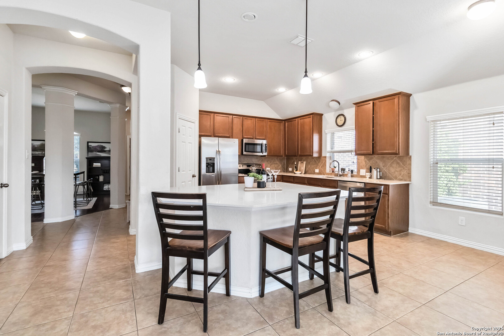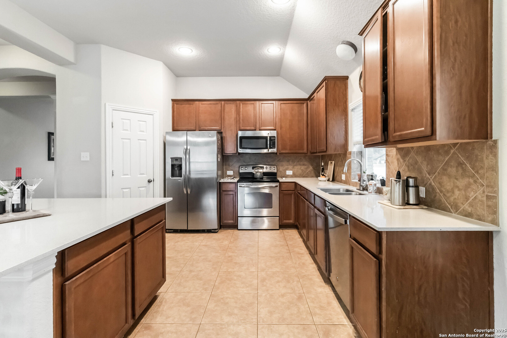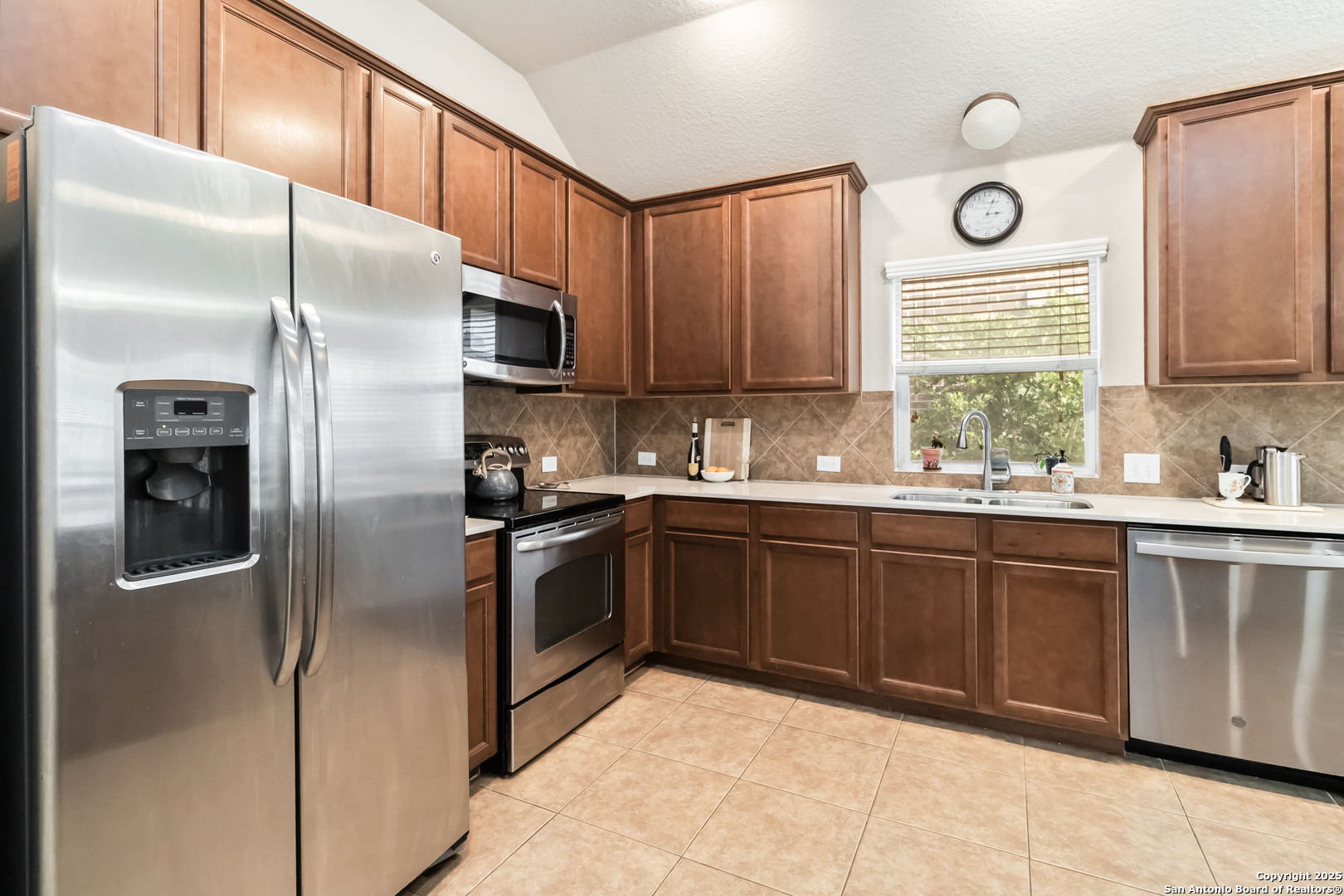 This well-maintained, brick and stone, one-story David Weekley home in the gated Prospect Creek section of Kinder Ranch strikes the perfect balance between luxury and livability. The functional layout with high ceilings and an open concept kitchen-to-living connection is perfect for hosting gatherings or quiet relaxation. Flooring includes tile through the main living areas with wood floors in the dedicated dining room and den. Island kitchen with pendant lighting, ample cabinet storage, stainless steel appliances, and an adjacent breakfast area. Private primary suite with an en-suite bath featuring dual vanity, soaking tub, separate shower, and walk-in closet. Covered back patio overlooks a spacious fenced yard with green space behind - no rear neighbors. Lot offers space suitable for a pool (buyer to verify HOA/city requirements and approvals). Just a few steps to a neighborhood access gate providing direct access toward Kinder Ranch Elementary and Pieper High School. Resort-style community amenities include a swimming pool, sports court, trails, and common areas (amenities subject to HOA availability). Also offers convenient access to San Antonio International Airport (SAT), shopping and grocery options, and Texas Hill Country destinations.