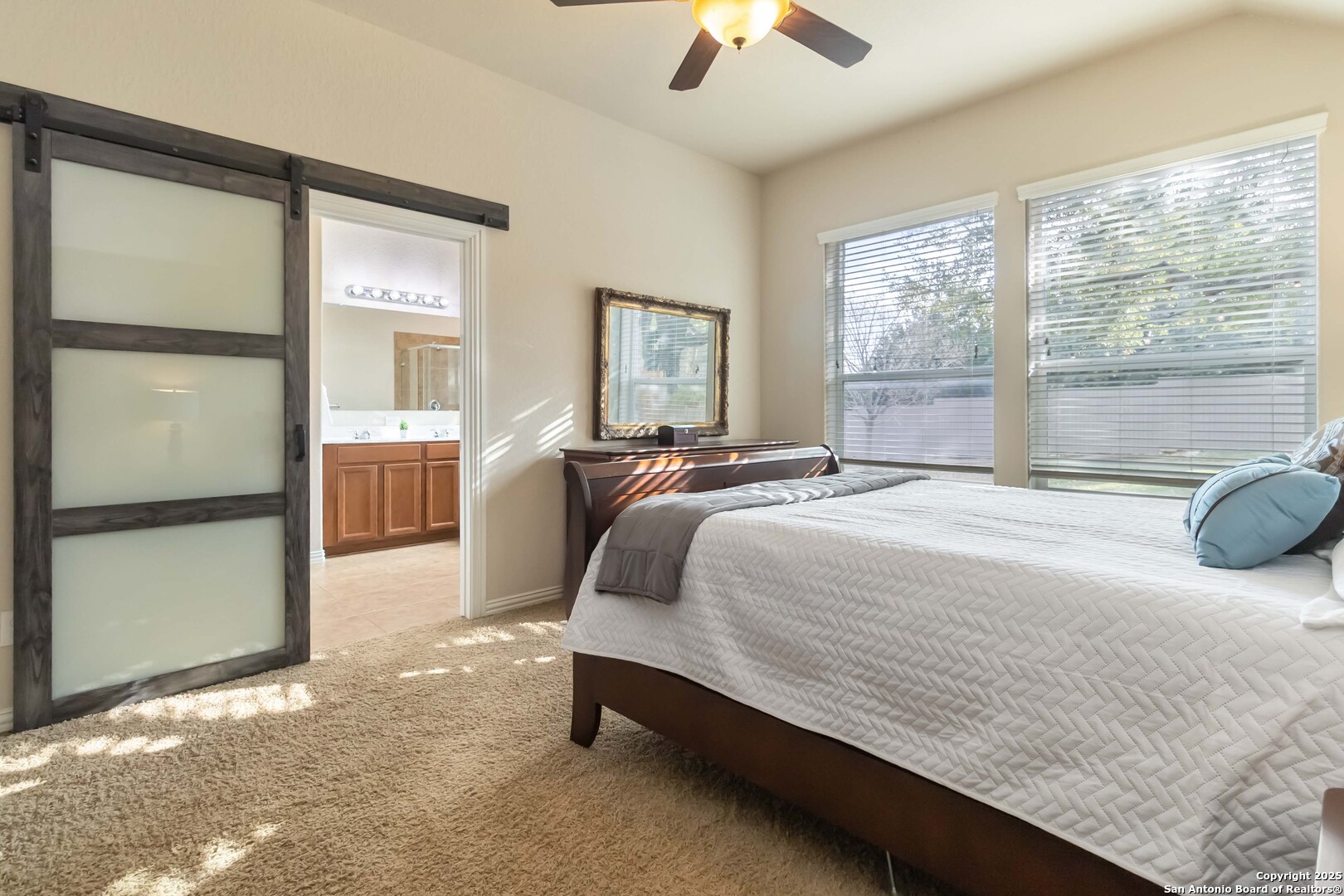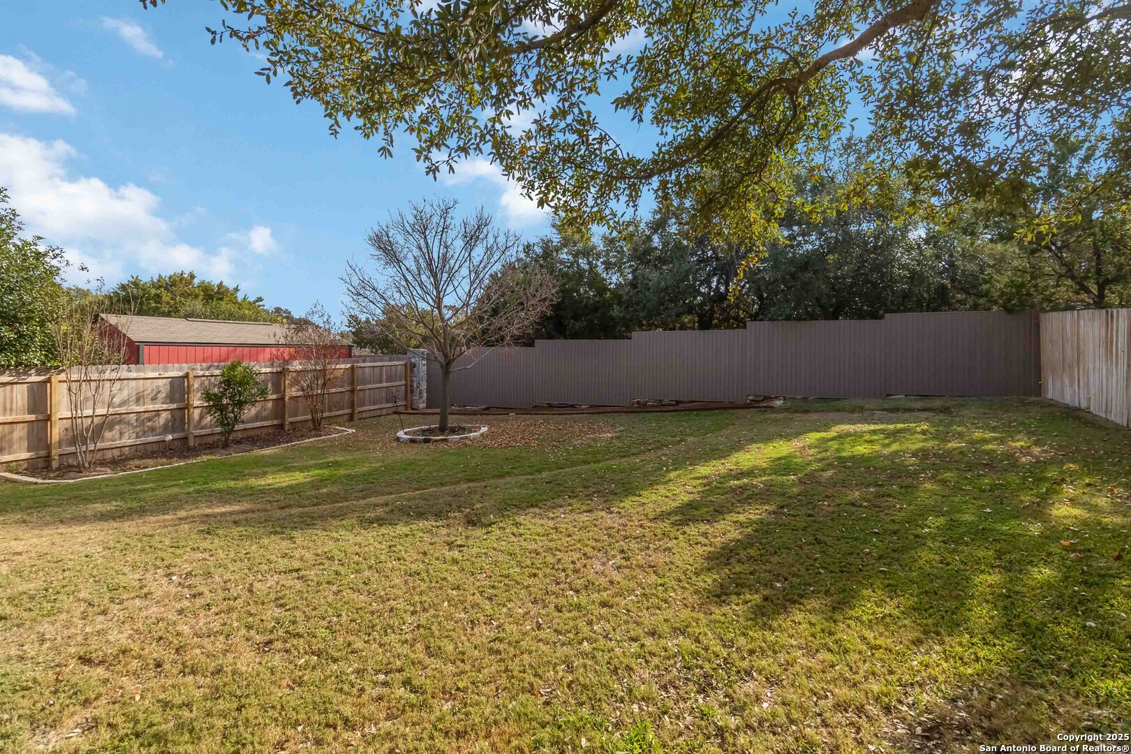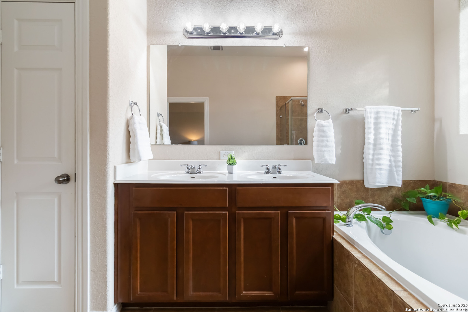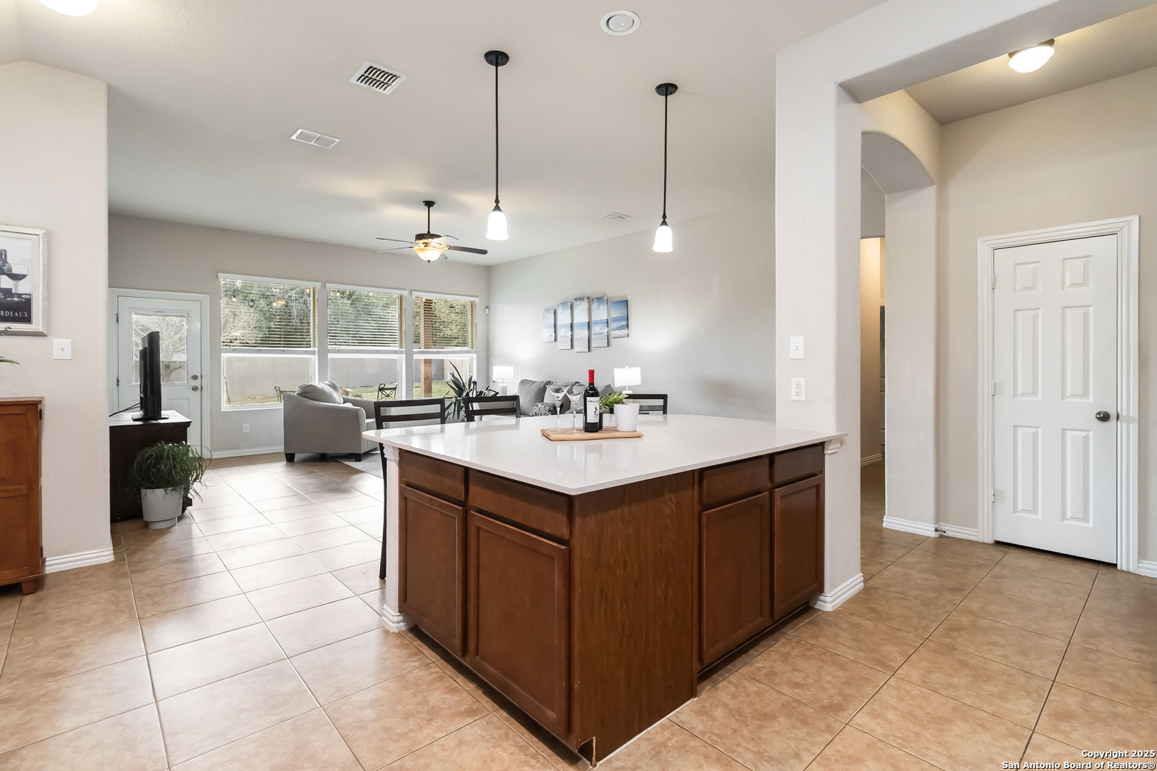 This well-maintained, brick and stone, one-story David Weekley home in the gated Prospect Creek section of Kinder Ranch strikes the perfect balance between luxury and livability. The functional layout with high ceilings and an open concept kitchen-to-living connection is perfect for hosting gatherings or quiet relaxation. Flooring includes tile through the main living areas with wood floors in the dedicated dining room and den. Island kitchen with pendant lighting, ample cabinet storage, stainless steel appliances, and an adjacent breakfast area. Private primary suite with an en-suite bath featuring dual vanity, soaking tub, separate shower, and walk-in closet. Covered back patio overlooks a spacious fenced yard with green space behind - no rear neighbors. Lot offers space suitable for a pool (buyer to verify HOA/city requirements and approvals). Just a few steps to a neighborhood access gate providing direct access toward Kinder Ranch Elementary and Pieper High School. Resort-style community amenities include a swimming pool, sports court, trails, and common areas (amenities subject to HOA availability). Also offers convenient access to San Antonio International Airport (SAT), shopping and grocery options, and Texas Hill Country destinations.